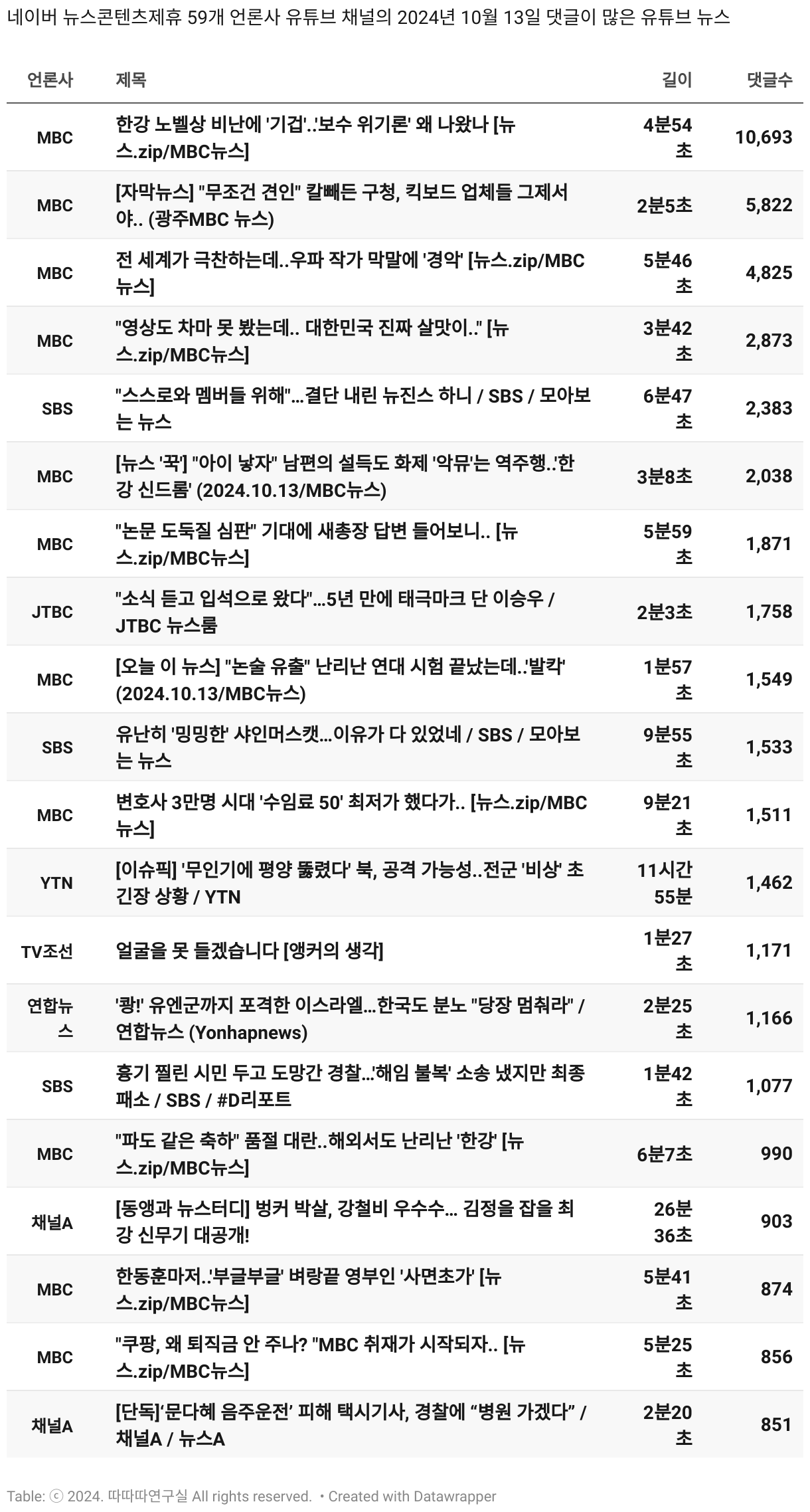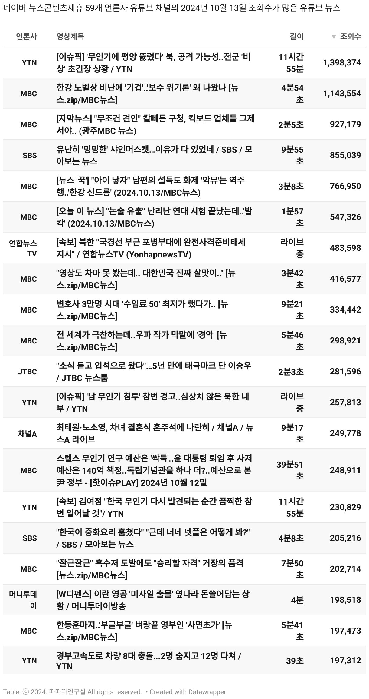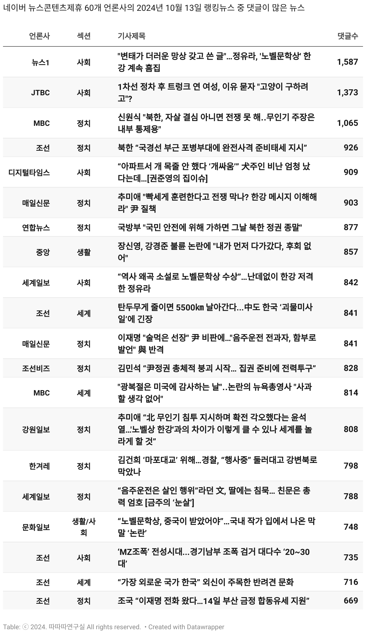 *데이터 수집 기간 : 2024년 6월 10일 *데이터 수집 대상 : 네이버 뉴스콘텐츠제휴 60개 언론사. 종합일간지 10개(경향신문, 국민일보, 동아일보, 문화일보, 서울신문, 세계일보, 조선일보, 중앙일보, 한겨레신문, 한국일보), 방송/통신사 14개(뉴스1, 뉴시스, 연합뉴스, 연합뉴스TV, 채널A, 한국경제TV, JTBC, KBS, MBC, MBN, SBS, SBS BIZ, TV조선, YTN), 경제지 11개(매일경제, 머니투데이, 비즈워치, 서울경제, 아시아경제, 이데일리, 조선비즈, 조세일보, 파이낸셜뉴스, 한국경제(유튜브제외), 헤럴드경제) 인터넷 8개(노컷뉴스, 더팩트, 데일리안, 머니S, 미디어오늘, 아이뉴스24, 오마이뉴스, 프레시안), IT 5개(디지털데일리,디지털타임스, 블로터, 전자신문, 지디넷코리아), 지역 12개(강원도민일보, 강원일보, 경기일보, 국제신문, 대구MBC, 대전일보, 매일신문, 부산일보, 전주MBC, CJB청주방송, JIBS, kbc광주방송)