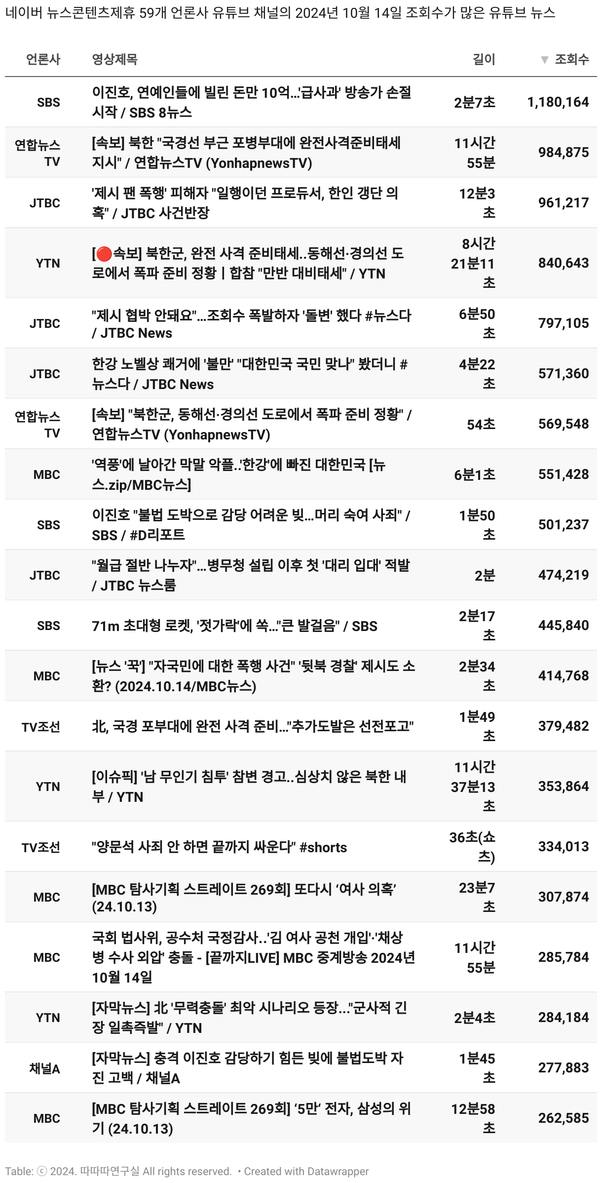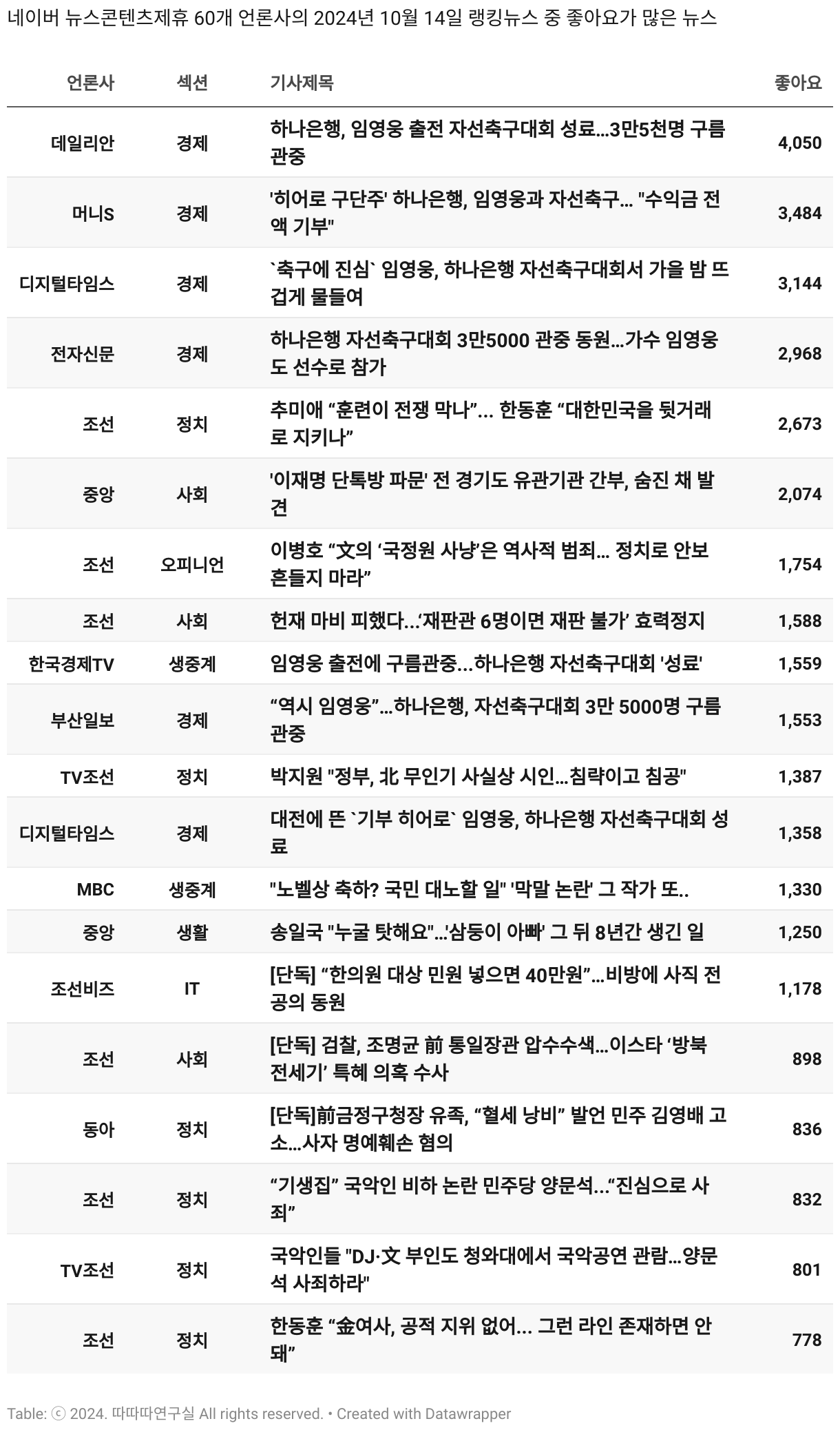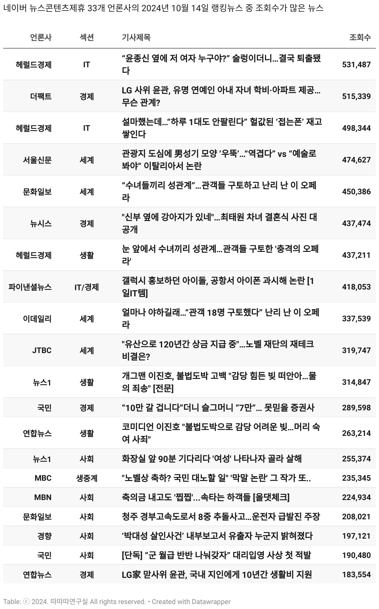 *데이터 수집 기간 : 2024년 6월 10일 *데이터 수집 대상 : 네이버 뉴스콘텐츠제휴 60개 언론사. 종합일간지 10개(경향신문, 국민일보, 동아일보, 문화일보, 서울신문, 세계일보, 조선일보, 중앙일보, 한겨레신문, 한국일보), 방송/통신사 14개(뉴스1, 뉴시스, 연합뉴스, 연합뉴스TV, 채널A, 한국경제TV, JTBC, KBS, MBC, MBN, SBS, SBS BIZ, TV조선, YTN), 경제지 11개(매일경제, 머니투데이, 비즈워치, 서울경제, 아시아경제, 이데일리, 조선비즈, 조세일보, 파이낸셜뉴스, 한국경제(유튜브제외), 헤럴드경제) 인터넷 8개(노컷뉴스, 더팩트, 데일리안, 머니S, 미디어오늘, 아이뉴스24, 오마이뉴스, 프레시안), IT 5개(디지털데일리,디지털타임스, 블로터, 전자신문, 지디넷코리아), 지역 12개(강원도민일보, 강원일보, 경기일보, 국제신문, 대구MBC, 대전일보, 매일신문, 부산일보, 전주MBC, CJB청주방송, JIBS, kbc광주방송)