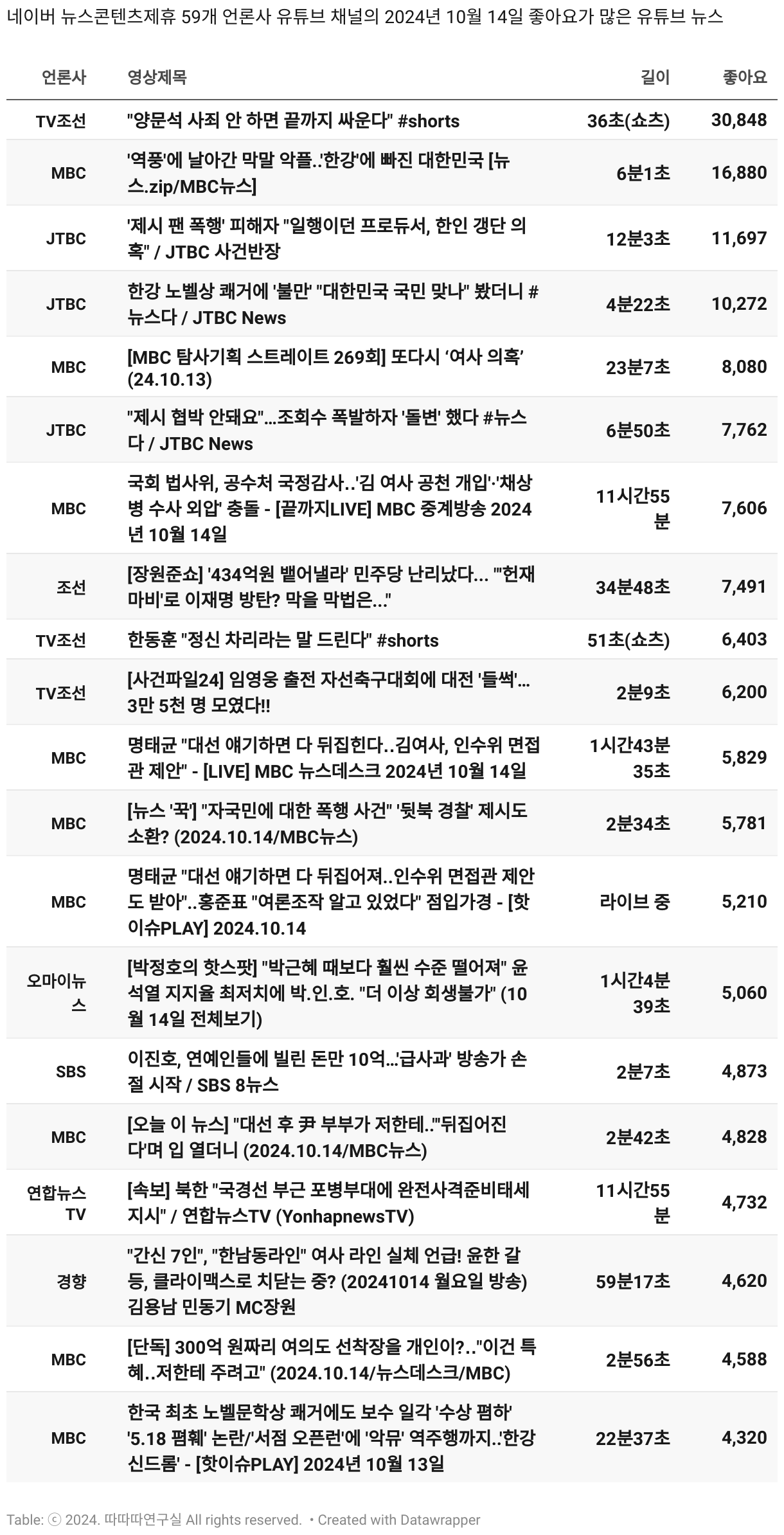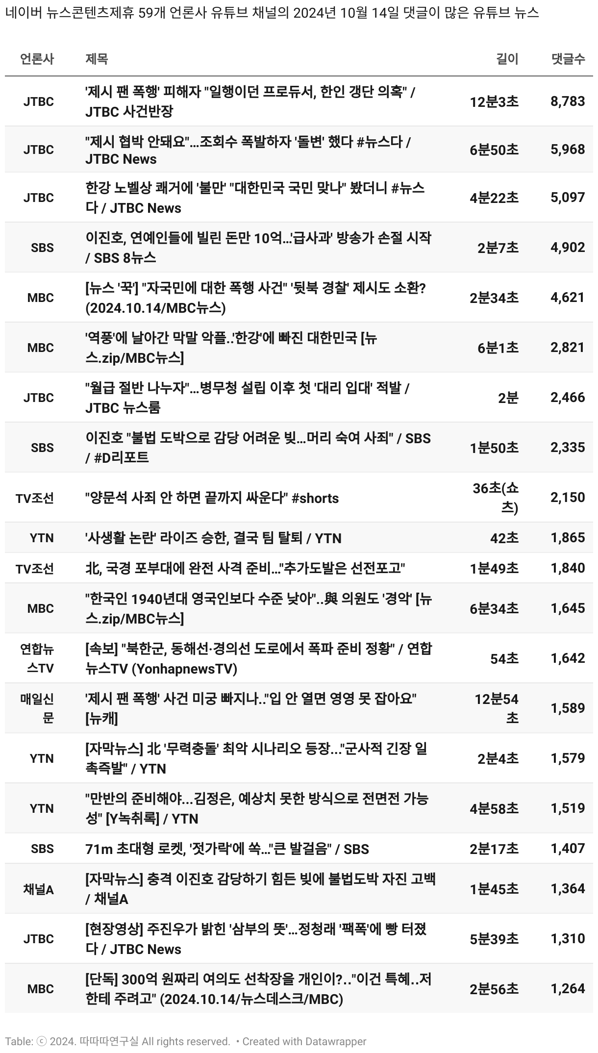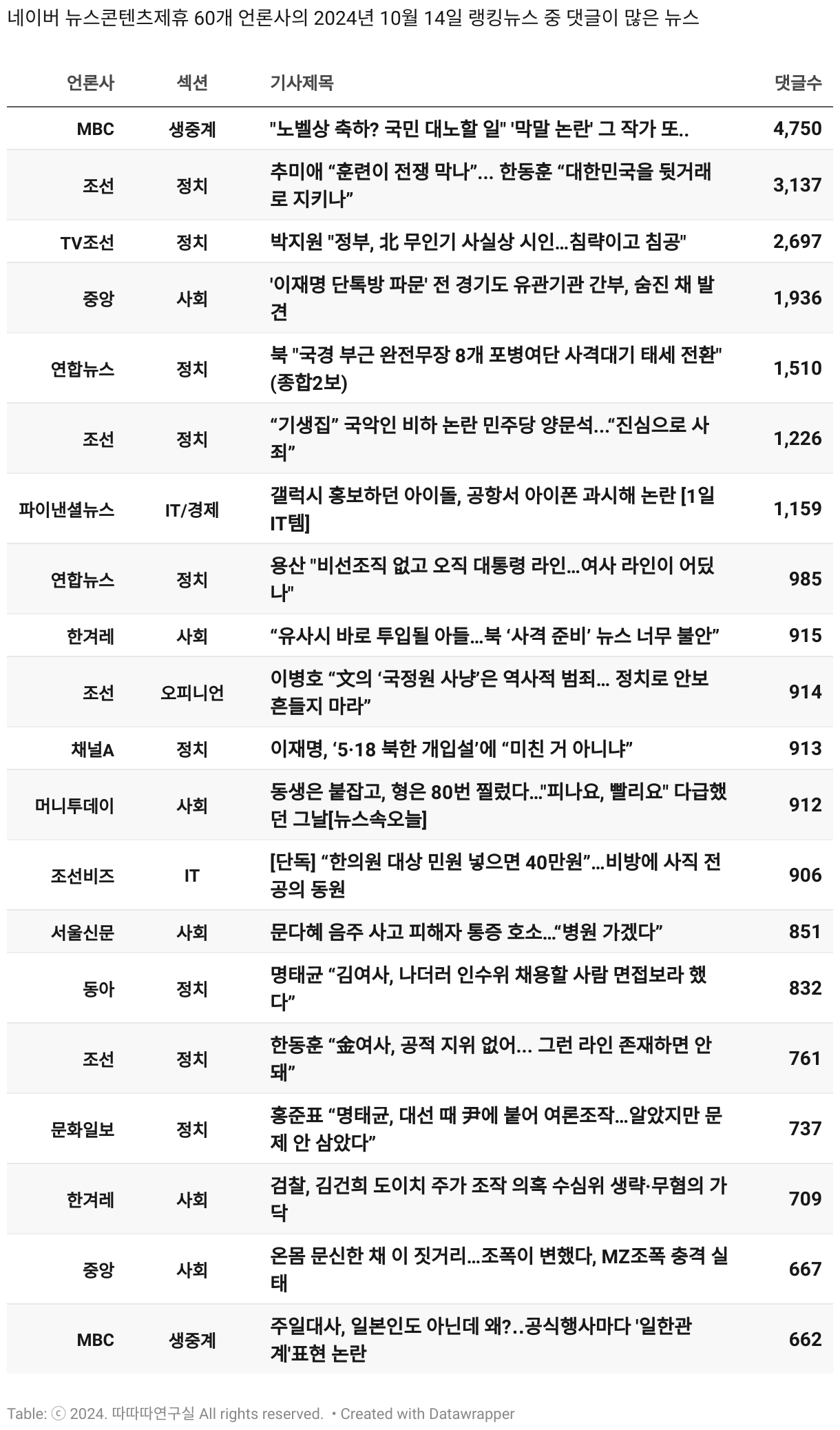 *데이터 수집 기간 : 2024년 6월 10일 *데이터 수집 대상 : 네이버 뉴스콘텐츠제휴 60개 언론사. 종합일간지 10개(경향신문, 국민일보, 동아일보, 문화일보, 서울신문, 세계일보, 조선일보, 중앙일보, 한겨레신문, 한국일보), 방송/통신사 14개(뉴스1, 뉴시스, 연합뉴스, 연합뉴스TV, 채널A, 한국경제TV, JTBC, KBS, MBC, MBN, SBS, SBS BIZ, TV조선, YTN), 경제지 11개(매일경제, 머니투데이, 비즈워치, 서울경제, 아시아경제, 이데일리, 조선비즈, 조세일보, 파이낸셜뉴스, 한국경제(유튜브제외), 헤럴드경제) 인터넷 8개(노컷뉴스, 더팩트, 데일리안, 머니S, 미디어오늘, 아이뉴스24, 오마이뉴스, 프레시안), IT 5개(디지털데일리,디지털타임스, 블로터, 전자신문, 지디넷코리아), 지역 12개(강원도민일보, 강원일보, 경기일보, 국제신문, 대구MBC, 대전일보, 매일신문, 부산일보, 전주MBC, CJB청주방송, JIBS, kbc광주방송)