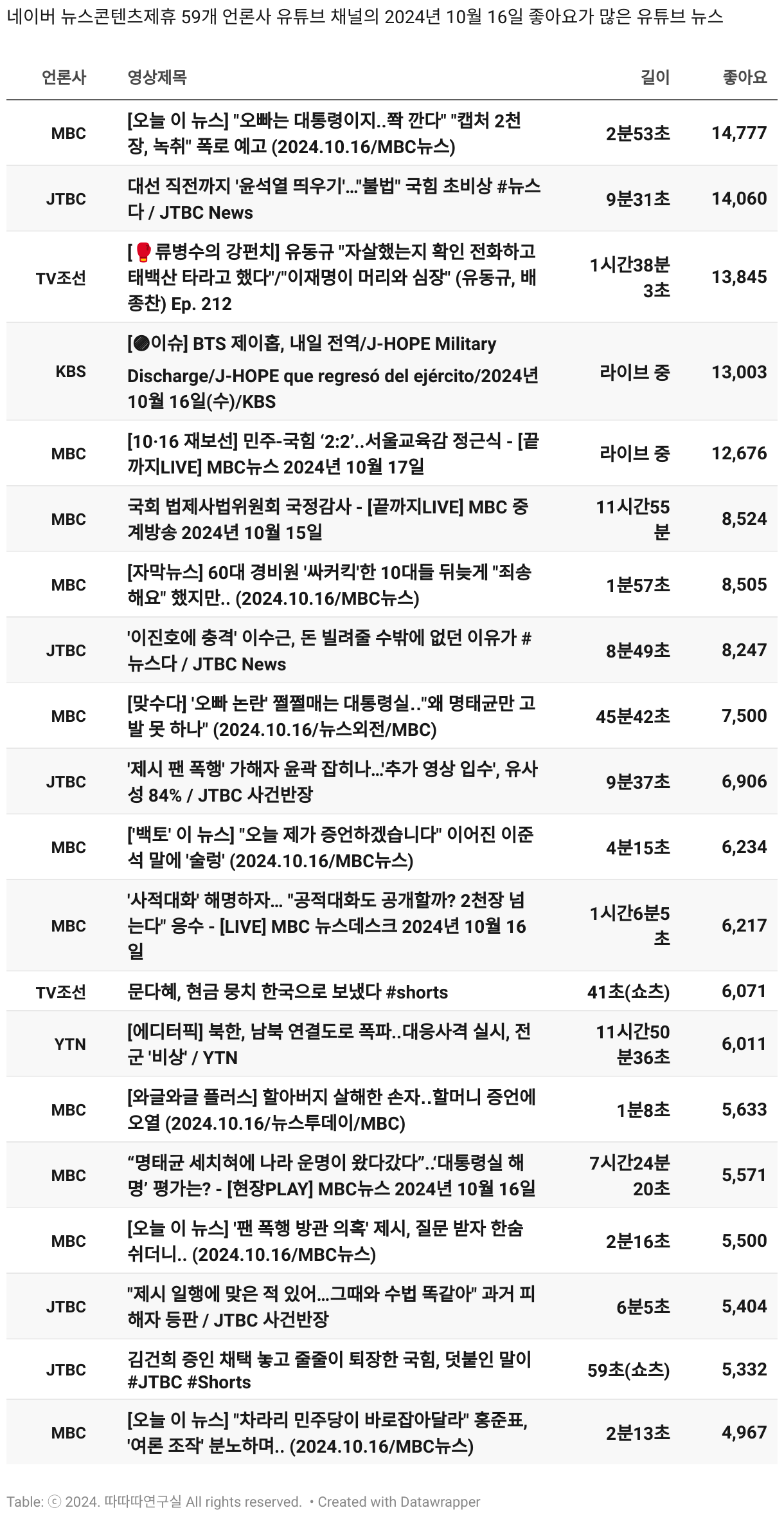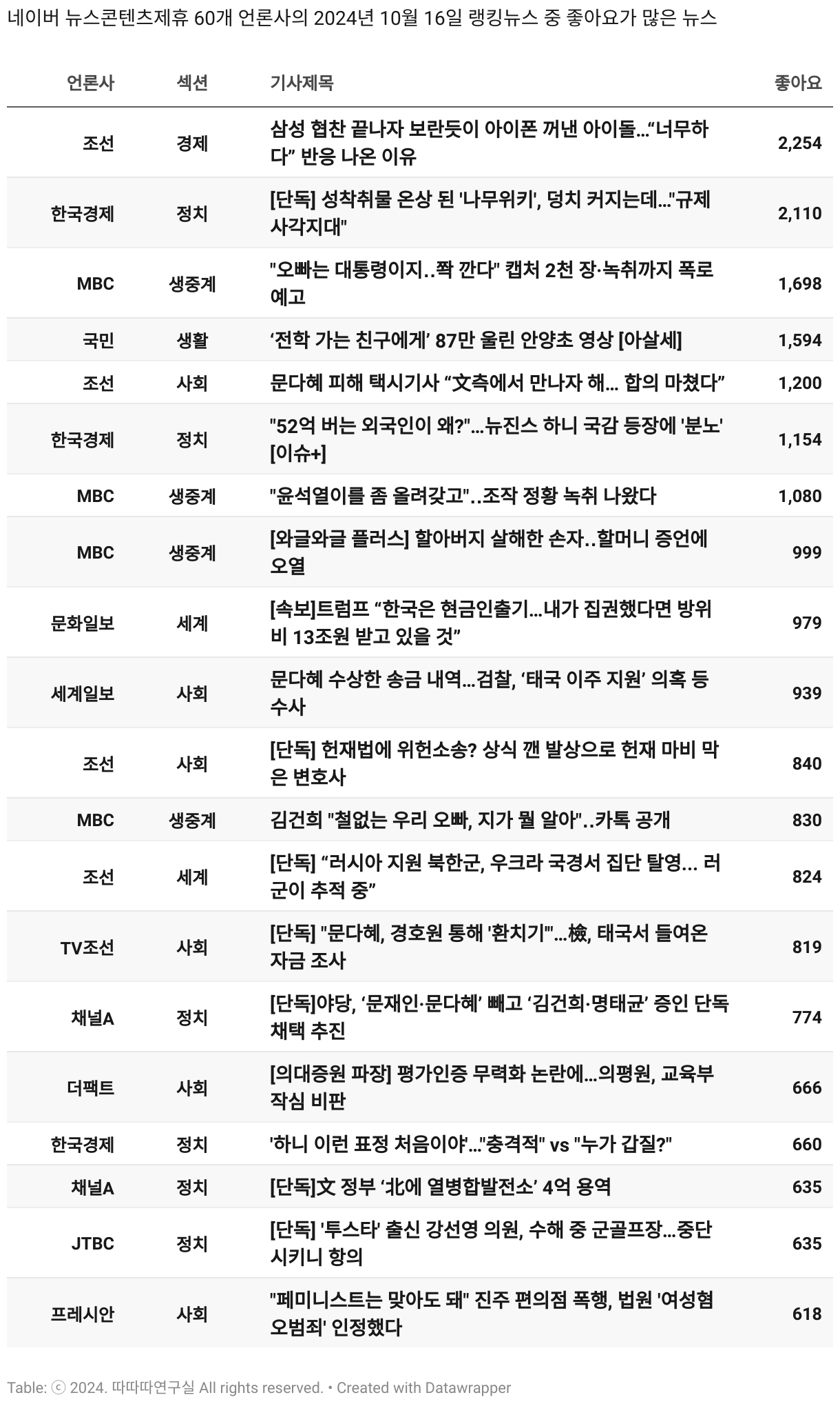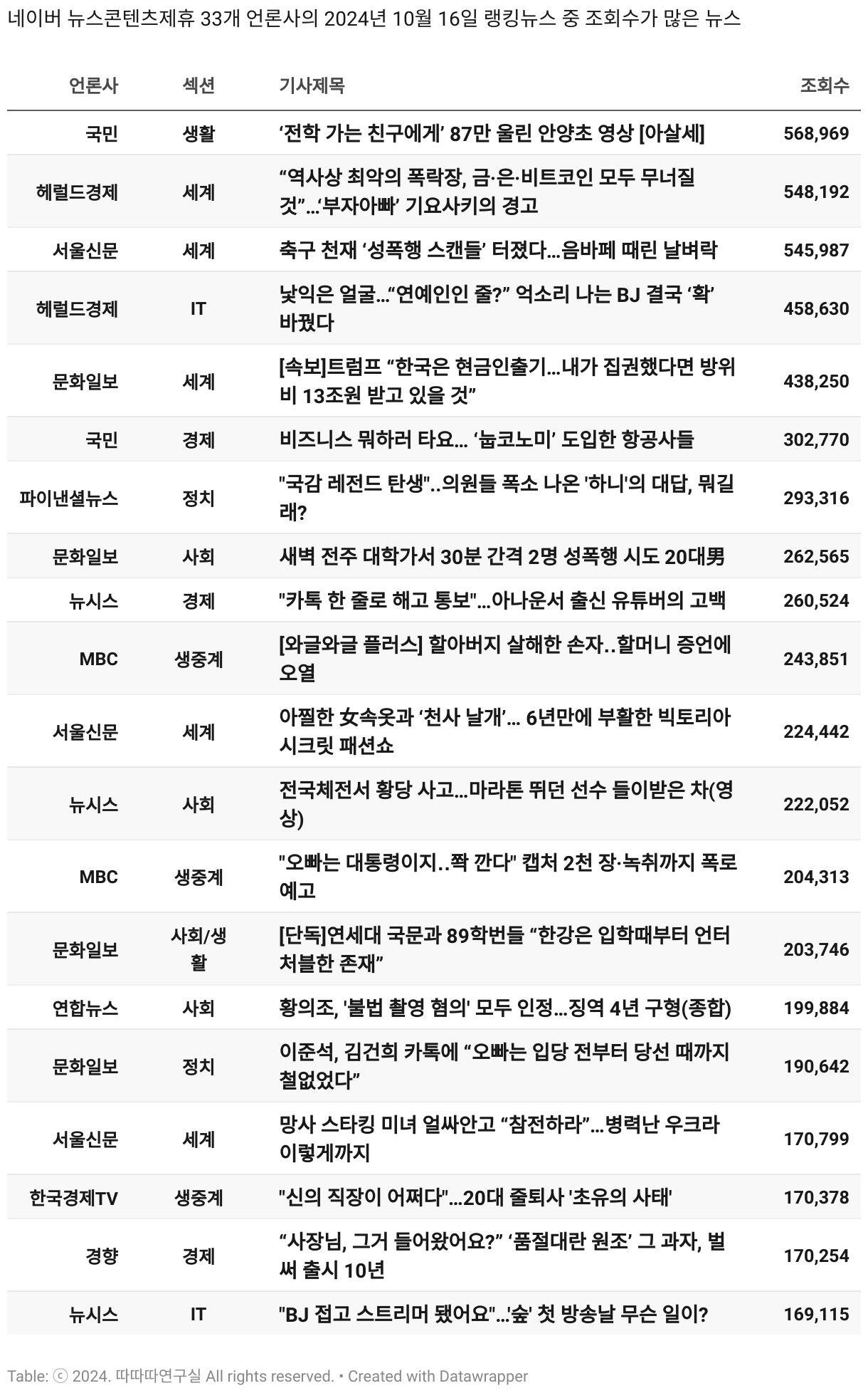 *데이터 수집 기간 : 2024년 6월 10일 *데이터 수집 대상 : 네이버 뉴스콘텐츠제휴 60개 언론사. 종합일간지 10개(경향신문, 국민일보, 동아일보, 문화일보, 서울신문, 세계일보, 조선일보, 중앙일보, 한겨레신문, 한국일보), 방송/통신사 14개(뉴스1, 뉴시스, 연합뉴스, 연합뉴스TV, 채널A, 한국경제TV, JTBC, KBS, MBC, MBN, SBS, SBS BIZ, TV조선, YTN), 경제지 11개(매일경제, 머니투데이, 비즈워치, 서울경제, 아시아경제, 이데일리, 조선비즈, 조세일보, 파이낸셜뉴스, 한국경제(유튜브제외), 헤럴드경제) 인터넷 8개(노컷뉴스, 더팩트, 데일리안, 머니S, 미디어오늘, 아이뉴스24, 오마이뉴스, 프레시안), IT 5개(디지털데일리,디지털타임스, 블로터, 전자신문, 지디넷코리아), 지역 12개(강원도민일보, 강원일보, 경기일보, 국제신문, 대구MBC, 대전일보, 매일신문, 부산일보, 전주MBC, CJB청주방송, JIBS, kbc광주방송)