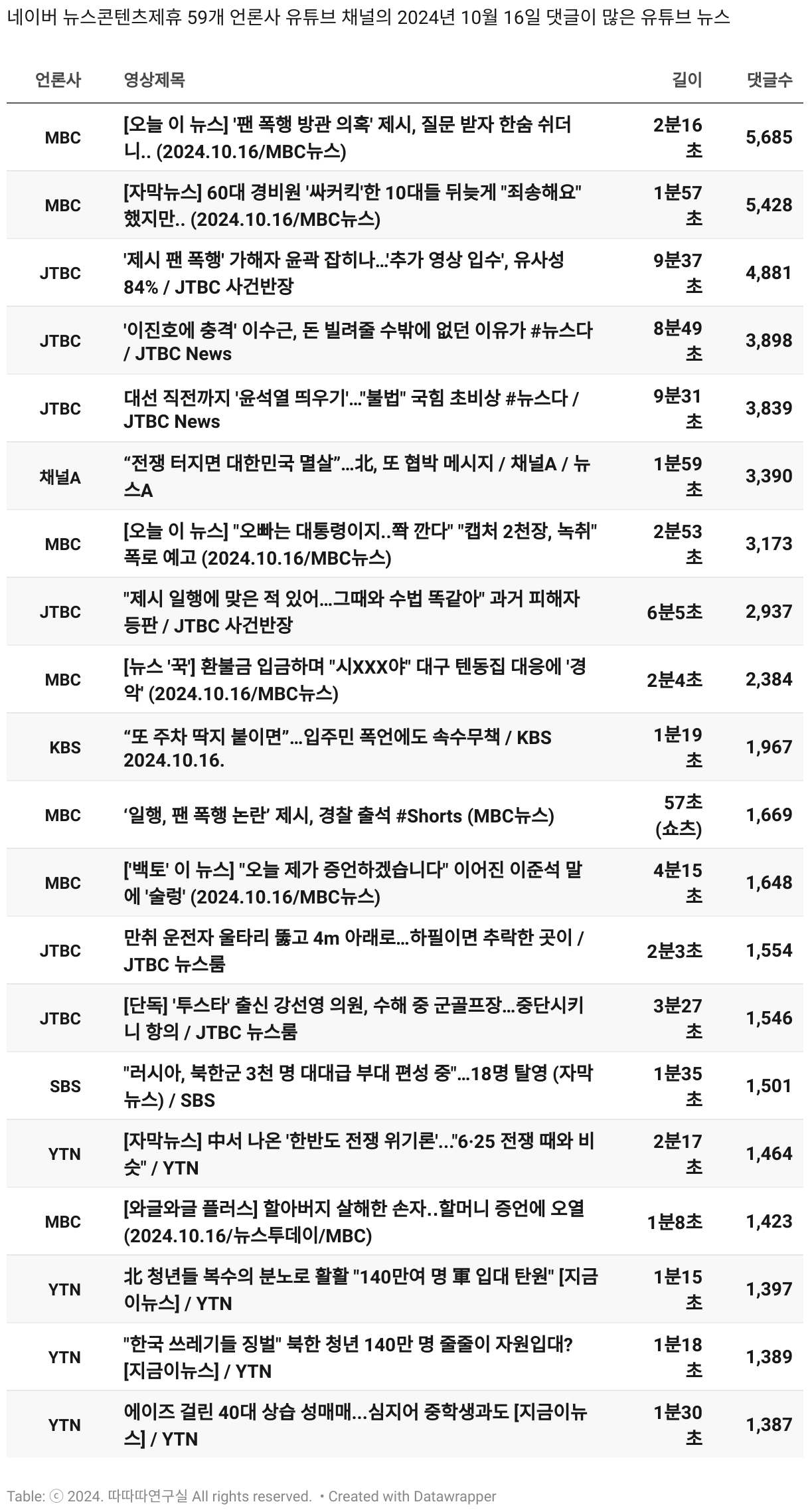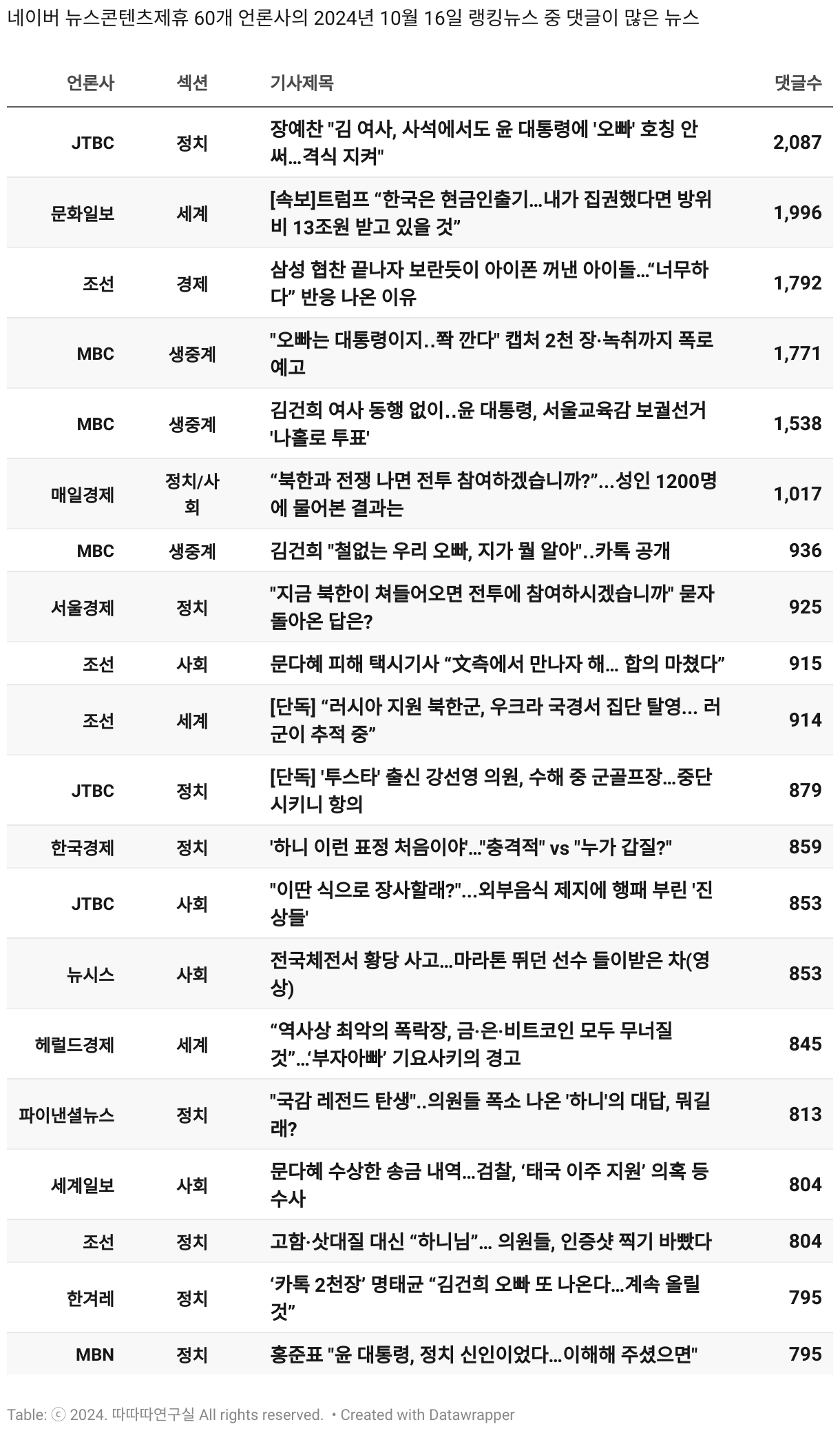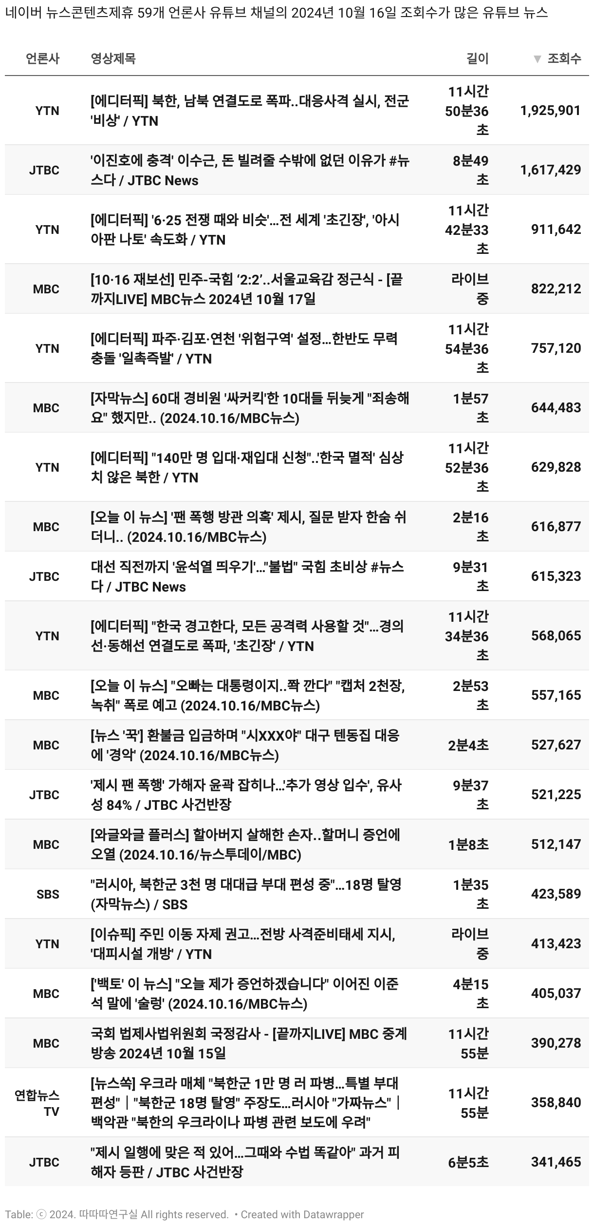 *데이터 수집 기간 : 2024년 6월 10일 *데이터 수집 대상 : 네이버 뉴스콘텐츠제휴 60개 언론사. 종합일간지 10개(경향신문, 국민일보, 동아일보, 문화일보, 서울신문, 세계일보, 조선일보, 중앙일보, 한겨레신문, 한국일보), 방송/통신사 14개(뉴스1, 뉴시스, 연합뉴스, 연합뉴스TV, 채널A, 한국경제TV, JTBC, KBS, MBC, MBN, SBS, SBS BIZ, TV조선, YTN), 경제지 11개(매일경제, 머니투데이, 비즈워치, 서울경제, 아시아경제, 이데일리, 조선비즈, 조세일보, 파이낸셜뉴스, 한국경제(유튜브제외), 헤럴드경제) 인터넷 8개(노컷뉴스, 더팩트, 데일리안, 머니S, 미디어오늘, 아이뉴스24, 오마이뉴스, 프레시안), IT 5개(디지털데일리,디지털타임스, 블로터, 전자신문, 지디넷코리아), 지역 12개(강원도민일보, 강원일보, 경기일보, 국제신문, 대구MBC, 대전일보, 매일신문, 부산일보, 전주MBC, CJB청주방송, JIBS, kbc광주방송)