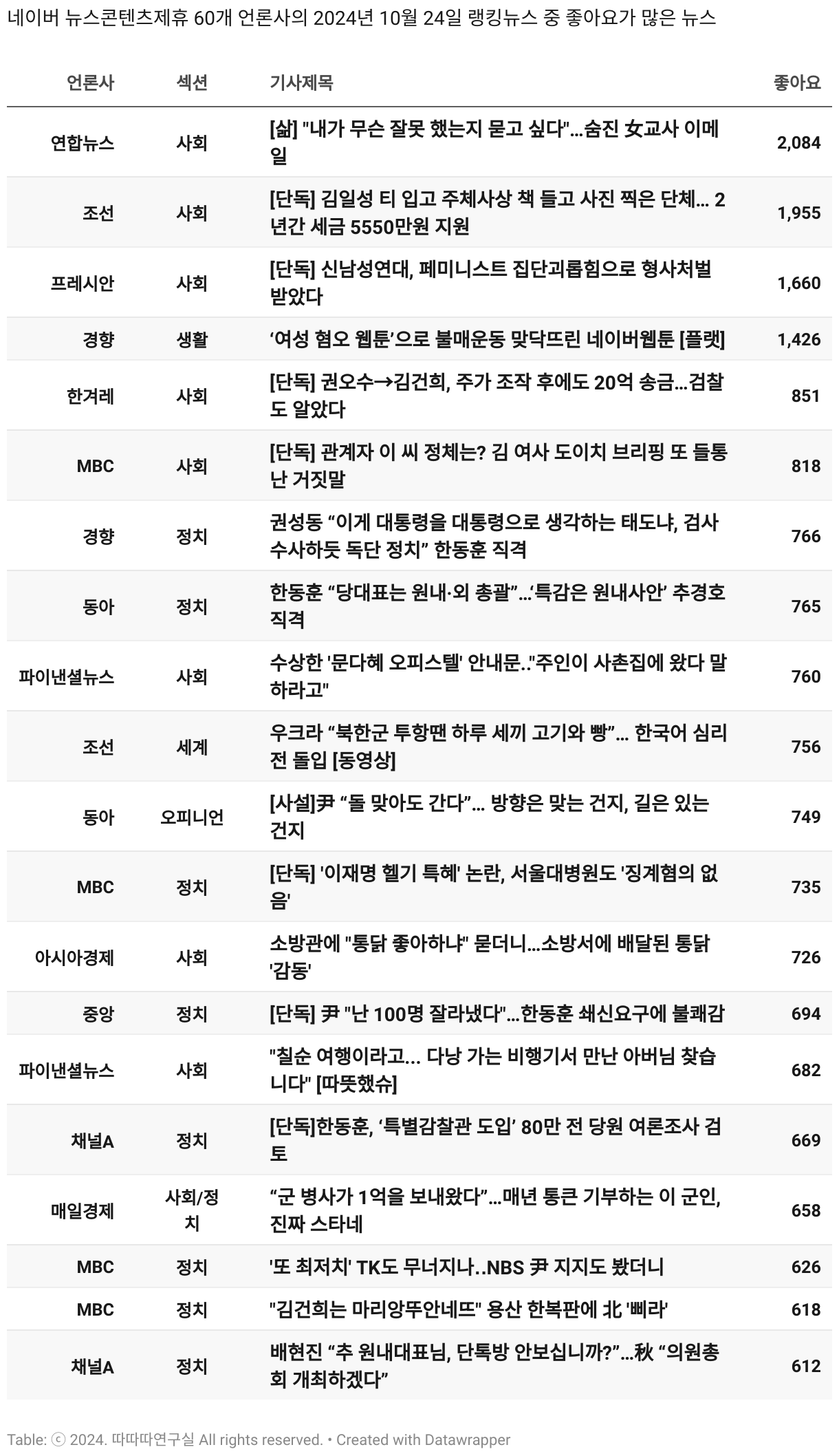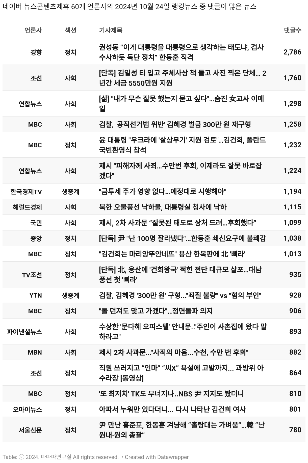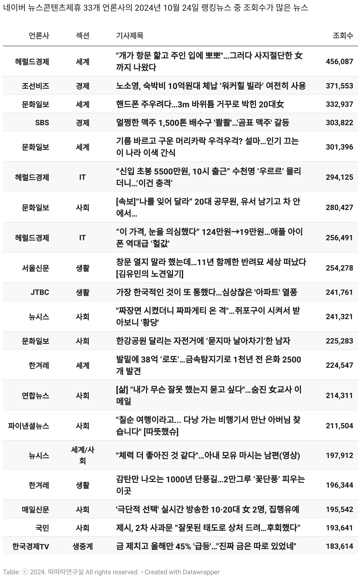 *데이터 수집 기간 : 2024년 6월 10일 *데이터 수집 대상 : 네이버 뉴스콘텐츠제휴 60개 언론사. 종합일간지 10개(경향신문, 국민일보, 동아일보, 문화일보, 서울신문, 세계일보, 조선일보, 중앙일보, 한겨레신문, 한국일보), 방송/통신사 14개(뉴스1, 뉴시스, 연합뉴스, 연합뉴스TV, 채널A, 한국경제TV, JTBC, KBS, MBC, MBN, SBS, SBS BIZ, TV조선, YTN), 경제지 11개(매일경제, 머니투데이, 비즈워치, 서울경제, 아시아경제, 이데일리, 조선비즈, 조세일보, 파이낸셜뉴스, 한국경제(유튜브제외), 헤럴드경제) 인터넷 8개(노컷뉴스, 더팩트, 데일리안, 머니S, 미디어오늘, 아이뉴스24, 오마이뉴스, 프레시안), IT 5개(디지털데일리,디지털타임스, 블로터, 전자신문, 지디넷코리아), 지역 12개(강원도민일보, 강원일보, 경기일보, 국제신문, 대구MBC, 대전일보, 매일신문, 부산일보, 전주MBC, CJB청주방송, JIBS, kbc광주방송)