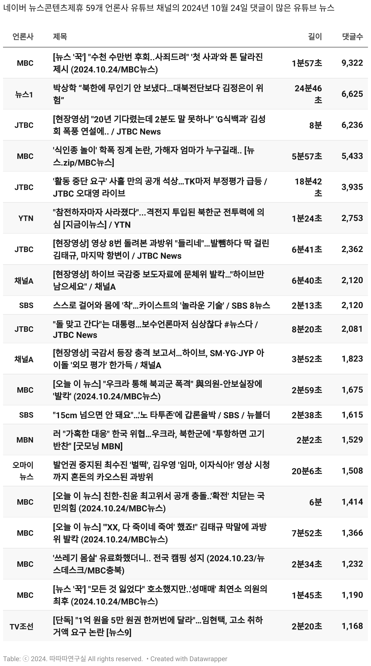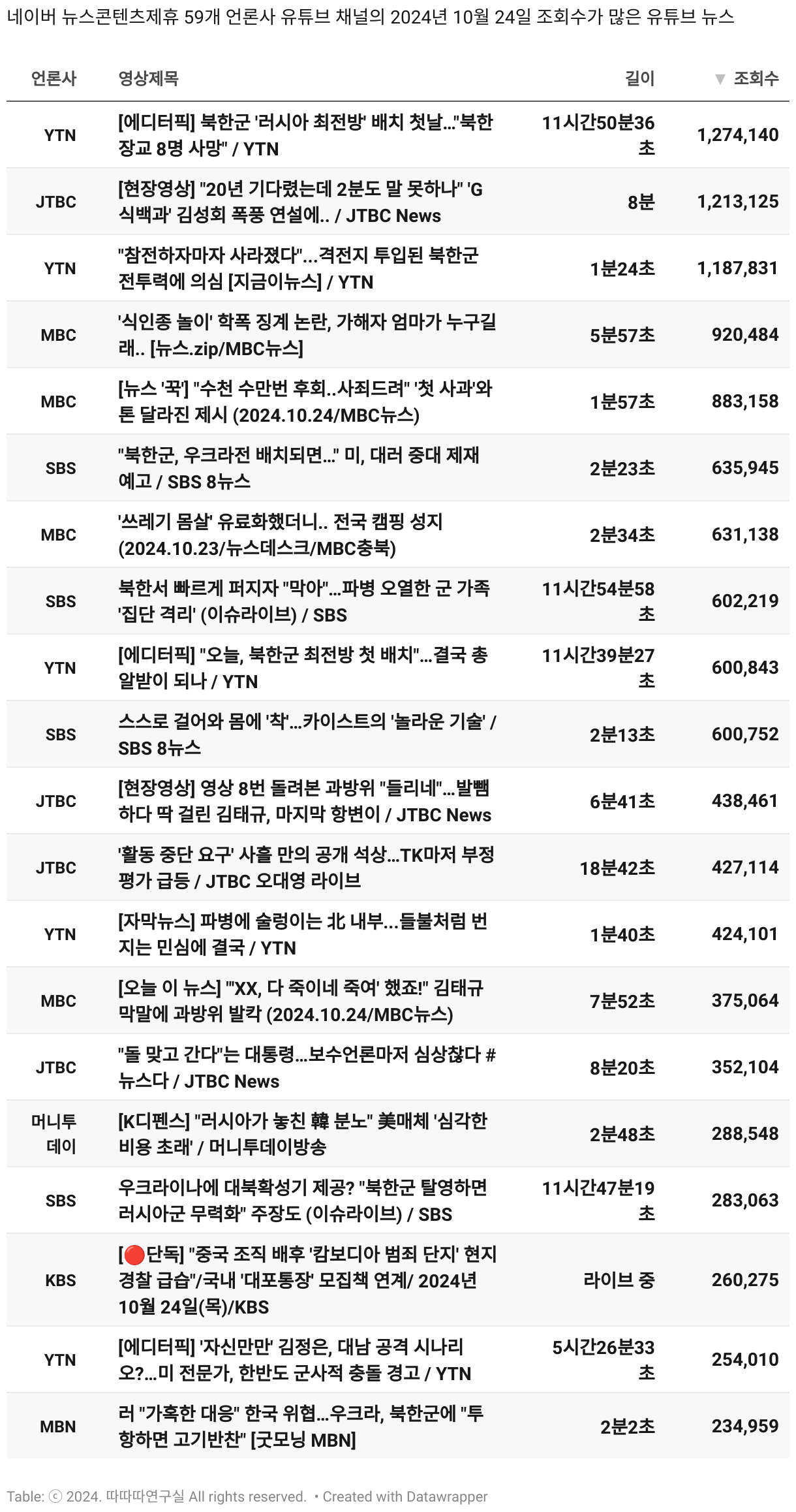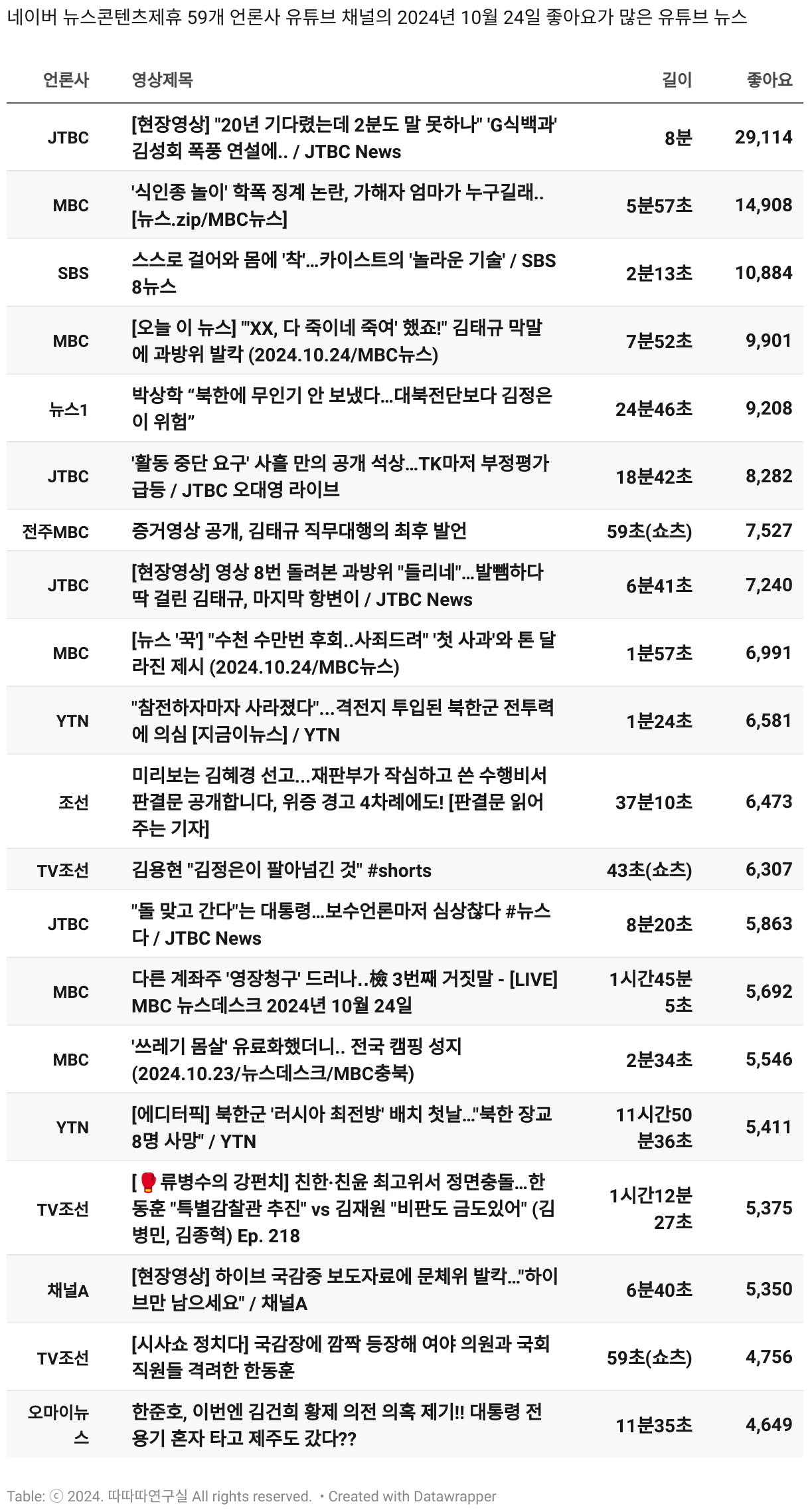 *데이터 수집 기간 : 2024년 6월 10일 *데이터 수집 대상 : 네이버 뉴스콘텐츠제휴 60개 언론사. 종합일간지 10개(경향신문, 국민일보, 동아일보, 문화일보, 서울신문, 세계일보, 조선일보, 중앙일보, 한겨레신문, 한국일보), 방송/통신사 14개(뉴스1, 뉴시스, 연합뉴스, 연합뉴스TV, 채널A, 한국경제TV, JTBC, KBS, MBC, MBN, SBS, SBS BIZ, TV조선, YTN), 경제지 11개(매일경제, 머니투데이, 비즈워치, 서울경제, 아시아경제, 이데일리, 조선비즈, 조세일보, 파이낸셜뉴스, 한국경제(유튜브제외), 헤럴드경제) 인터넷 8개(노컷뉴스, 더팩트, 데일리안, 머니S, 미디어오늘, 아이뉴스24, 오마이뉴스, 프레시안), IT 5개(디지털데일리,디지털타임스, 블로터, 전자신문, 지디넷코리아), 지역 12개(강원도민일보, 강원일보, 경기일보, 국제신문, 대구MBC, 대전일보, 매일신문, 부산일보, 전주MBC, CJB청주방송, JIBS, kbc광주방송)