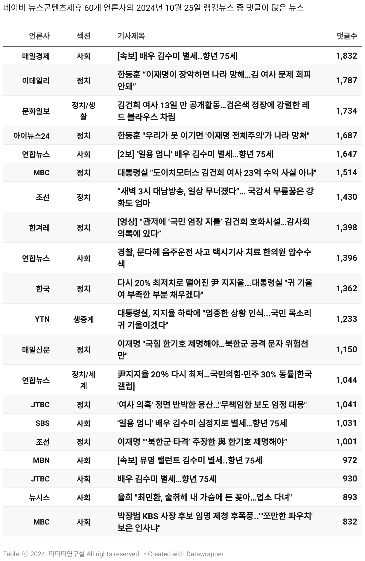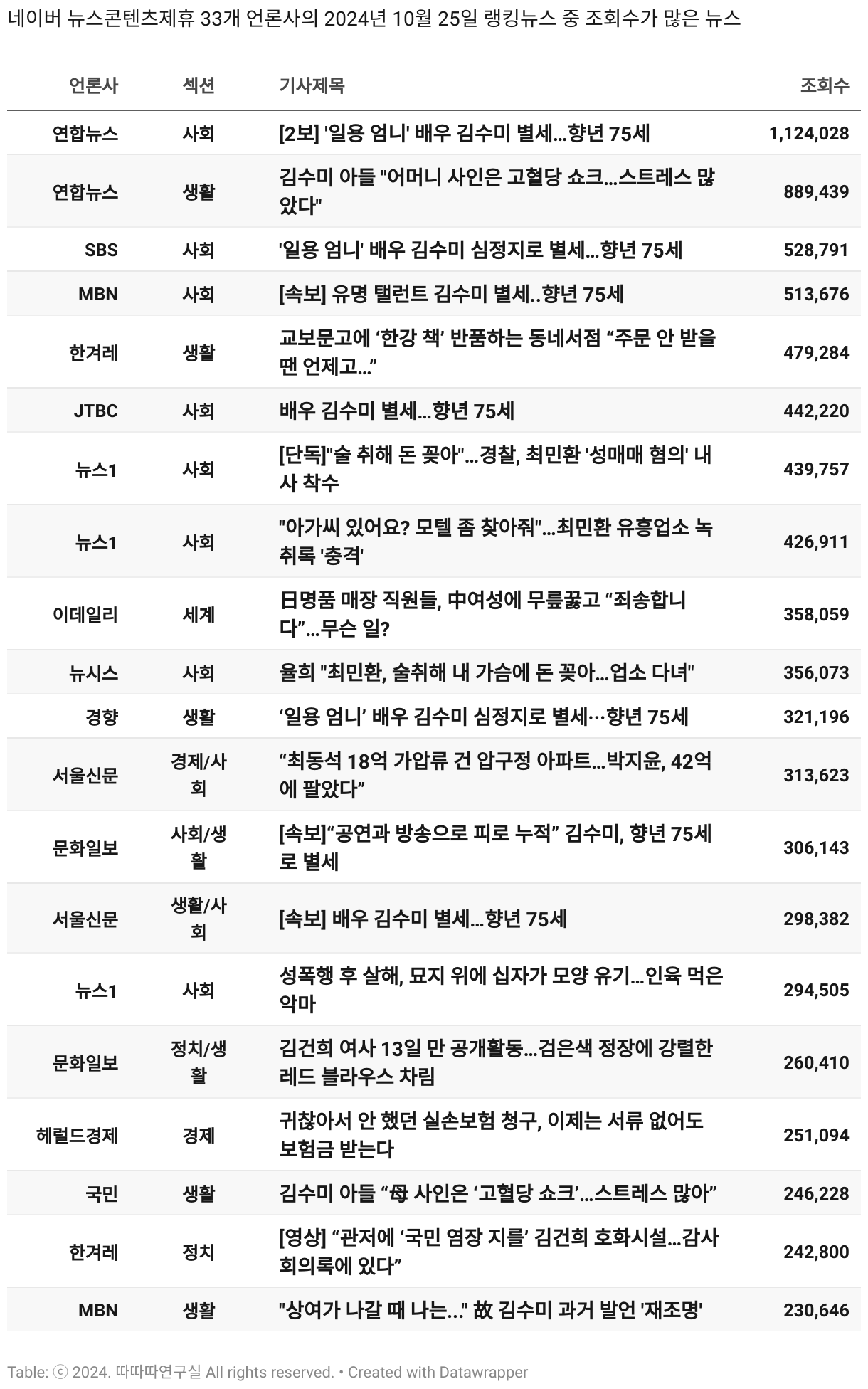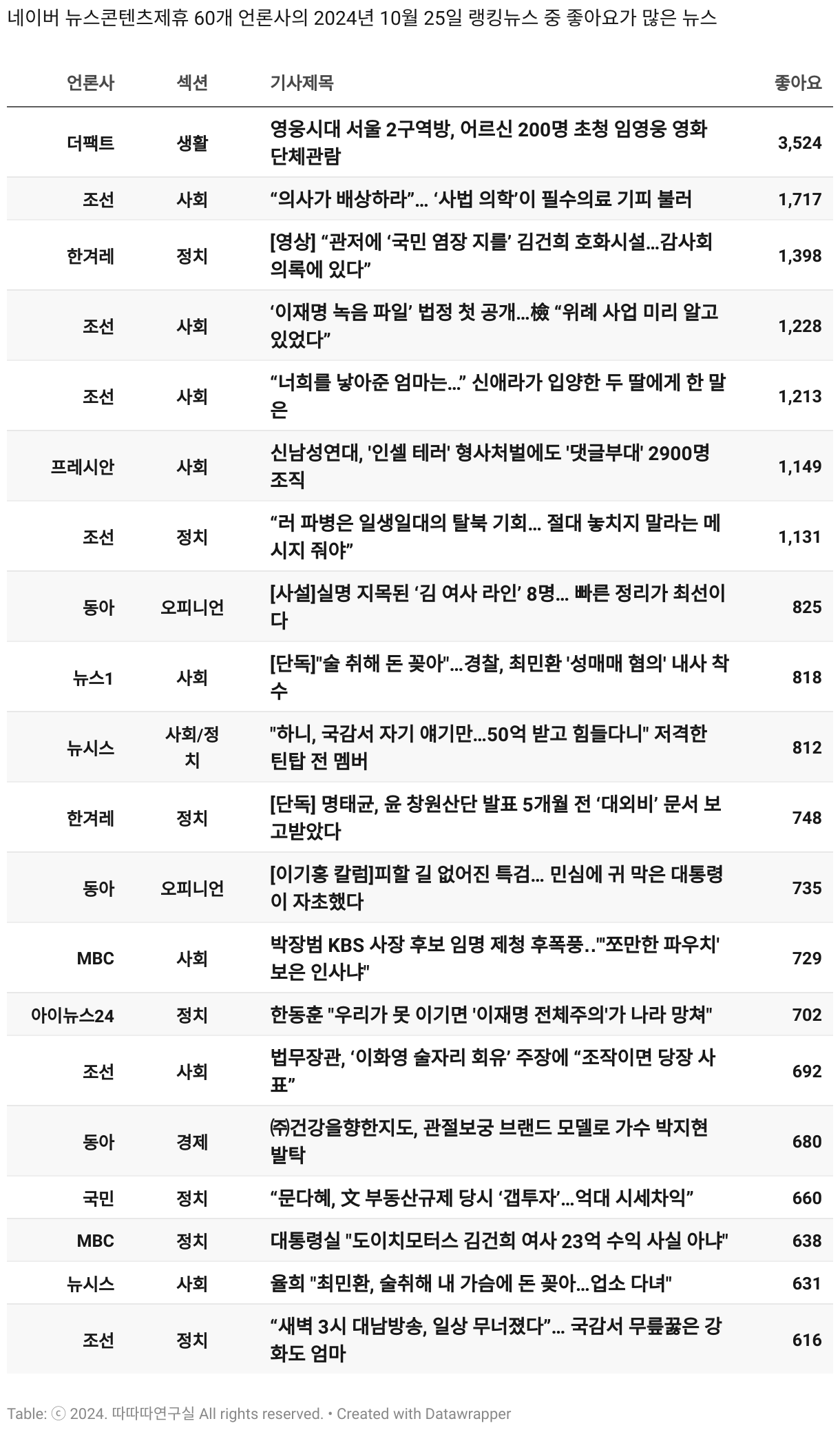 *데이터 수집 기간 : 2024년 6월 10일 *데이터 수집 대상 : 네이버 뉴스콘텐츠제휴 60개 언론사. 종합일간지 10개(경향신문, 국민일보, 동아일보, 문화일보, 서울신문, 세계일보, 조선일보, 중앙일보, 한겨레신문, 한국일보), 방송/통신사 14개(뉴스1, 뉴시스, 연합뉴스, 연합뉴스TV, 채널A, 한국경제TV, JTBC, KBS, MBC, MBN, SBS, SBS BIZ, TV조선, YTN), 경제지 11개(매일경제, 머니투데이, 비즈워치, 서울경제, 아시아경제, 이데일리, 조선비즈, 조세일보, 파이낸셜뉴스, 한국경제(유튜브제외), 헤럴드경제) 인터넷 8개(노컷뉴스, 더팩트, 데일리안, 머니S, 미디어오늘, 아이뉴스24, 오마이뉴스, 프레시안), IT 5개(디지털데일리,디지털타임스, 블로터, 전자신문, 지디넷코리아), 지역 12개(강원도민일보, 강원일보, 경기일보, 국제신문, 대구MBC, 대전일보, 매일신문, 부산일보, 전주MBC, CJB청주방송, JIBS, kbc광주방송)