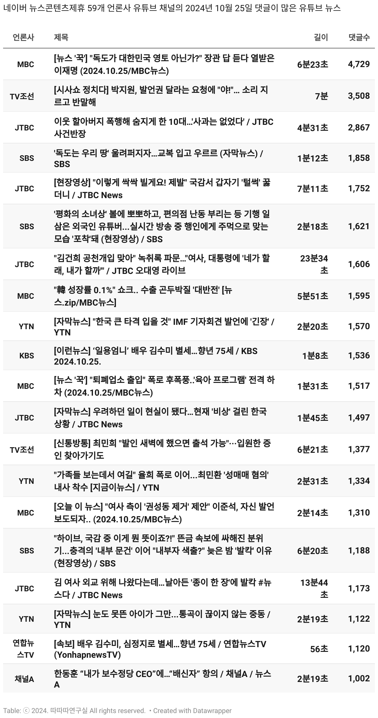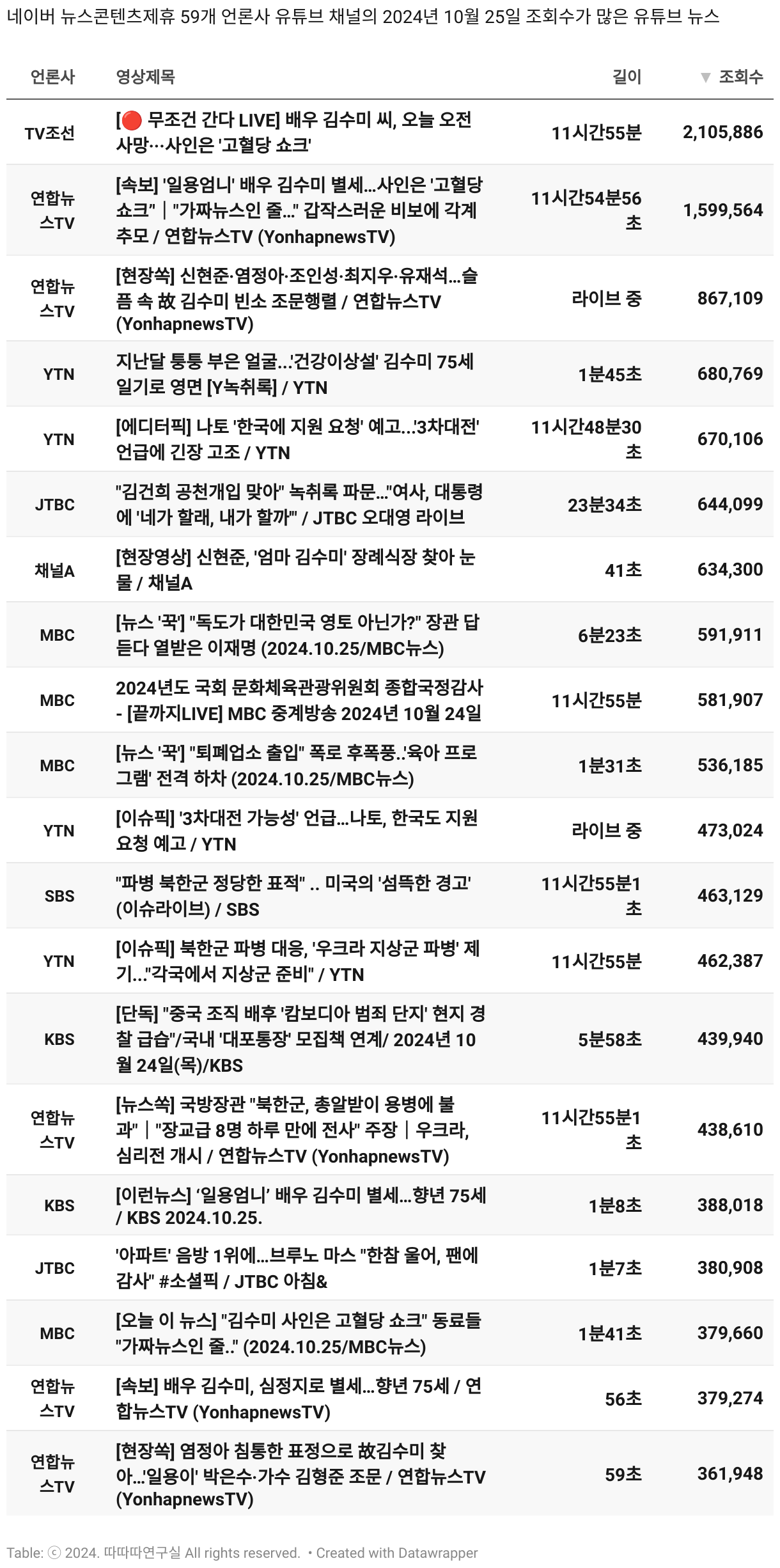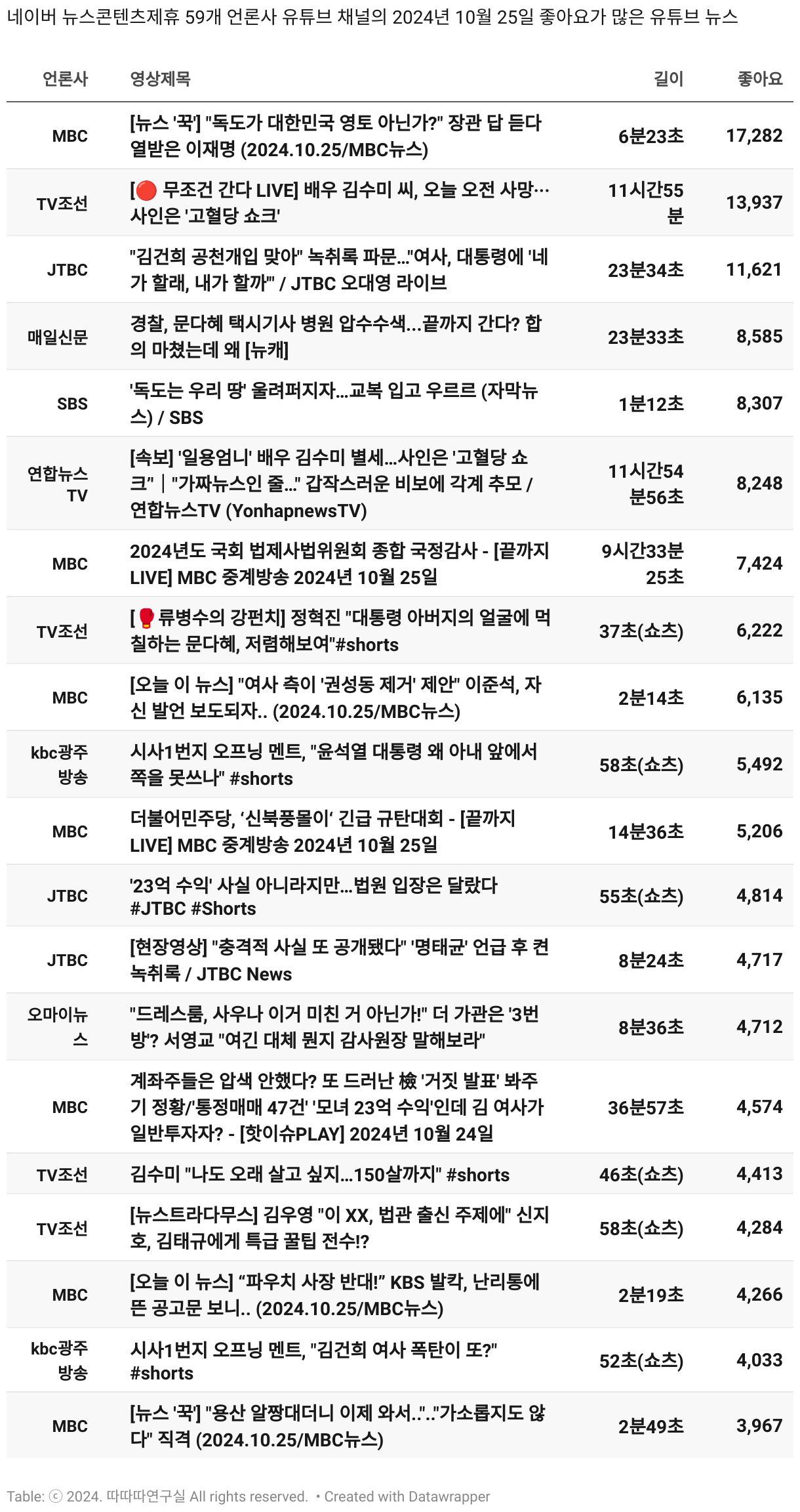 *데이터 수집 기간 : 2024년 6월 10일 *데이터 수집 대상 : 네이버 뉴스콘텐츠제휴 60개 언론사. 종합일간지 10개(경향신문, 국민일보, 동아일보, 문화일보, 서울신문, 세계일보, 조선일보, 중앙일보, 한겨레신문, 한국일보), 방송/통신사 14개(뉴스1, 뉴시스, 연합뉴스, 연합뉴스TV, 채널A, 한국경제TV, JTBC, KBS, MBC, MBN, SBS, SBS BIZ, TV조선, YTN), 경제지 11개(매일경제, 머니투데이, 비즈워치, 서울경제, 아시아경제, 이데일리, 조선비즈, 조세일보, 파이낸셜뉴스, 한국경제(유튜브제외), 헤럴드경제) 인터넷 8개(노컷뉴스, 더팩트, 데일리안, 머니S, 미디어오늘, 아이뉴스24, 오마이뉴스, 프레시안), IT 5개(디지털데일리,디지털타임스, 블로터, 전자신문, 지디넷코리아), 지역 12개(강원도민일보, 강원일보, 경기일보, 국제신문, 대구MBC, 대전일보, 매일신문, 부산일보, 전주MBC, CJB청주방송, JIBS, kbc광주방송)