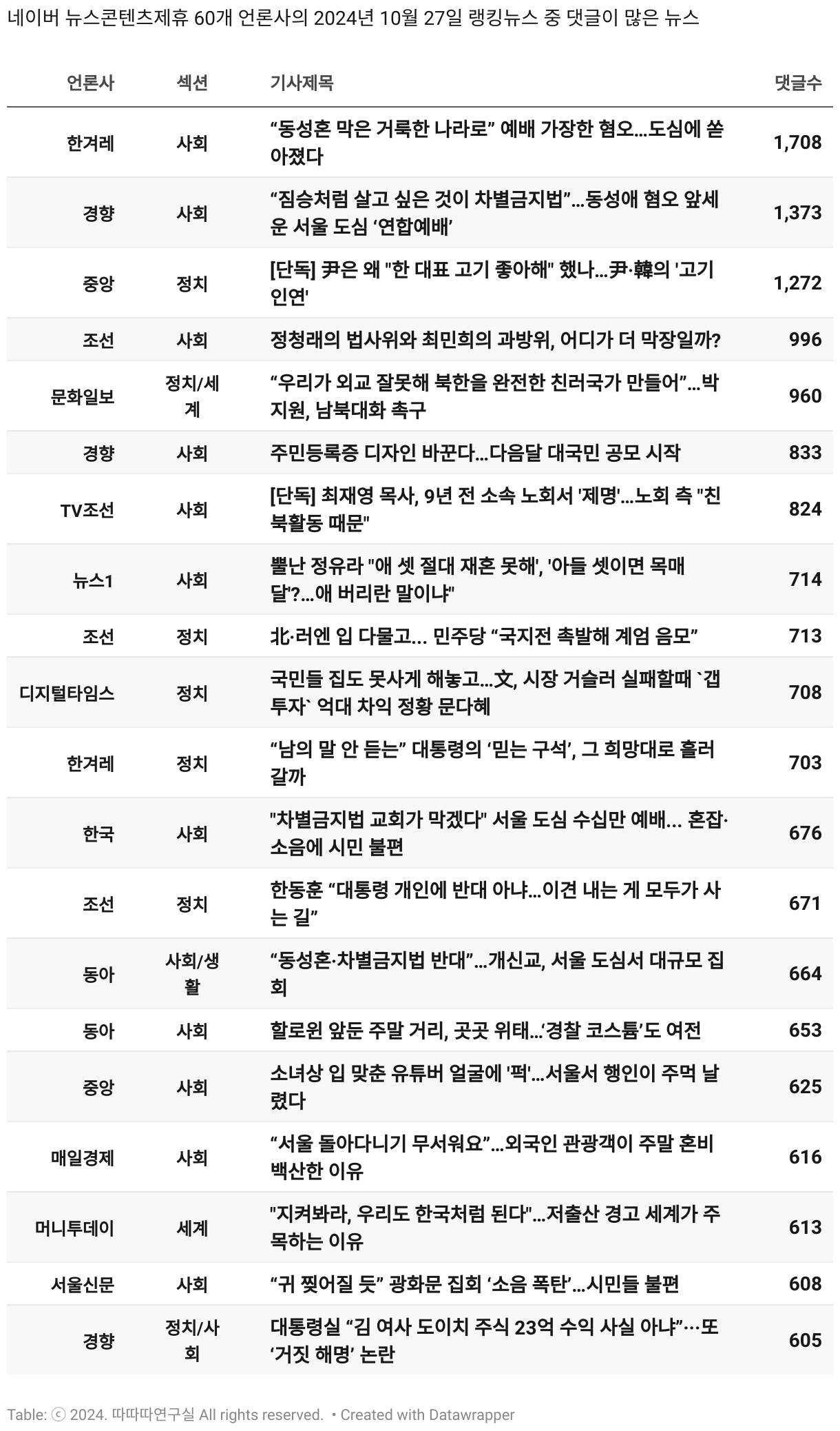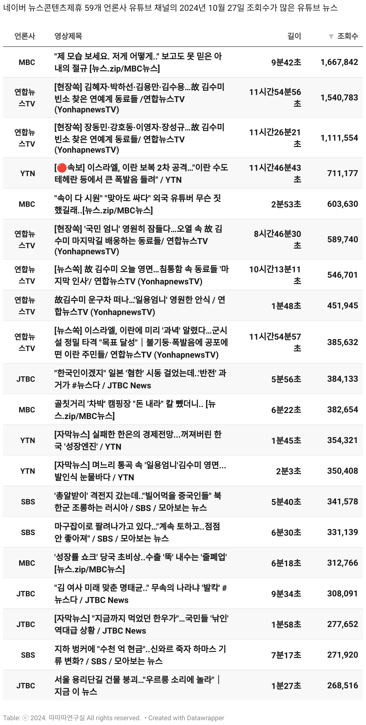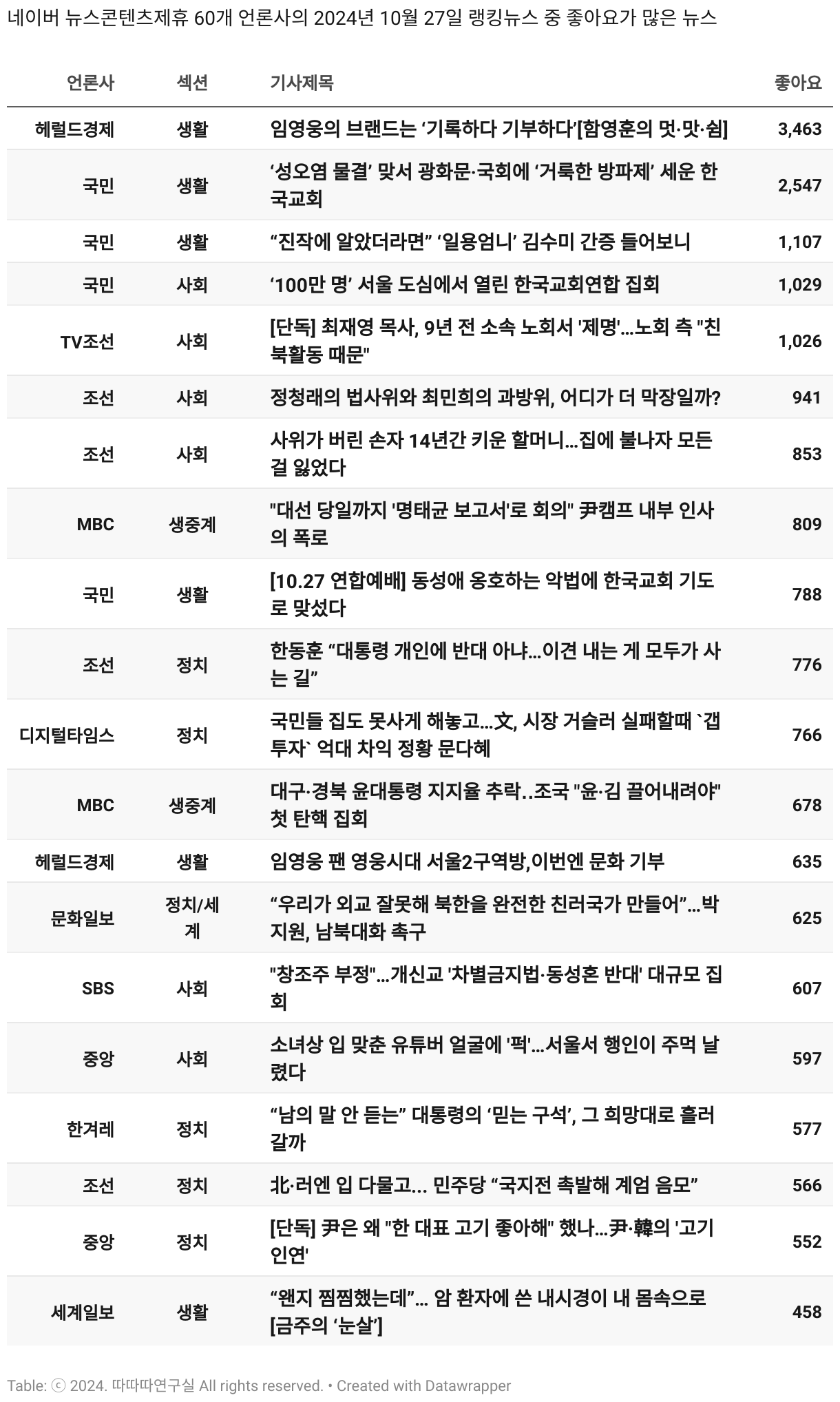 *데이터 수집 기간 : 2024년 6월 10일 *데이터 수집 대상 : 네이버 뉴스콘텐츠제휴 60개 언론사. 종합일간지 10개(경향신문, 국민일보, 동아일보, 문화일보, 서울신문, 세계일보, 조선일보, 중앙일보, 한겨레신문, 한국일보), 방송/통신사 14개(뉴스1, 뉴시스, 연합뉴스, 연합뉴스TV, 채널A, 한국경제TV, JTBC, KBS, MBC, MBN, SBS, SBS BIZ, TV조선, YTN), 경제지 11개(매일경제, 머니투데이, 비즈워치, 서울경제, 아시아경제, 이데일리, 조선비즈, 조세일보, 파이낸셜뉴스, 한국경제(유튜브제외), 헤럴드경제) 인터넷 8개(노컷뉴스, 더팩트, 데일리안, 머니S, 미디어오늘, 아이뉴스24, 오마이뉴스, 프레시안), IT 5개(디지털데일리,디지털타임스, 블로터, 전자신문, 지디넷코리아), 지역 12개(강원도민일보, 강원일보, 경기일보, 국제신문, 대구MBC, 대전일보, 매일신문, 부산일보, 전주MBC, CJB청주방송, JIBS, kbc광주방송)