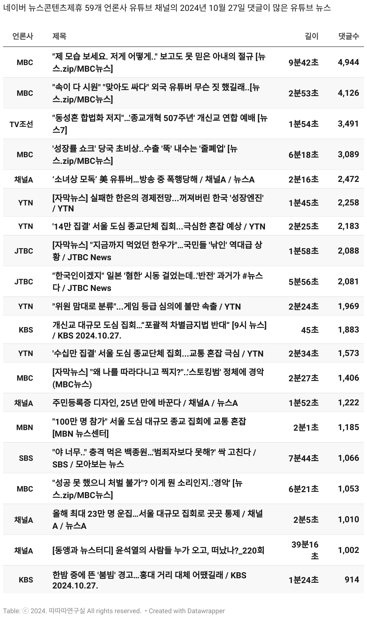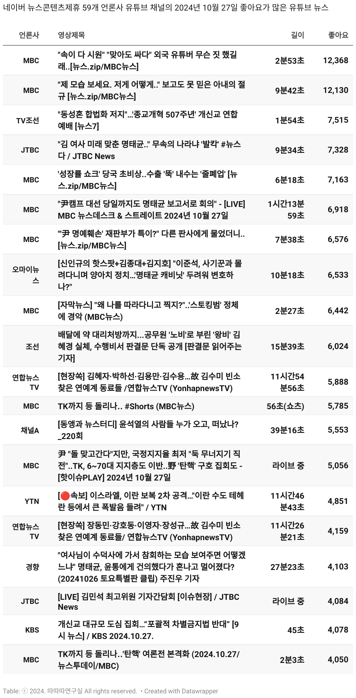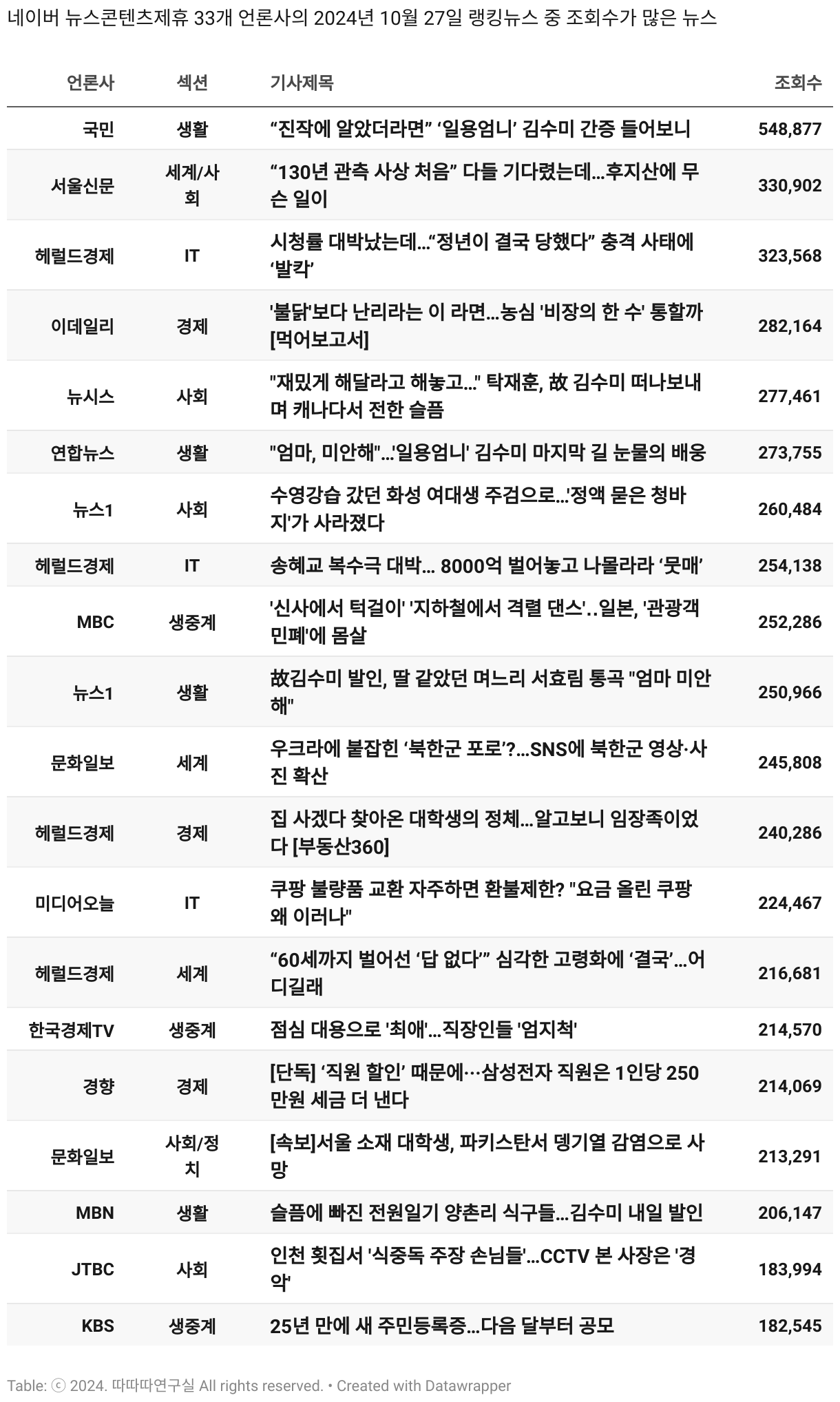*데이터 수집 기간 : 2024년 6월 10일 *데이터 수집 대상 : 네이버 뉴스콘텐츠제휴 60개 언론사. 종합일간지 10개(경향신문, 국민일보, 동아일보, 문화일보, 서울신문, 세계일보, 조선일보, 중앙일보, 한겨레신문, 한국일보), 방송/통신사 14개(뉴스1, 뉴시스, 연합뉴스, 연합뉴스TV, 채널A, 한국경제TV, JTBC, KBS, MBC, MBN, SBS, SBS BIZ, TV조선, YTN), 경제지 11개(매일경제, 머니투데이, 비즈워치, 서울경제, 아시아경제, 이데일리, 조선비즈, 조세일보, 파이낸셜뉴스, 한국경제(유튜브제외), 헤럴드경제) 인터넷 8개(노컷뉴스, 더팩트, 데일리안, 머니S, 미디어오늘, 아이뉴스24, 오마이뉴스, 프레시안), IT 5개(디지털데일리,디지털타임스, 블로터, 전자신문, 지디넷코리아), 지역 12개(강원도민일보, 강원일보, 경기일보, 국제신문, 대구MBC, 대전일보, 매일신문, 부산일보, 전주MBC, CJB청주방송, JIBS, kbc광주방송)