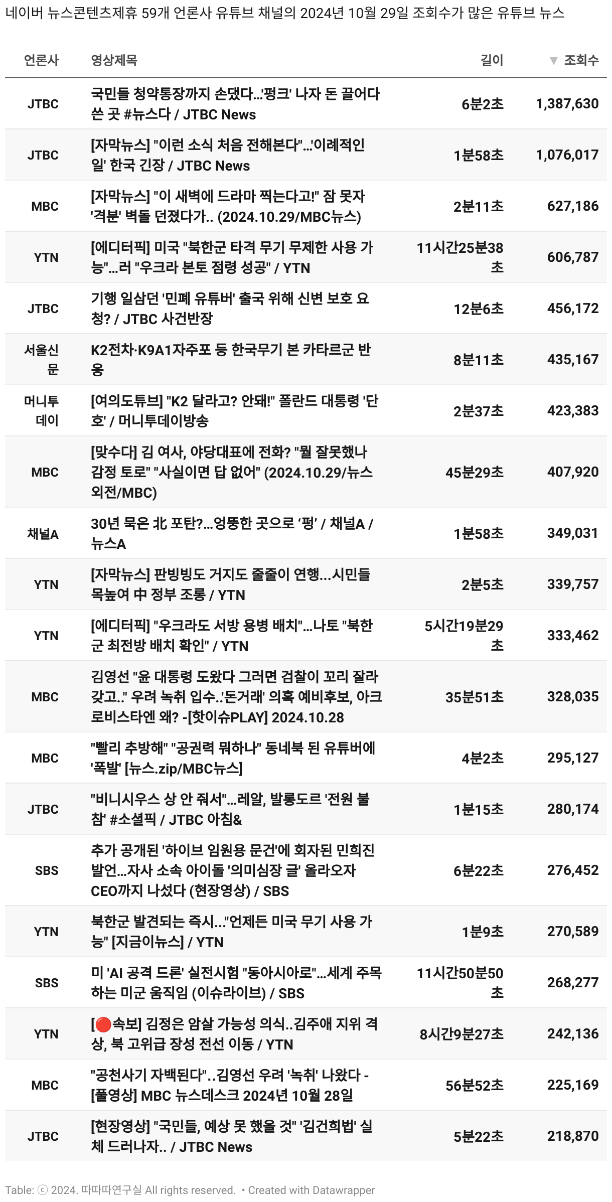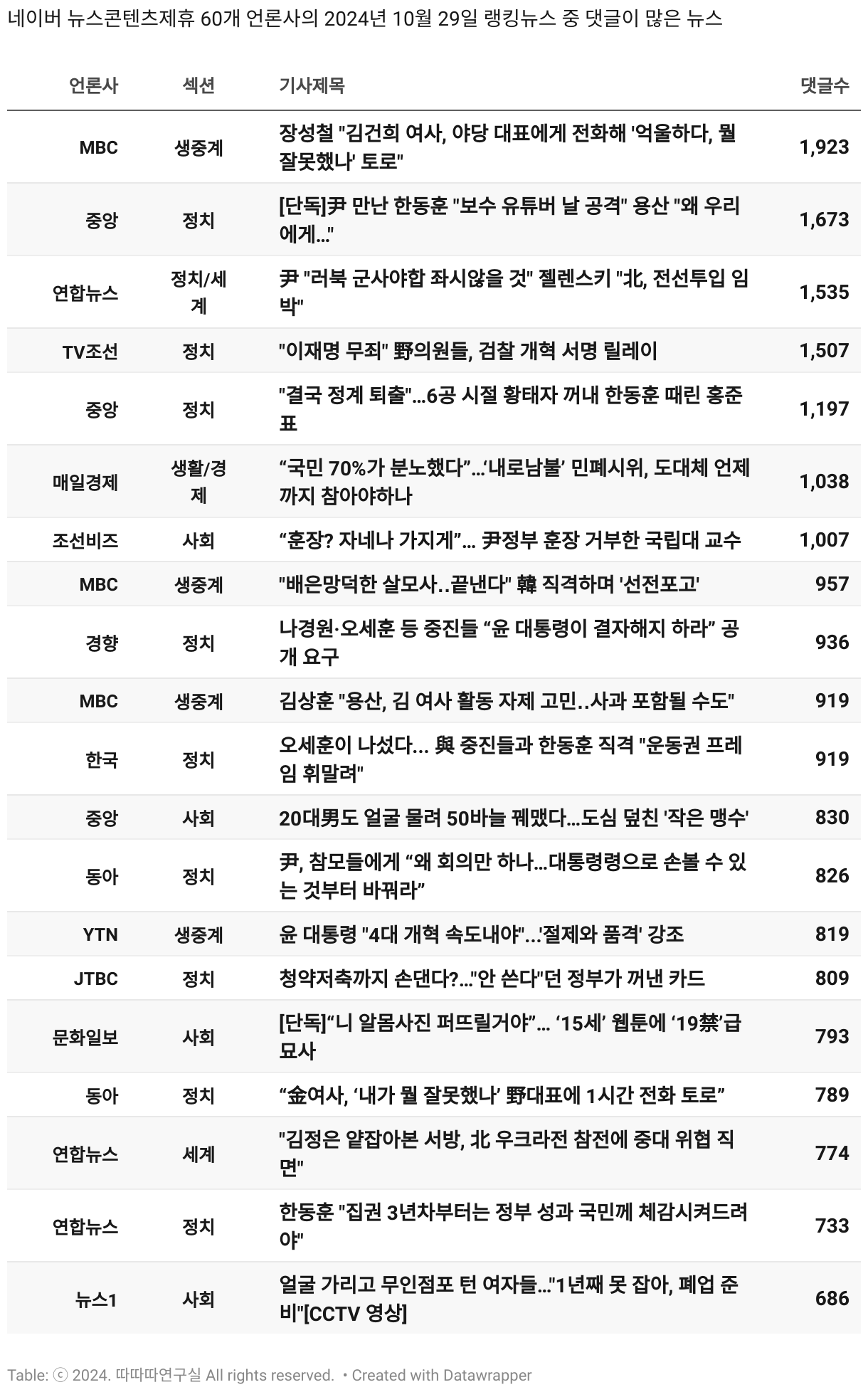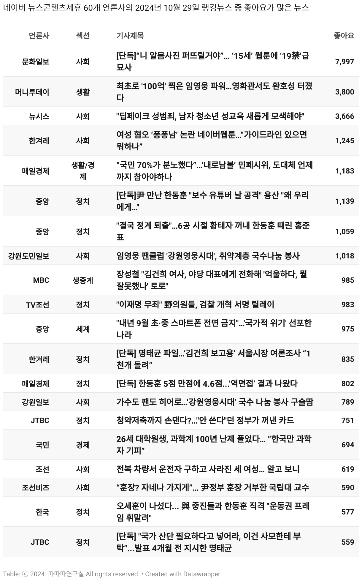 *데이터 수집 기간 : 2024년 6월 10일 *데이터 수집 대상 : 네이버 뉴스콘텐츠제휴 60개 언론사. 종합일간지 10개(경향신문, 국민일보, 동아일보, 문화일보, 서울신문, 세계일보, 조선일보, 중앙일보, 한겨레신문, 한국일보), 방송/통신사 14개(뉴스1, 뉴시스, 연합뉴스, 연합뉴스TV, 채널A, 한국경제TV, JTBC, KBS, MBC, MBN, SBS, SBS BIZ, TV조선, YTN), 경제지 11개(매일경제, 머니투데이, 비즈워치, 서울경제, 아시아경제, 이데일리, 조선비즈, 조세일보, 파이낸셜뉴스, 한국경제(유튜브제외), 헤럴드경제) 인터넷 8개(노컷뉴스, 더팩트, 데일리안, 머니S, 미디어오늘, 아이뉴스24, 오마이뉴스, 프레시안), IT 5개(디지털데일리,디지털타임스, 블로터, 전자신문, 지디넷코리아), 지역 12개(강원도민일보, 강원일보, 경기일보, 국제신문, 대구MBC, 대전일보, 매일신문, 부산일보, 전주MBC, CJB청주방송, JIBS, kbc광주방송)