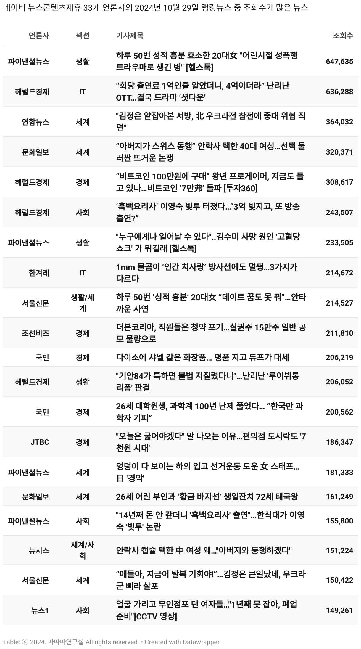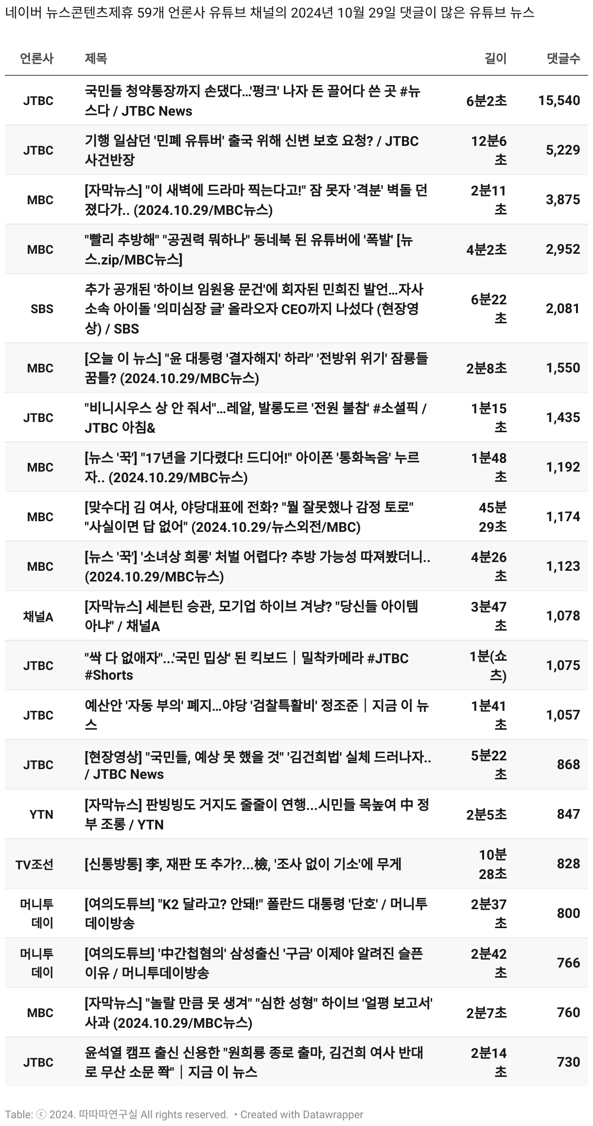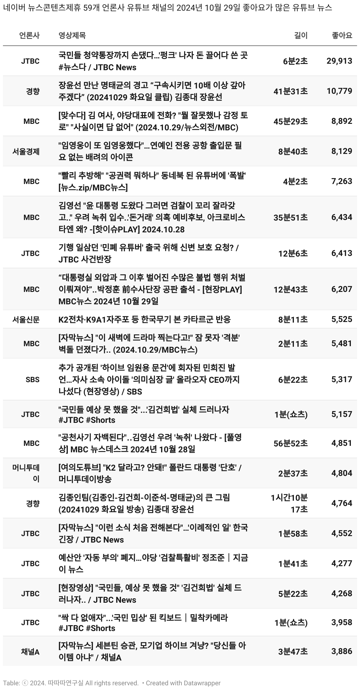 *데이터 수집 기간 : 2024년 6월 10일 *데이터 수집 대상 : 네이버 뉴스콘텐츠제휴 60개 언론사. 종합일간지 10개(경향신문, 국민일보, 동아일보, 문화일보, 서울신문, 세계일보, 조선일보, 중앙일보, 한겨레신문, 한국일보), 방송/통신사 14개(뉴스1, 뉴시스, 연합뉴스, 연합뉴스TV, 채널A, 한국경제TV, JTBC, KBS, MBC, MBN, SBS, SBS BIZ, TV조선, YTN), 경제지 11개(매일경제, 머니투데이, 비즈워치, 서울경제, 아시아경제, 이데일리, 조선비즈, 조세일보, 파이낸셜뉴스, 한국경제(유튜브제외), 헤럴드경제) 인터넷 8개(노컷뉴스, 더팩트, 데일리안, 머니S, 미디어오늘, 아이뉴스24, 오마이뉴스, 프레시안), IT 5개(디지털데일리,디지털타임스, 블로터, 전자신문, 지디넷코리아), 지역 12개(강원도민일보, 강원일보, 경기일보, 국제신문, 대구MBC, 대전일보, 매일신문, 부산일보, 전주MBC, CJB청주방송, JIBS, kbc광주방송)