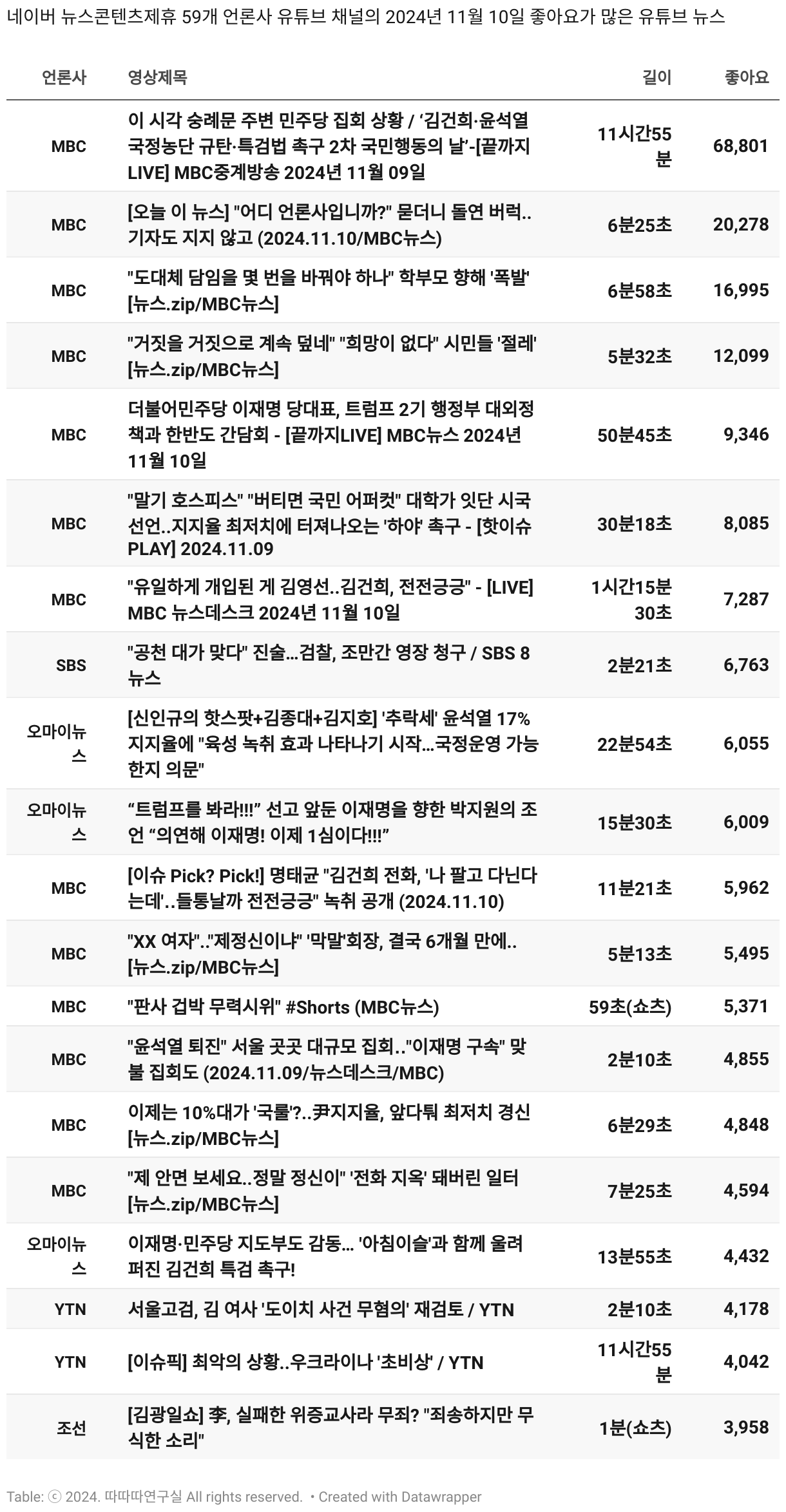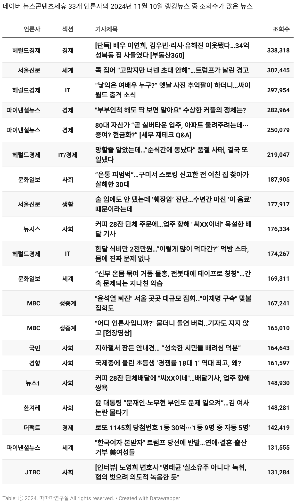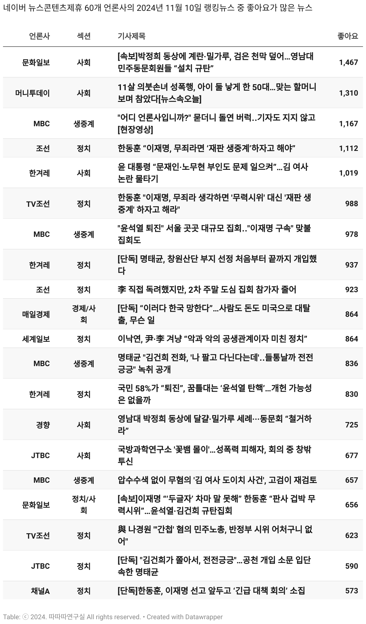*데이터 수집 기간 : 2024년 6월 10일 *데이터 수집 대상 : 네이버 뉴스콘텐츠제휴 60개 언론사. 종합일간지 10개(경향신문, 국민일보, 동아일보, 문화일보, 서울신문, 세계일보, 조선일보, 중앙일보, 한겨레신문, 한국일보), 방송/통신사 14개(뉴스1, 뉴시스, 연합뉴스, 연합뉴스TV, 채널A, 한국경제TV, JTBC, KBS, MBC, MBN, SBS, SBS BIZ, TV조선, YTN), 경제지 11개(매일경제, 머니투데이, 비즈워치, 서울경제, 아시아경제, 이데일리, 조선비즈, 조세일보, 파이낸셜뉴스, 한국경제(유튜브제외), 헤럴드경제) 인터넷 8개(노컷뉴스, 더팩트, 데일리안, 머니S, 미디어오늘, 아이뉴스24, 오마이뉴스, 프레시안), IT 5개(디지털데일리,디지털타임스, 블로터, 전자신문, 지디넷코리아), 지역 12개(강원도민일보, 강원일보, 경기일보, 국제신문, 대구MBC, 대전일보, 매일신문, 부산일보, 전주MBC, CJB청주방송, JIBS, kbc광주방송)