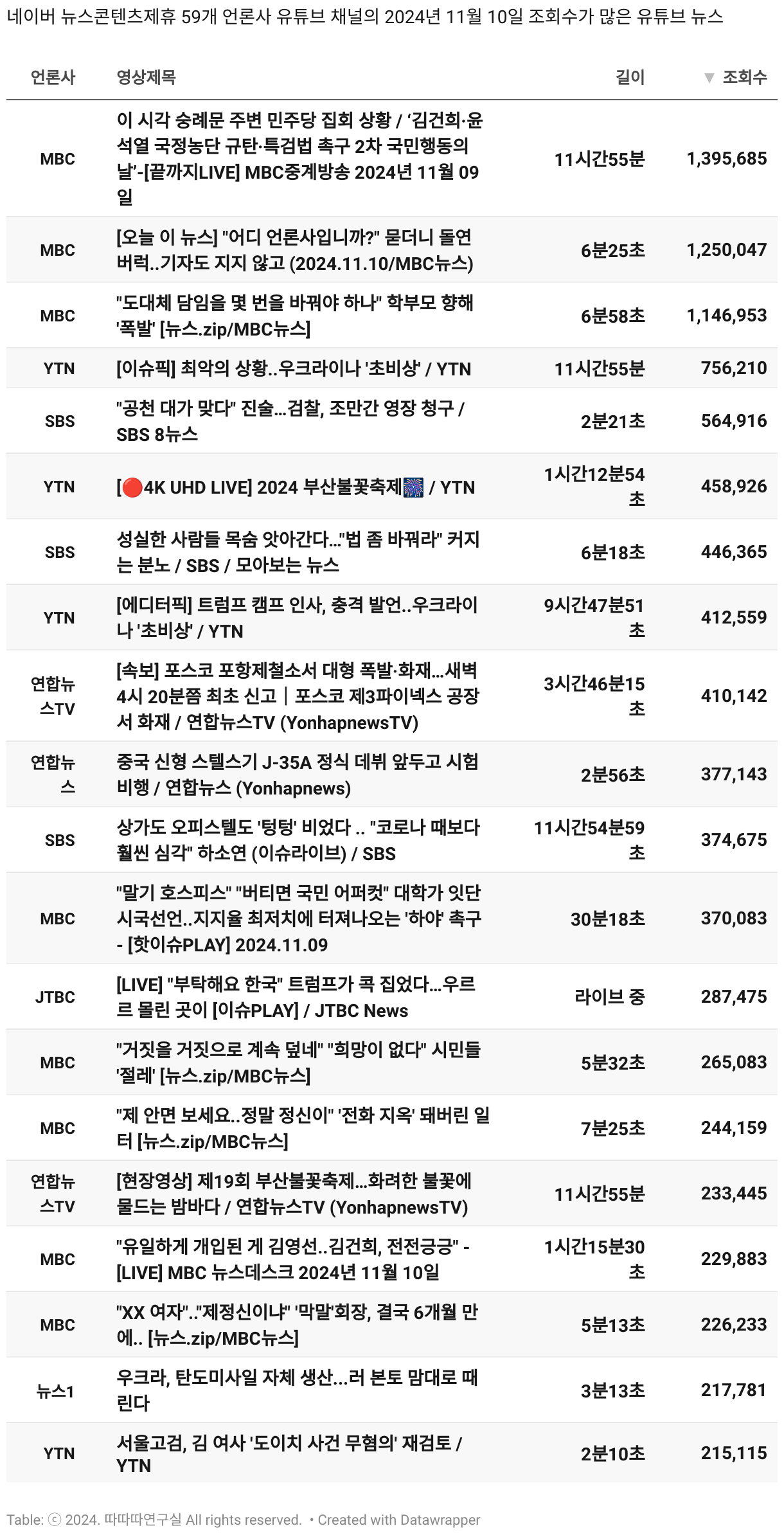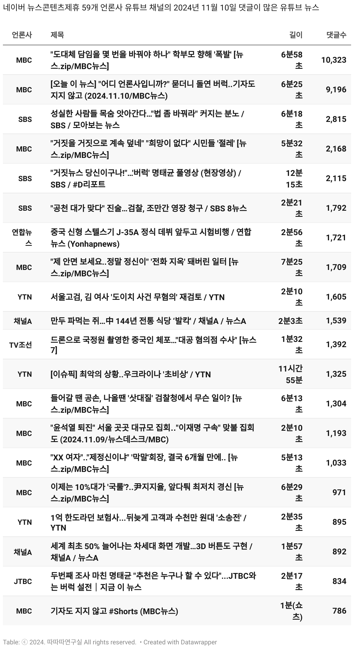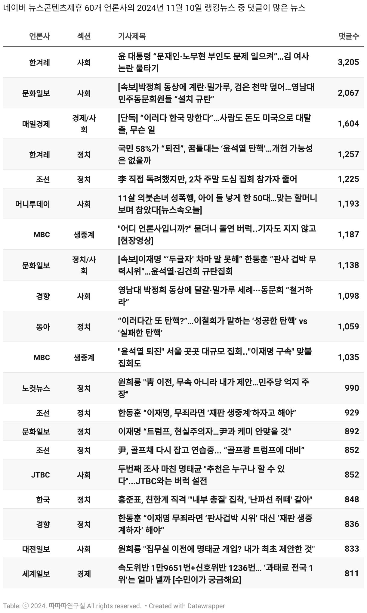 *데이터 수집 기간 : 2024년 6월 10일 *데이터 수집 대상 : 네이버 뉴스콘텐츠제휴 60개 언론사. 종합일간지 10개(경향신문, 국민일보, 동아일보, 문화일보, 서울신문, 세계일보, 조선일보, 중앙일보, 한겨레신문, 한국일보), 방송/통신사 14개(뉴스1, 뉴시스, 연합뉴스, 연합뉴스TV, 채널A, 한국경제TV, JTBC, KBS, MBC, MBN, SBS, SBS BIZ, TV조선, YTN), 경제지 11개(매일경제, 머니투데이, 비즈워치, 서울경제, 아시아경제, 이데일리, 조선비즈, 조세일보, 파이낸셜뉴스, 한국경제(유튜브제외), 헤럴드경제) 인터넷 8개(노컷뉴스, 더팩트, 데일리안, 머니S, 미디어오늘, 아이뉴스24, 오마이뉴스, 프레시안), IT 5개(디지털데일리,디지털타임스, 블로터, 전자신문, 지디넷코리아), 지역 12개(강원도민일보, 강원일보, 경기일보, 국제신문, 대구MBC, 대전일보, 매일신문, 부산일보, 전주MBC, CJB청주방송, JIBS, kbc광주방송)