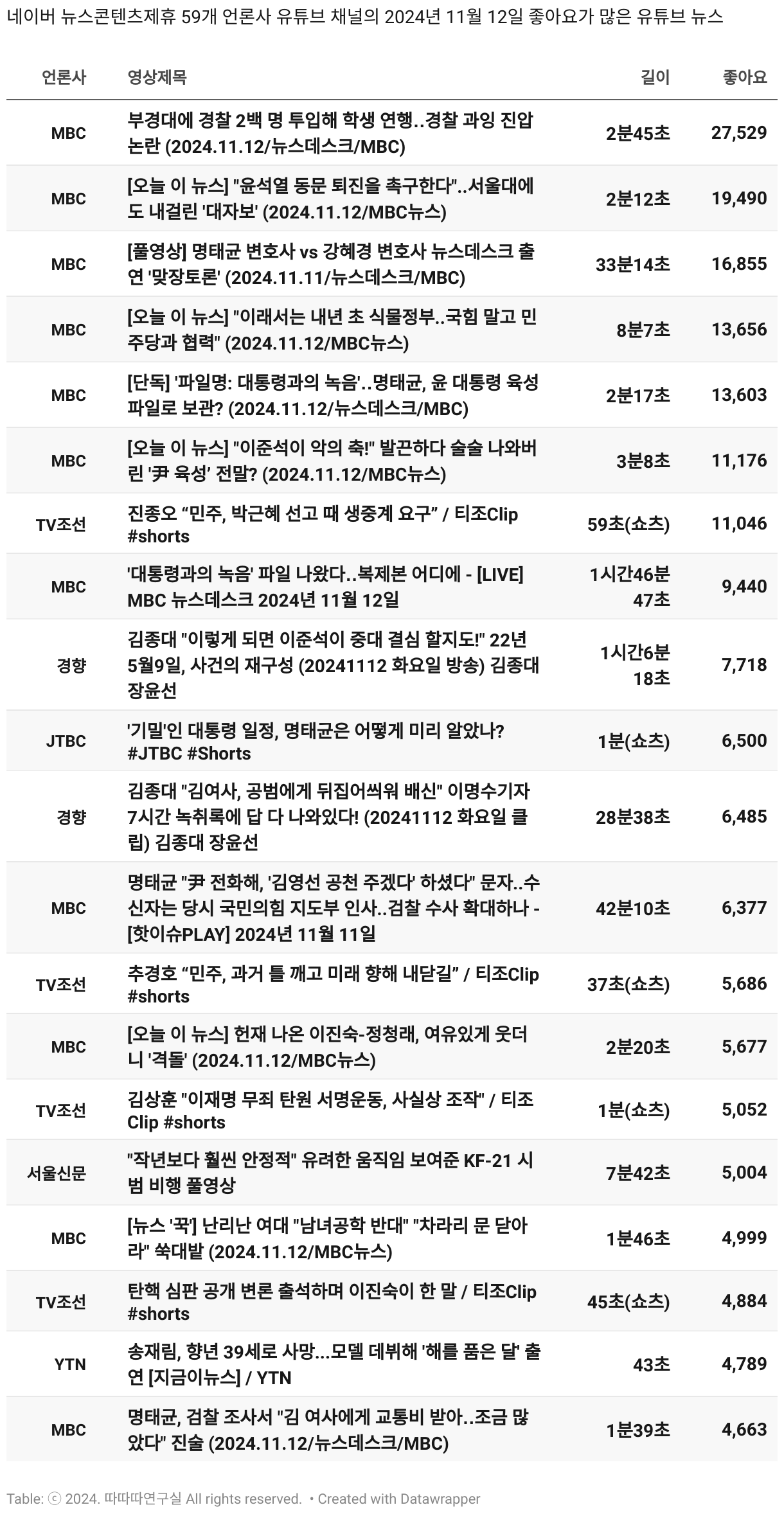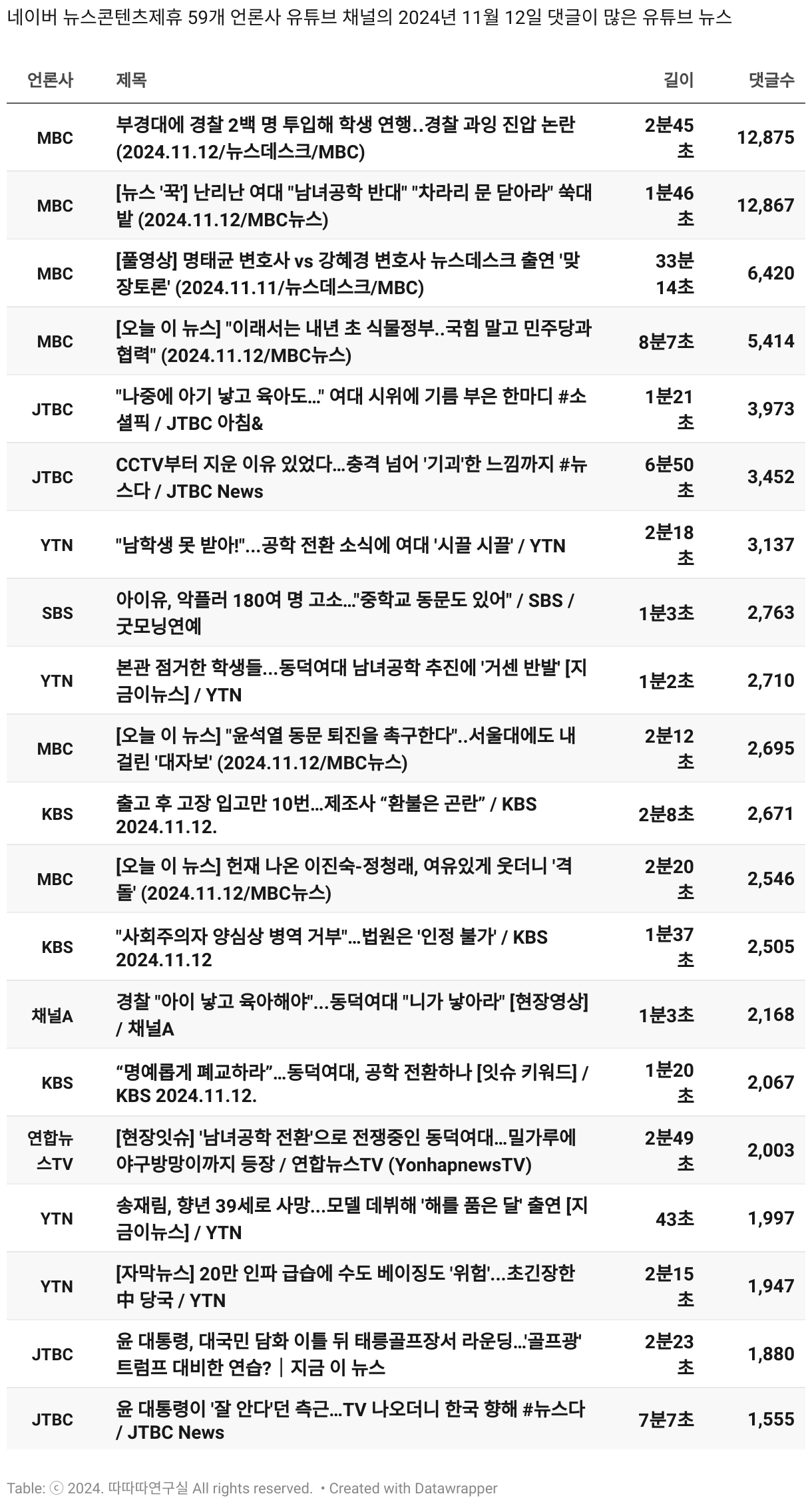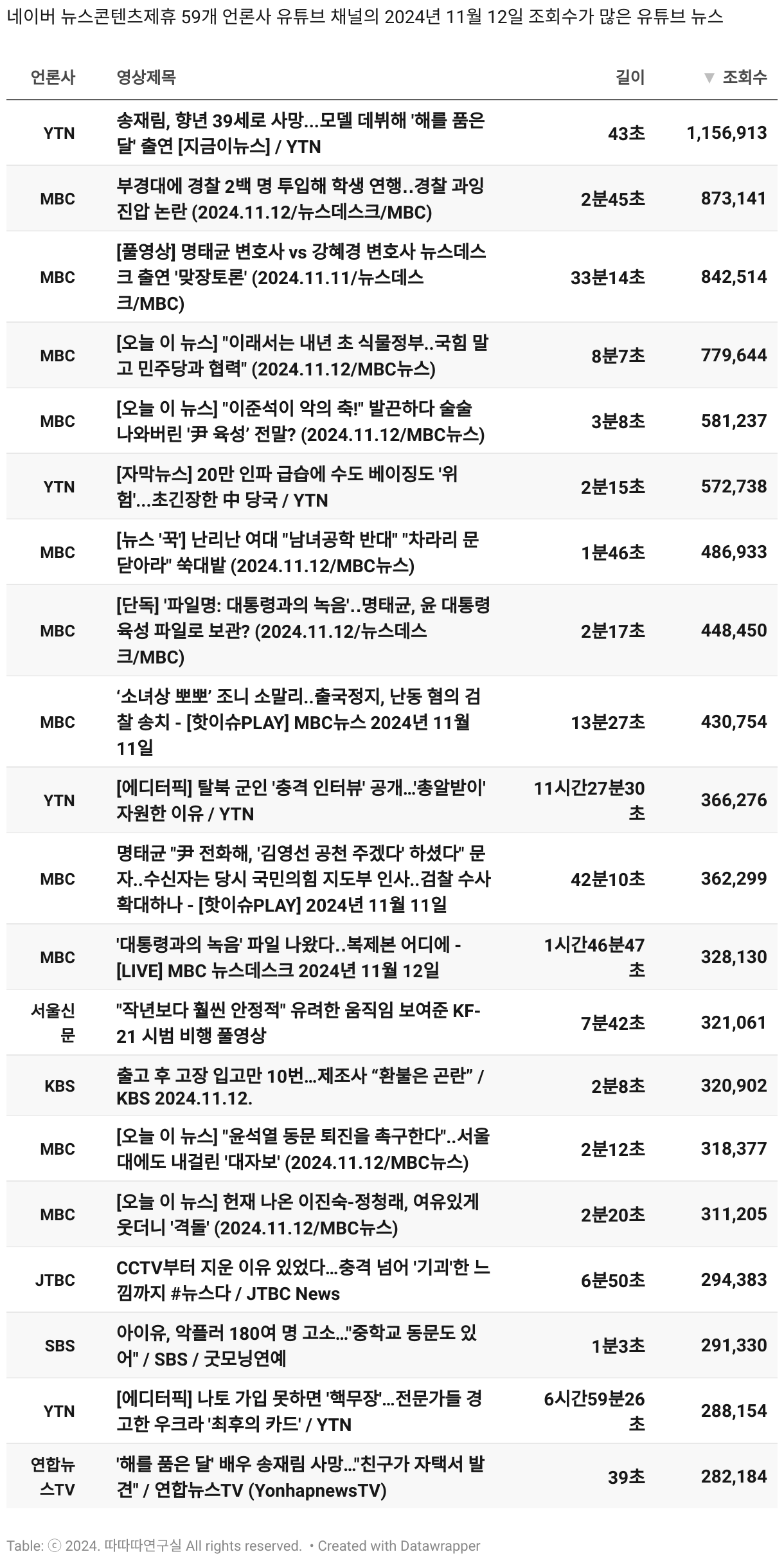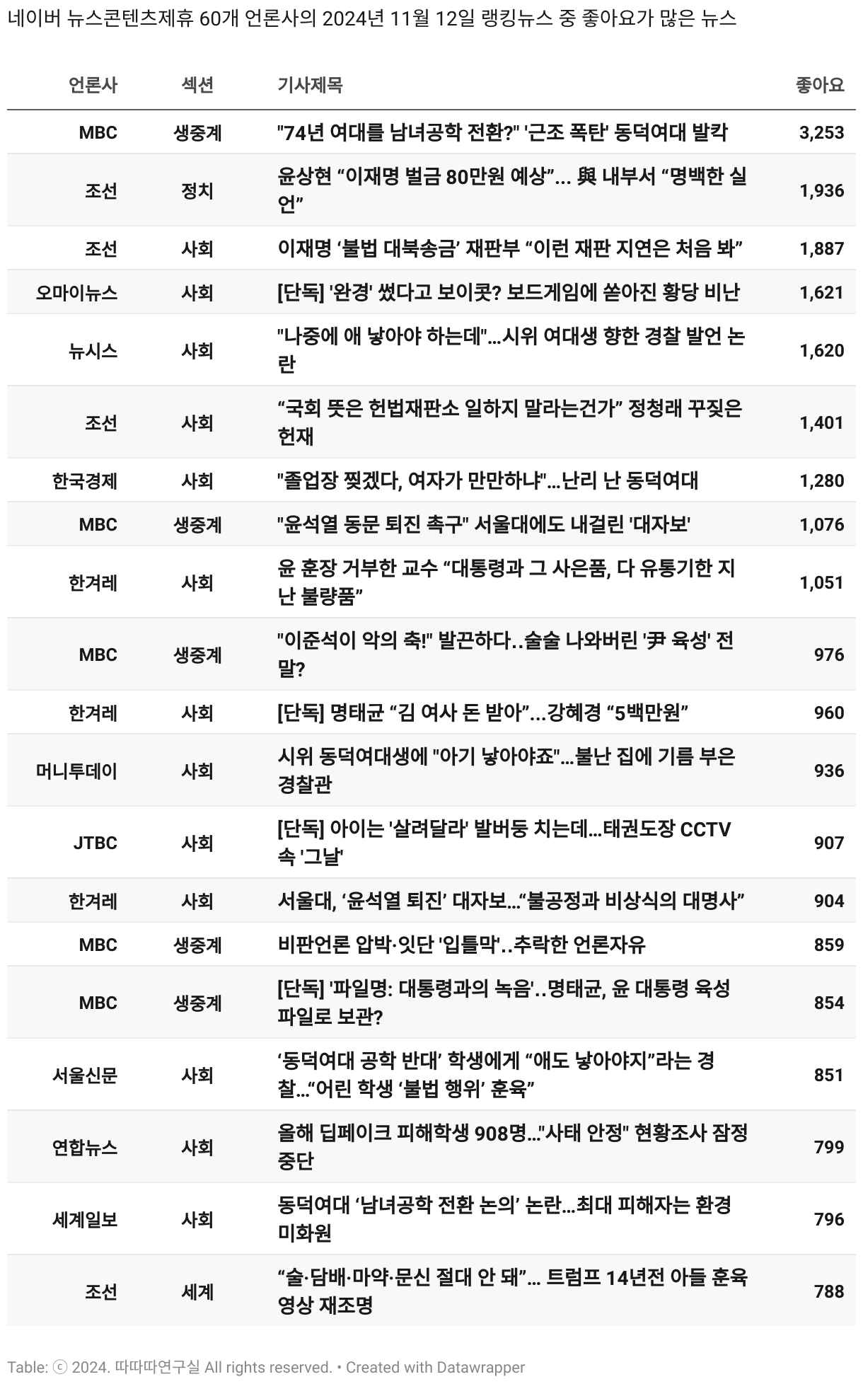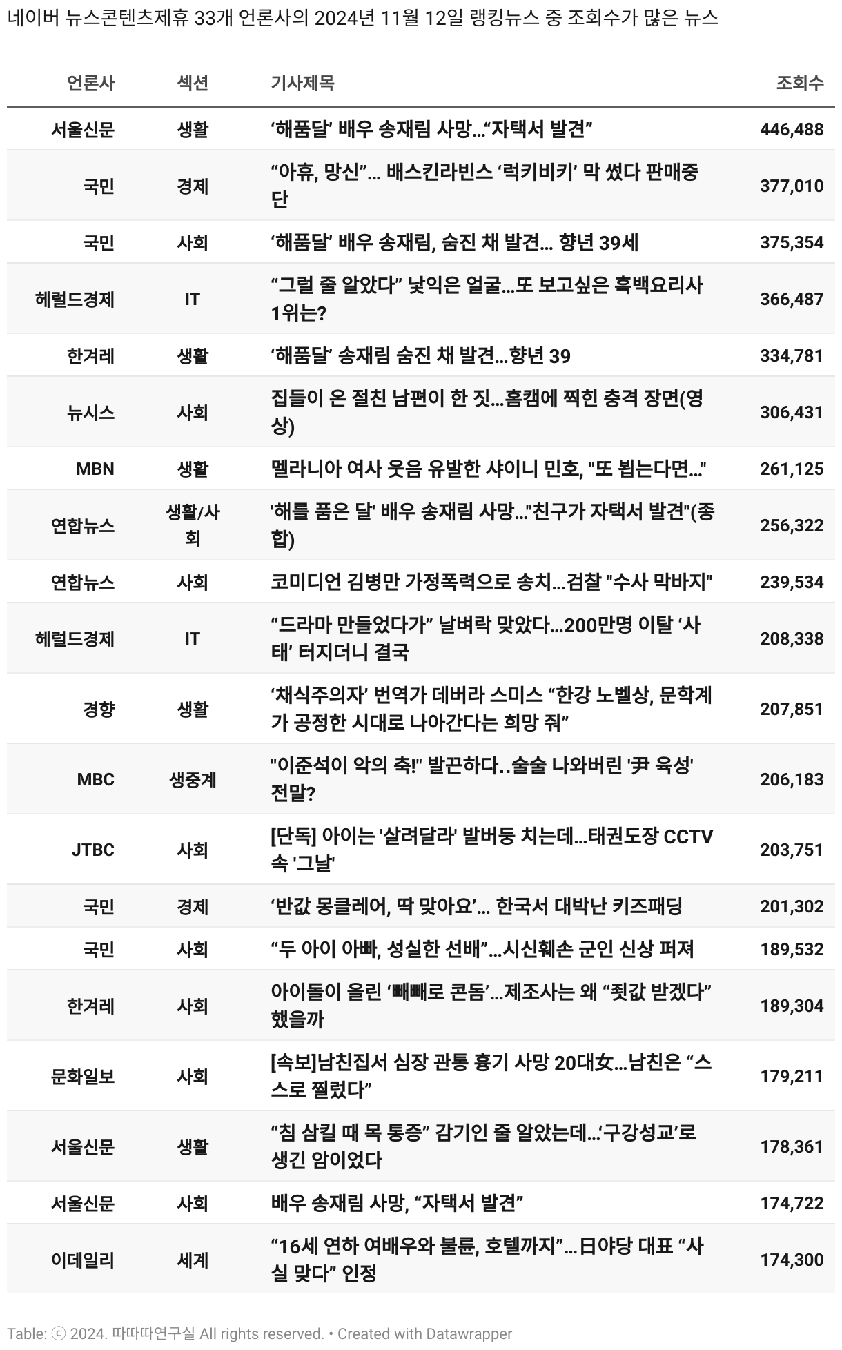 *데이터 수집 기간 : 2024년 6월 10일 *데이터 수집 대상 : 네이버 뉴스콘텐츠제휴 60개 언론사. 종합일간지 10개(경향신문, 국민일보, 동아일보, 문화일보, 서울신문, 세계일보, 조선일보, 중앙일보, 한겨레신문, 한국일보), 방송/통신사 14개(뉴스1, 뉴시스, 연합뉴스, 연합뉴스TV, 채널A, 한국경제TV, JTBC, KBS, MBC, MBN, SBS, SBS BIZ, TV조선, YTN), 경제지 11개(매일경제, 머니투데이, 비즈워치, 서울경제, 아시아경제, 이데일리, 조선비즈, 조세일보, 파이낸셜뉴스, 한국경제(유튜브제외), 헤럴드경제) 인터넷 8개(노컷뉴스, 더팩트, 데일리안, 머니S, 미디어오늘, 아이뉴스24, 오마이뉴스, 프레시안), IT 5개(디지털데일리,디지털타임스, 블로터, 전자신문, 지디넷코리아), 지역 12개(강원도민일보, 강원일보, 경기일보, 국제신문, 대구MBC, 대전일보, 매일신문, 부산일보, 전주MBC, CJB청주방송, JIBS, kbc광주방송)