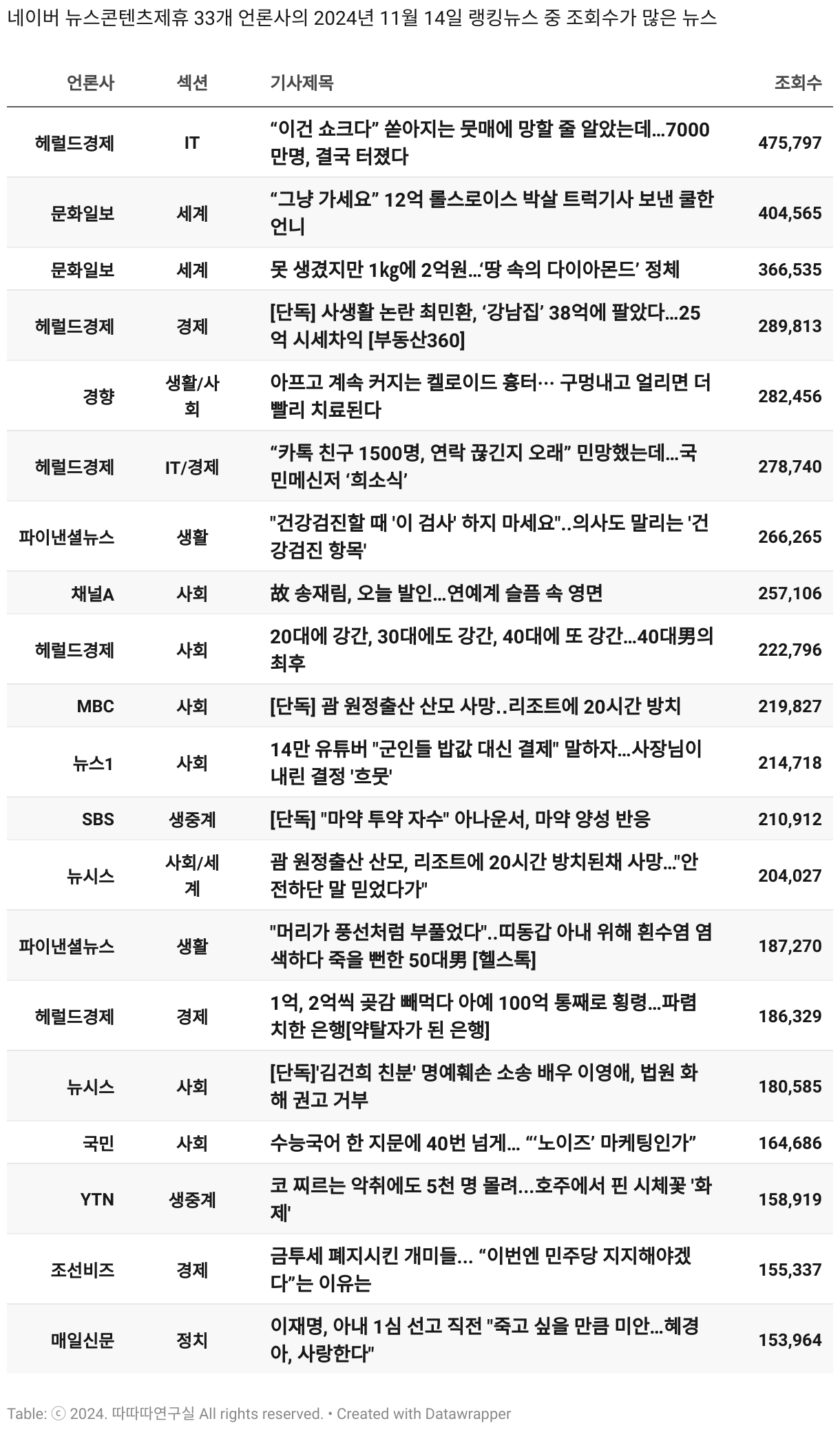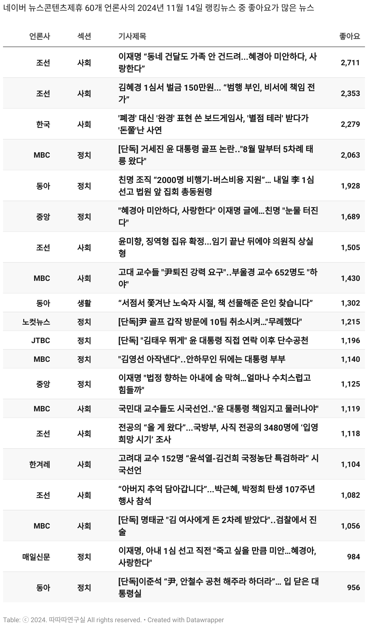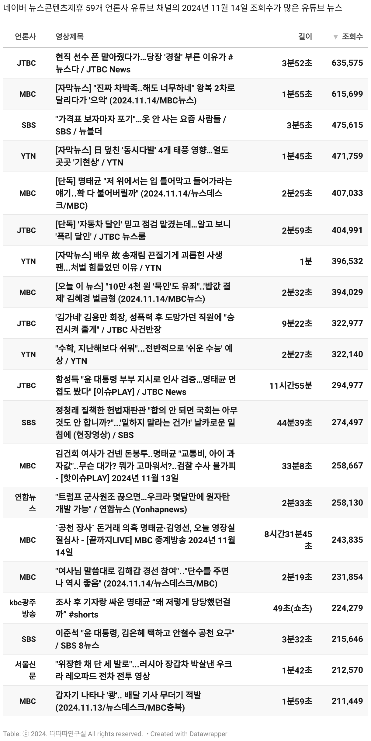 *데이터 수집 기간 : 2024년 6월 10일 *데이터 수집 대상 : 네이버 뉴스콘텐츠제휴 60개 언론사. 종합일간지 10개(경향신문, 국민일보, 동아일보, 문화일보, 서울신문, 세계일보, 조선일보, 중앙일보, 한겨레신문, 한국일보), 방송/통신사 14개(뉴스1, 뉴시스, 연합뉴스, 연합뉴스TV, 채널A, 한국경제TV, JTBC, KBS, MBC, MBN, SBS, SBS BIZ, TV조선, YTN), 경제지 11개(매일경제, 머니투데이, 비즈워치, 서울경제, 아시아경제, 이데일리, 조선비즈, 조세일보, 파이낸셜뉴스, 한국경제(유튜브제외), 헤럴드경제) 인터넷 8개(노컷뉴스, 더팩트, 데일리안, 머니S, 미디어오늘, 아이뉴스24, 오마이뉴스, 프레시안), IT 5개(디지털데일리,디지털타임스, 블로터, 전자신문, 지디넷코리아), 지역 12개(강원도민일보, 강원일보, 경기일보, 국제신문, 대구MBC, 대전일보, 매일신문, 부산일보, 전주MBC, CJB청주방송, JIBS, kbc광주방송)