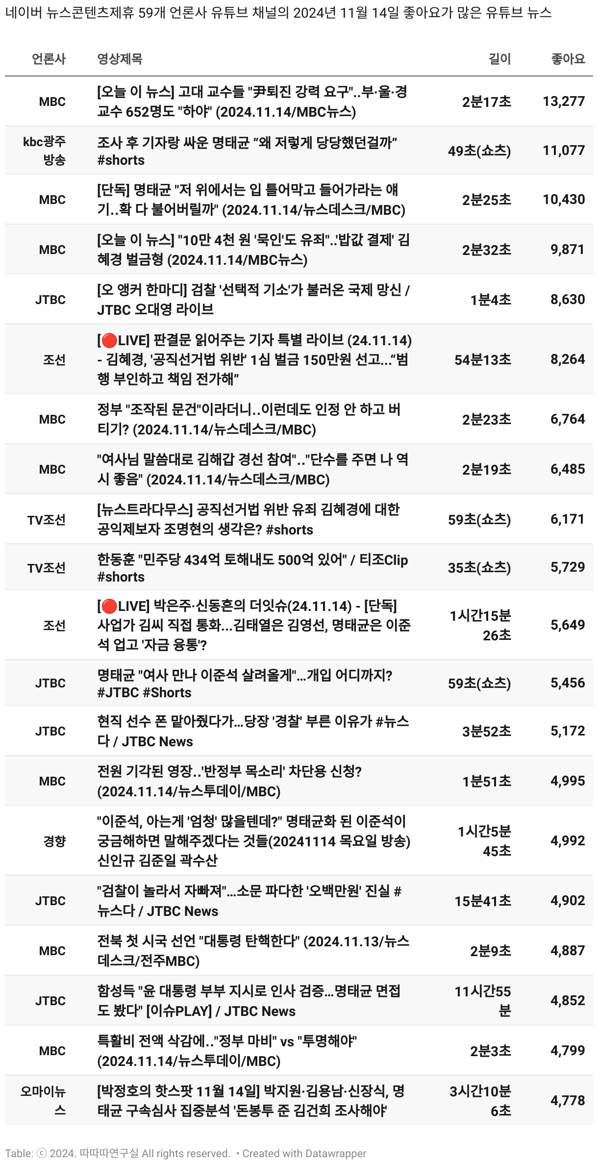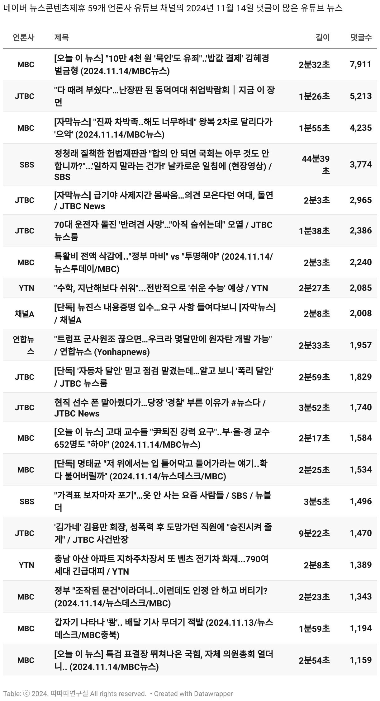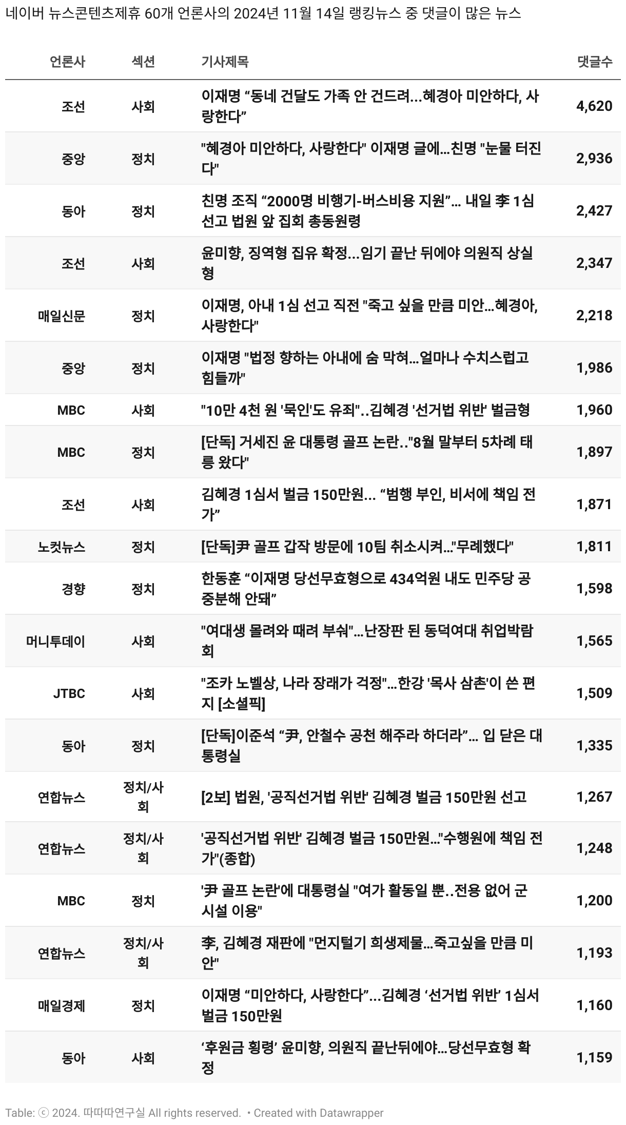 *데이터 수집 기간 : 2024년 6월 10일 *데이터 수집 대상 : 네이버 뉴스콘텐츠제휴 60개 언론사. 종합일간지 10개(경향신문, 국민일보, 동아일보, 문화일보, 서울신문, 세계일보, 조선일보, 중앙일보, 한겨레신문, 한국일보), 방송/통신사 14개(뉴스1, 뉴시스, 연합뉴스, 연합뉴스TV, 채널A, 한국경제TV, JTBC, KBS, MBC, MBN, SBS, SBS BIZ, TV조선, YTN), 경제지 11개(매일경제, 머니투데이, 비즈워치, 서울경제, 아시아경제, 이데일리, 조선비즈, 조세일보, 파이낸셜뉴스, 한국경제(유튜브제외), 헤럴드경제) 인터넷 8개(노컷뉴스, 더팩트, 데일리안, 머니S, 미디어오늘, 아이뉴스24, 오마이뉴스, 프레시안), IT 5개(디지털데일리,디지털타임스, 블로터, 전자신문, 지디넷코리아), 지역 12개(강원도민일보, 강원일보, 경기일보, 국제신문, 대구MBC, 대전일보, 매일신문, 부산일보, 전주MBC, CJB청주방송, JIBS, kbc광주방송)