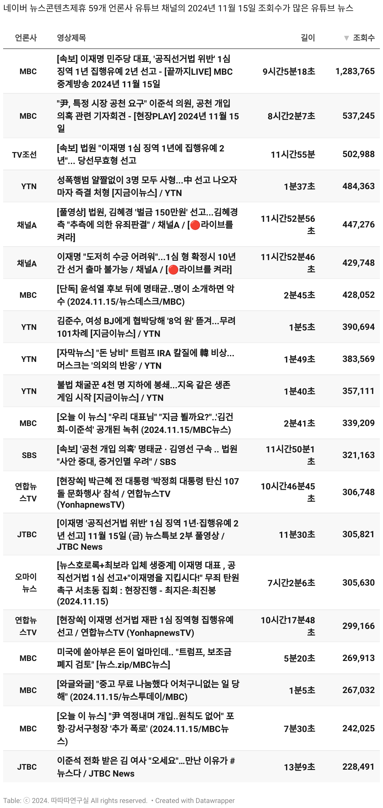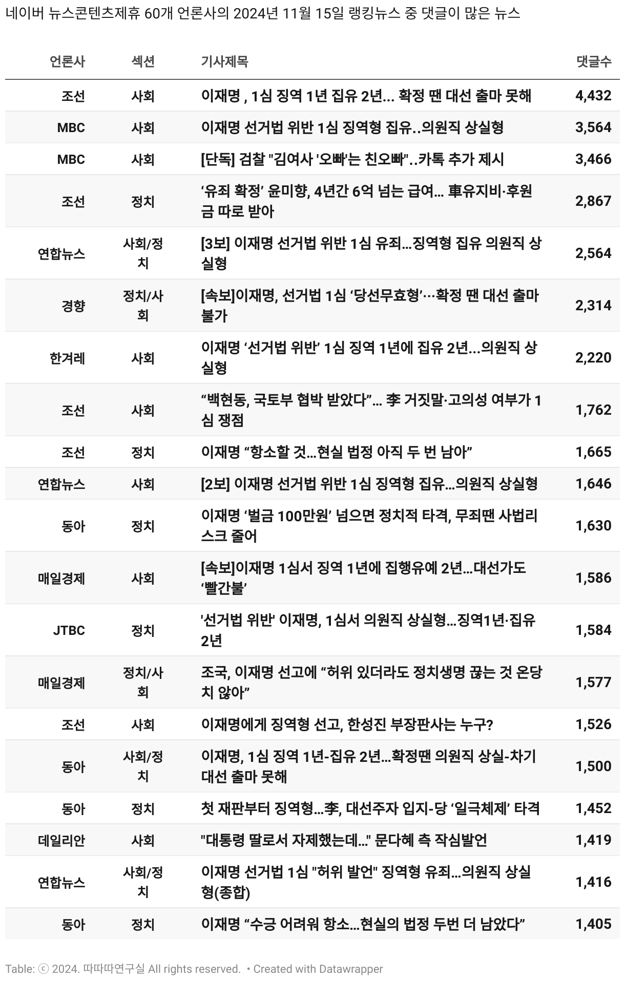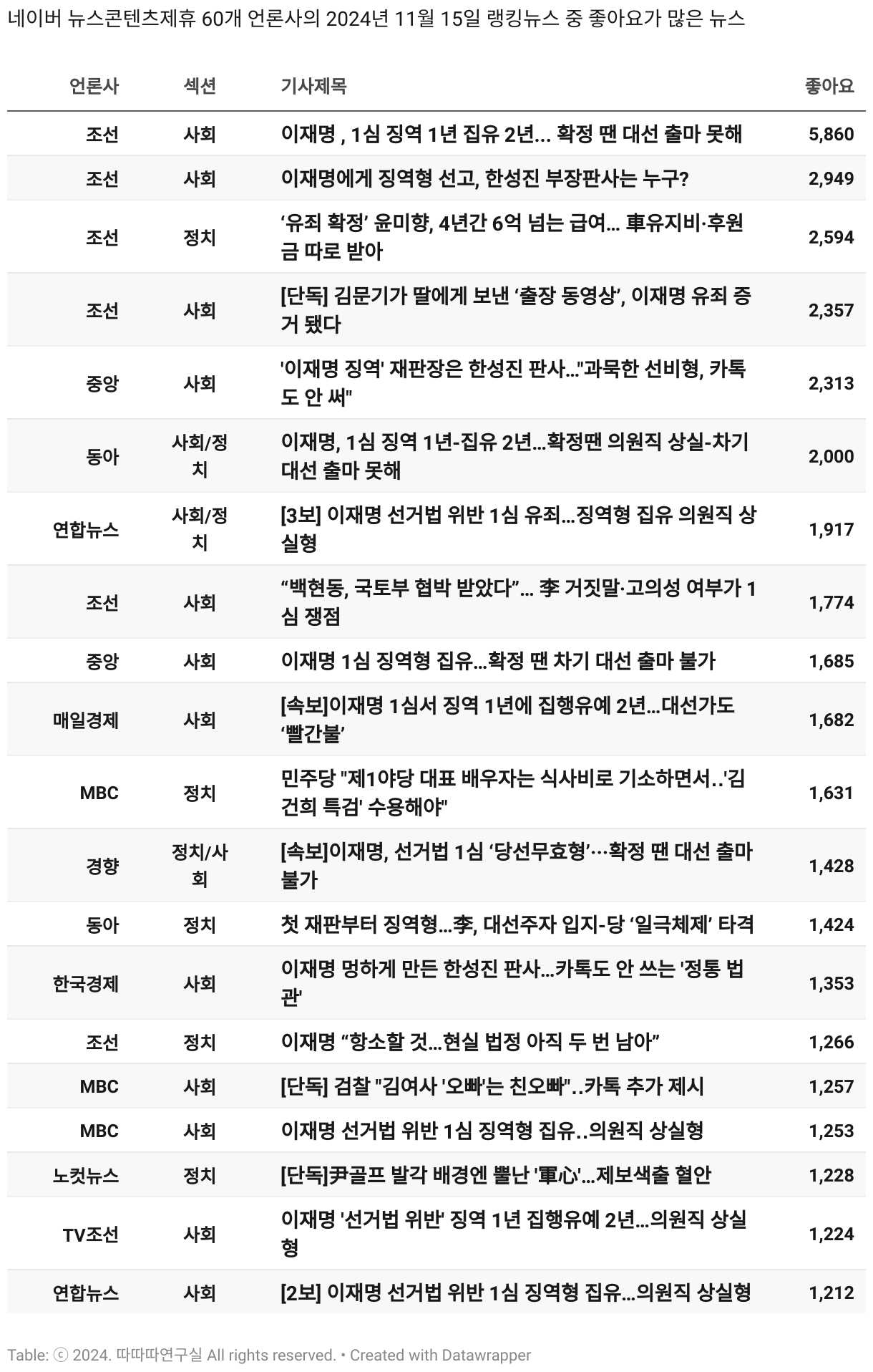 *데이터 수집 기간 : 2024년 6월 10일 *데이터 수집 대상 : 네이버 뉴스콘텐츠제휴 60개 언론사. 종합일간지 10개(경향신문, 국민일보, 동아일보, 문화일보, 서울신문, 세계일보, 조선일보, 중앙일보, 한겨레신문, 한국일보), 방송/통신사 14개(뉴스1, 뉴시스, 연합뉴스, 연합뉴스TV, 채널A, 한국경제TV, JTBC, KBS, MBC, MBN, SBS, SBS BIZ, TV조선, YTN), 경제지 11개(매일경제, 머니투데이, 비즈워치, 서울경제, 아시아경제, 이데일리, 조선비즈, 조세일보, 파이낸셜뉴스, 한국경제(유튜브제외), 헤럴드경제) 인터넷 8개(노컷뉴스, 더팩트, 데일리안, 머니S, 미디어오늘, 아이뉴스24, 오마이뉴스, 프레시안), IT 5개(디지털데일리,디지털타임스, 블로터, 전자신문, 지디넷코리아), 지역 12개(강원도민일보, 강원일보, 경기일보, 국제신문, 대구MBC, 대전일보, 매일신문, 부산일보, 전주MBC, CJB청주방송, JIBS, kbc광주방송)