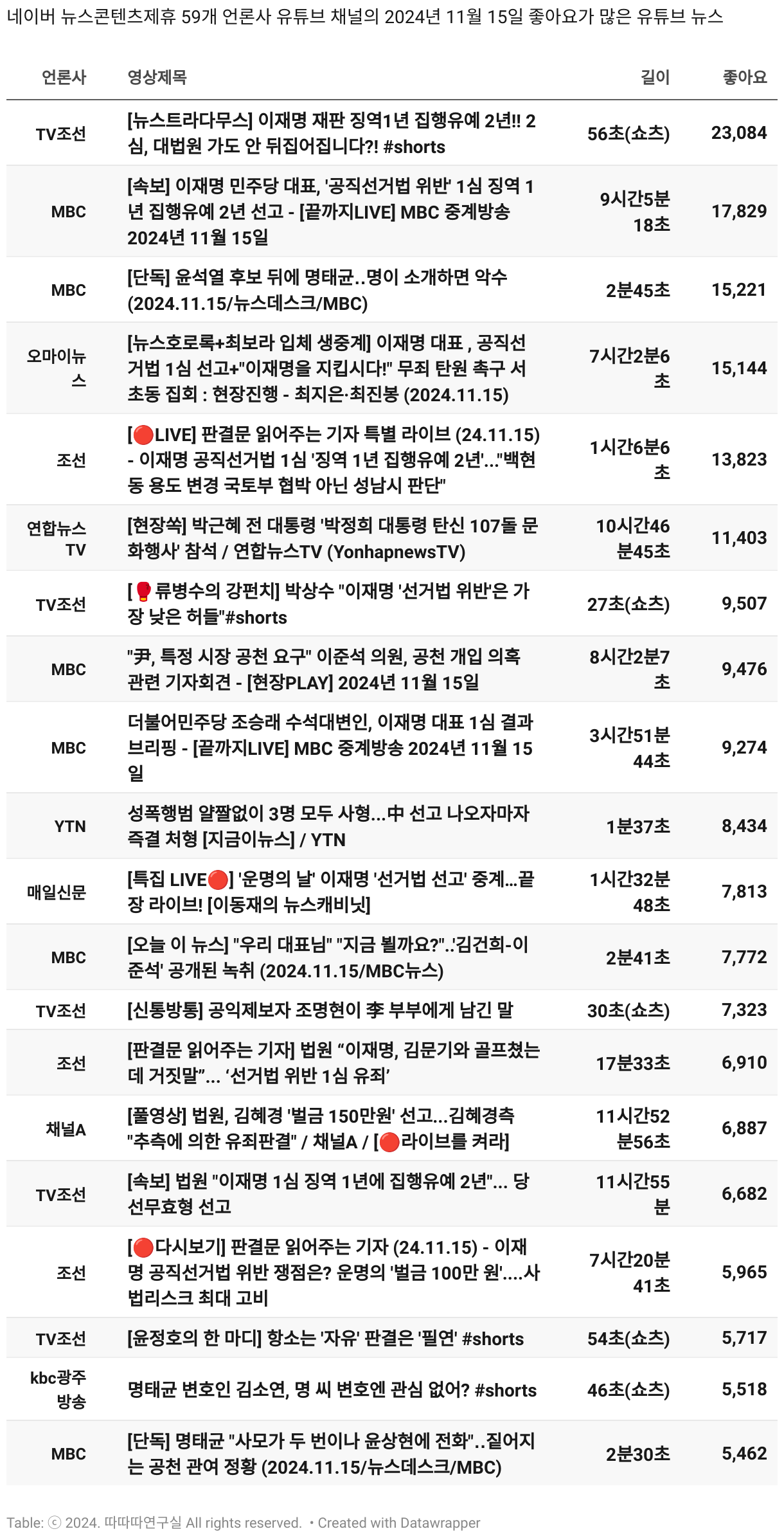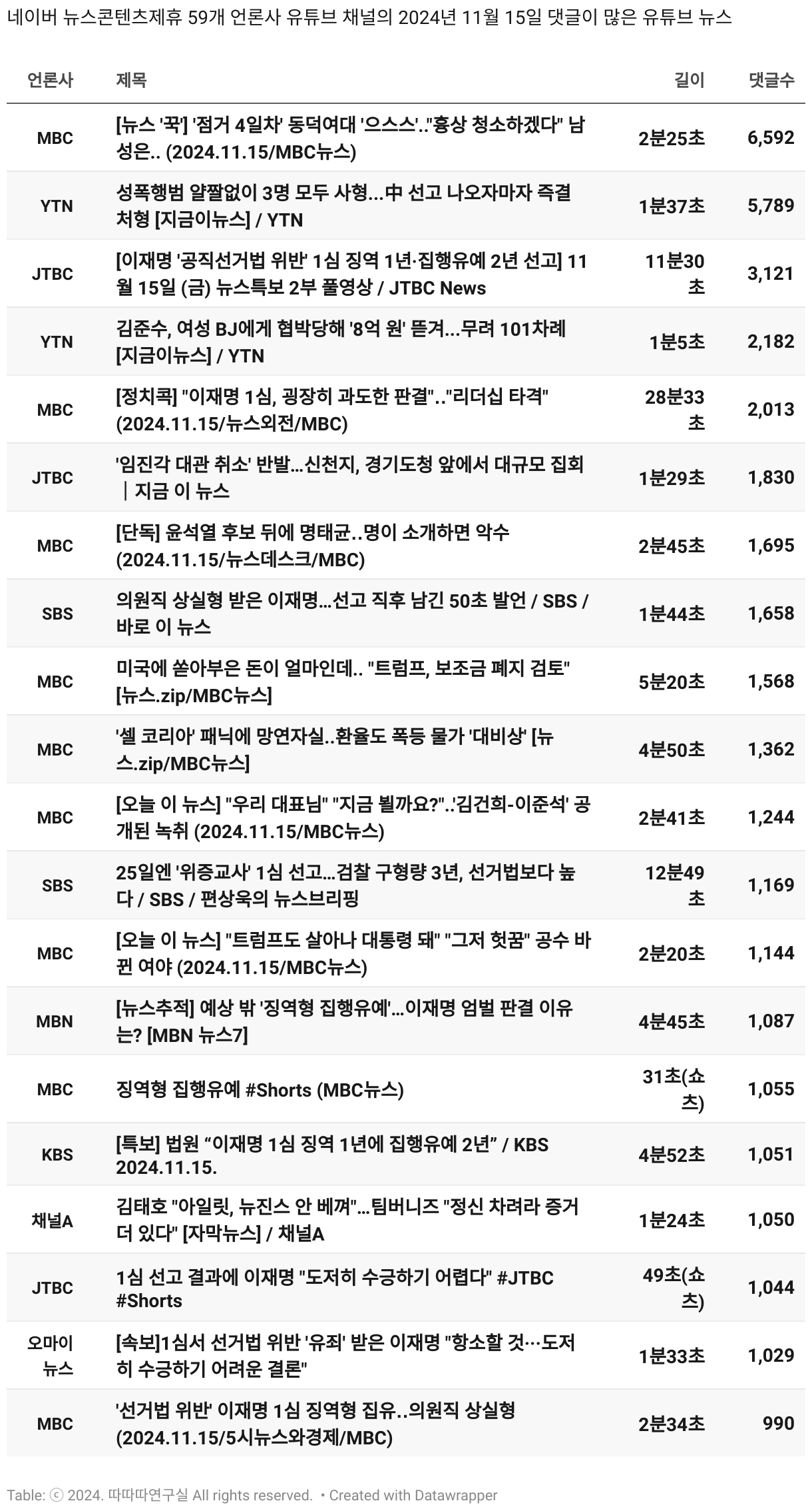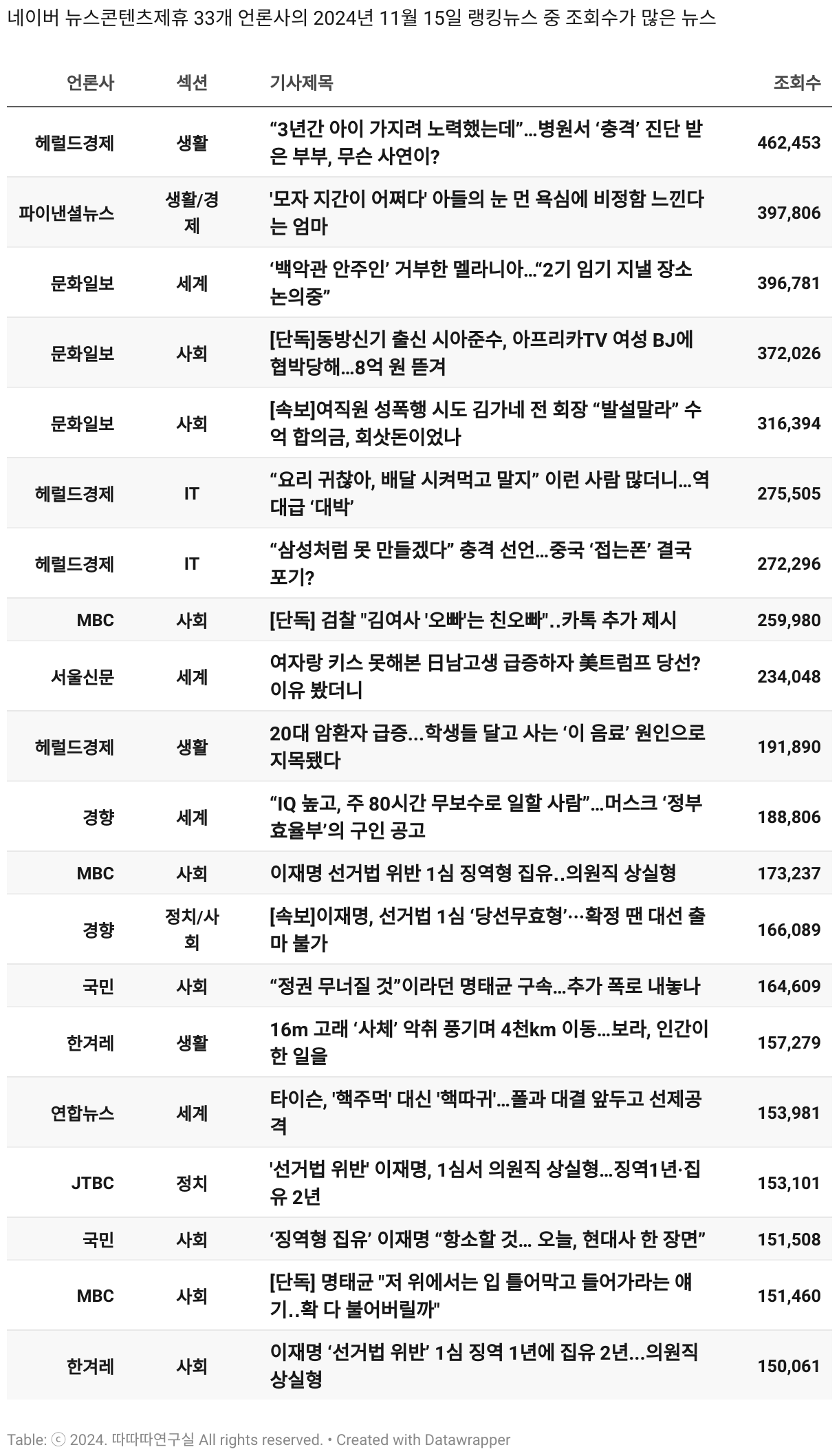 *데이터 수집 기간 : 2024년 6월 10일 *데이터 수집 대상 : 네이버 뉴스콘텐츠제휴 60개 언론사. 종합일간지 10개(경향신문, 국민일보, 동아일보, 문화일보, 서울신문, 세계일보, 조선일보, 중앙일보, 한겨레신문, 한국일보), 방송/통신사 14개(뉴스1, 뉴시스, 연합뉴스, 연합뉴스TV, 채널A, 한국경제TV, JTBC, KBS, MBC, MBN, SBS, SBS BIZ, TV조선, YTN), 경제지 11개(매일경제, 머니투데이, 비즈워치, 서울경제, 아시아경제, 이데일리, 조선비즈, 조세일보, 파이낸셜뉴스, 한국경제(유튜브제외), 헤럴드경제) 인터넷 8개(노컷뉴스, 더팩트, 데일리안, 머니S, 미디어오늘, 아이뉴스24, 오마이뉴스, 프레시안), IT 5개(디지털데일리,디지털타임스, 블로터, 전자신문, 지디넷코리아), 지역 12개(강원도민일보, 강원일보, 경기일보, 국제신문, 대구MBC, 대전일보, 매일신문, 부산일보, 전주MBC, CJB청주방송, JIBS, kbc광주방송)