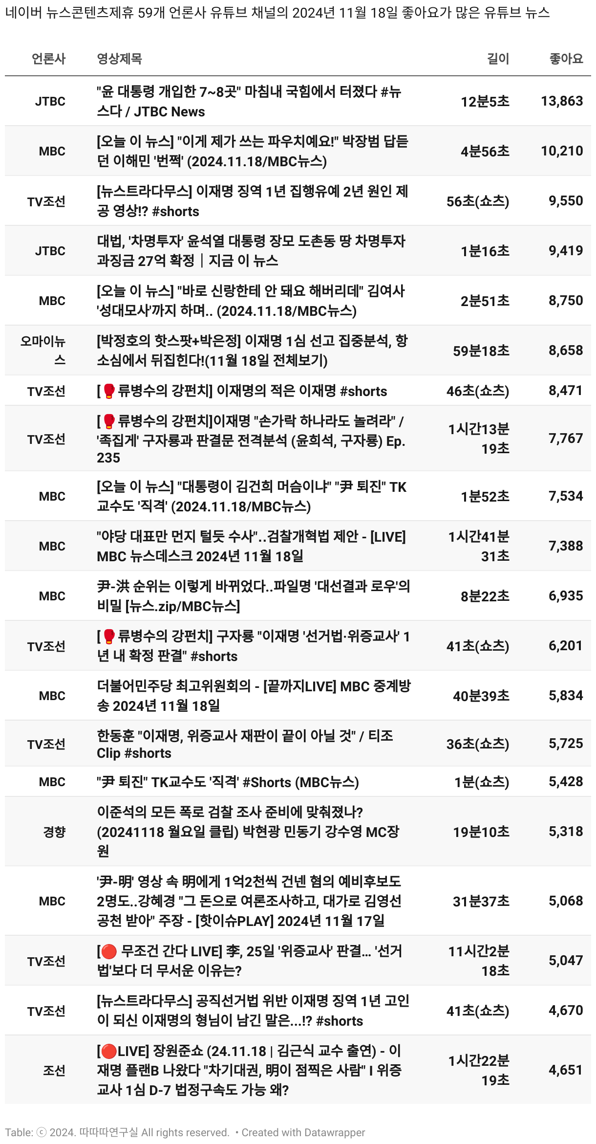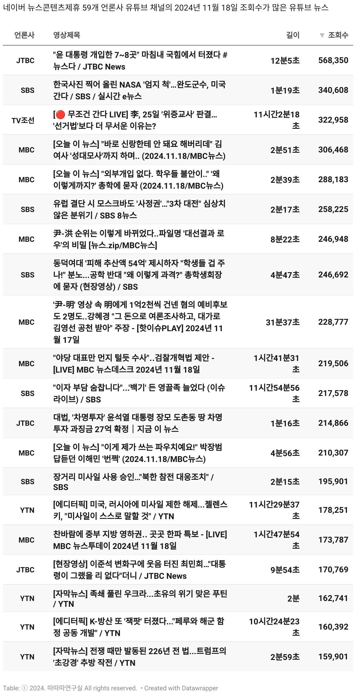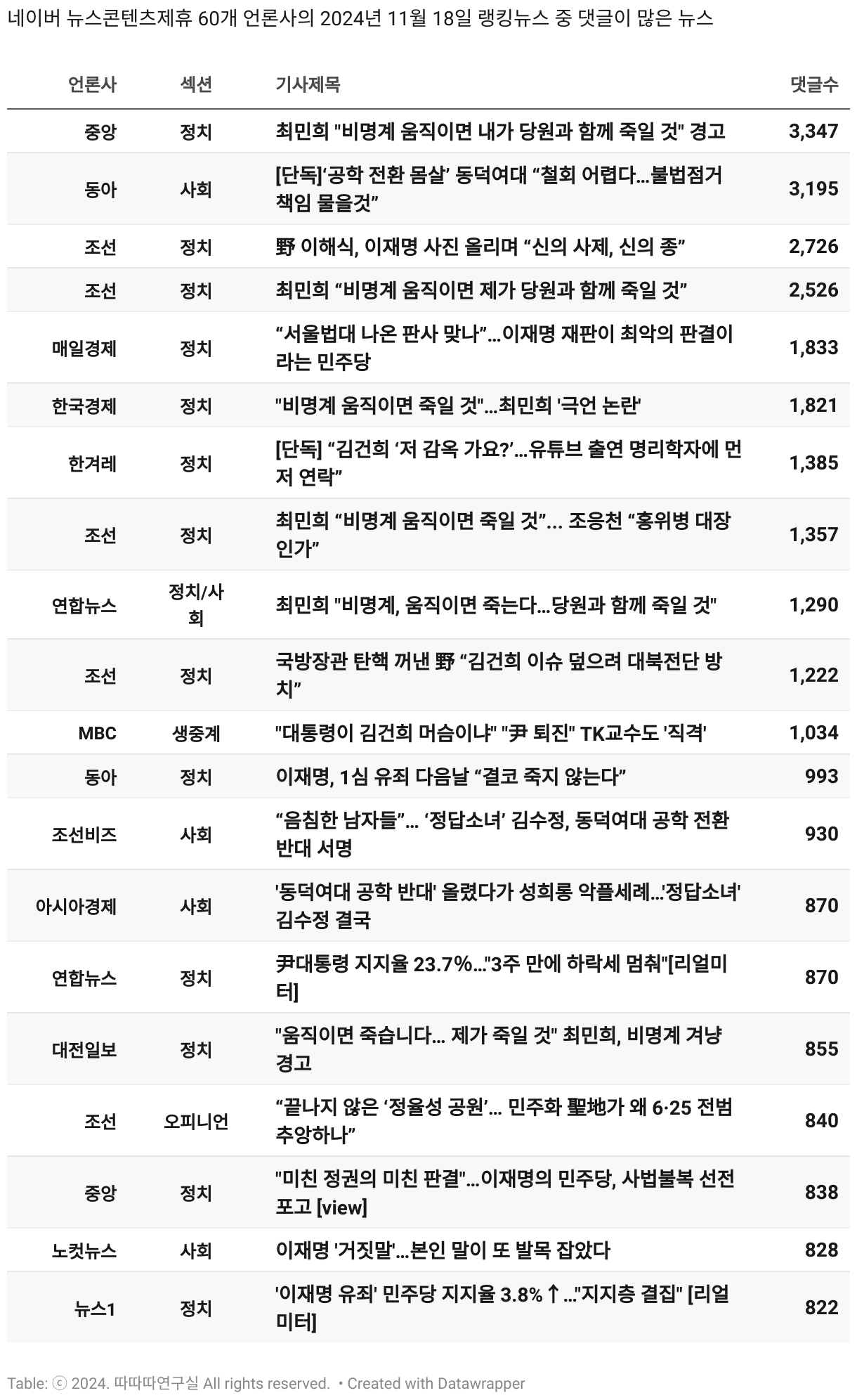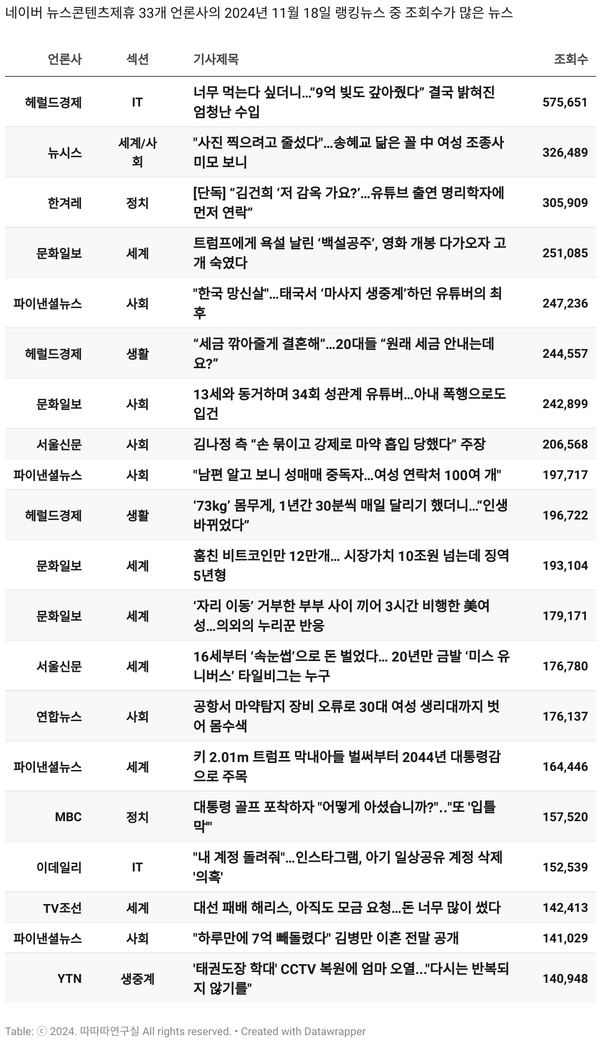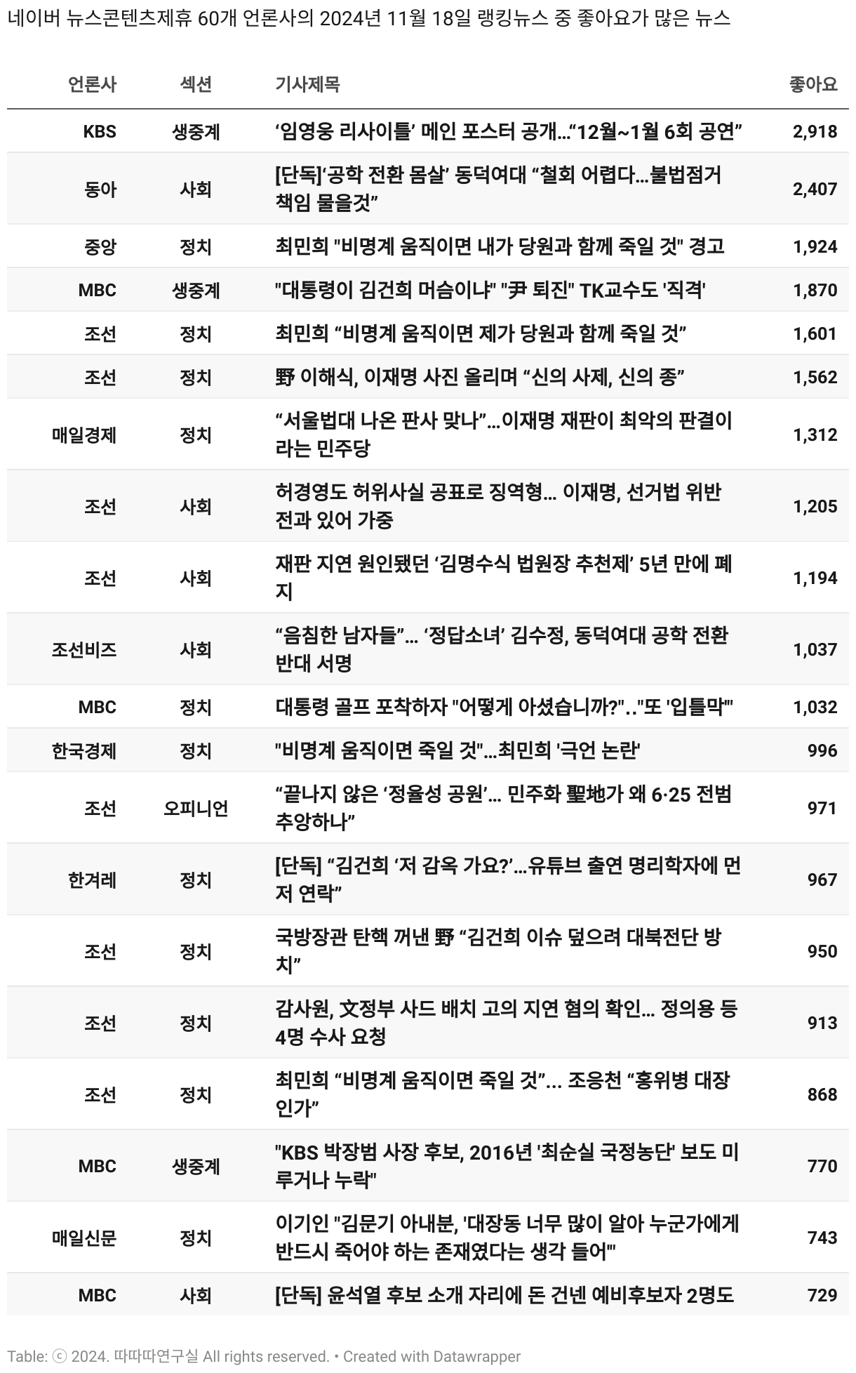 *데이터 수집 기간 : 2024년 6월 10일 *데이터 수집 대상 : 네이버 뉴스콘텐츠제휴 60개 언론사. 종합일간지 10개(경향신문, 국민일보, 동아일보, 문화일보, 서울신문, 세계일보, 조선일보, 중앙일보, 한겨레신문, 한국일보), 방송/통신사 14개(뉴스1, 뉴시스, 연합뉴스, 연합뉴스TV, 채널A, 한국경제TV, JTBC, KBS, MBC, MBN, SBS, SBS BIZ, TV조선, YTN), 경제지 11개(매일경제, 머니투데이, 비즈워치, 서울경제, 아시아경제, 이데일리, 조선비즈, 조세일보, 파이낸셜뉴스, 한국경제(유튜브제외), 헤럴드경제) 인터넷 8개(노컷뉴스, 더팩트, 데일리안, 머니S, 미디어오늘, 아이뉴스24, 오마이뉴스, 프레시안), IT 5개(디지털데일리,디지털타임스, 블로터, 전자신문, 지디넷코리아), 지역 12개(강원도민일보, 강원일보, 경기일보, 국제신문, 대구MBC, 대전일보, 매일신문, 부산일보, 전주MBC, CJB청주방송, JIBS, kbc광주방송)