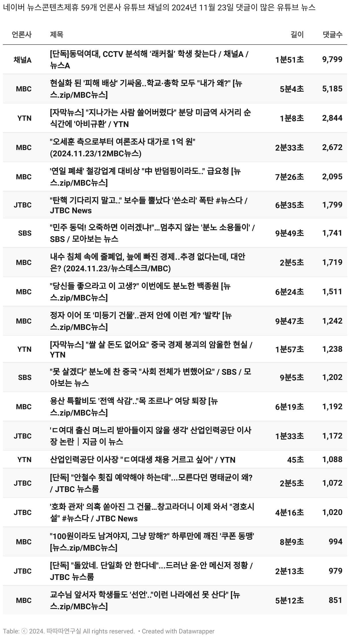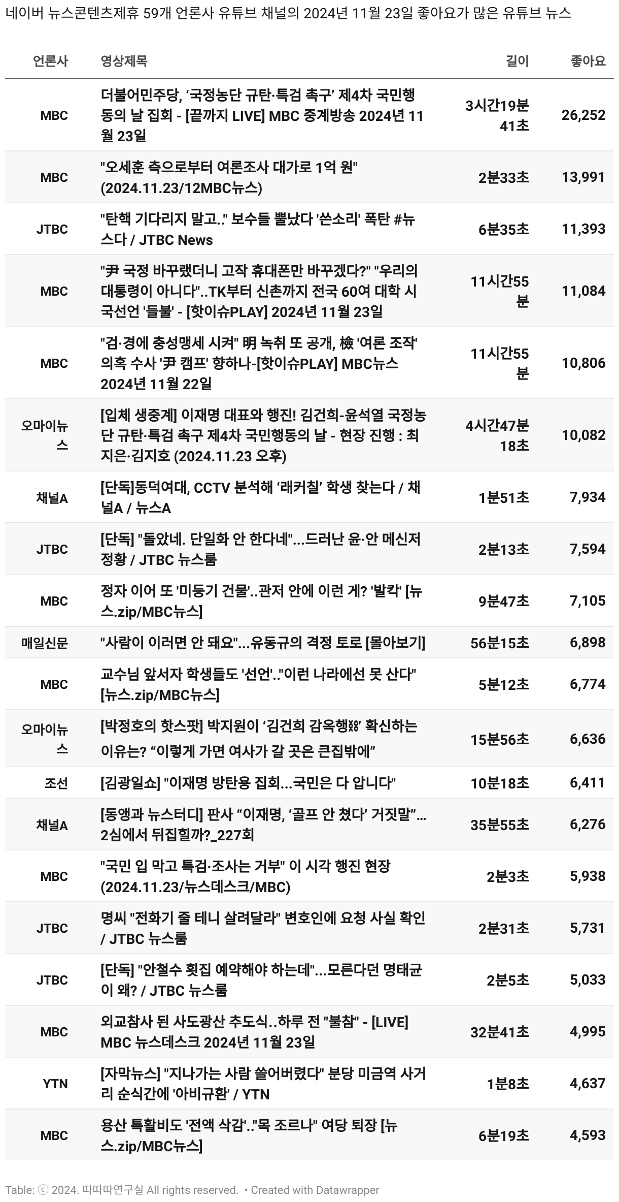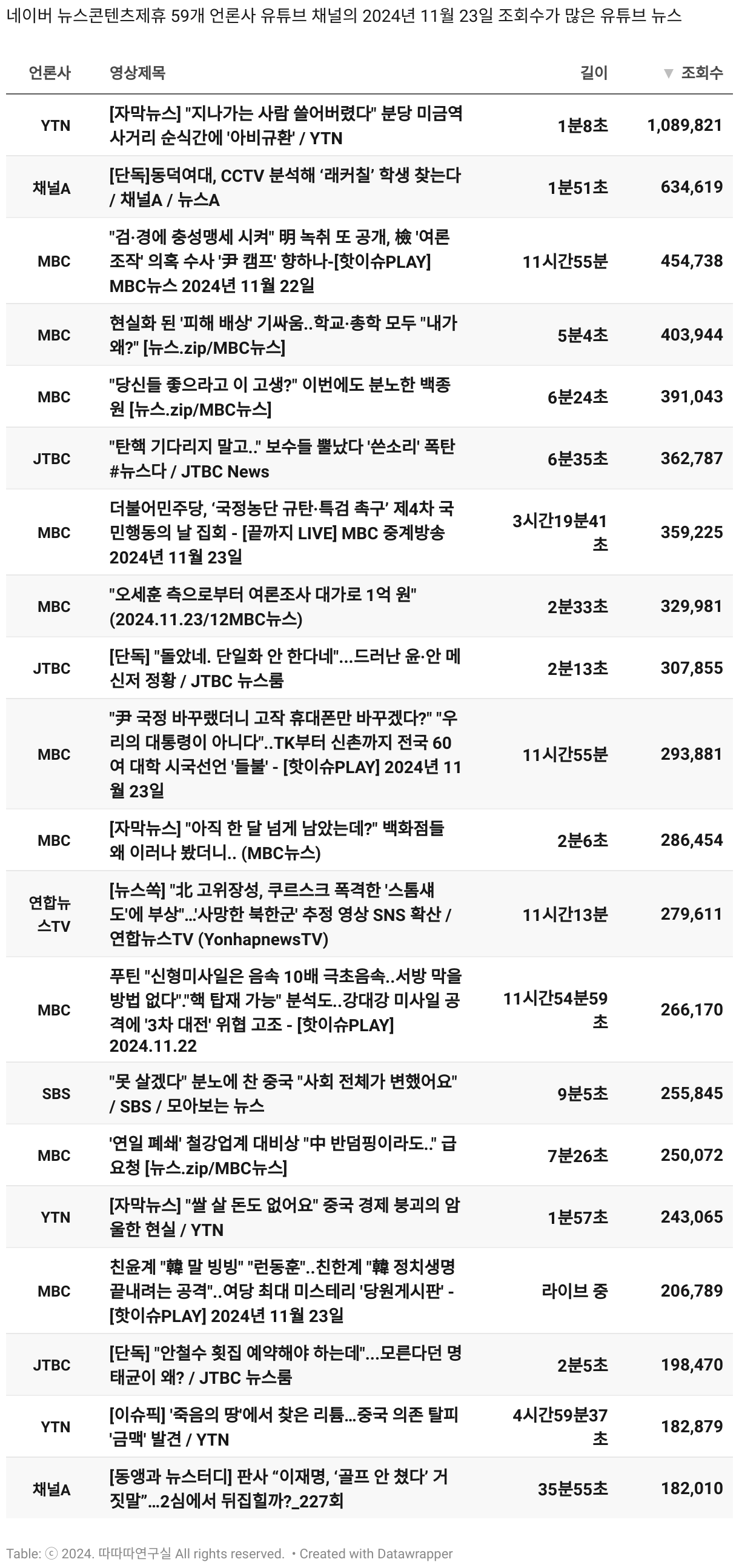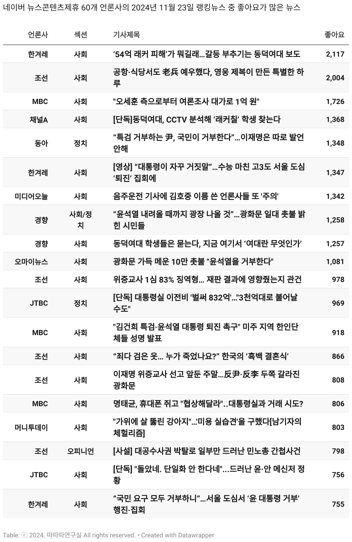 *데이터 수집 기간 : 2024년 6월 10일 *데이터 수집 대상 : 네이버 뉴스콘텐츠제휴 60개 언론사. 종합일간지 10개(경향신문, 국민일보, 동아일보, 문화일보, 서울신문, 세계일보, 조선일보, 중앙일보, 한겨레신문, 한국일보), 방송/통신사 14개(뉴스1, 뉴시스, 연합뉴스, 연합뉴스TV, 채널A, 한국경제TV, JTBC, KBS, MBC, MBN, SBS, SBS BIZ, TV조선, YTN), 경제지 11개(매일경제, 머니투데이, 비즈워치, 서울경제, 아시아경제, 이데일리, 조선비즈, 조세일보, 파이낸셜뉴스, 한국경제(유튜브제외), 헤럴드경제) 인터넷 8개(노컷뉴스, 더팩트, 데일리안, 머니S, 미디어오늘, 아이뉴스24, 오마이뉴스, 프레시안), IT 5개(디지털데일리,디지털타임스, 블로터, 전자신문, 지디넷코리아), 지역 12개(강원도민일보, 강원일보, 경기일보, 국제신문, 대구MBC, 대전일보, 매일신문, 부산일보, 전주MBC, CJB청주방송, JIBS, kbc광주방송)