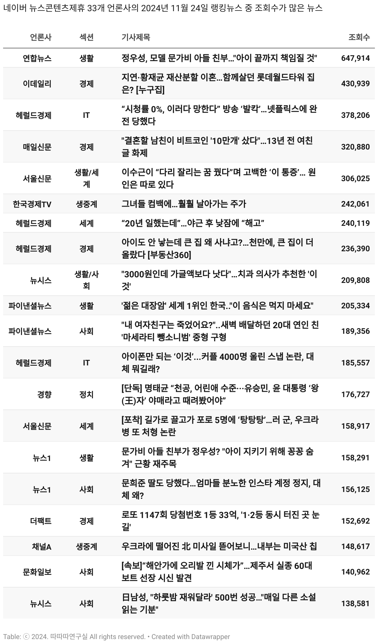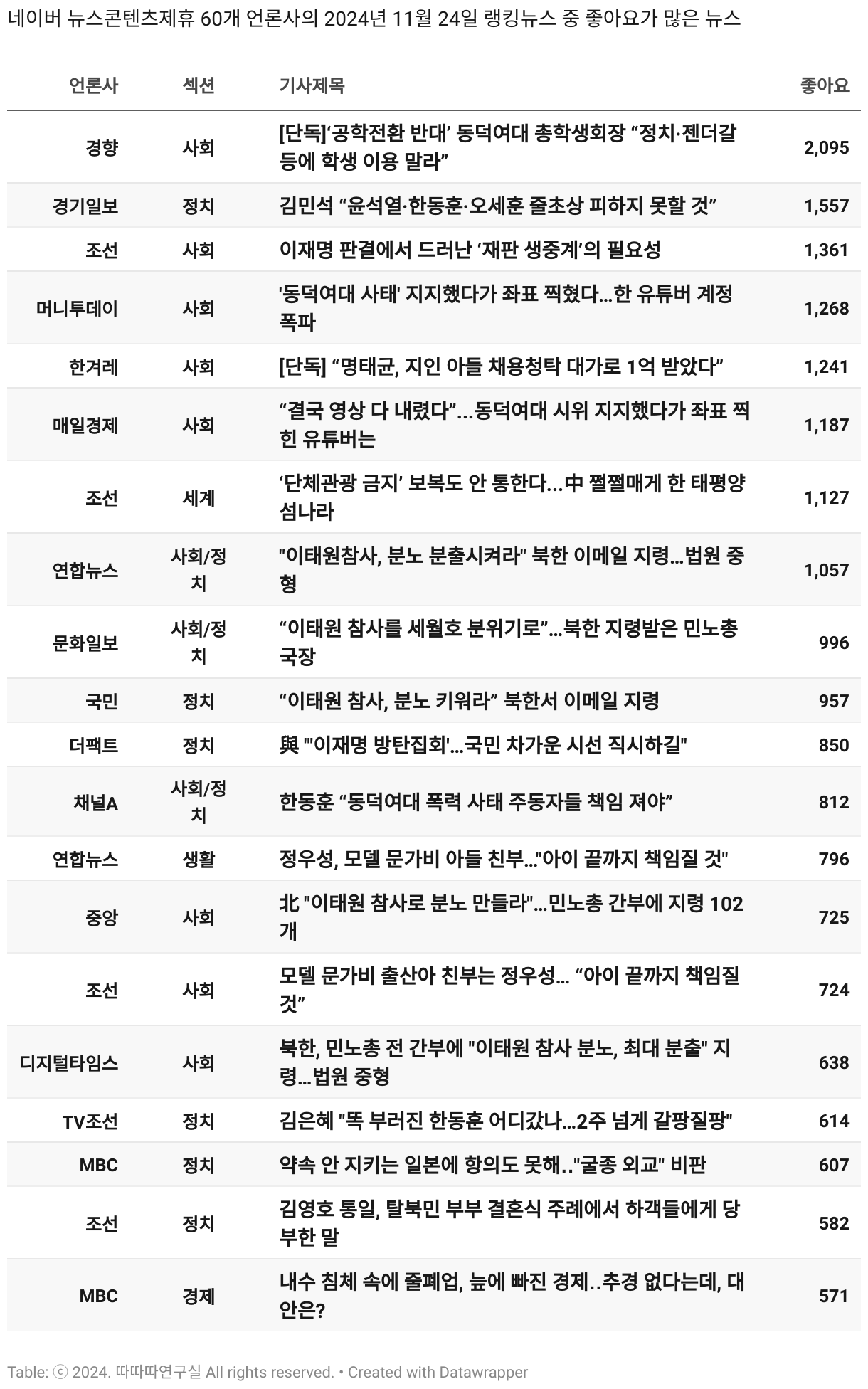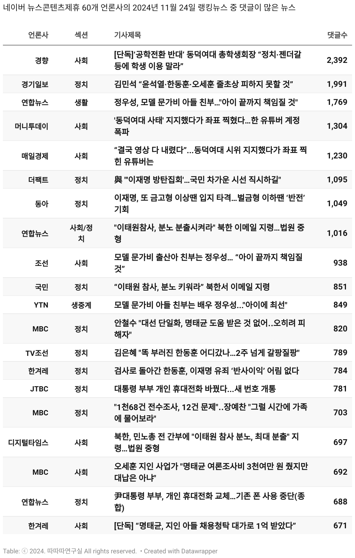 *데이터 수집 기간 : 2024년 6월 10일 *데이터 수집 대상 : 네이버 뉴스콘텐츠제휴 60개 언론사. 종합일간지 10개(경향신문, 국민일보, 동아일보, 문화일보, 서울신문, 세계일보, 조선일보, 중앙일보, 한겨레신문, 한국일보), 방송/통신사 14개(뉴스1, 뉴시스, 연합뉴스, 연합뉴스TV, 채널A, 한국경제TV, JTBC, KBS, MBC, MBN, SBS, SBS BIZ, TV조선, YTN), 경제지 11개(매일경제, 머니투데이, 비즈워치, 서울경제, 아시아경제, 이데일리, 조선비즈, 조세일보, 파이낸셜뉴스, 한국경제(유튜브제외), 헤럴드경제) 인터넷 8개(노컷뉴스, 더팩트, 데일리안, 머니S, 미디어오늘, 아이뉴스24, 오마이뉴스, 프레시안), IT 5개(디지털데일리,디지털타임스, 블로터, 전자신문, 지디넷코리아), 지역 12개(강원도민일보, 강원일보, 경기일보, 국제신문, 대구MBC, 대전일보, 매일신문, 부산일보, 전주MBC, CJB청주방송, JIBS, kbc광주방송)