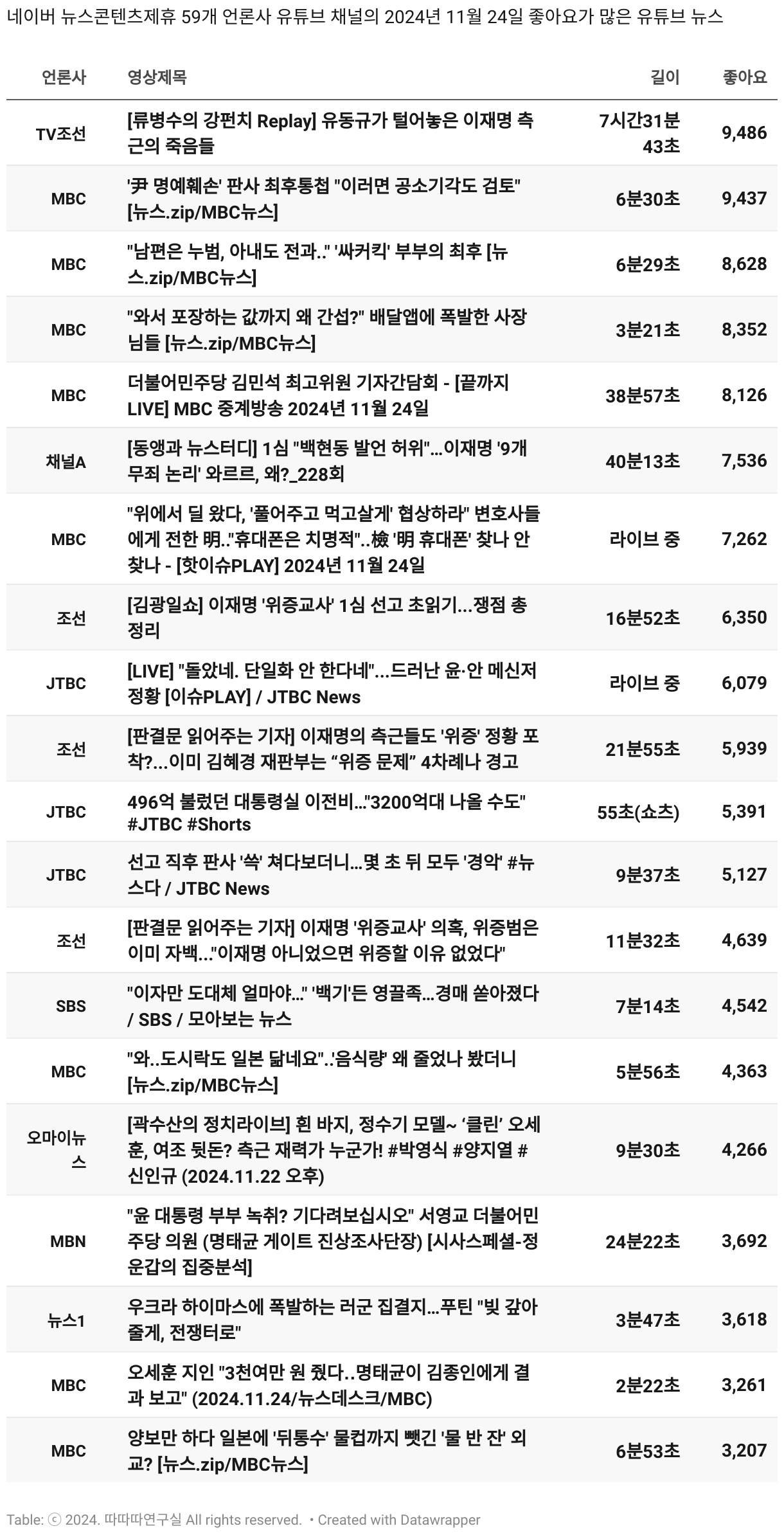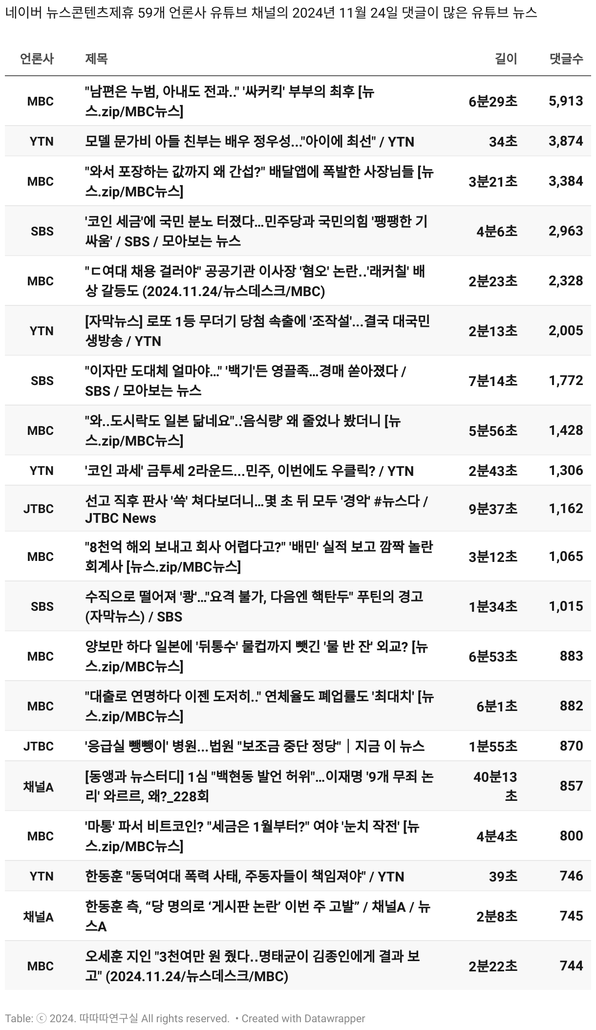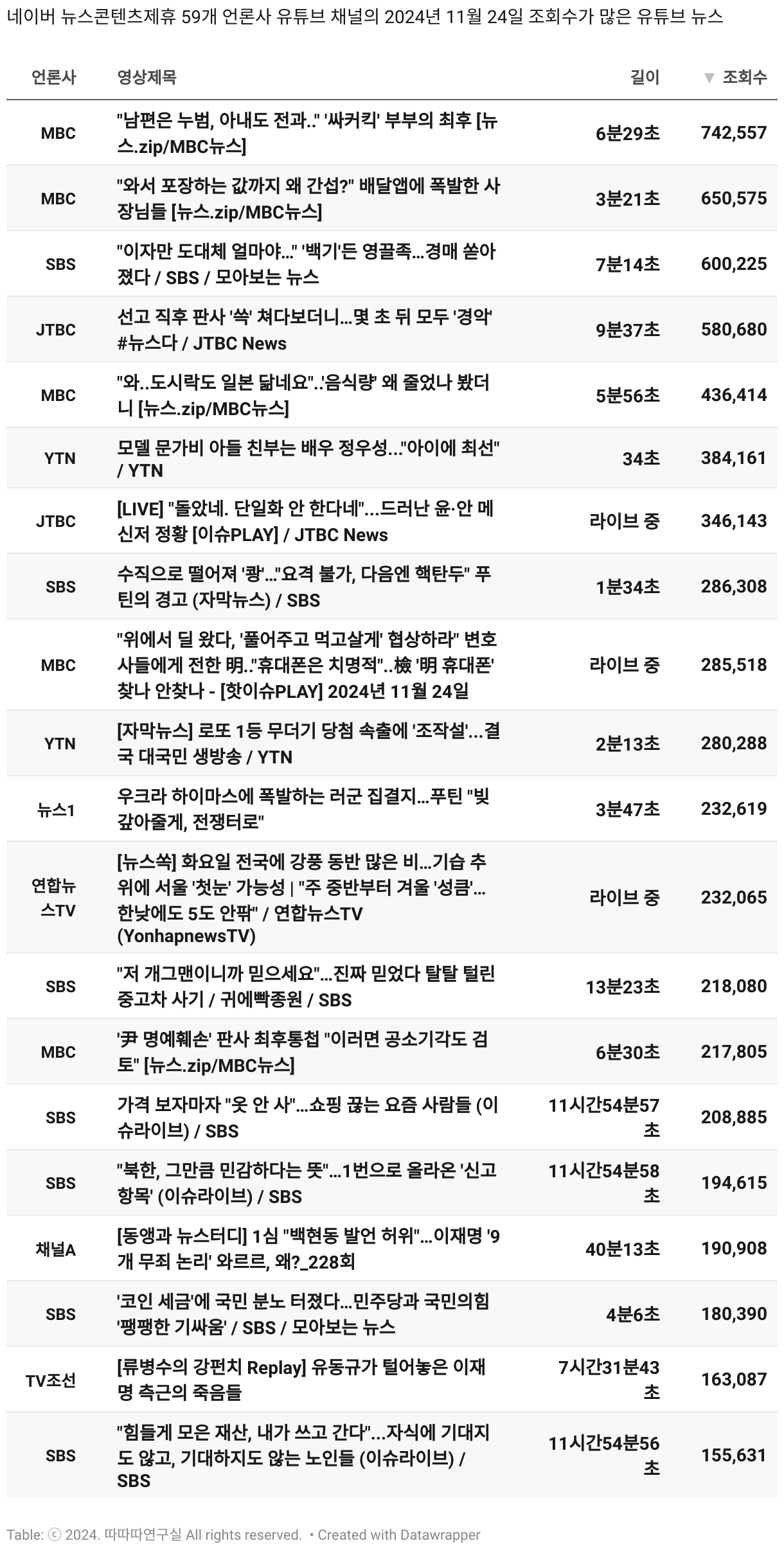*데이터 수집 기간 : 2024년 6월 10일 *데이터 수집 대상 : 네이버 뉴스콘텐츠제휴 60개 언론사. 종합일간지 10개(경향신문, 국민일보, 동아일보, 문화일보, 서울신문, 세계일보, 조선일보, 중앙일보, 한겨레신문, 한국일보), 방송/통신사 14개(뉴스1, 뉴시스, 연합뉴스, 연합뉴스TV, 채널A, 한국경제TV, JTBC, KBS, MBC, MBN, SBS, SBS BIZ, TV조선, YTN), 경제지 11개(매일경제, 머니투데이, 비즈워치, 서울경제, 아시아경제, 이데일리, 조선비즈, 조세일보, 파이낸셜뉴스, 한국경제(유튜브제외), 헤럴드경제) 인터넷 8개(노컷뉴스, 더팩트, 데일리안, 머니S, 미디어오늘, 아이뉴스24, 오마이뉴스, 프레시안), IT 5개(디지털데일리,디지털타임스, 블로터, 전자신문, 지디넷코리아), 지역 12개(강원도민일보, 강원일보, 경기일보, 국제신문, 대구MBC, 대전일보, 매일신문, 부산일보, 전주MBC, CJB청주방송, JIBS, kbc광주방송)