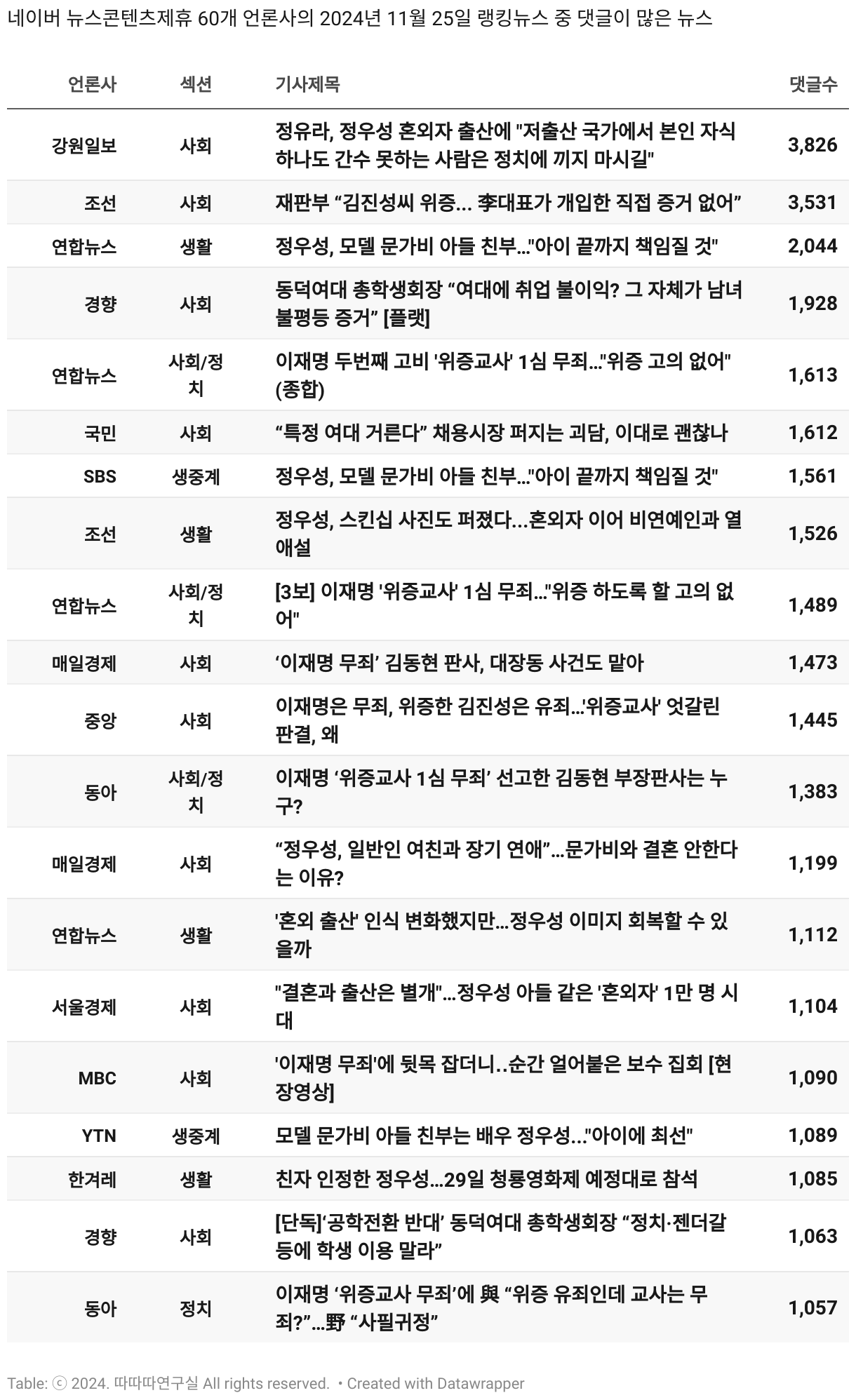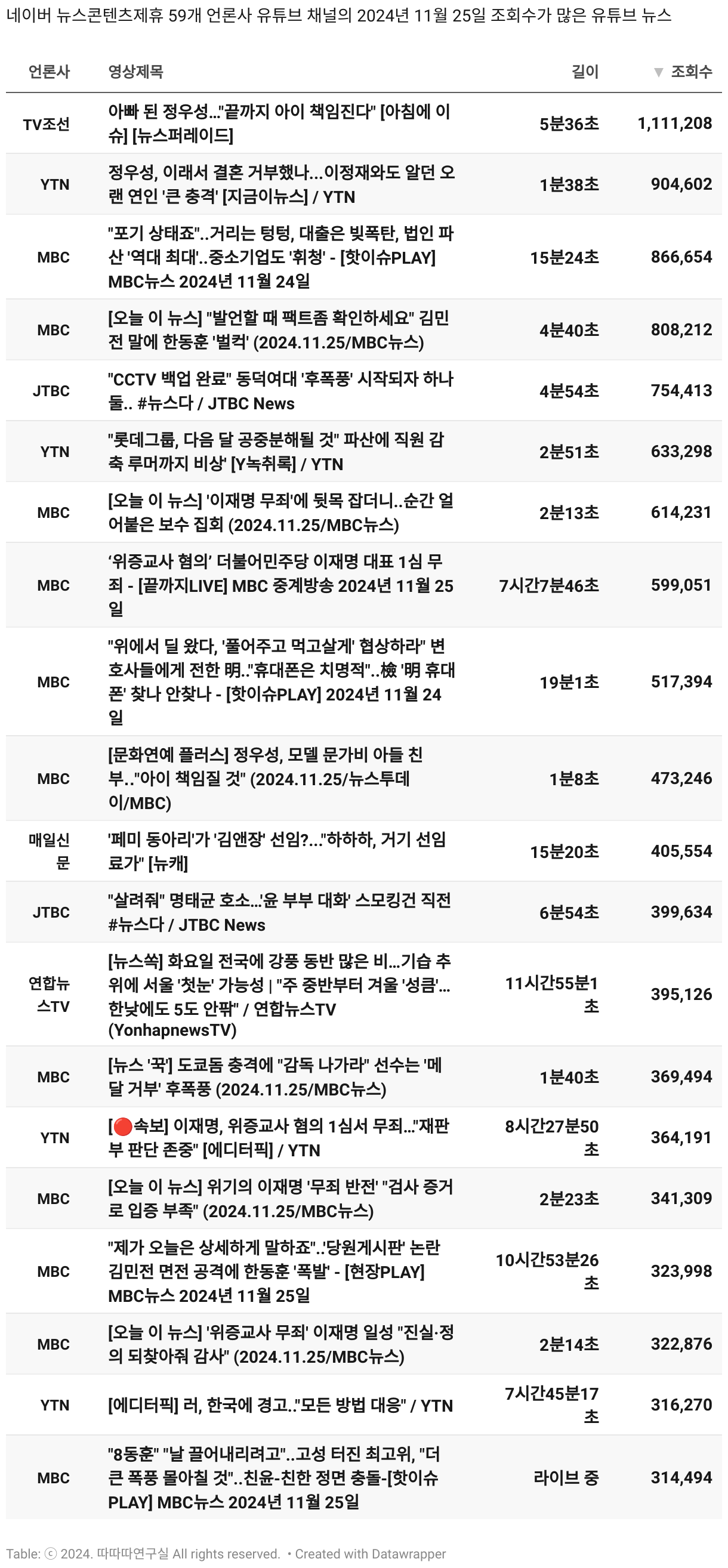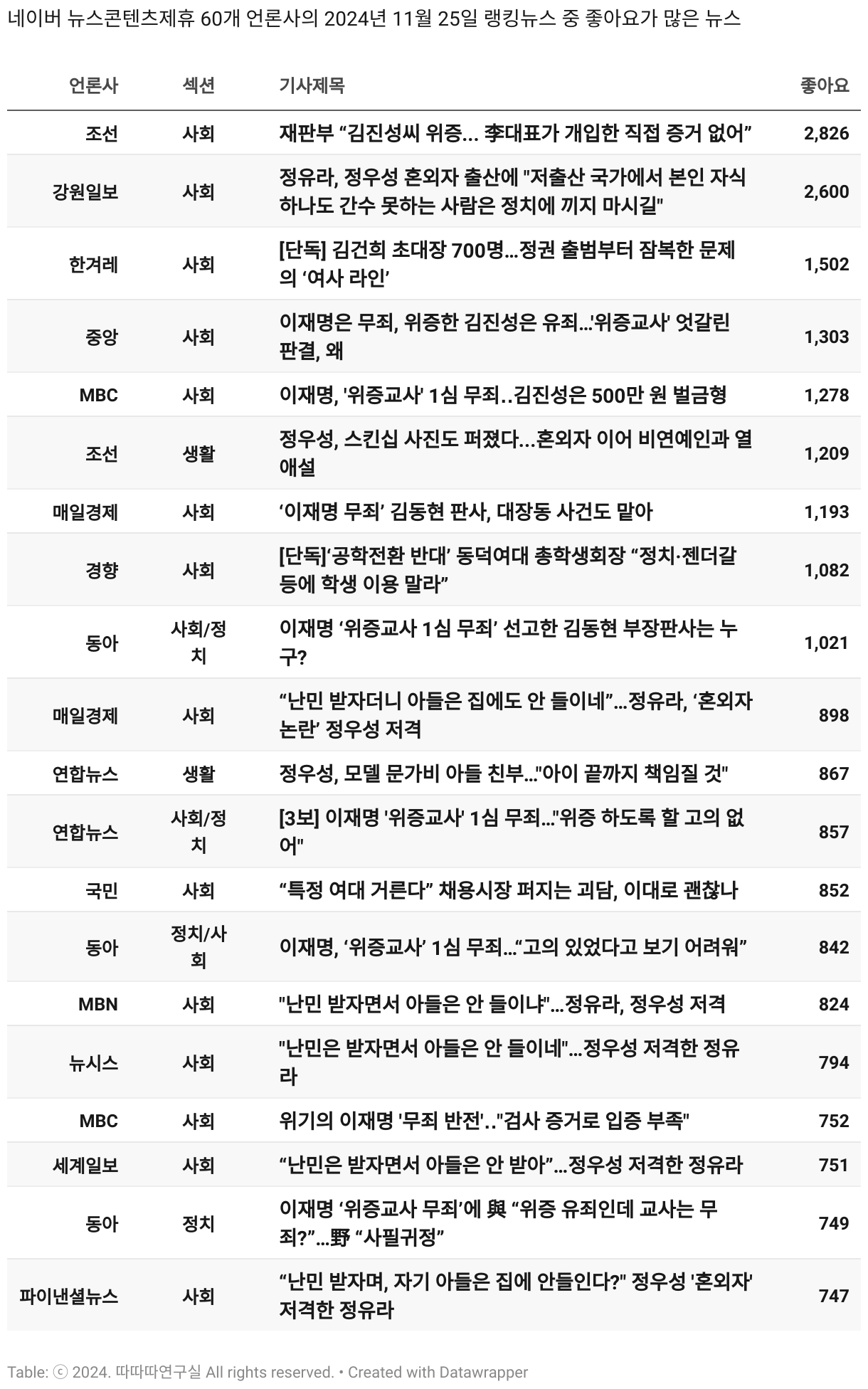 *데이터 수집 기간 : 2024년 6월 10일 *데이터 수집 대상 : 네이버 뉴스콘텐츠제휴 60개 언론사. 종합일간지 10개(경향신문, 국민일보, 동아일보, 문화일보, 서울신문, 세계일보, 조선일보, 중앙일보, 한겨레신문, 한국일보), 방송/통신사 14개(뉴스1, 뉴시스, 연합뉴스, 연합뉴스TV, 채널A, 한국경제TV, JTBC, KBS, MBC, MBN, SBS, SBS BIZ, TV조선, YTN), 경제지 11개(매일경제, 머니투데이, 비즈워치, 서울경제, 아시아경제, 이데일리, 조선비즈, 조세일보, 파이낸셜뉴스, 한국경제(유튜브제외), 헤럴드경제) 인터넷 8개(노컷뉴스, 더팩트, 데일리안, 머니S, 미디어오늘, 아이뉴스24, 오마이뉴스, 프레시안), IT 5개(디지털데일리,디지털타임스, 블로터, 전자신문, 지디넷코리아), 지역 12개(강원도민일보, 강원일보, 경기일보, 국제신문, 대구MBC, 대전일보, 매일신문, 부산일보, 전주MBC, CJB청주방송, JIBS, kbc광주방송)