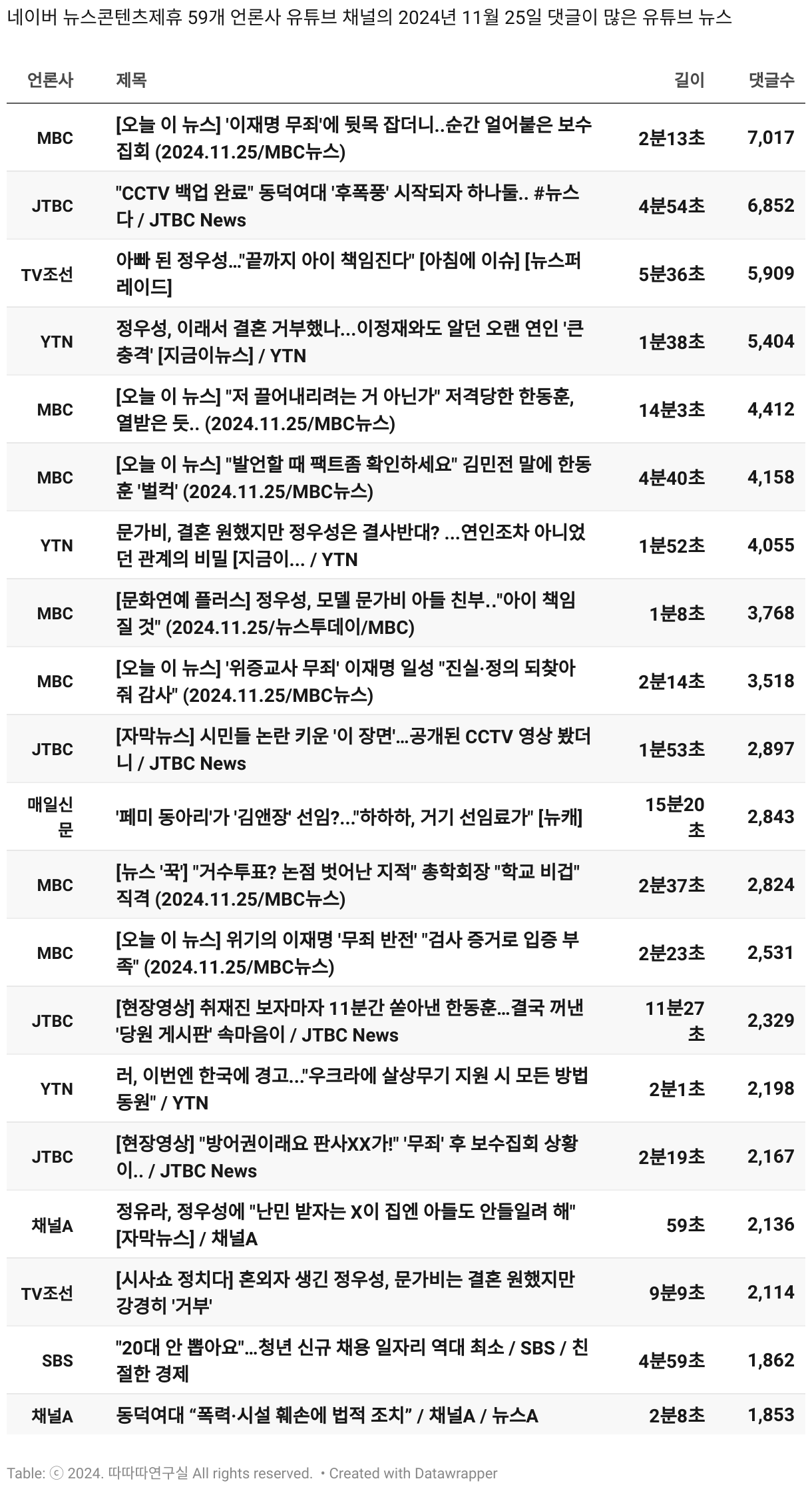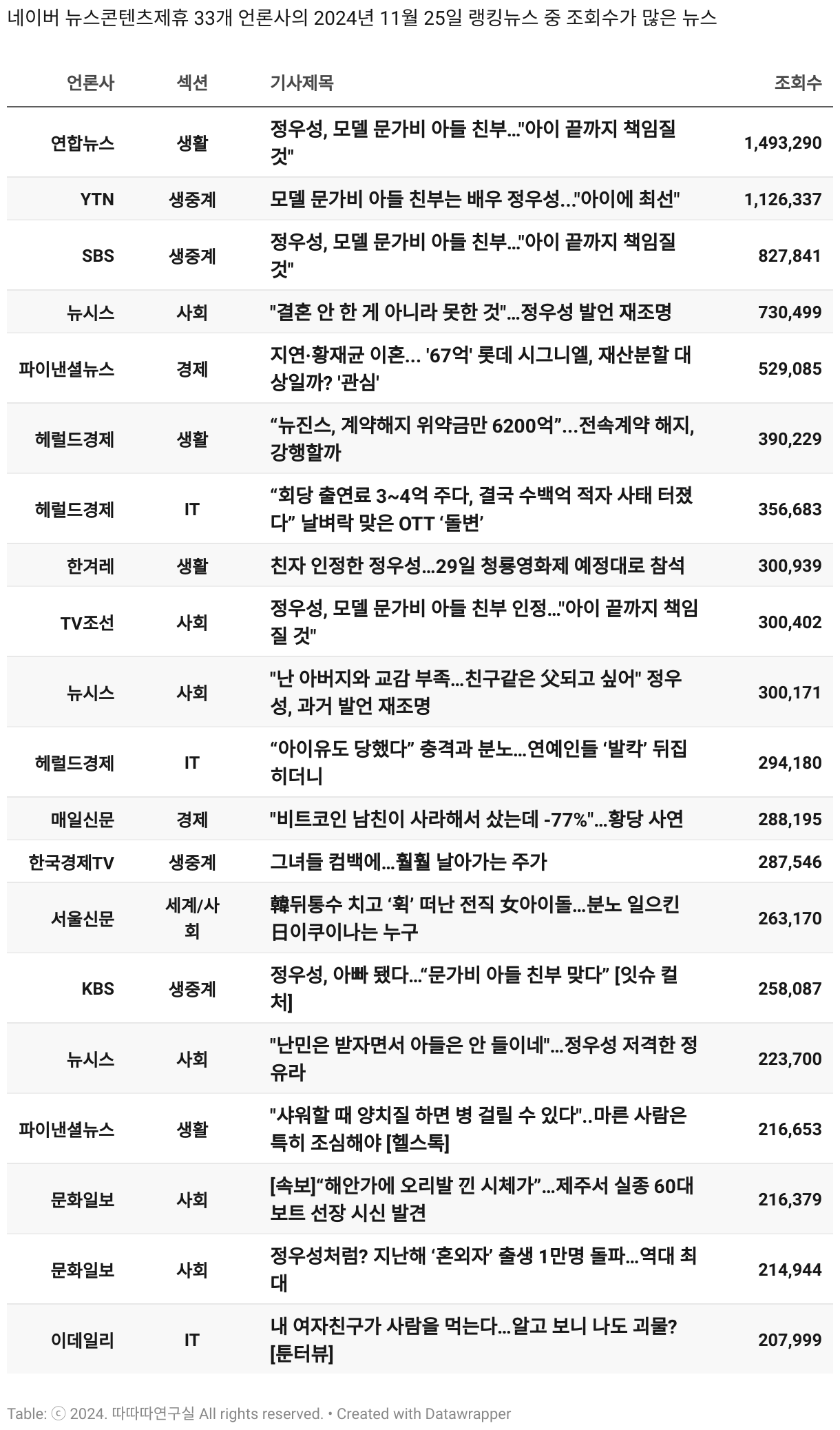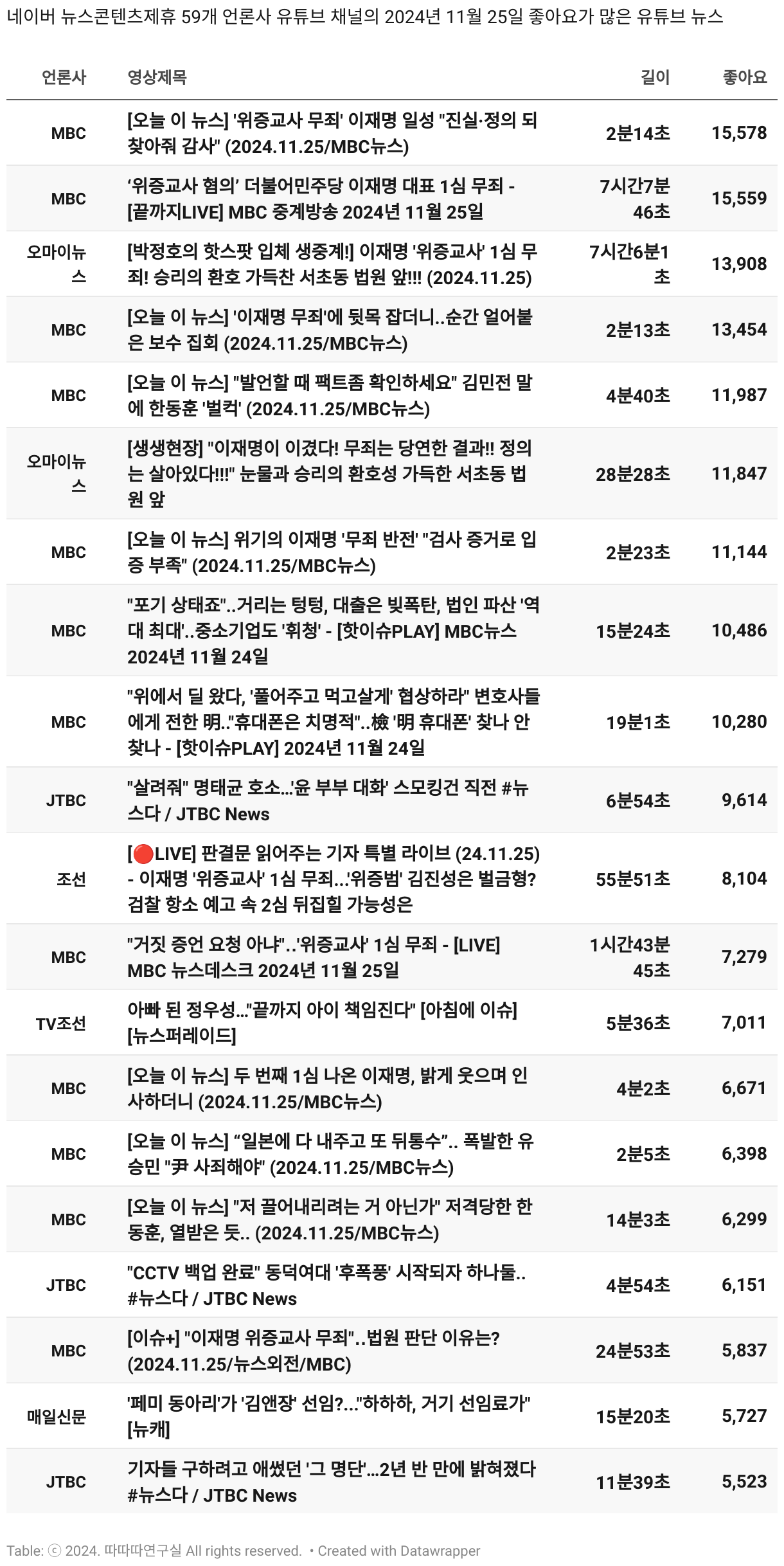 *데이터 수집 기간 : 2024년 6월 10일 *데이터 수집 대상 : 네이버 뉴스콘텐츠제휴 60개 언론사. 종합일간지 10개(경향신문, 국민일보, 동아일보, 문화일보, 서울신문, 세계일보, 조선일보, 중앙일보, 한겨레신문, 한국일보), 방송/통신사 14개(뉴스1, 뉴시스, 연합뉴스, 연합뉴스TV, 채널A, 한국경제TV, JTBC, KBS, MBC, MBN, SBS, SBS BIZ, TV조선, YTN), 경제지 11개(매일경제, 머니투데이, 비즈워치, 서울경제, 아시아경제, 이데일리, 조선비즈, 조세일보, 파이낸셜뉴스, 한국경제(유튜브제외), 헤럴드경제) 인터넷 8개(노컷뉴스, 더팩트, 데일리안, 머니S, 미디어오늘, 아이뉴스24, 오마이뉴스, 프레시안), IT 5개(디지털데일리,디지털타임스, 블로터, 전자신문, 지디넷코리아), 지역 12개(강원도민일보, 강원일보, 경기일보, 국제신문, 대구MBC, 대전일보, 매일신문, 부산일보, 전주MBC, CJB청주방송, JIBS, kbc광주방송)