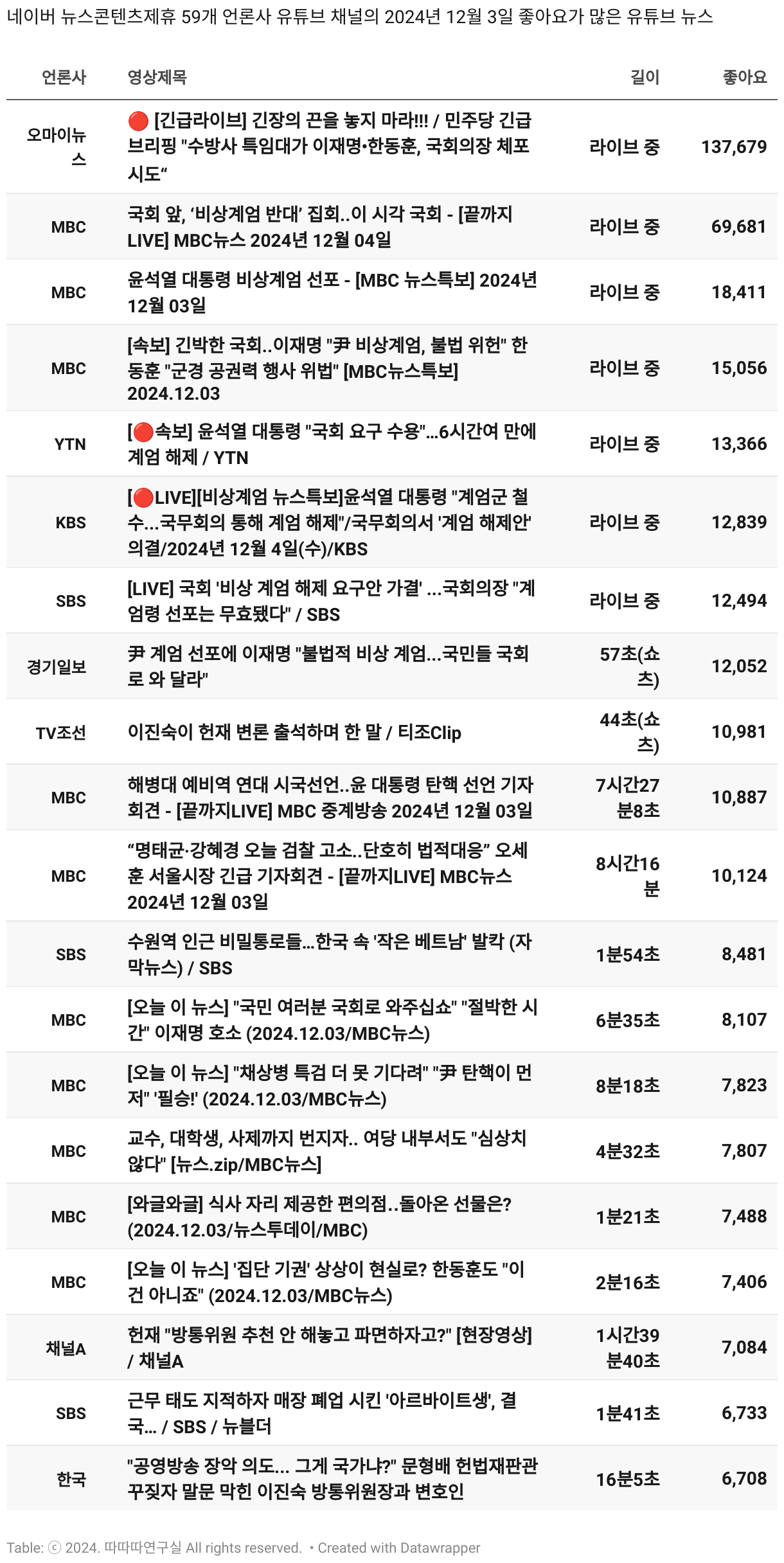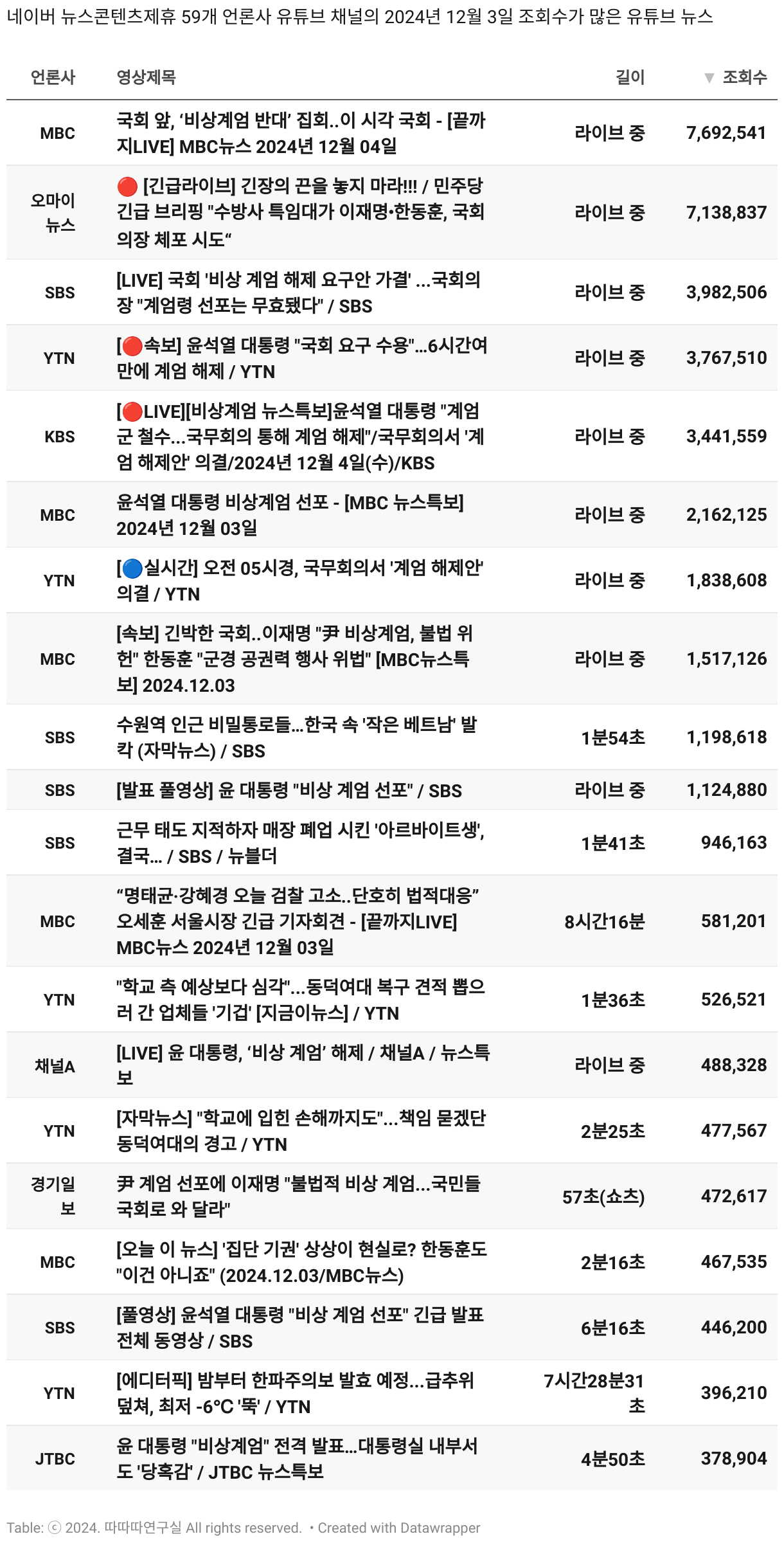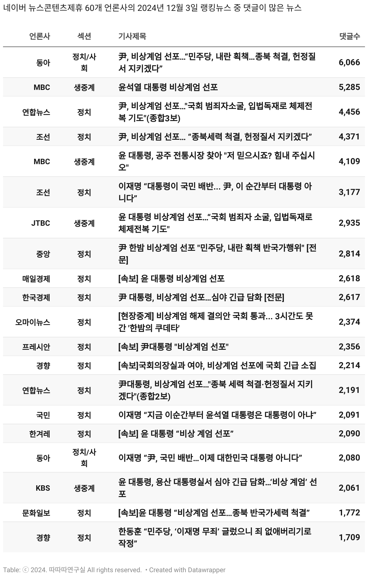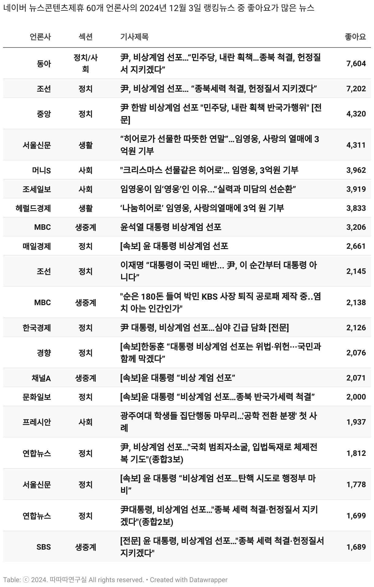 *데이터 수집 기간 : 2024년 6월 10일 *데이터 수집 대상 : 네이버 뉴스콘텐츠제휴 60개 언론사. 종합일간지 10개(경향신문, 국민일보, 동아일보, 문화일보, 서울신문, 세계일보, 조선일보, 중앙일보, 한겨레신문, 한국일보), 방송/통신사 14개(뉴스1, 뉴시스, 연합뉴스, 연합뉴스TV, 채널A, 한국경제TV, JTBC, KBS, MBC, MBN, SBS, SBS BIZ, TV조선, YTN), 경제지 11개(매일경제, 머니투데이, 비즈워치, 서울경제, 아시아경제, 이데일리, 조선비즈, 조세일보, 파이낸셜뉴스, 한국경제(유튜브제외), 헤럴드경제) 인터넷 8개(노컷뉴스, 더팩트, 데일리안, 머니S, 미디어오늘, 아이뉴스24, 오마이뉴스, 프레시안), IT 5개(디지털데일리,디지털타임스, 블로터, 전자신문, 지디넷코리아), 지역 12개(강원도민일보, 강원일보, 경기일보, 국제신문, 대구MBC, 대전일보, 매일신문, 부산일보, 전주MBC, CJB청주방송, JIBS, kbc광주방송)