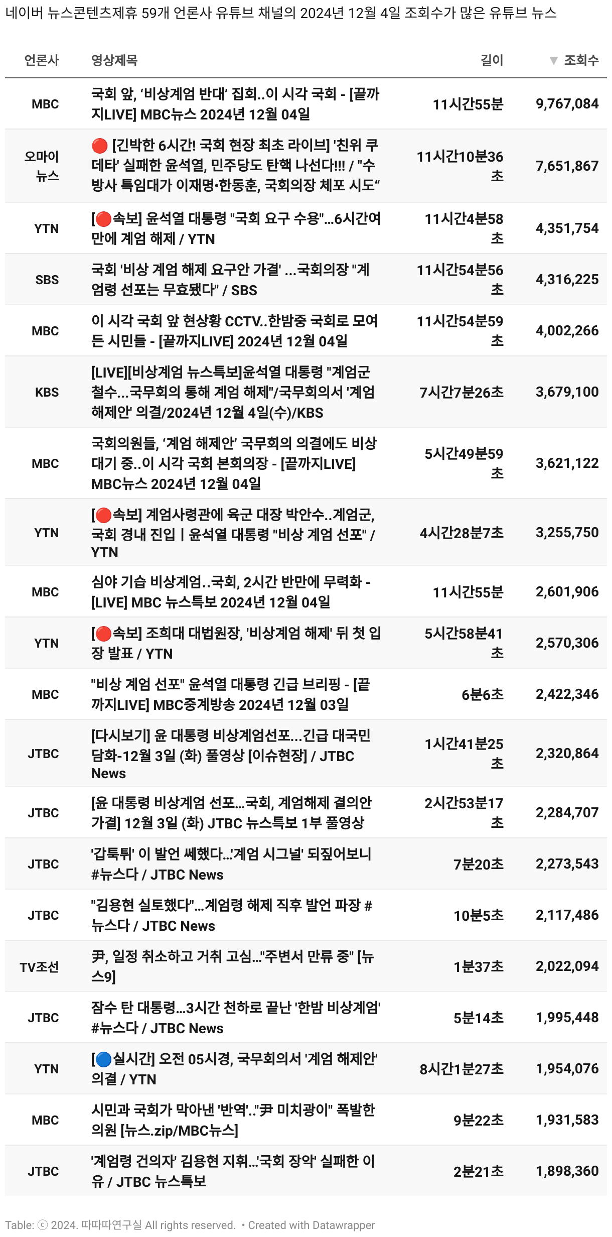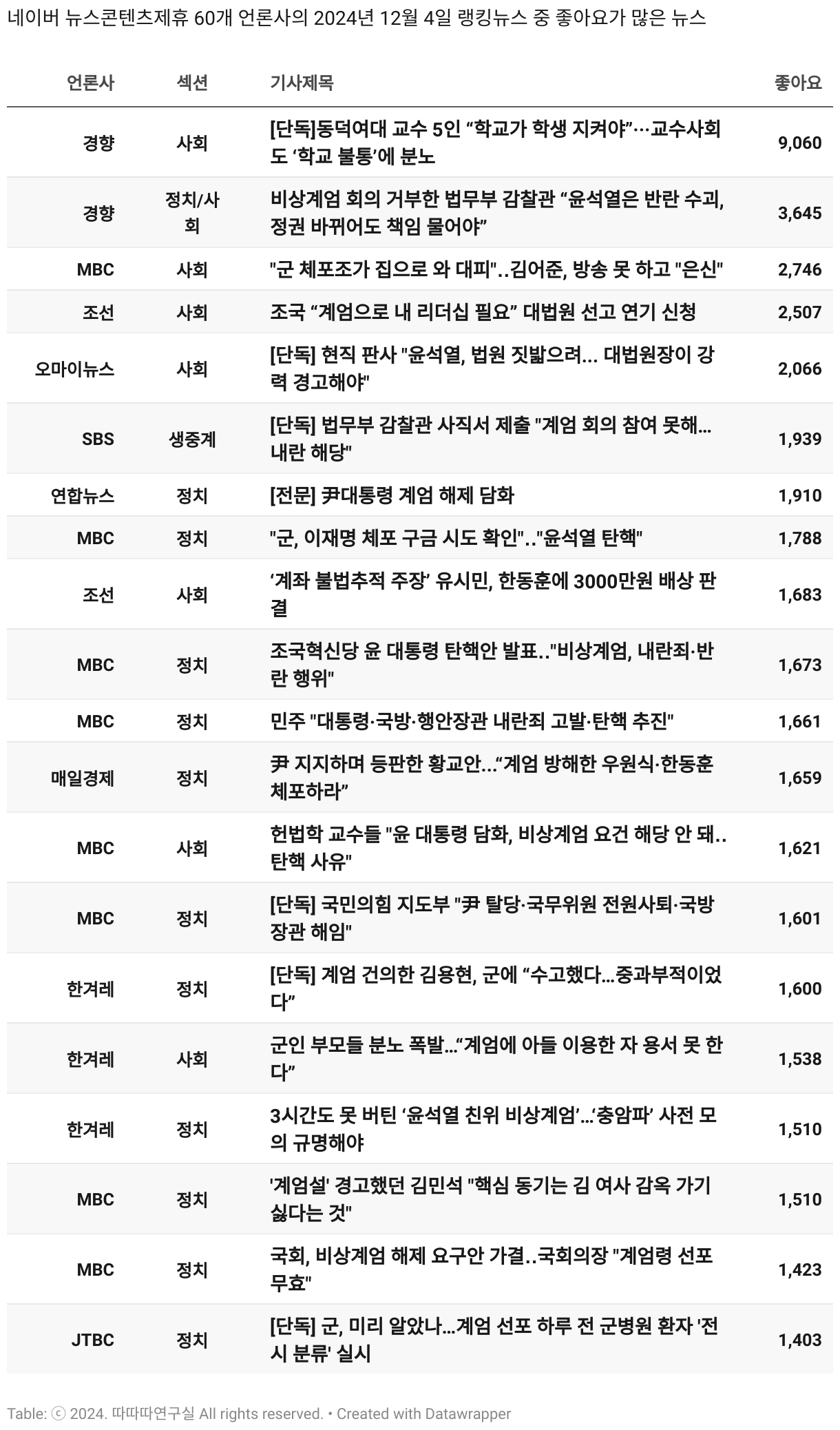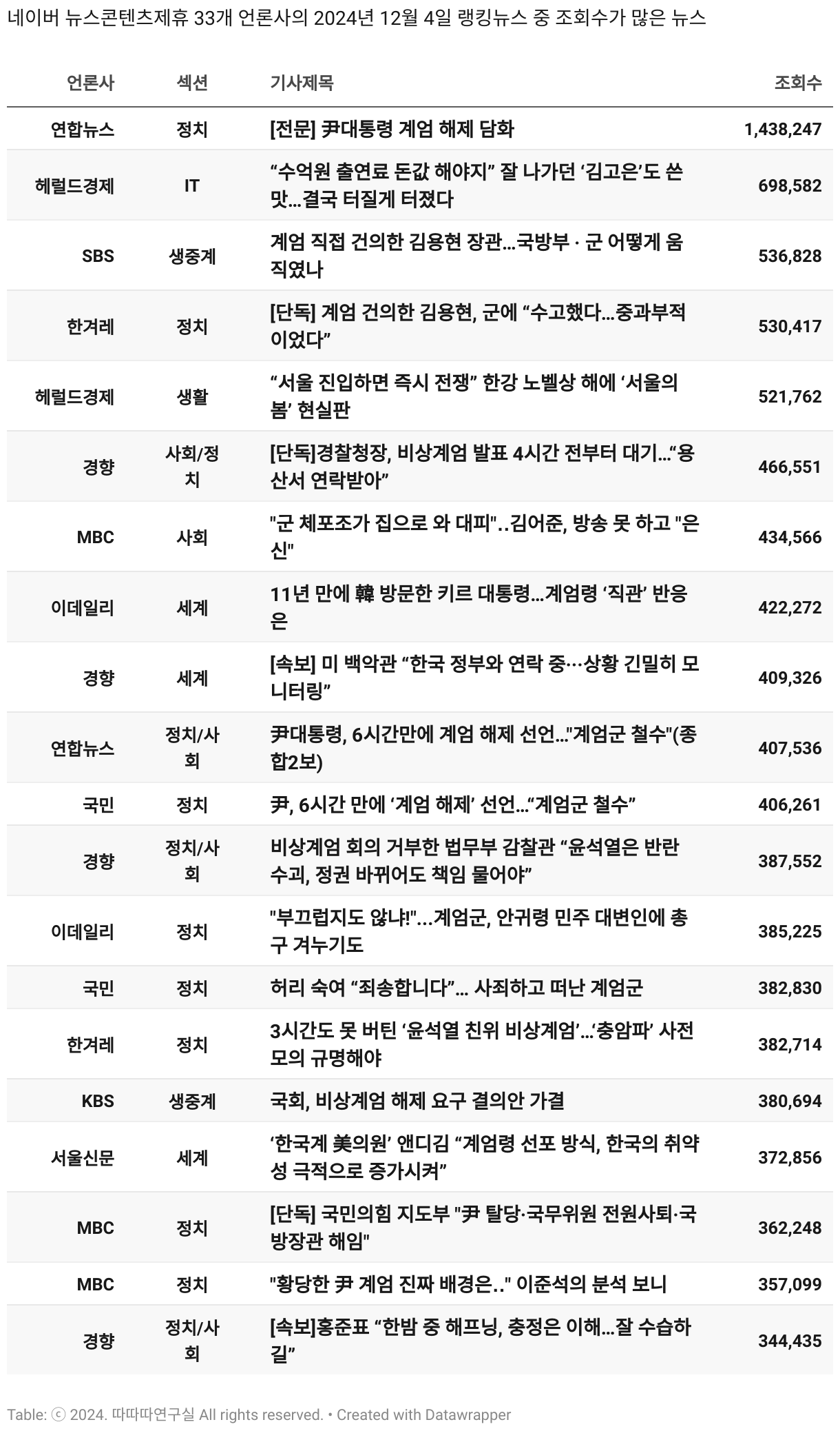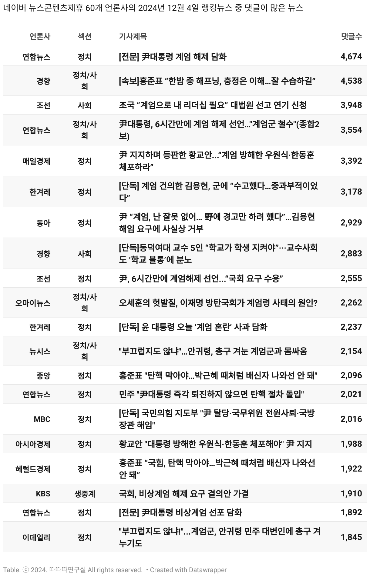 *데이터 수집 기간 : 2024년 6월 10일 *데이터 수집 대상 : 네이버 뉴스콘텐츠제휴 60개 언론사. 종합일간지 10개(경향신문, 국민일보, 동아일보, 문화일보, 서울신문, 세계일보, 조선일보, 중앙일보, 한겨레신문, 한국일보), 방송/통신사 14개(뉴스1, 뉴시스, 연합뉴스, 연합뉴스TV, 채널A, 한국경제TV, JTBC, KBS, MBC, MBN, SBS, SBS BIZ, TV조선, YTN), 경제지 11개(매일경제, 머니투데이, 비즈워치, 서울경제, 아시아경제, 이데일리, 조선비즈, 조세일보, 파이낸셜뉴스, 한국경제(유튜브제외), 헤럴드경제) 인터넷 8개(노컷뉴스, 더팩트, 데일리안, 머니S, 미디어오늘, 아이뉴스24, 오마이뉴스, 프레시안), IT 5개(디지털데일리,디지털타임스, 블로터, 전자신문, 지디넷코리아), 지역 12개(강원도민일보, 강원일보, 경기일보, 국제신문, 대구MBC, 대전일보, 매일신문, 부산일보, 전주MBC, CJB청주방송, JIBS, kbc광주방송)