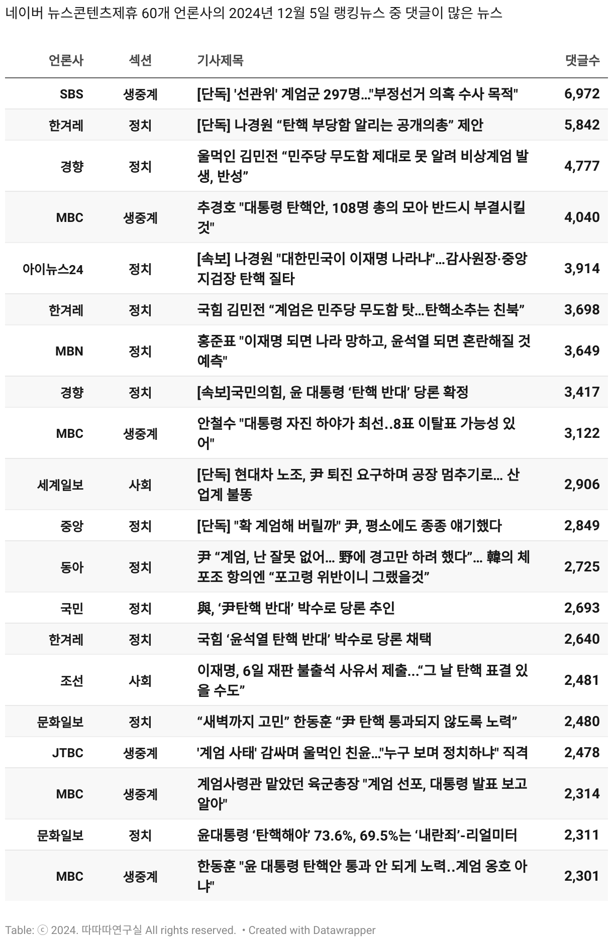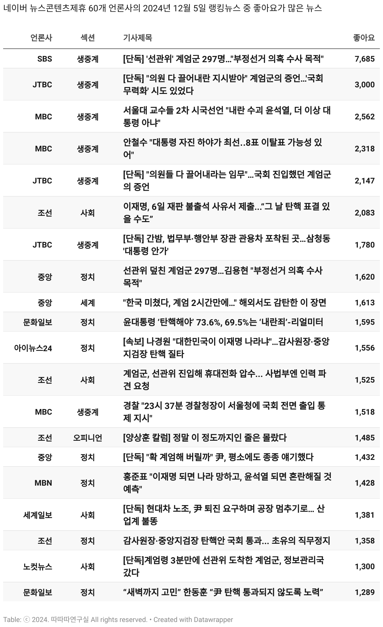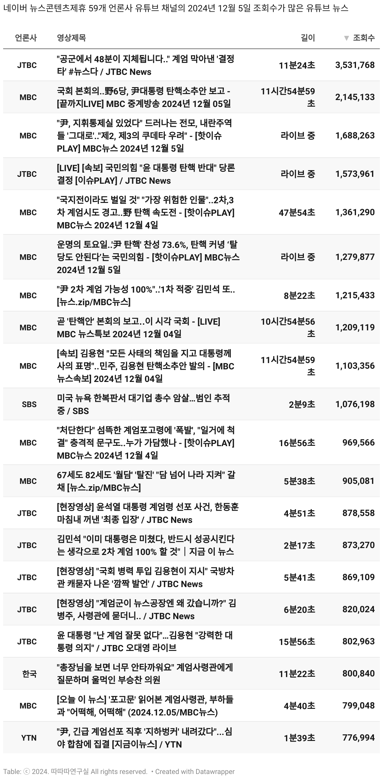*데이터 수집 기간 : 2024년 6월 10일 *데이터 수집 대상 : 네이버 뉴스콘텐츠제휴 60개 언론사. 종합일간지 10개(경향신문, 국민일보, 동아일보, 문화일보, 서울신문, 세계일보, 조선일보, 중앙일보, 한겨레신문, 한국일보), 방송/통신사 14개(뉴스1, 뉴시스, 연합뉴스, 연합뉴스TV, 채널A, 한국경제TV, JTBC, KBS, MBC, MBN, SBS, SBS BIZ, TV조선, YTN), 경제지 11개(매일경제, 머니투데이, 비즈워치, 서울경제, 아시아경제, 이데일리, 조선비즈, 조세일보, 파이낸셜뉴스, 한국경제(유튜브제외), 헤럴드경제) 인터넷 8개(노컷뉴스, 더팩트, 데일리안, 머니S, 미디어오늘, 아이뉴스24, 오마이뉴스, 프레시안), IT 5개(디지털데일리,디지털타임스, 블로터, 전자신문, 지디넷코리아), 지역 12개(강원도민일보, 강원일보, 경기일보, 국제신문, 대구MBC, 대전일보, 매일신문, 부산일보, 전주MBC, CJB청주방송, JIBS, kbc광주방송)