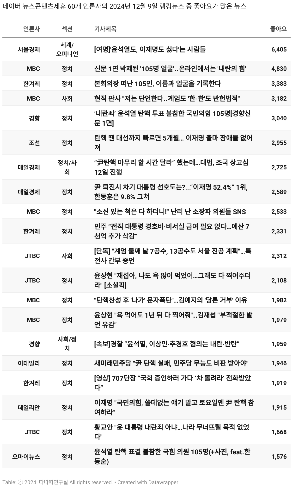 *데이터 수집 기간 : 2024년 6월 10일 *데이터 수집 대상 : 네이버 뉴스콘텐츠제휴 60개 언론사. 종합일간지 10개(경향신문, 국민일보, 동아일보, 문화일보, 서울신문, 세계일보, 조선일보, 중앙일보, 한겨레신문, 한국일보), 방송/통신사 14개(뉴스1, 뉴시스, 연합뉴스, 연합뉴스TV, 채널A, 한국경제TV, JTBC, KBS, MBC, MBN, SBS, SBS BIZ, TV조선, YTN), 경제지 11개(매일경제, 머니투데이, 비즈워치, 서울경제, 아시아경제, 이데일리, 조선비즈, 조세일보, 파이낸셜뉴스, 한국경제(유튜브제외), 헤럴드경제) 인터넷 8개(노컷뉴스, 더팩트, 데일리안, 머니S, 미디어오늘, 아이뉴스24, 오마이뉴스, 프레시안), IT 5개(디지털데일리,디지털타임스, 블로터, 전자신문, 지디넷코리아), 지역 12개(강원도민일보, 강원일보, 경기일보, 국제신문, 대구MBC, 대전일보, 매일신문, 부산일보, 전주MBC, CJB청주방송, JIBS, kbc광주방송)