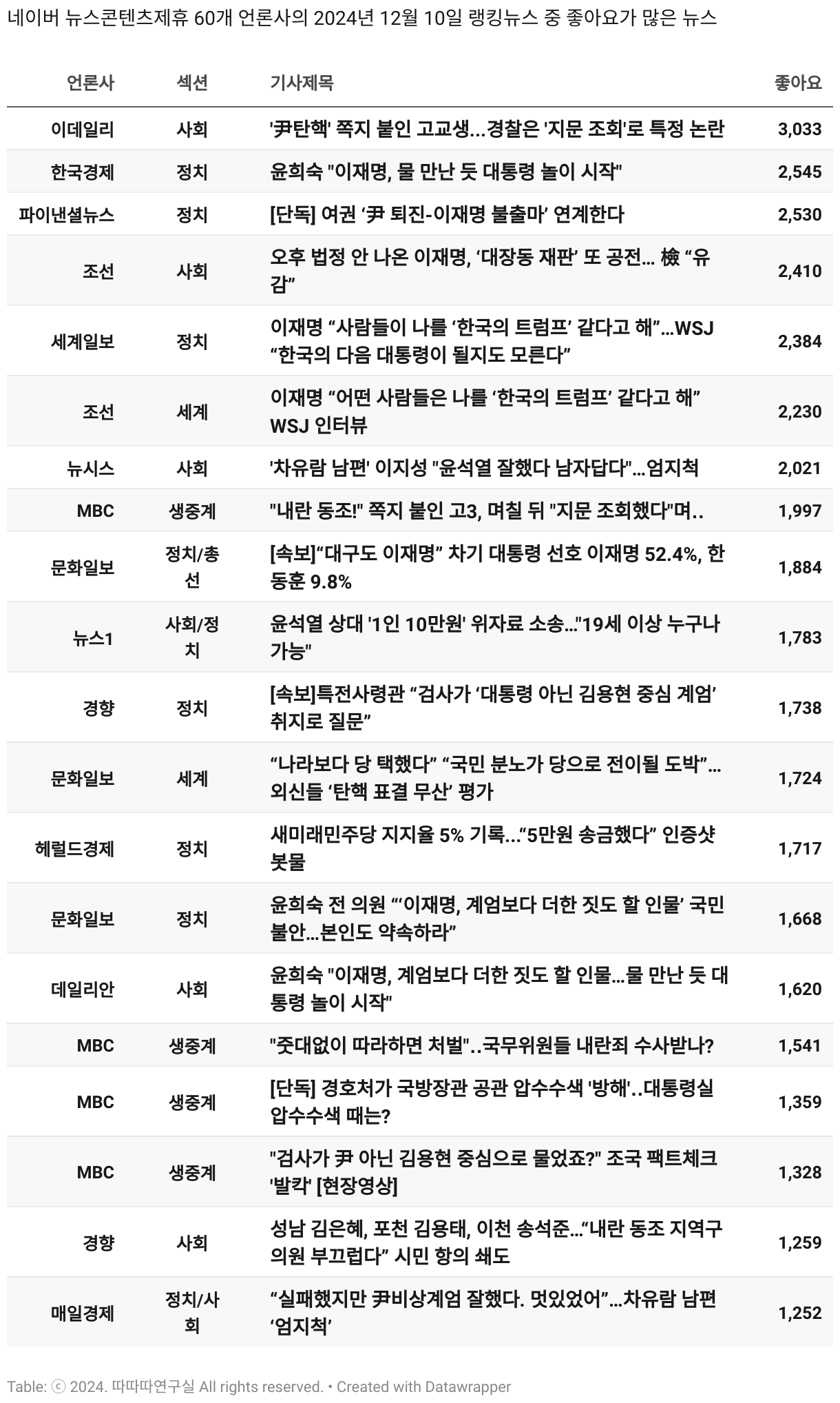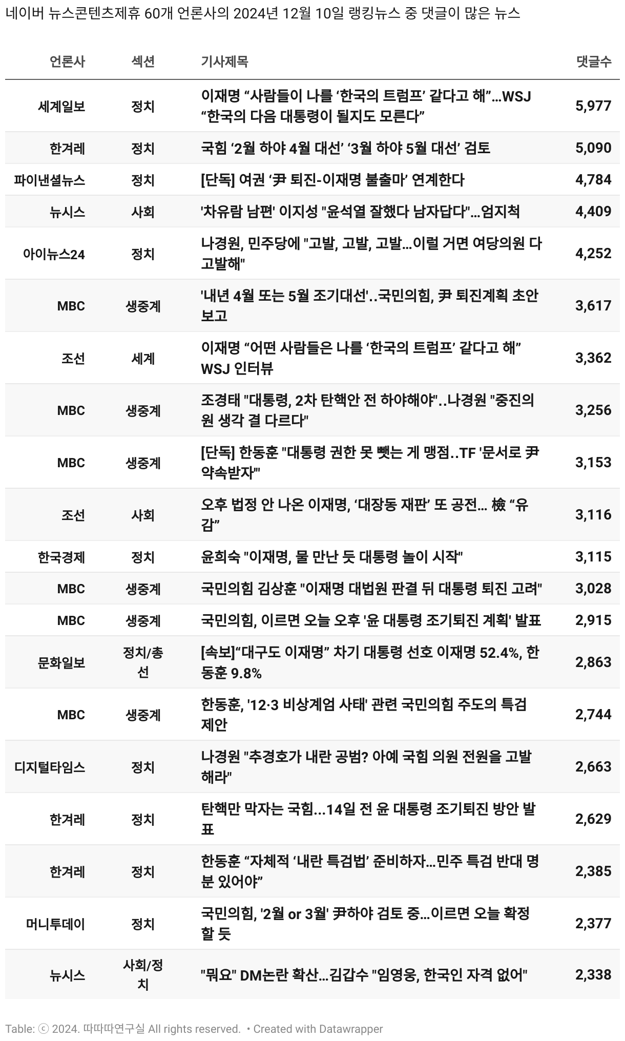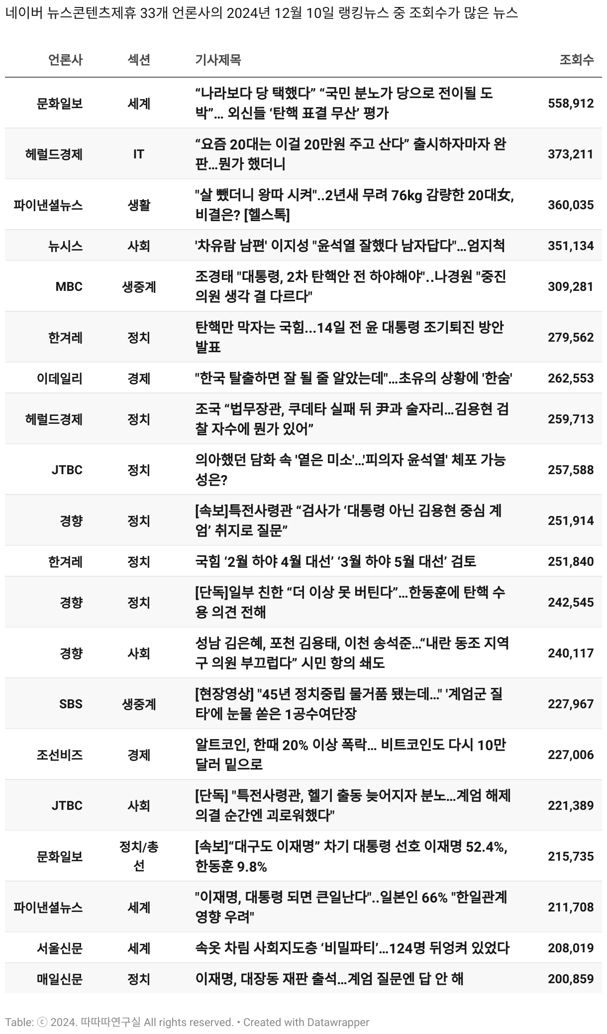 *데이터 수집 기간 : 2024년 6월 10일 *데이터 수집 대상 : 네이버 뉴스콘텐츠제휴 60개 언론사. 종합일간지 10개(경향신문, 국민일보, 동아일보, 문화일보, 서울신문, 세계일보, 조선일보, 중앙일보, 한겨레신문, 한국일보), 방송/통신사 14개(뉴스1, 뉴시스, 연합뉴스, 연합뉴스TV, 채널A, 한국경제TV, JTBC, KBS, MBC, MBN, SBS, SBS BIZ, TV조선, YTN), 경제지 11개(매일경제, 머니투데이, 비즈워치, 서울경제, 아시아경제, 이데일리, 조선비즈, 조세일보, 파이낸셜뉴스, 한국경제(유튜브제외), 헤럴드경제) 인터넷 8개(노컷뉴스, 더팩트, 데일리안, 머니S, 미디어오늘, 아이뉴스24, 오마이뉴스, 프레시안), IT 5개(디지털데일리,디지털타임스, 블로터, 전자신문, 지디넷코리아), 지역 12개(강원도민일보, 강원일보, 경기일보, 국제신문, 대구MBC, 대전일보, 매일신문, 부산일보, 전주MBC, CJB청주방송, JIBS, kbc광주방송)