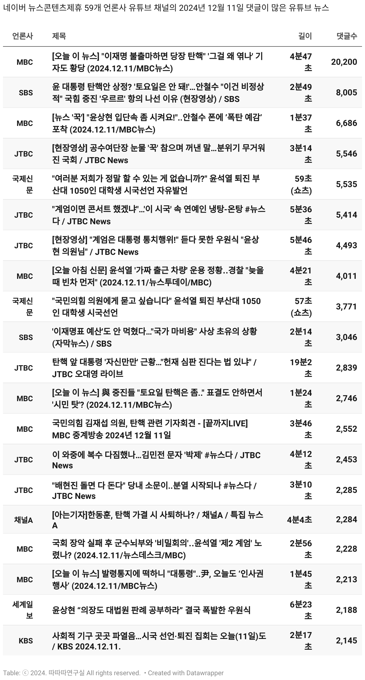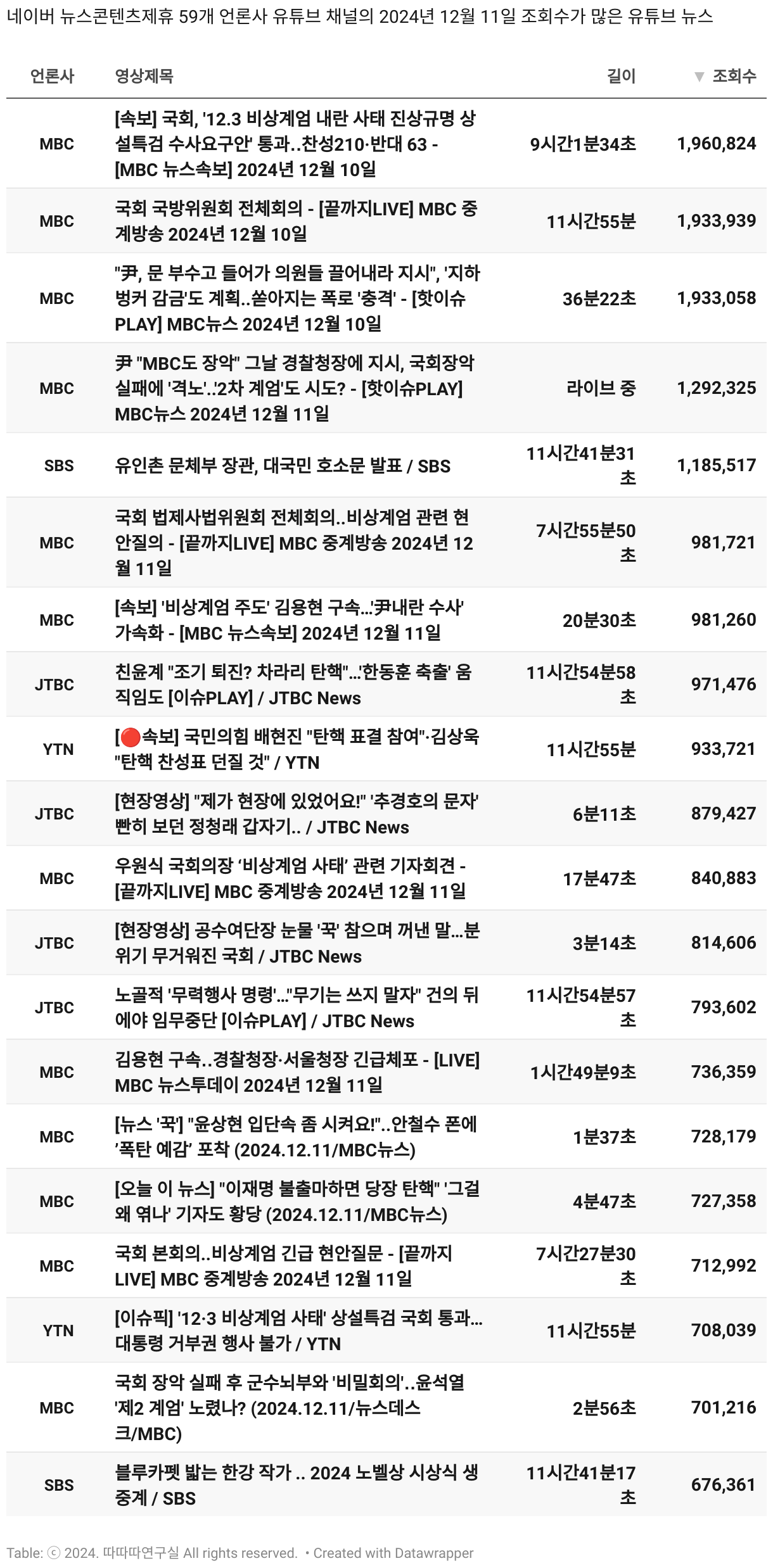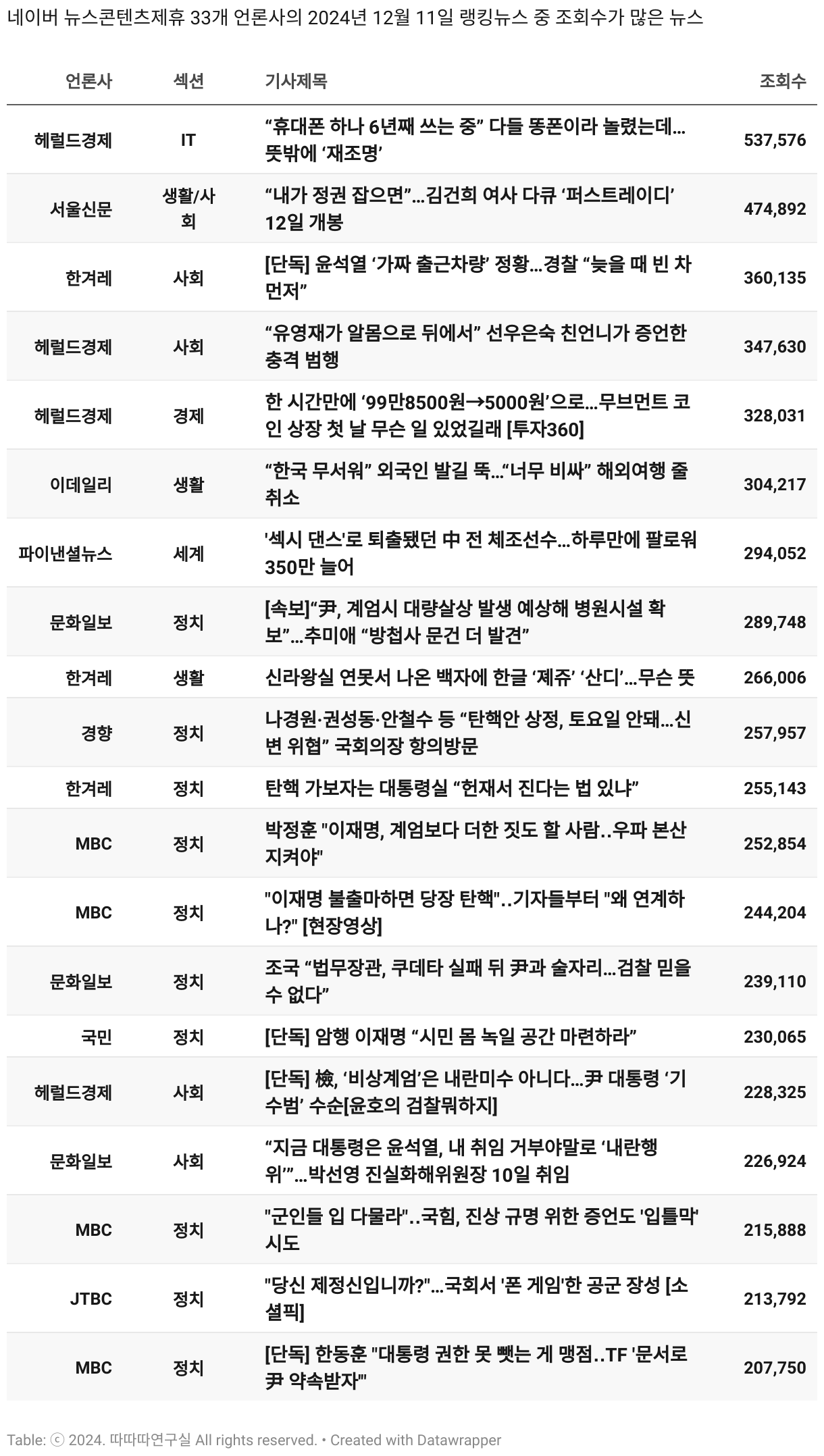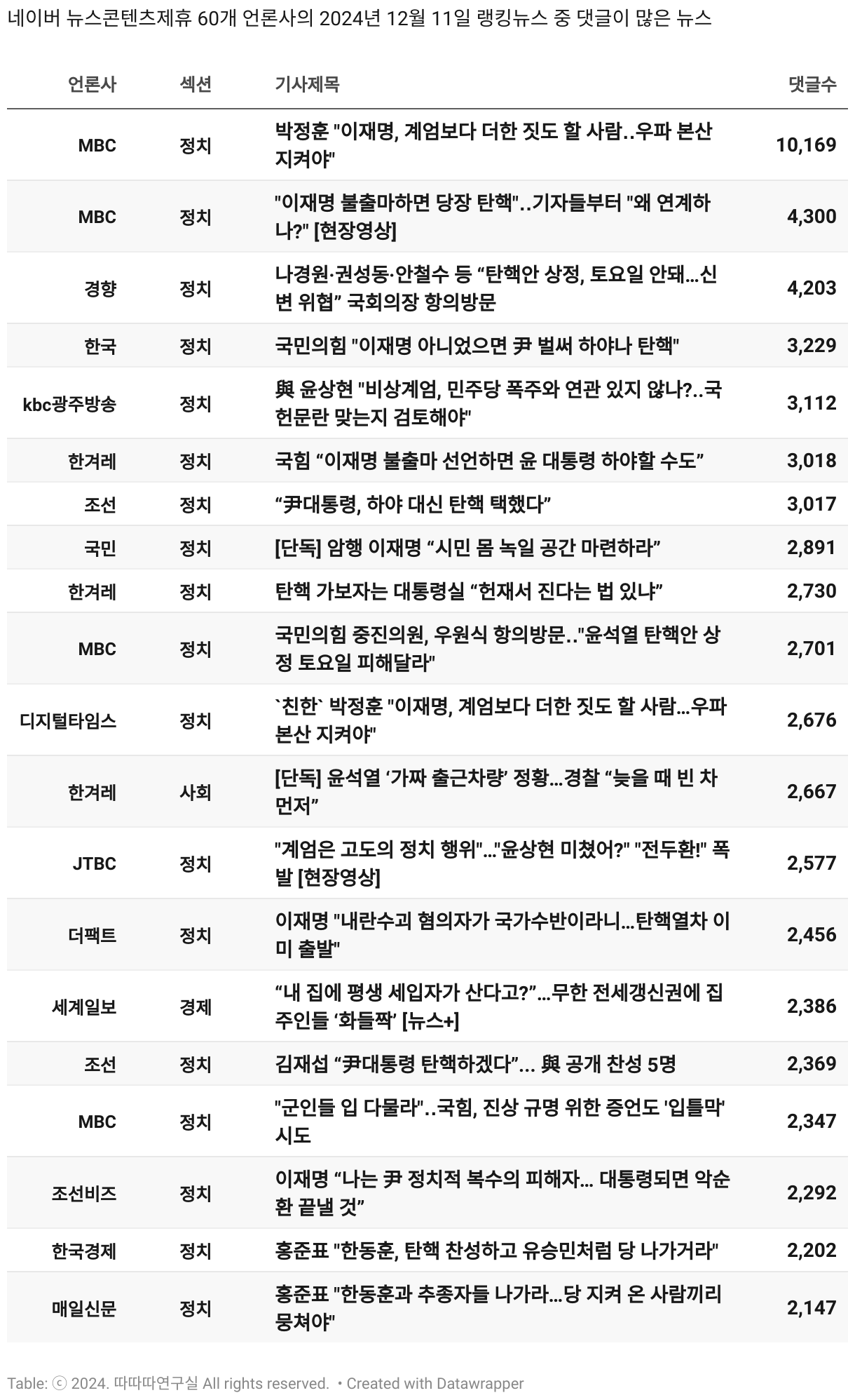 *데이터 수집 기간 : 2024년 6월 10일 *데이터 수집 대상 : 네이버 뉴스콘텐츠제휴 60개 언론사. 종합일간지 10개(경향신문, 국민일보, 동아일보, 문화일보, 서울신문, 세계일보, 조선일보, 중앙일보, 한겨레신문, 한국일보), 방송/통신사 14개(뉴스1, 뉴시스, 연합뉴스, 연합뉴스TV, 채널A, 한국경제TV, JTBC, KBS, MBC, MBN, SBS, SBS BIZ, TV조선, YTN), 경제지 11개(매일경제, 머니투데이, 비즈워치, 서울경제, 아시아경제, 이데일리, 조선비즈, 조세일보, 파이낸셜뉴스, 한국경제(유튜브제외), 헤럴드경제) 인터넷 8개(노컷뉴스, 더팩트, 데일리안, 머니S, 미디어오늘, 아이뉴스24, 오마이뉴스, 프레시안), IT 5개(디지털데일리,디지털타임스, 블로터, 전자신문, 지디넷코리아), 지역 12개(강원도민일보, 강원일보, 경기일보, 국제신문, 대구MBC, 대전일보, 매일신문, 부산일보, 전주MBC, CJB청주방송, JIBS, kbc광주방송)