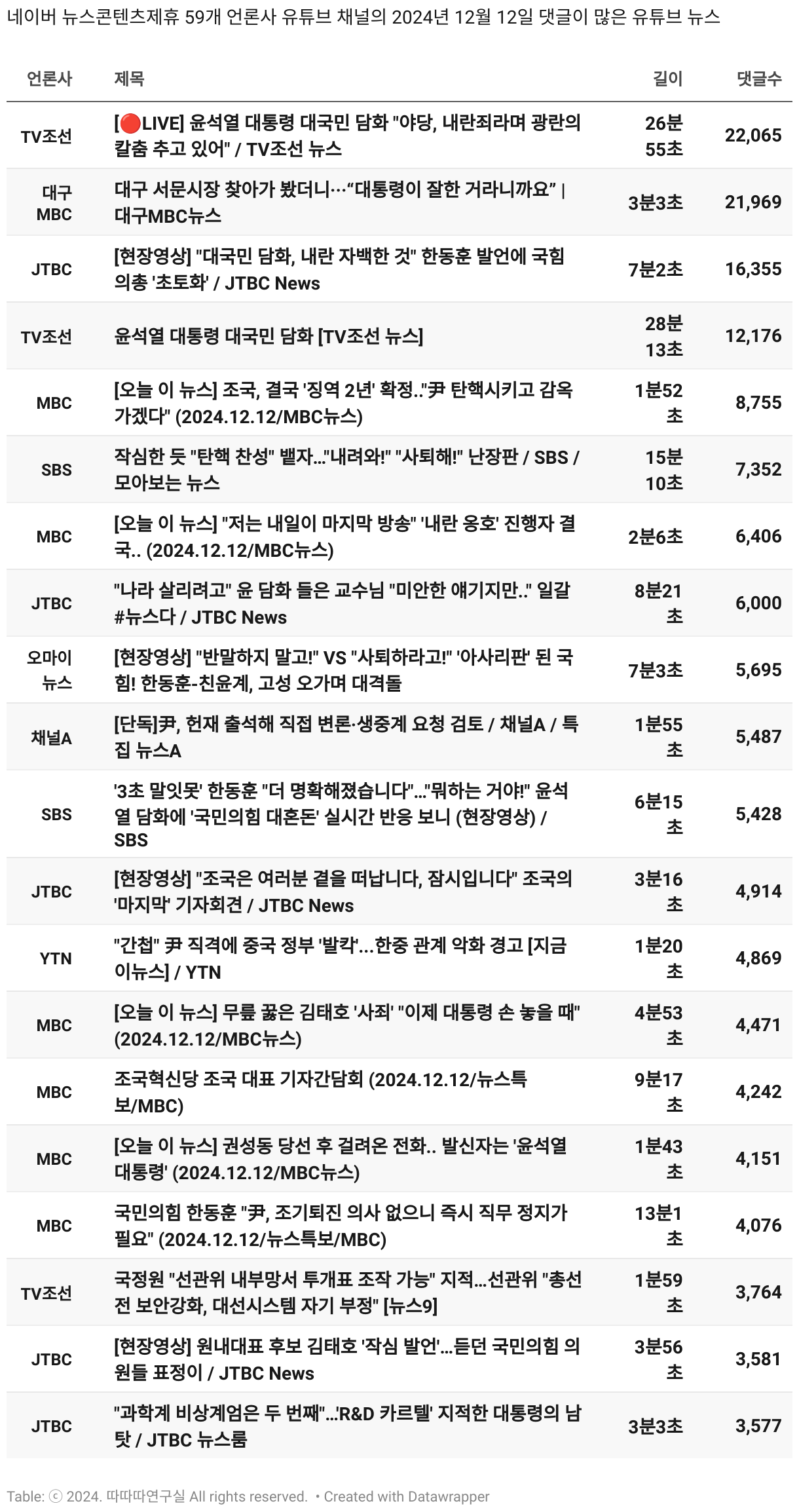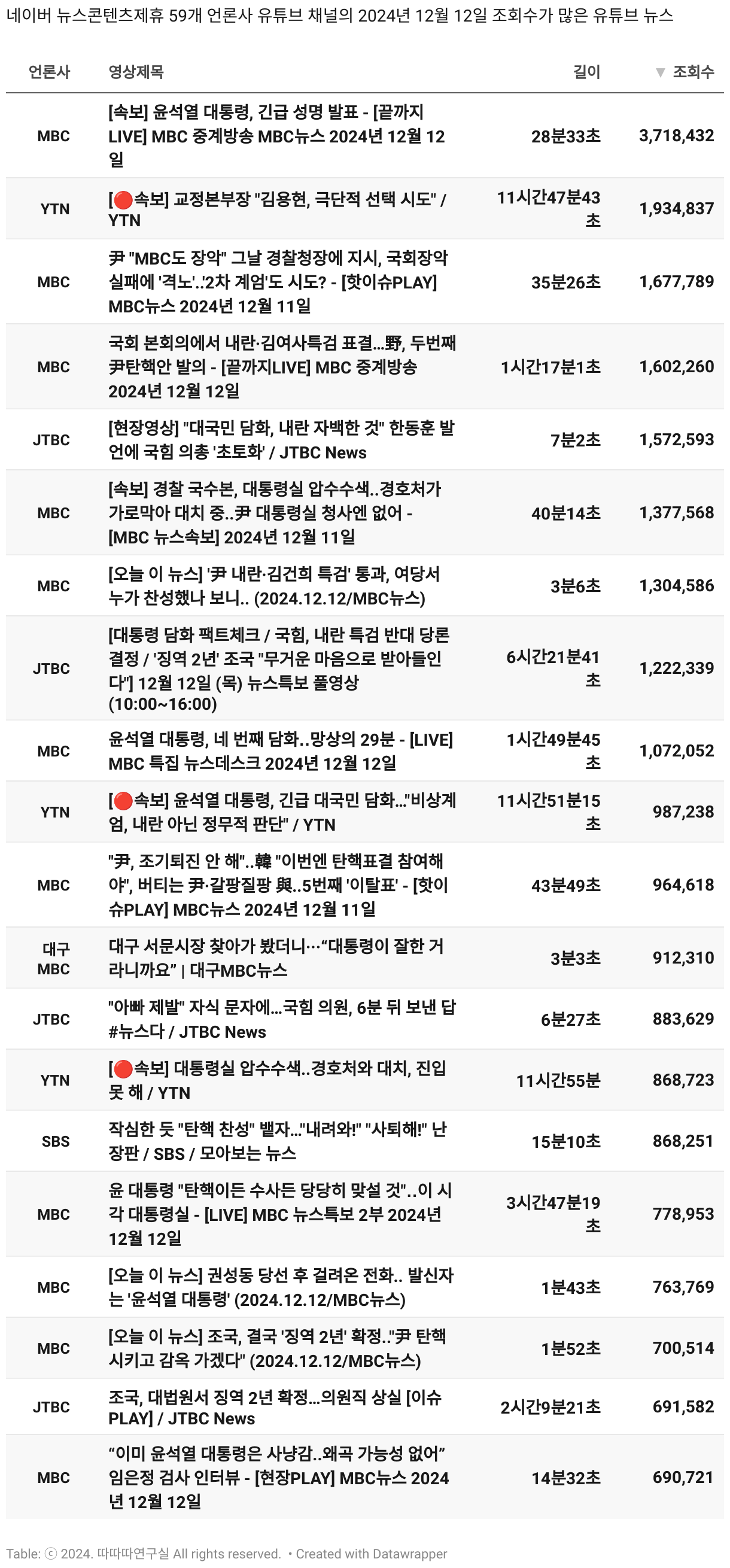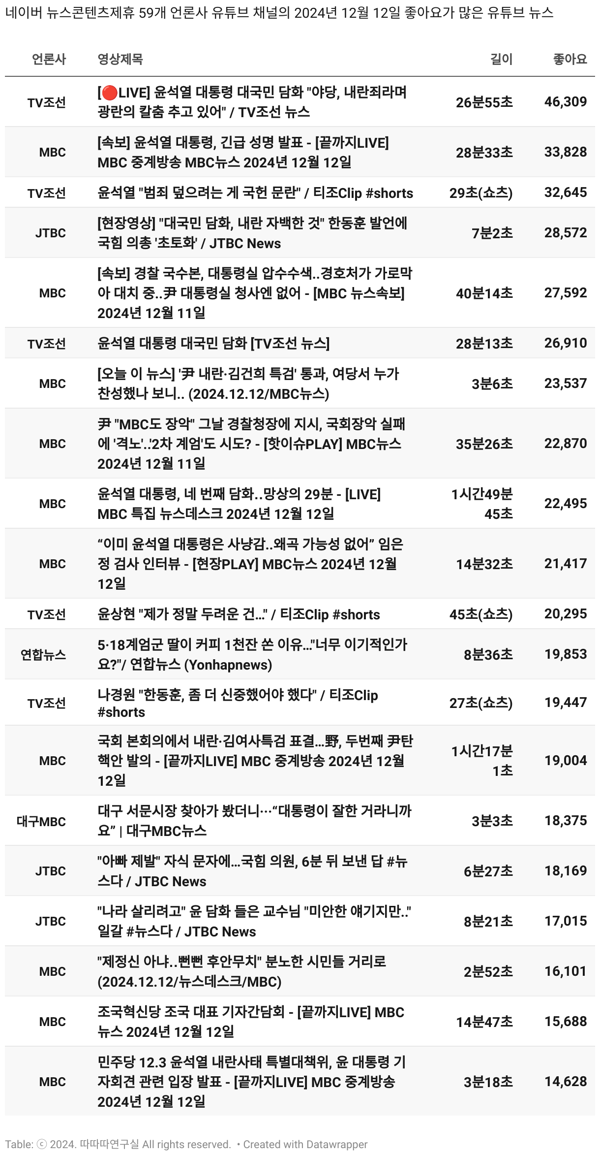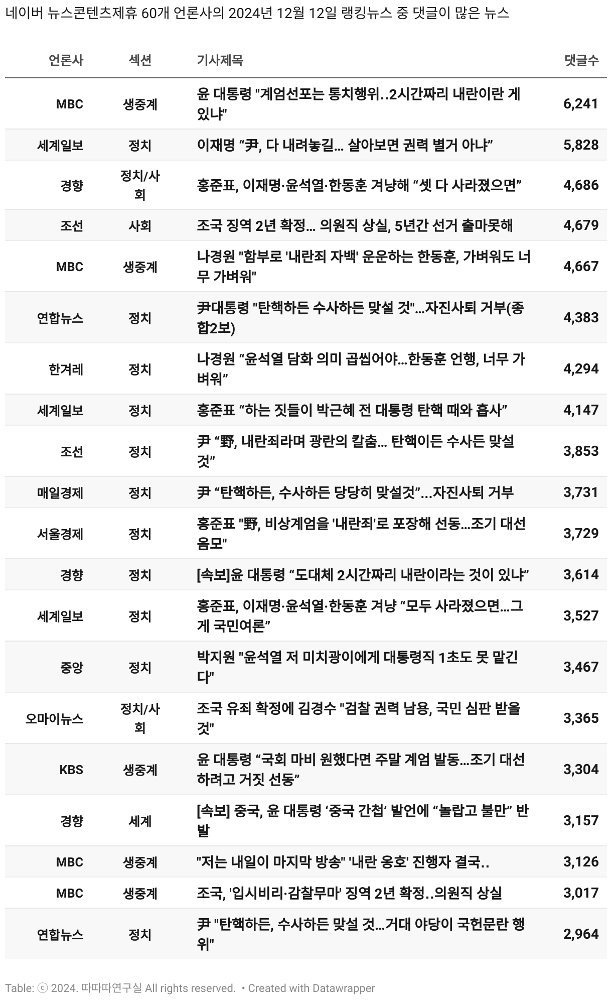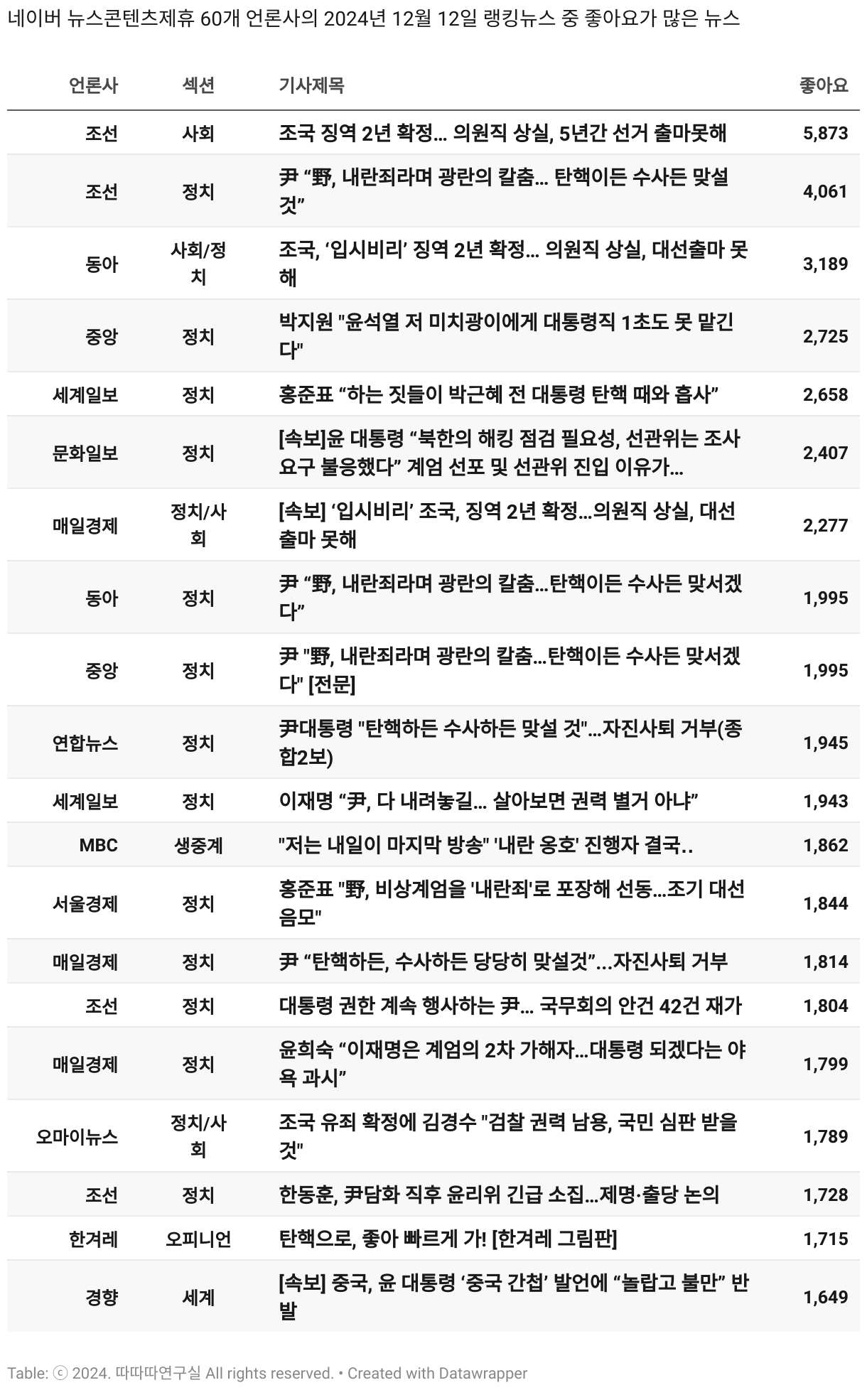 *데이터 수집 기간 : 2024년 6월 10일 *데이터 수집 대상 : 네이버 뉴스콘텐츠제휴 60개 언론사. 종합일간지 10개(경향신문, 국민일보, 동아일보, 문화일보, 서울신문, 세계일보, 조선일보, 중앙일보, 한겨레신문, 한국일보), 방송/통신사 14개(뉴스1, 뉴시스, 연합뉴스, 연합뉴스TV, 채널A, 한국경제TV, JTBC, KBS, MBC, MBN, SBS, SBS BIZ, TV조선, YTN), 경제지 11개(매일경제, 머니투데이, 비즈워치, 서울경제, 아시아경제, 이데일리, 조선비즈, 조세일보, 파이낸셜뉴스, 한국경제(유튜브제외), 헤럴드경제) 인터넷 8개(노컷뉴스, 더팩트, 데일리안, 머니S, 미디어오늘, 아이뉴스24, 오마이뉴스, 프레시안), IT 5개(디지털데일리,디지털타임스, 블로터, 전자신문, 지디넷코리아), 지역 12개(강원도민일보, 강원일보, 경기일보, 국제신문, 대구MBC, 대전일보, 매일신문, 부산일보, 전주MBC, CJB청주방송, JIBS, kbc광주방송)