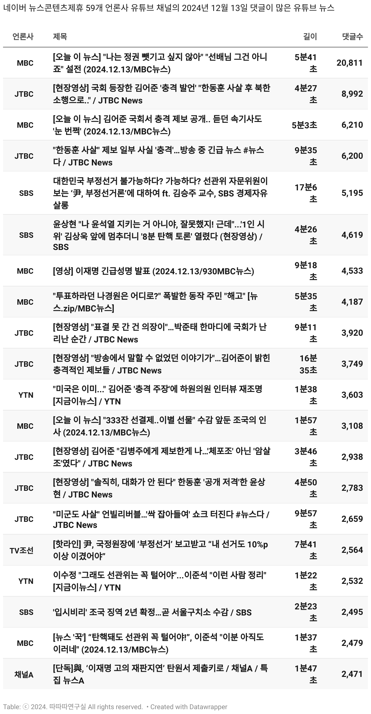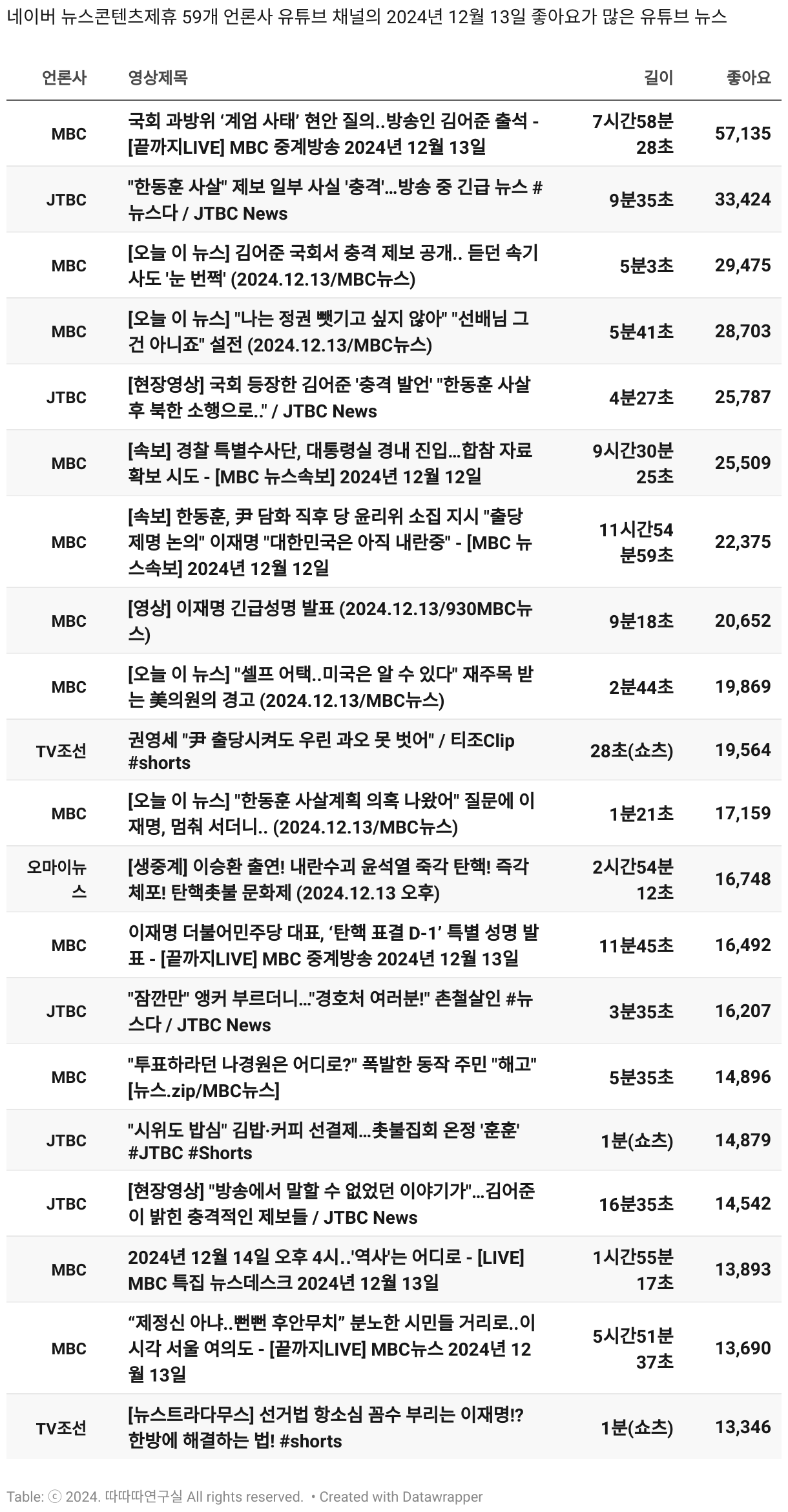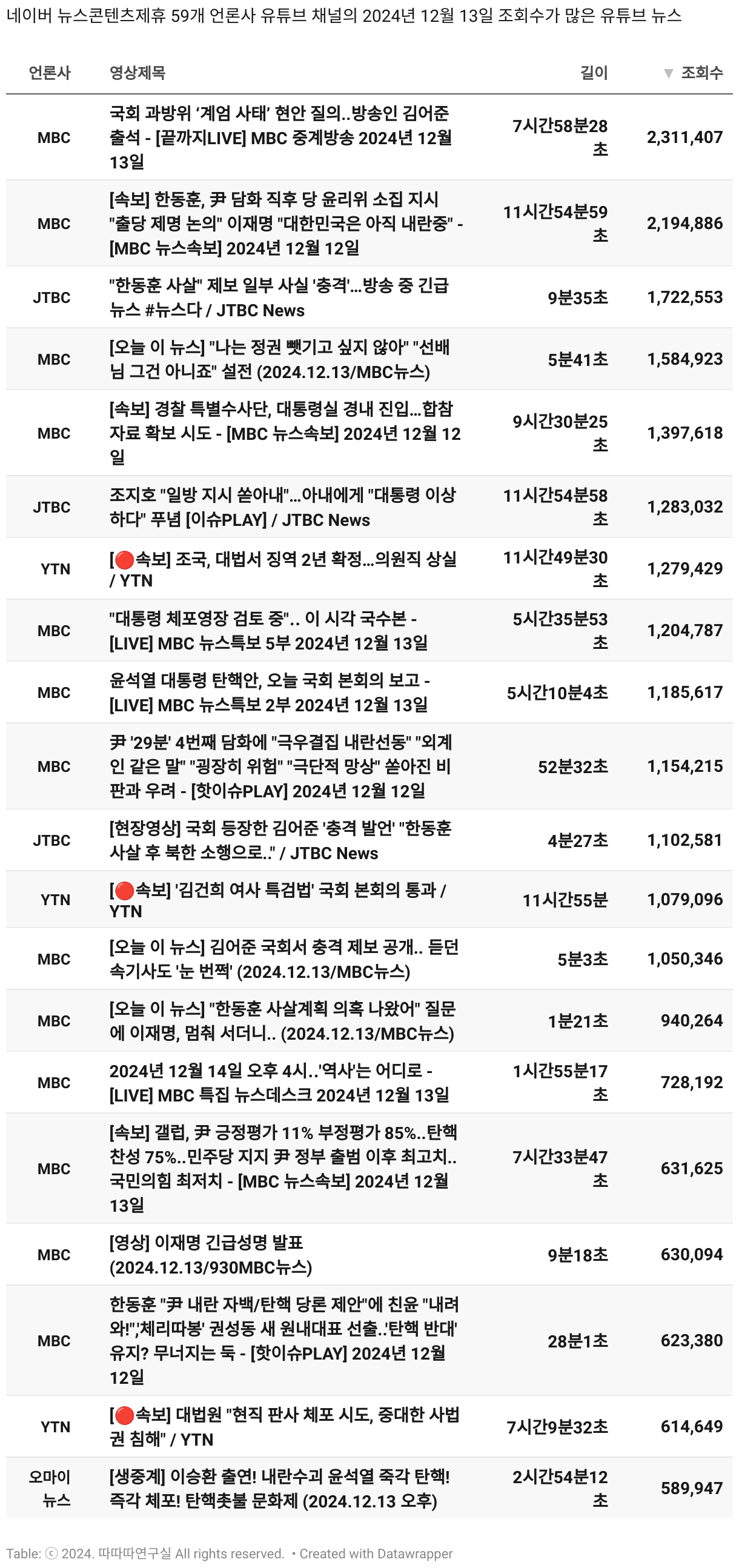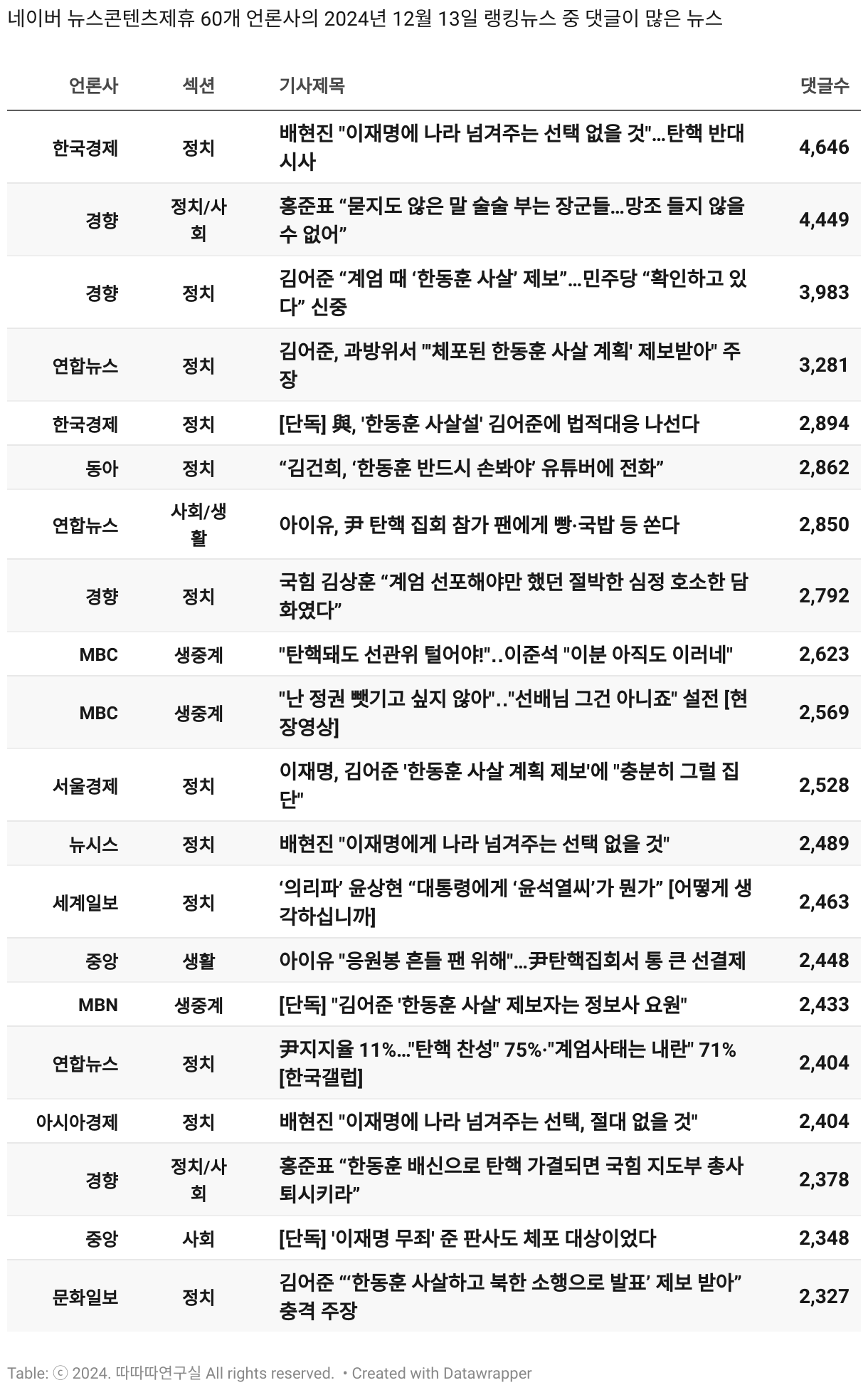 *데이터 수집 기간 : 2024년 6월 10일 *데이터 수집 대상 : 네이버 뉴스콘텐츠제휴 60개 언론사. 종합일간지 10개(경향신문, 국민일보, 동아일보, 문화일보, 서울신문, 세계일보, 조선일보, 중앙일보, 한겨레신문, 한국일보), 방송/통신사 14개(뉴스1, 뉴시스, 연합뉴스, 연합뉴스TV, 채널A, 한국경제TV, JTBC, KBS, MBC, MBN, SBS, SBS BIZ, TV조선, YTN), 경제지 11개(매일경제, 머니투데이, 비즈워치, 서울경제, 아시아경제, 이데일리, 조선비즈, 조세일보, 파이낸셜뉴스, 한국경제(유튜브제외), 헤럴드경제) 인터넷 8개(노컷뉴스, 더팩트, 데일리안, 머니S, 미디어오늘, 아이뉴스24, 오마이뉴스, 프레시안), IT 5개(디지털데일리,디지털타임스, 블로터, 전자신문, 지디넷코리아), 지역 12개(강원도민일보, 강원일보, 경기일보, 국제신문, 대구MBC, 대전일보, 매일신문, 부산일보, 전주MBC, CJB청주방송, JIBS, kbc광주방송)