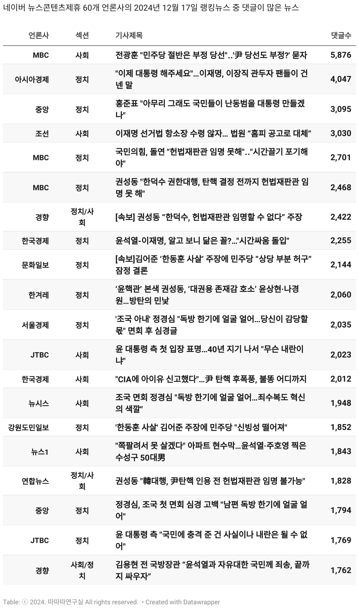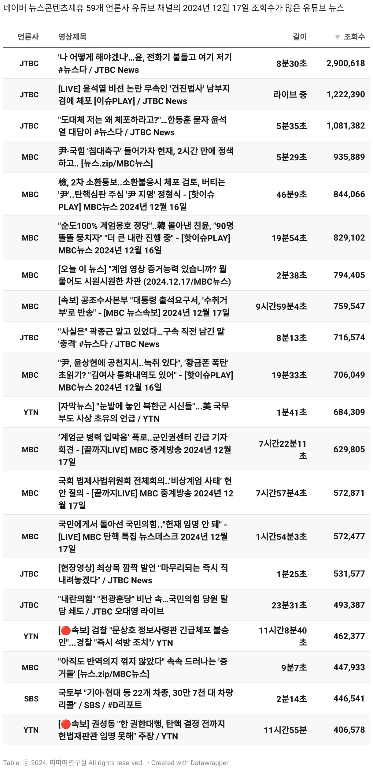 *데이터 수집 기간 : 2024년 6월 10일 *데이터 수집 대상 : 네이버 뉴스콘텐츠제휴 60개 언론사. 종합일간지 10개(경향신문, 국민일보, 동아일보, 문화일보, 서울신문, 세계일보, 조선일보, 중앙일보, 한겨레신문, 한국일보), 방송/통신사 14개(뉴스1, 뉴시스, 연합뉴스, 연합뉴스TV, 채널A, 한국경제TV, JTBC, KBS, MBC, MBN, SBS, SBS BIZ, TV조선, YTN), 경제지 11개(매일경제, 머니투데이, 비즈워치, 서울경제, 아시아경제, 이데일리, 조선비즈, 조세일보, 파이낸셜뉴스, 한국경제(유튜브제외), 헤럴드경제) 인터넷 8개(노컷뉴스, 더팩트, 데일리안, 머니S, 미디어오늘, 아이뉴스24, 오마이뉴스, 프레시안), IT 5개(디지털데일리,디지털타임스, 블로터, 전자신문, 지디넷코리아), 지역 12개(강원도민일보, 강원일보, 경기일보, 국제신문, 대구MBC, 대전일보, 매일신문, 부산일보, 전주MBC, CJB청주방송, JIBS, kbc광주방송)