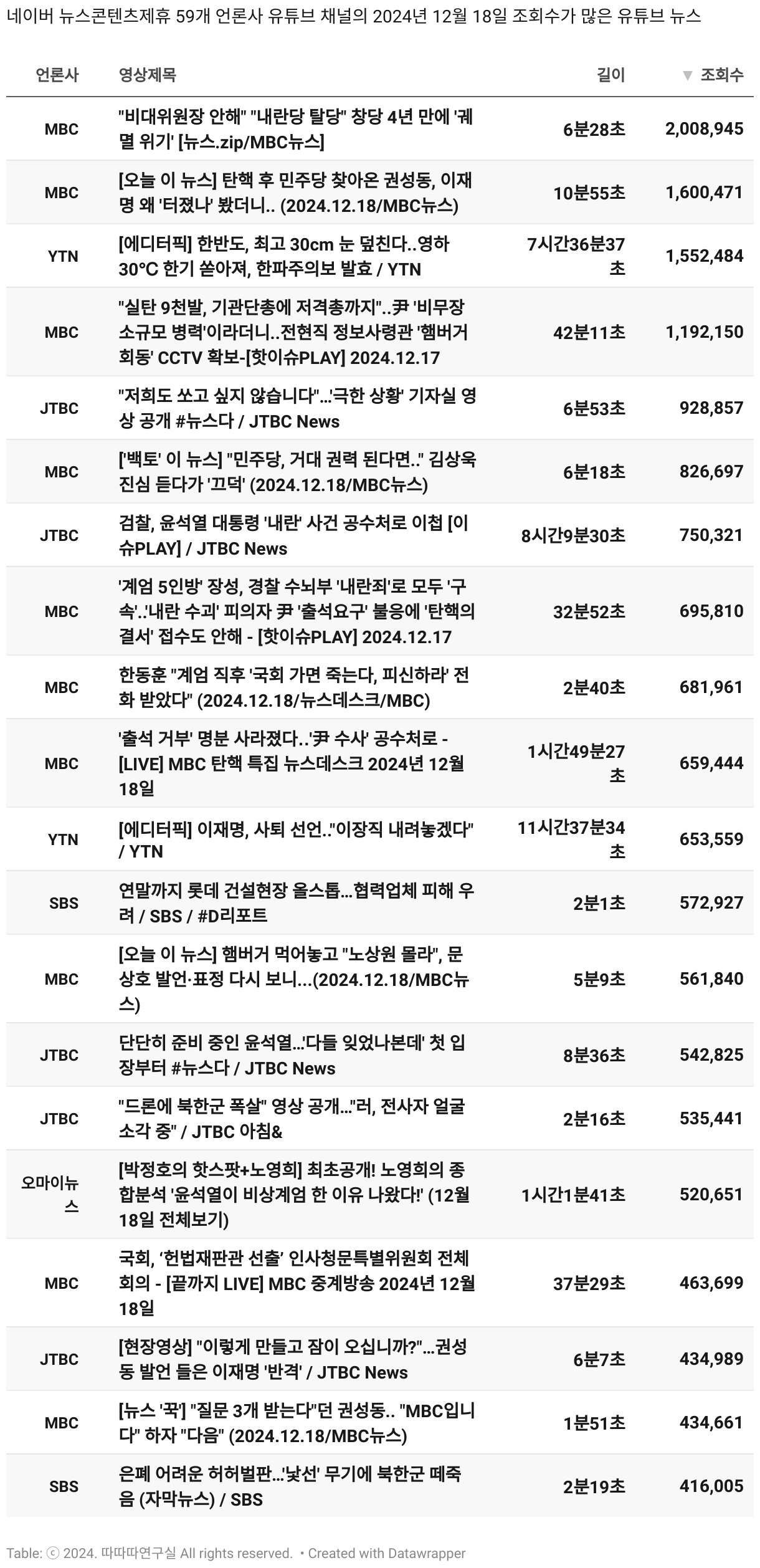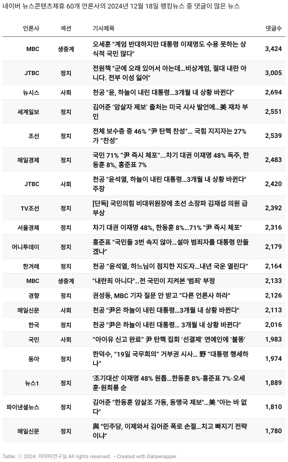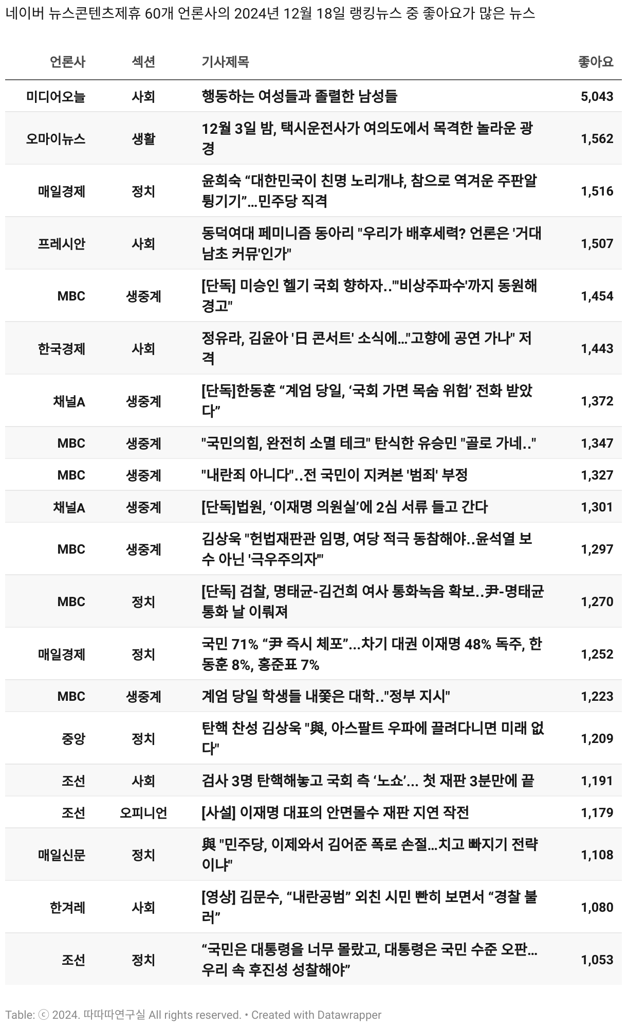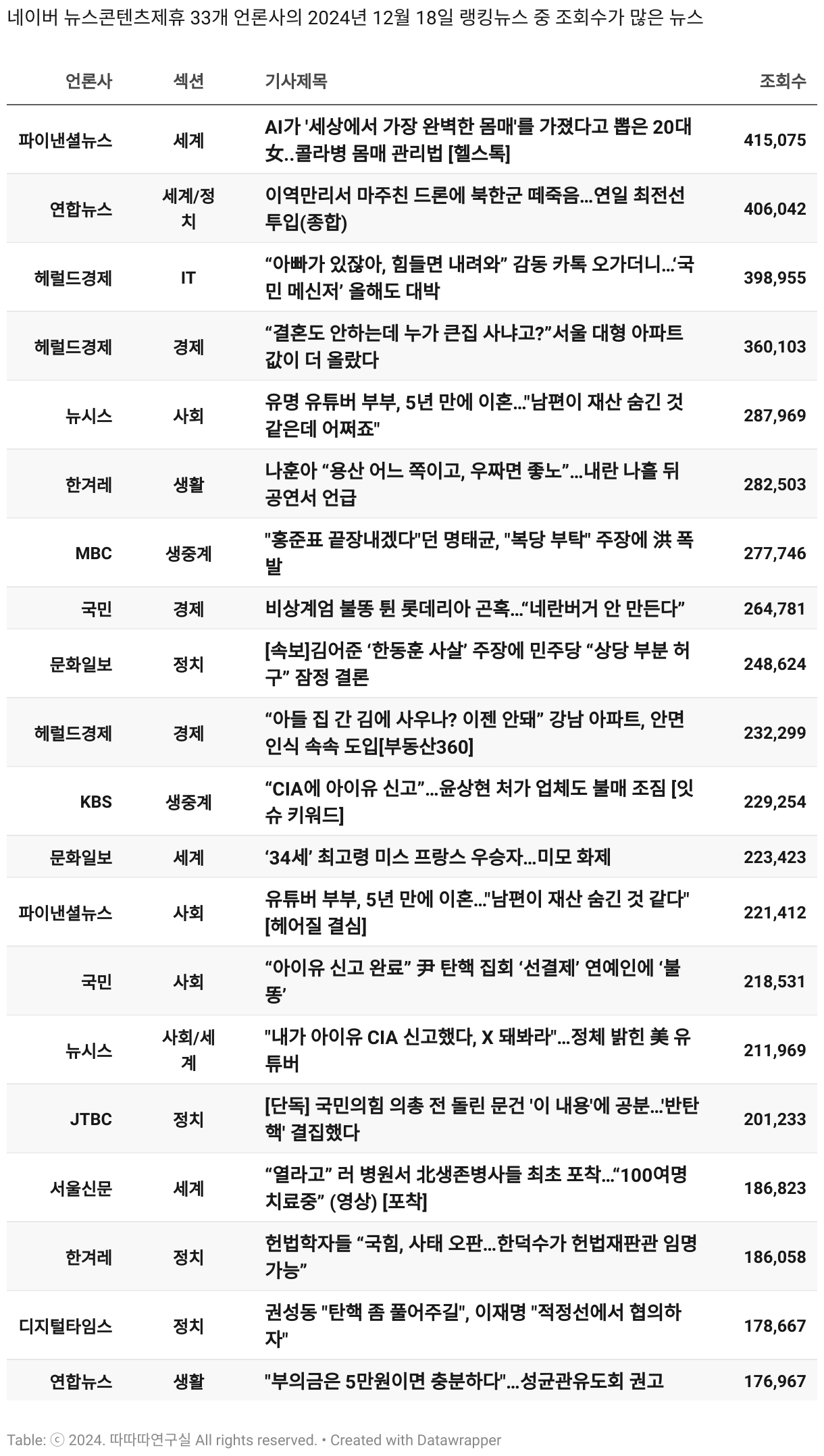 *데이터 수집 기간 : 2024년 6월 10일 *데이터 수집 대상 : 네이버 뉴스콘텐츠제휴 60개 언론사. 종합일간지 10개(경향신문, 국민일보, 동아일보, 문화일보, 서울신문, 세계일보, 조선일보, 중앙일보, 한겨레신문, 한국일보), 방송/통신사 14개(뉴스1, 뉴시스, 연합뉴스, 연합뉴스TV, 채널A, 한국경제TV, JTBC, KBS, MBC, MBN, SBS, SBS BIZ, TV조선, YTN), 경제지 11개(매일경제, 머니투데이, 비즈워치, 서울경제, 아시아경제, 이데일리, 조선비즈, 조세일보, 파이낸셜뉴스, 한국경제(유튜브제외), 헤럴드경제) 인터넷 8개(노컷뉴스, 더팩트, 데일리안, 머니S, 미디어오늘, 아이뉴스24, 오마이뉴스, 프레시안), IT 5개(디지털데일리,디지털타임스, 블로터, 전자신문, 지디넷코리아), 지역 12개(강원도민일보, 강원일보, 경기일보, 국제신문, 대구MBC, 대전일보, 매일신문, 부산일보, 전주MBC, CJB청주방송, JIBS, kbc광주방송)