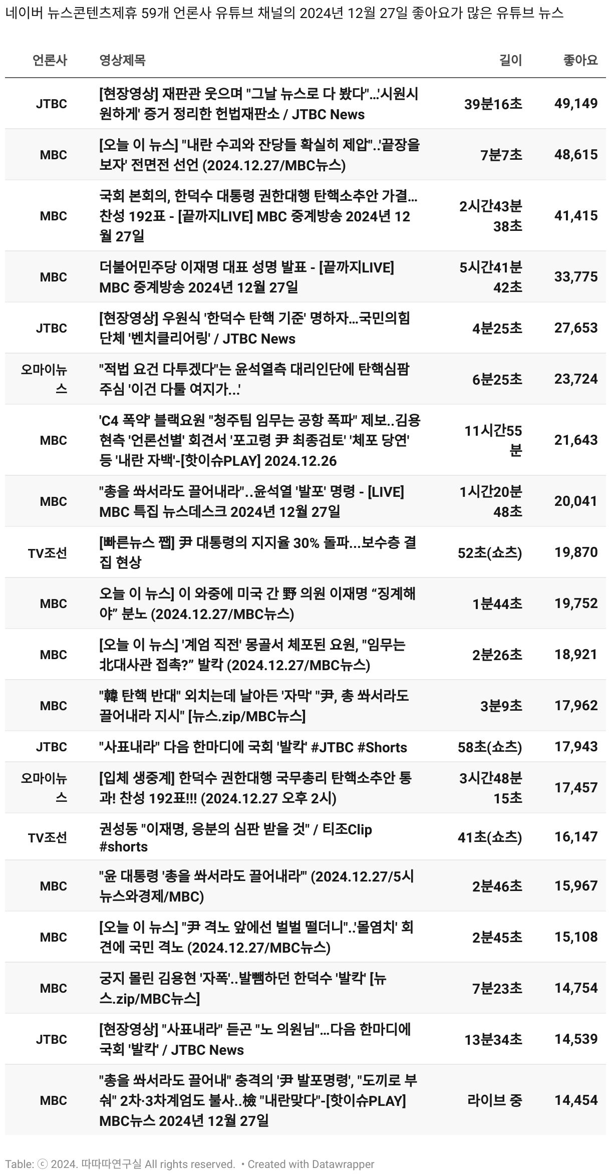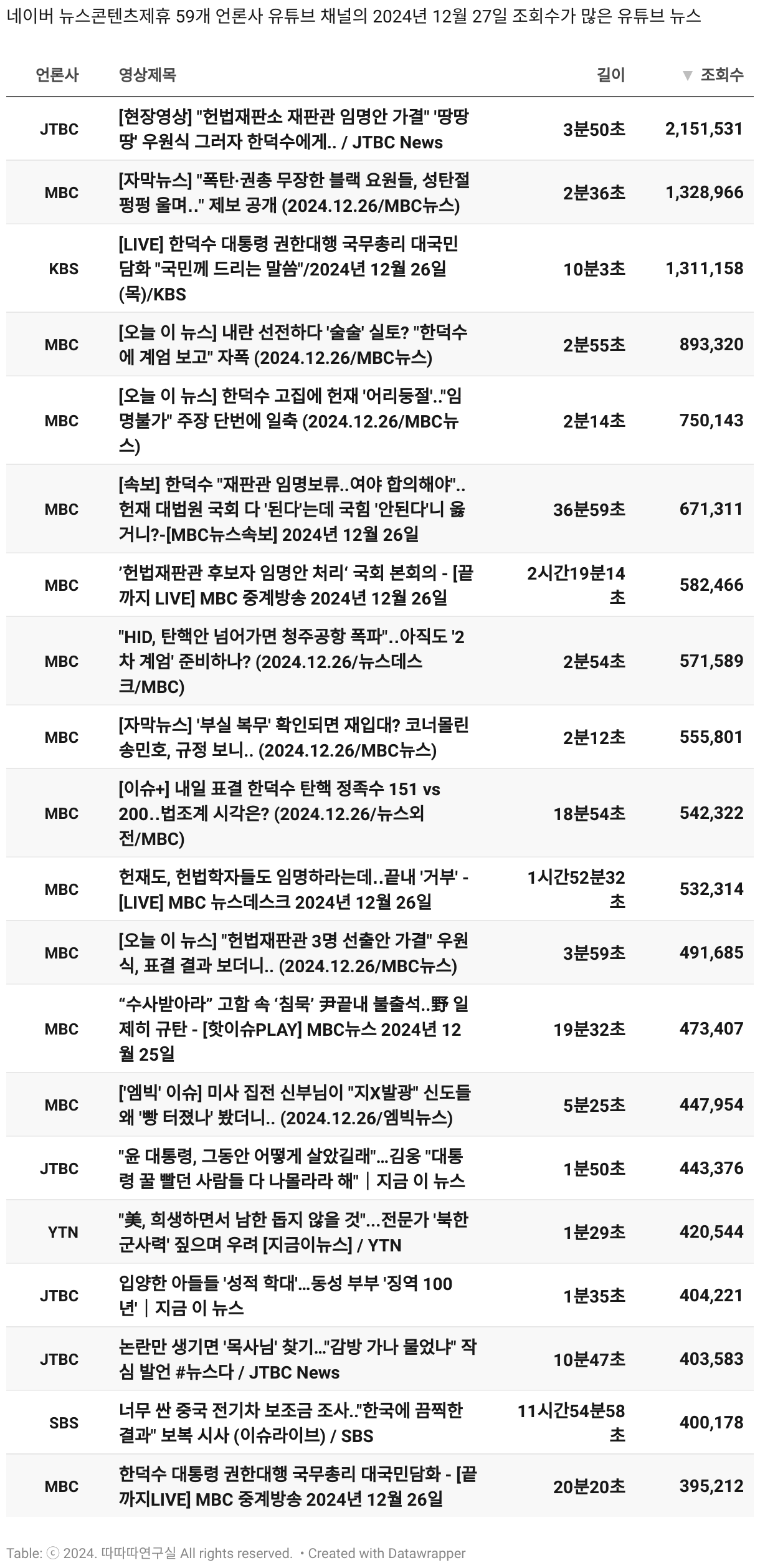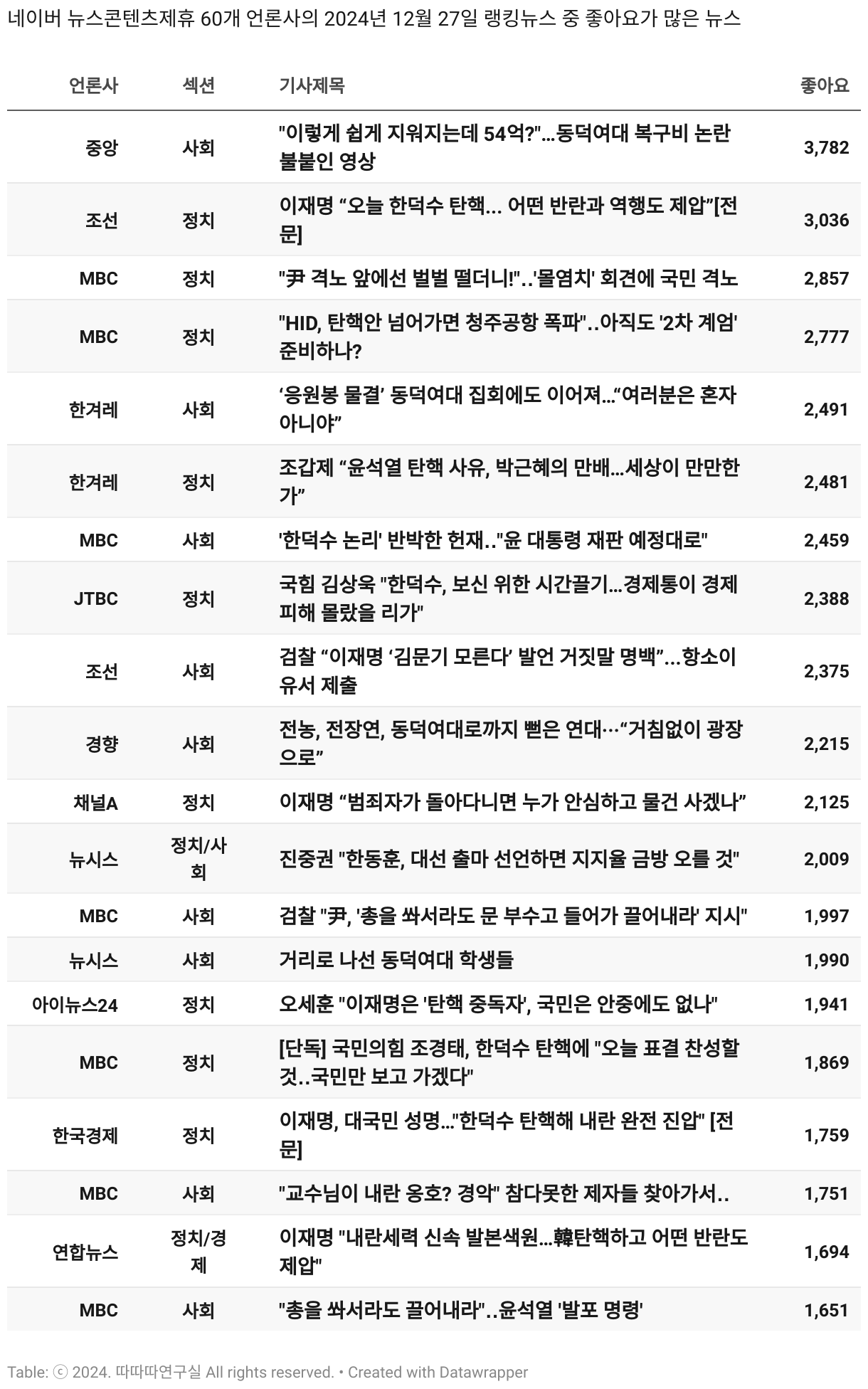 *데이터 수집 기간 : 2024년 6월 10일 *데이터 수집 대상 : 네이버 뉴스콘텐츠제휴 60개 언론사. 종합일간지 10개(경향신문, 국민일보, 동아일보, 문화일보, 서울신문, 세계일보, 조선일보, 중앙일보, 한겨레신문, 한국일보), 방송/통신사 14개(뉴스1, 뉴시스, 연합뉴스, 연합뉴스TV, 채널A, 한국경제TV, JTBC, KBS, MBC, MBN, SBS, SBS BIZ, TV조선, YTN), 경제지 11개(매일경제, 머니투데이, 비즈워치, 서울경제, 아시아경제, 이데일리, 조선비즈, 조세일보, 파이낸셜뉴스, 한국경제(유튜브제외), 헤럴드경제) 인터넷 8개(노컷뉴스, 더팩트, 데일리안, 머니S, 미디어오늘, 아이뉴스24, 오마이뉴스, 프레시안), IT 5개(디지털데일리,디지털타임스, 블로터, 전자신문, 지디넷코리아), 지역 12개(강원도민일보, 강원일보, 경기일보, 국제신문, 대구MBC, 대전일보, 매일신문, 부산일보, 전주MBC, CJB청주방송, JIBS, kbc광주방송)