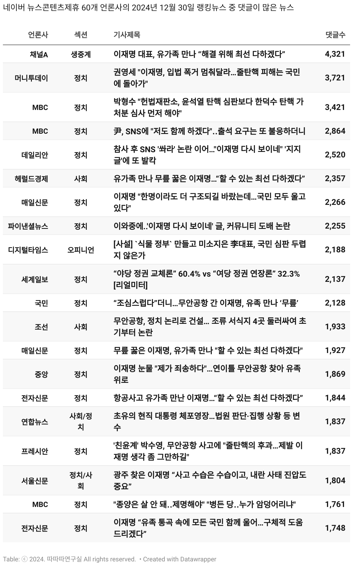 *데이터 수집 기간 : 2024년 6월 10일 *데이터 수집 대상 : 네이버 뉴스콘텐츠제휴 60개 언론사. 종합일간지 10개(경향신문, 국민일보, 동아일보, 문화일보, 서울신문, 세계일보, 조선일보, 중앙일보, 한겨레신문, 한국일보), 방송/통신사 14개(뉴스1, 뉴시스, 연합뉴스, 연합뉴스TV, 채널A, 한국경제TV, JTBC, KBS, MBC, MBN, SBS, SBS BIZ, TV조선, YTN), 경제지 11개(매일경제, 머니투데이, 비즈워치, 서울경제, 아시아경제, 이데일리, 조선비즈, 조세일보, 파이낸셜뉴스, 한국경제(유튜브제외), 헤럴드경제) 인터넷 8개(노컷뉴스, 더팩트, 데일리안, 머니S, 미디어오늘, 아이뉴스24, 오마이뉴스, 프레시안), IT 5개(디지털데일리,디지털타임스, 블로터, 전자신문, 지디넷코리아), 지역 12개(강원도민일보, 강원일보, 경기일보, 국제신문, 대구MBC, 대전일보, 매일신문, 부산일보, 전주MBC, CJB청주방송, JIBS, kbc광주방송)