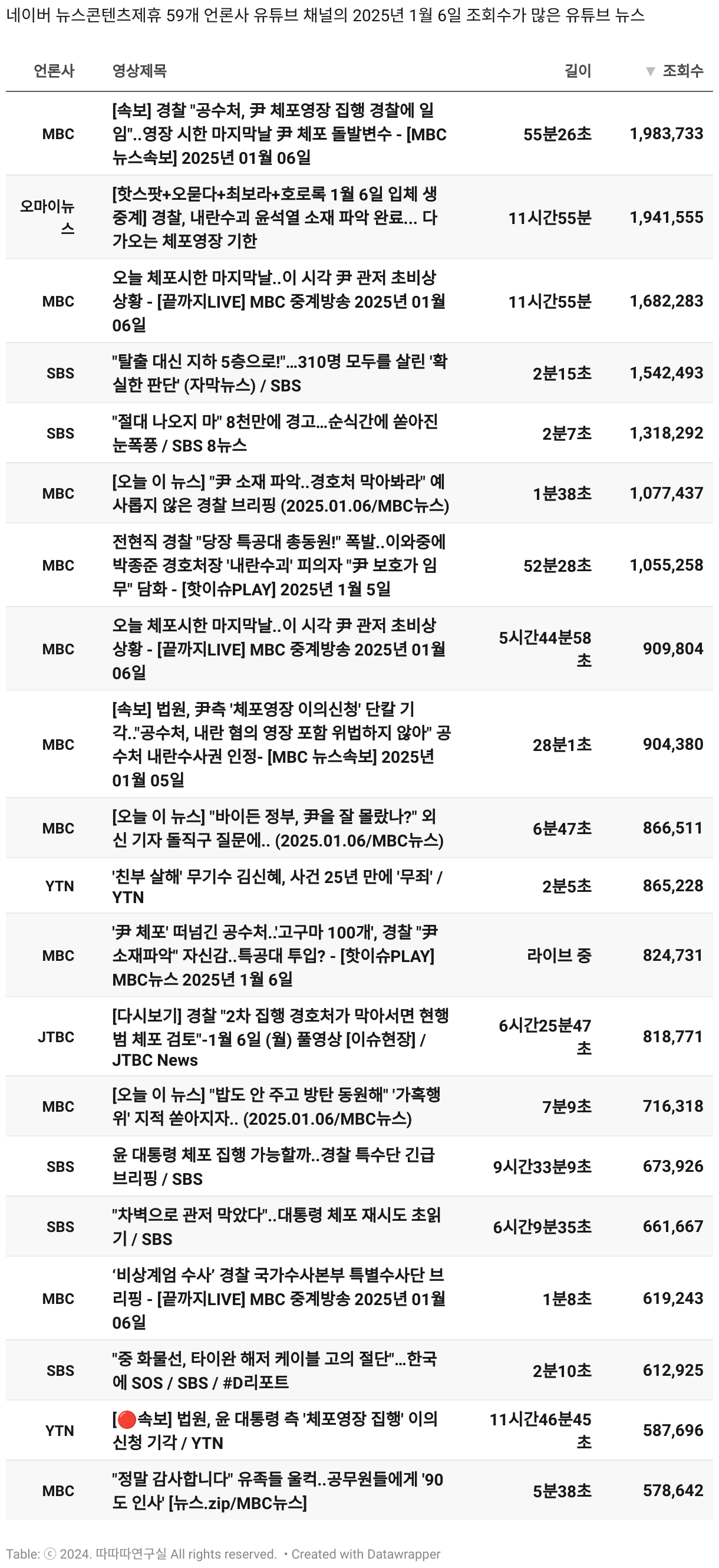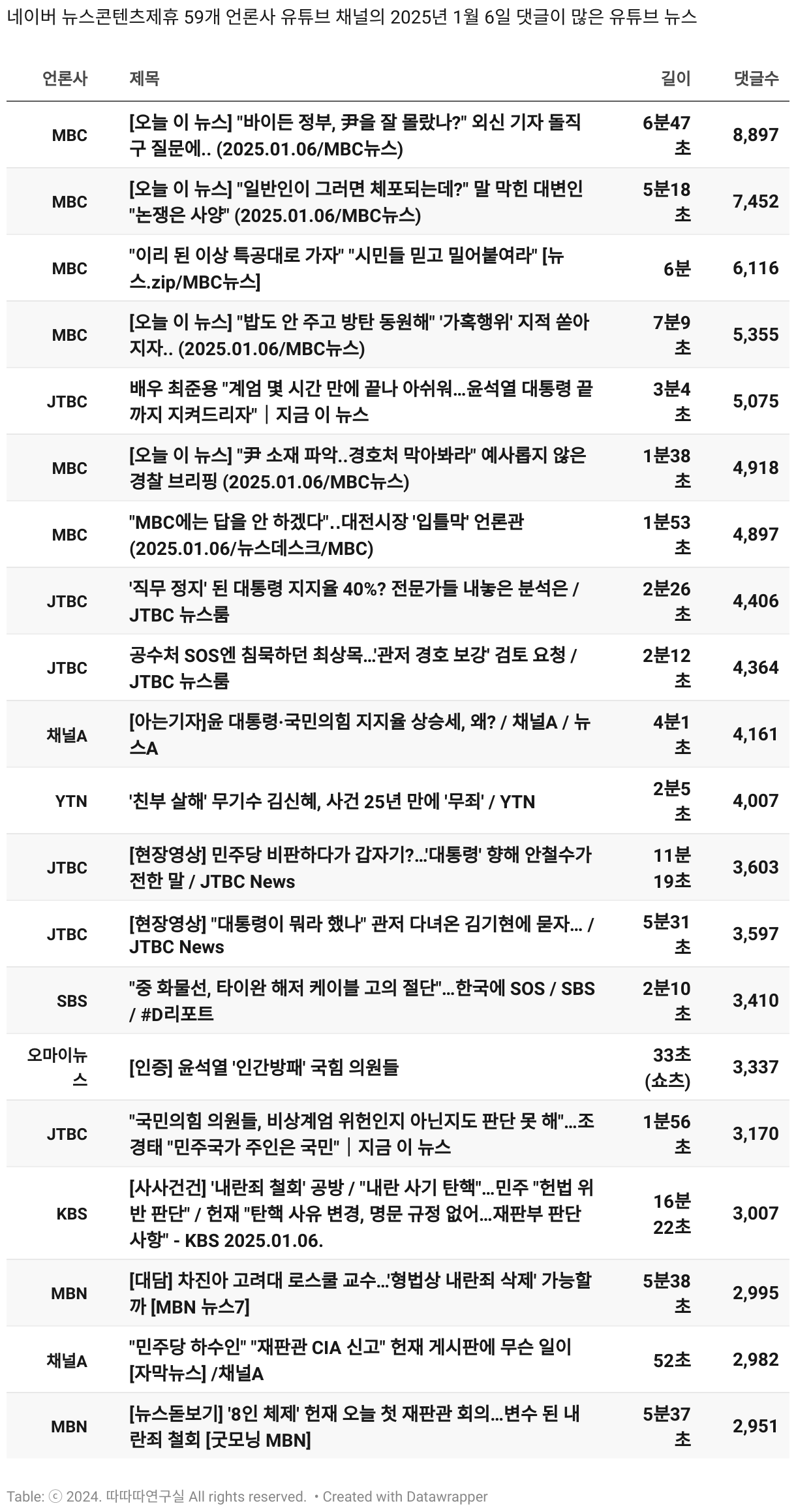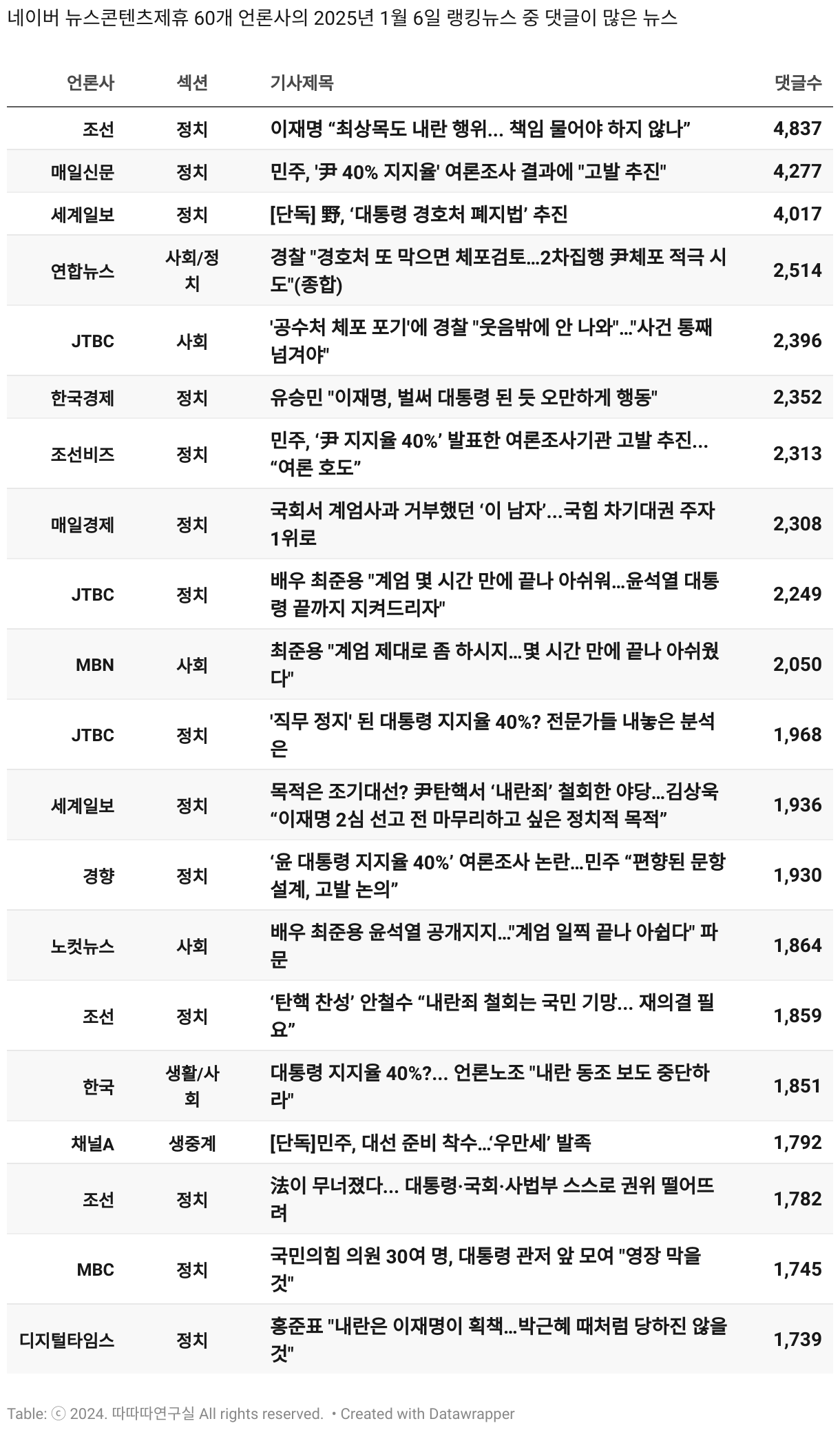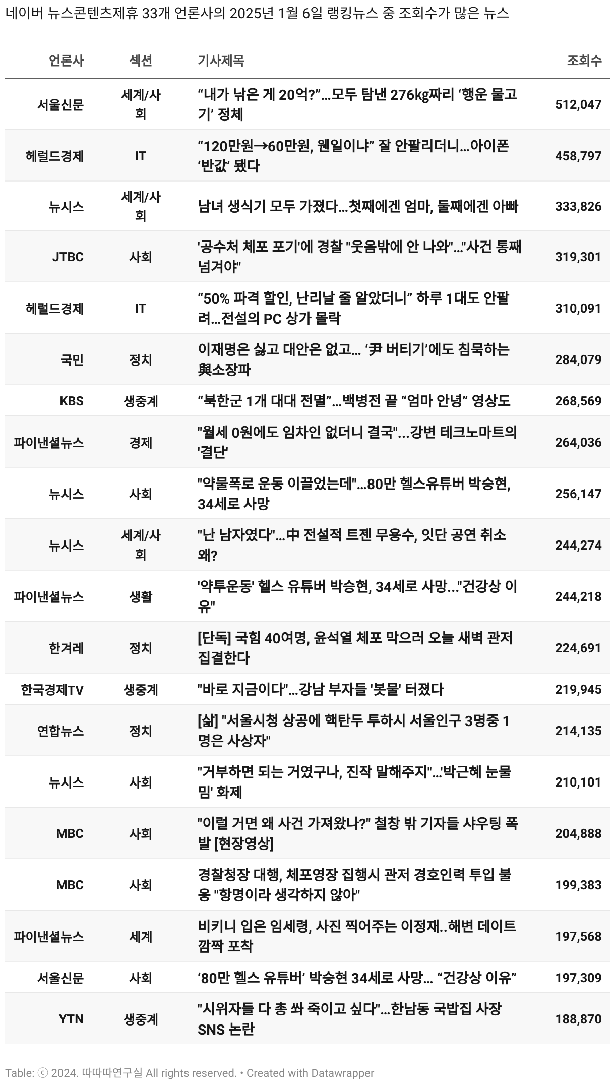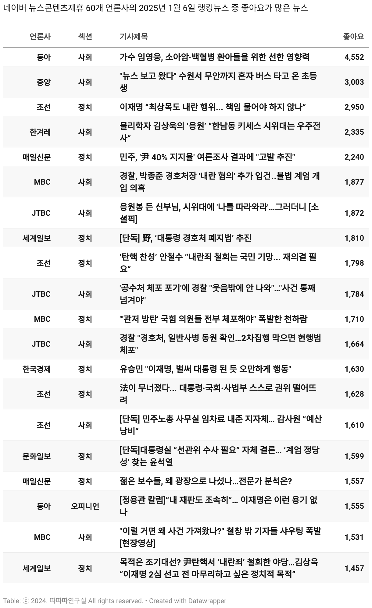 *데이터 수집 기간 : 2024년 6월 10일 *데이터 수집 대상 : 네이버 뉴스콘텐츠제휴 60개 언론사. 종합일간지 10개(경향신문, 국민일보, 동아일보, 문화일보, 서울신문, 세계일보, 조선일보, 중앙일보, 한겨레신문, 한국일보), 방송/통신사 14개(뉴스1, 뉴시스, 연합뉴스, 연합뉴스TV, 채널A, 한국경제TV, JTBC, KBS, MBC, MBN, SBS, SBS BIZ, TV조선, YTN), 경제지 11개(매일경제, 머니투데이, 비즈워치, 서울경제, 아시아경제, 이데일리, 조선비즈, 조세일보, 파이낸셜뉴스, 한국경제(유튜브제외), 헤럴드경제) 인터넷 8개(노컷뉴스, 더팩트, 데일리안, 머니S, 미디어오늘, 아이뉴스24, 오마이뉴스, 프레시안), IT 5개(디지털데일리,디지털타임스, 블로터, 전자신문, 지디넷코리아), 지역 12개(강원도민일보, 강원일보, 경기일보, 국제신문, 대구MBC, 대전일보, 매일신문, 부산일보, 전주MBC, CJB청주방송, JIBS, kbc광주방송)