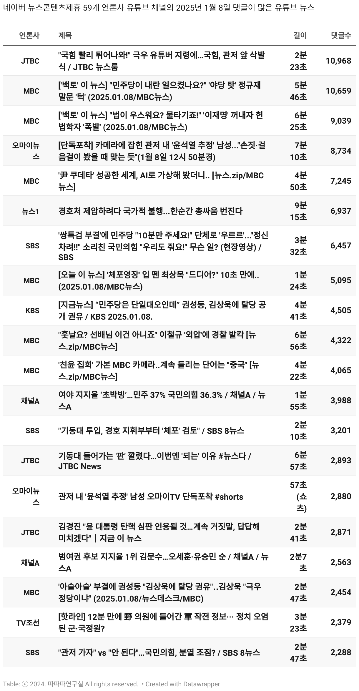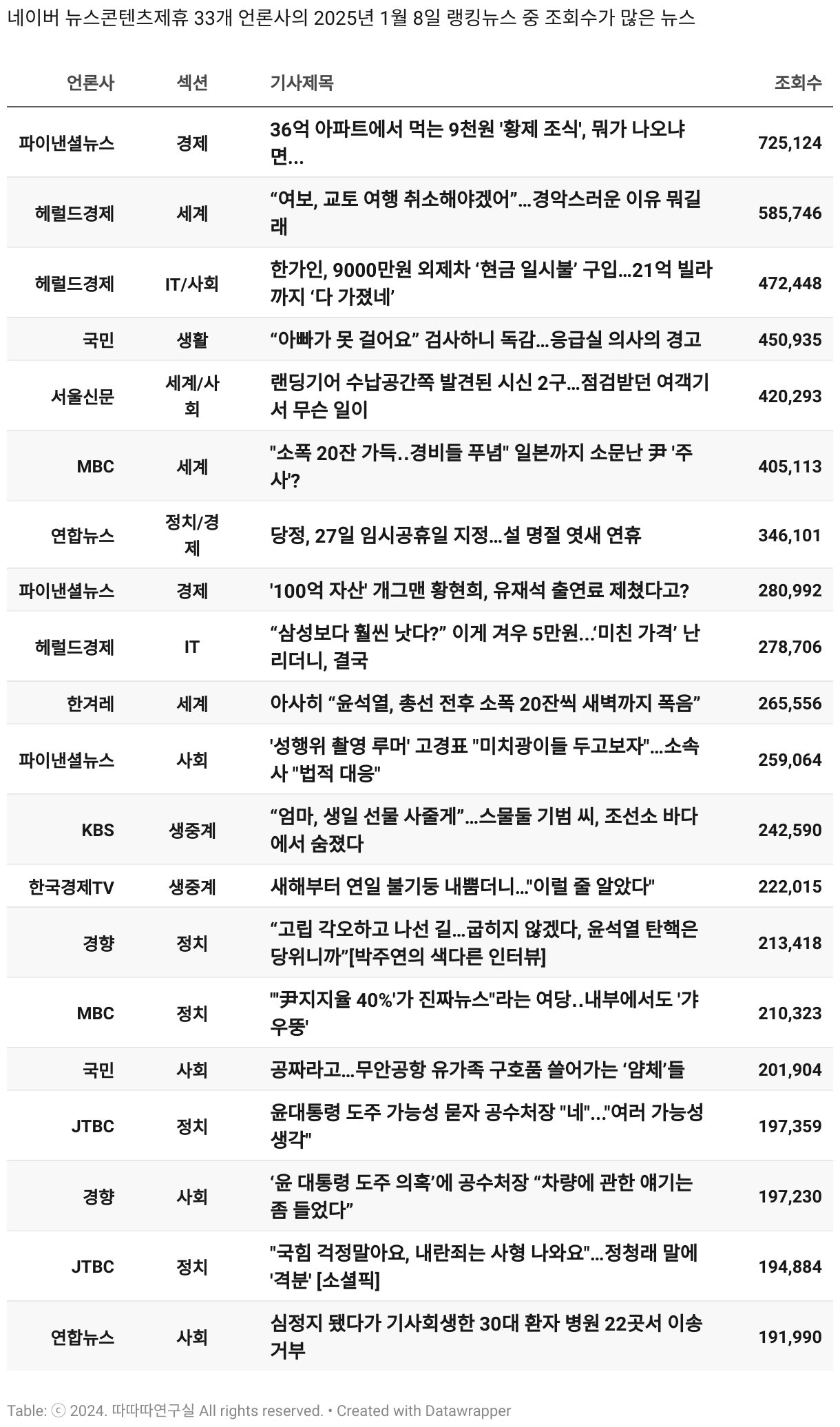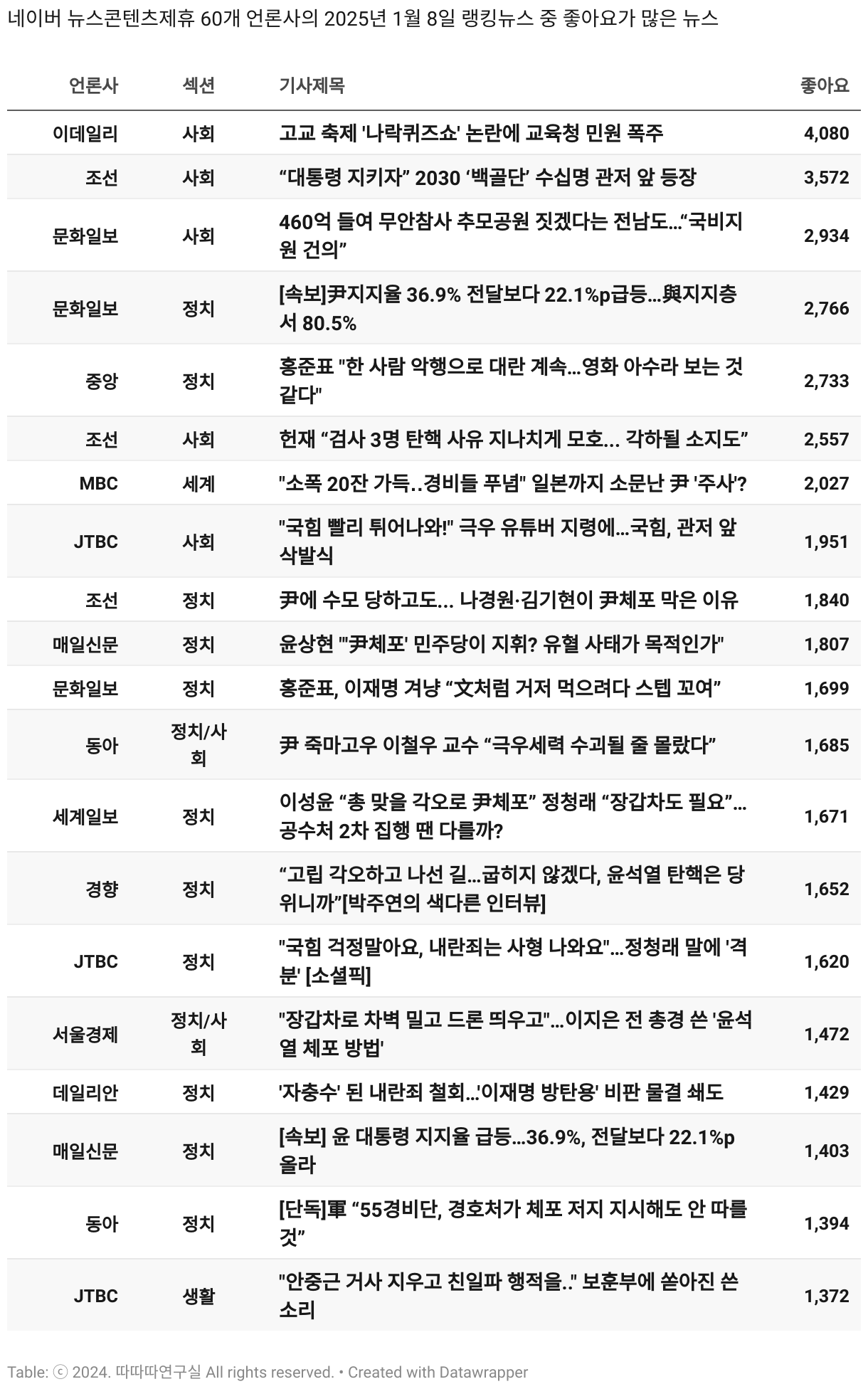 *데이터 수집 기간 : 2024년 6월 10일 *데이터 수집 대상 : 네이버 뉴스콘텐츠제휴 60개 언론사. 종합일간지 10개(경향신문, 국민일보, 동아일보, 문화일보, 서울신문, 세계일보, 조선일보, 중앙일보, 한겨레신문, 한국일보), 방송/통신사 14개(뉴스1, 뉴시스, 연합뉴스, 연합뉴스TV, 채널A, 한국경제TV, JTBC, KBS, MBC, MBN, SBS, SBS BIZ, TV조선, YTN), 경제지 11개(매일경제, 머니투데이, 비즈워치, 서울경제, 아시아경제, 이데일리, 조선비즈, 조세일보, 파이낸셜뉴스, 한국경제(유튜브제외), 헤럴드경제) 인터넷 8개(노컷뉴스, 더팩트, 데일리안, 머니S, 미디어오늘, 아이뉴스24, 오마이뉴스, 프레시안), IT 5개(디지털데일리,디지털타임스, 블로터, 전자신문, 지디넷코리아), 지역 12개(강원도민일보, 강원일보, 경기일보, 국제신문, 대구MBC, 대전일보, 매일신문, 부산일보, 전주MBC, CJB청주방송, JIBS, kbc광주방송)