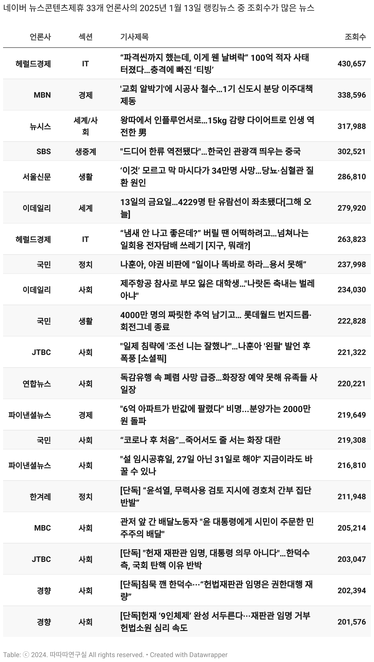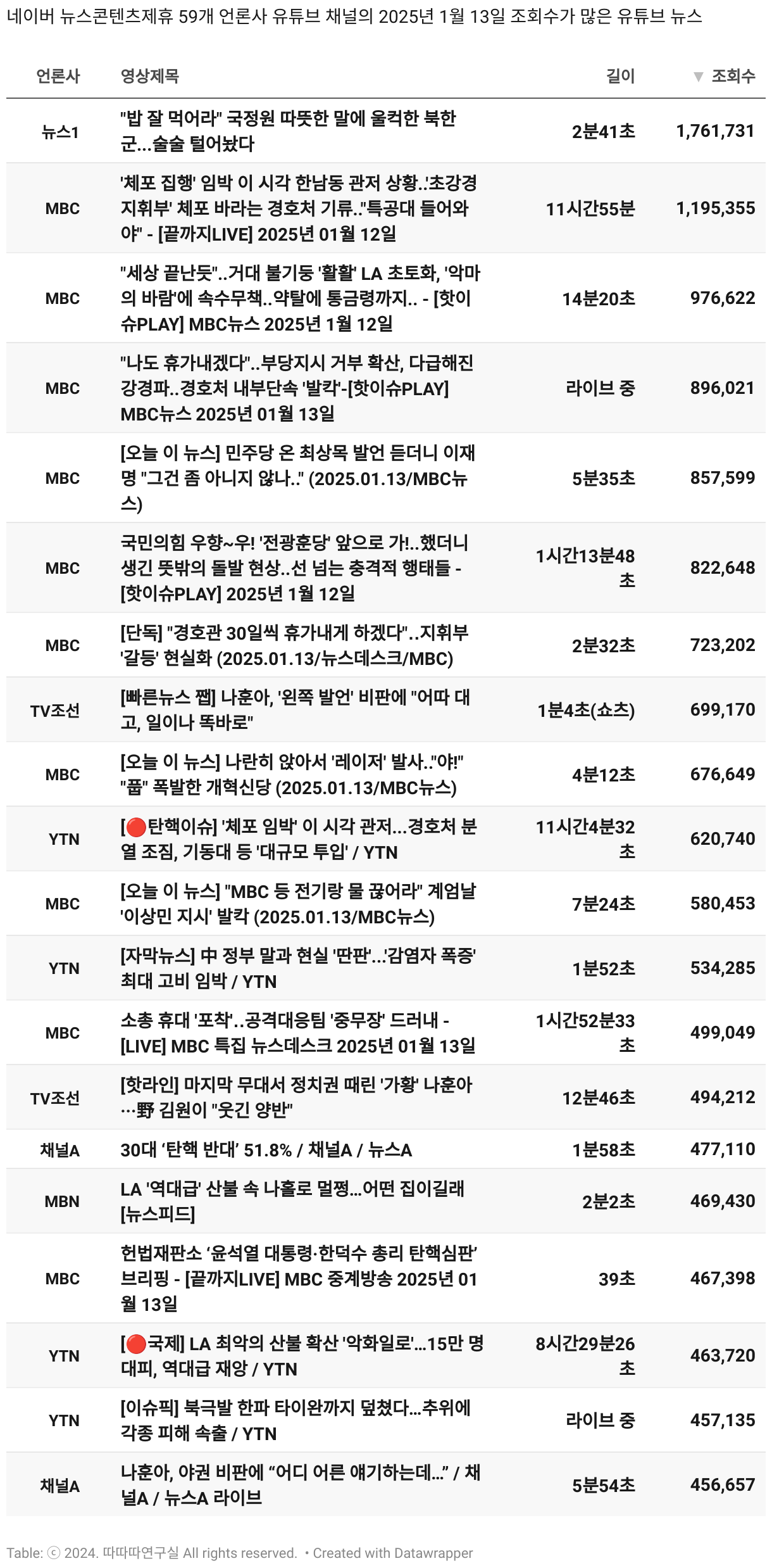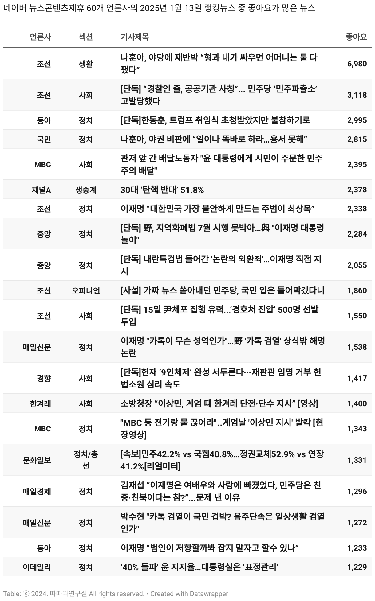 *데이터 수집 기간 : 2024년 6월 10일 *데이터 수집 대상 : 네이버 뉴스콘텐츠제휴 60개 언론사. 종합일간지 10개(경향신문, 국민일보, 동아일보, 문화일보, 서울신문, 세계일보, 조선일보, 중앙일보, 한겨레신문, 한국일보), 방송/통신사 14개(뉴스1, 뉴시스, 연합뉴스, 연합뉴스TV, 채널A, 한국경제TV, JTBC, KBS, MBC, MBN, SBS, SBS BIZ, TV조선, YTN), 경제지 11개(매일경제, 머니투데이, 비즈워치, 서울경제, 아시아경제, 이데일리, 조선비즈, 조세일보, 파이낸셜뉴스, 한국경제(유튜브제외), 헤럴드경제) 인터넷 8개(노컷뉴스, 더팩트, 데일리안, 머니S, 미디어오늘, 아이뉴스24, 오마이뉴스, 프레시안), IT 5개(디지털데일리,디지털타임스, 블로터, 전자신문, 지디넷코리아), 지역 12개(강원도민일보, 강원일보, 경기일보, 국제신문, 대구MBC, 대전일보, 매일신문, 부산일보, 전주MBC, CJB청주방송, JIBS, kbc광주방송)