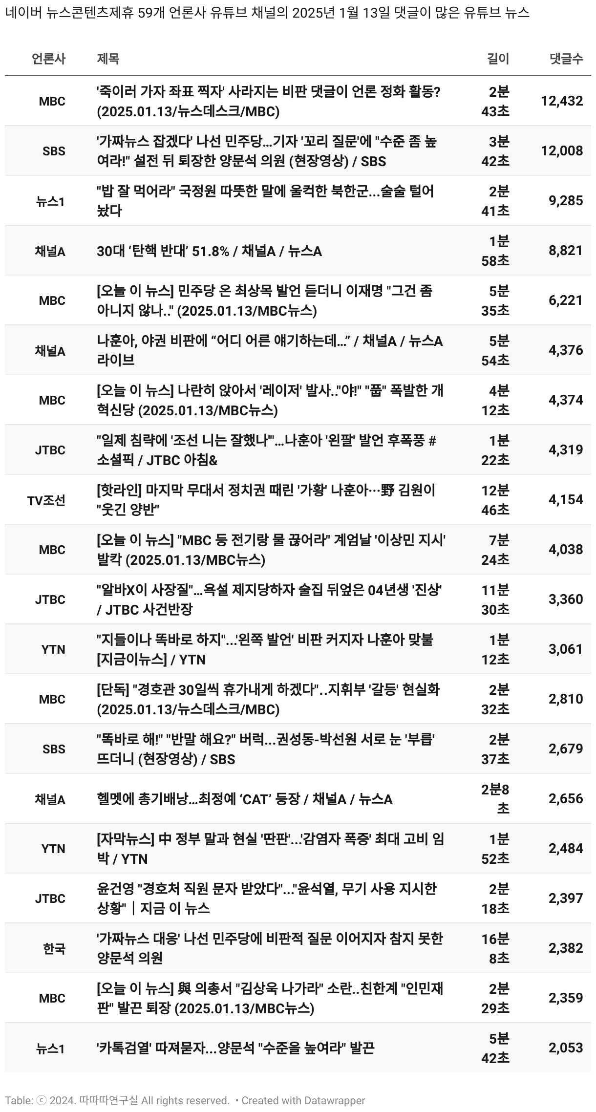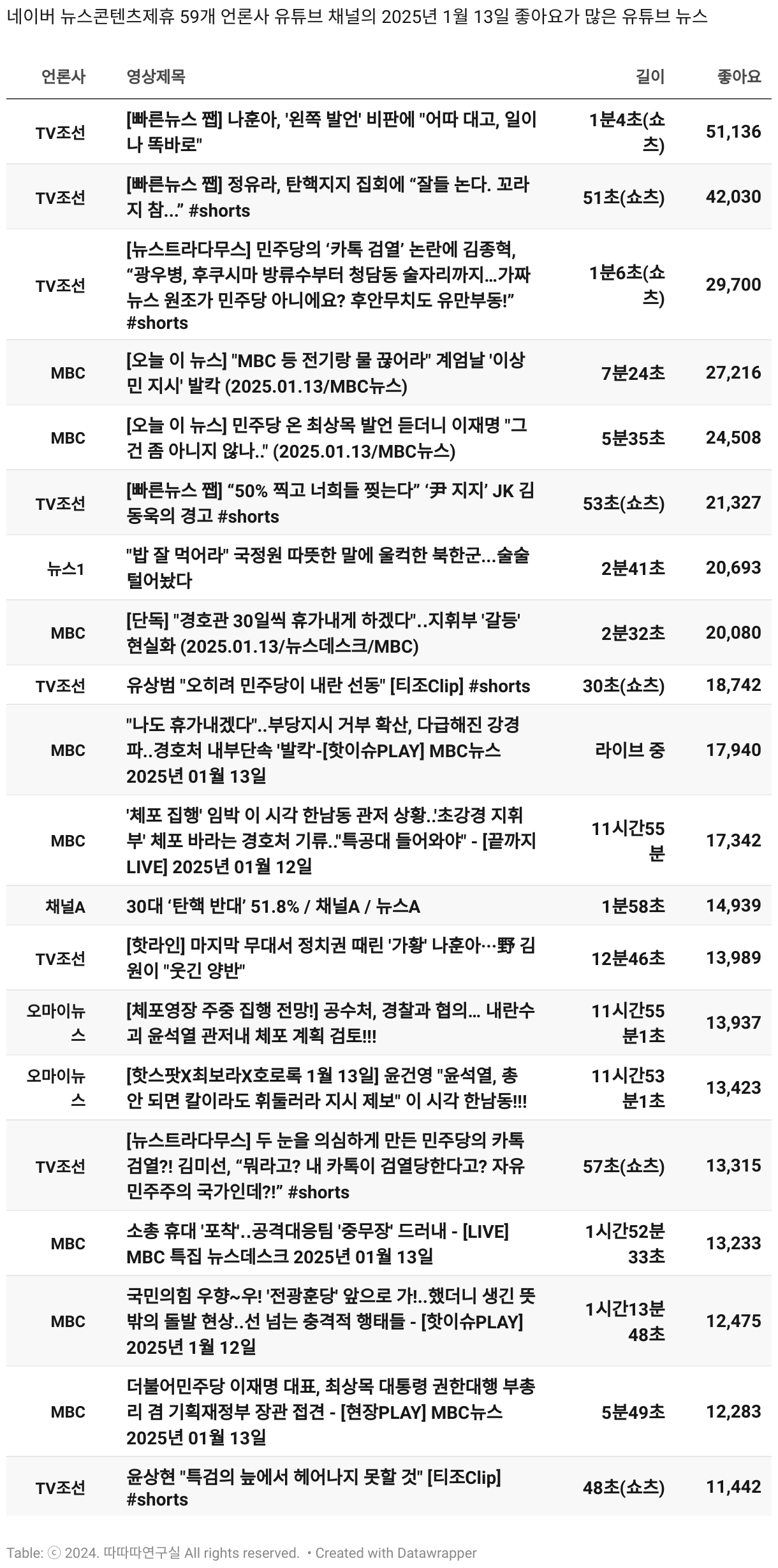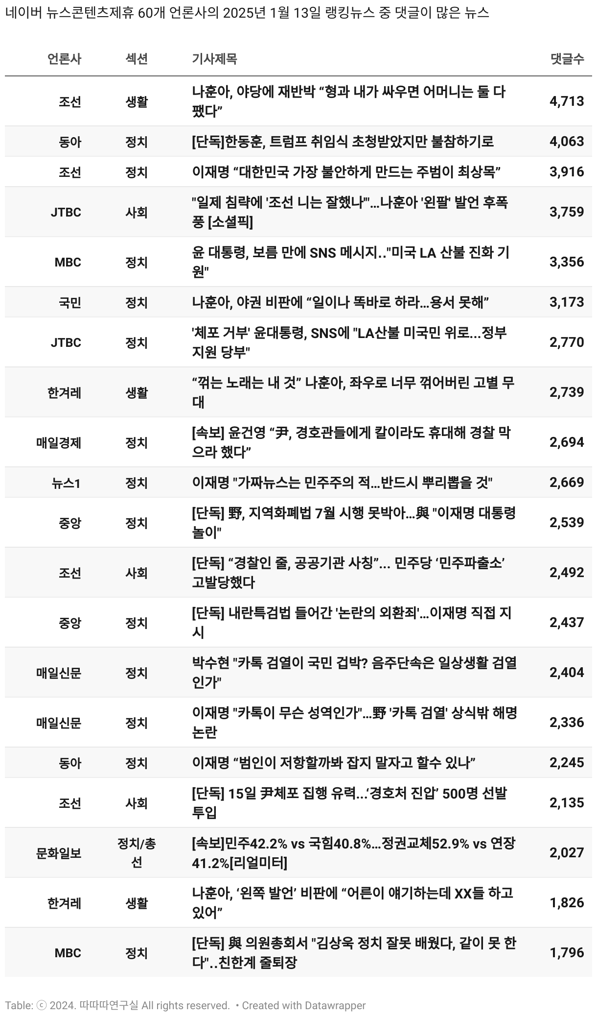 *데이터 수집 기간 : 2024년 6월 10일 *데이터 수집 대상 : 네이버 뉴스콘텐츠제휴 60개 언론사. 종합일간지 10개(경향신문, 국민일보, 동아일보, 문화일보, 서울신문, 세계일보, 조선일보, 중앙일보, 한겨레신문, 한국일보), 방송/통신사 14개(뉴스1, 뉴시스, 연합뉴스, 연합뉴스TV, 채널A, 한국경제TV, JTBC, KBS, MBC, MBN, SBS, SBS BIZ, TV조선, YTN), 경제지 11개(매일경제, 머니투데이, 비즈워치, 서울경제, 아시아경제, 이데일리, 조선비즈, 조세일보, 파이낸셜뉴스, 한국경제(유튜브제외), 헤럴드경제) 인터넷 8개(노컷뉴스, 더팩트, 데일리안, 머니S, 미디어오늘, 아이뉴스24, 오마이뉴스, 프레시안), IT 5개(디지털데일리,디지털타임스, 블로터, 전자신문, 지디넷코리아), 지역 12개(강원도민일보, 강원일보, 경기일보, 국제신문, 대구MBC, 대전일보, 매일신문, 부산일보, 전주MBC, CJB청주방송, JIBS, kbc광주방송)