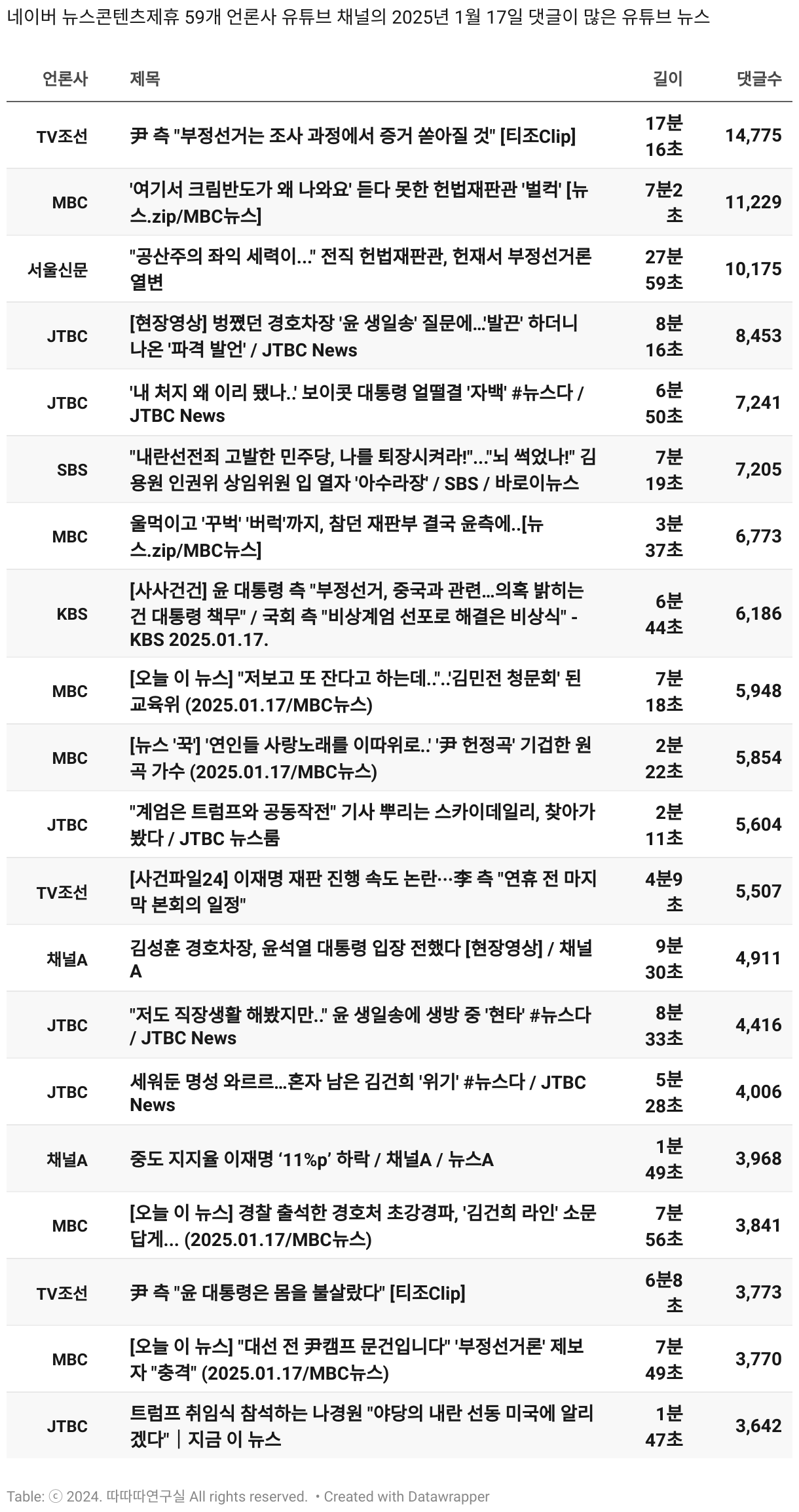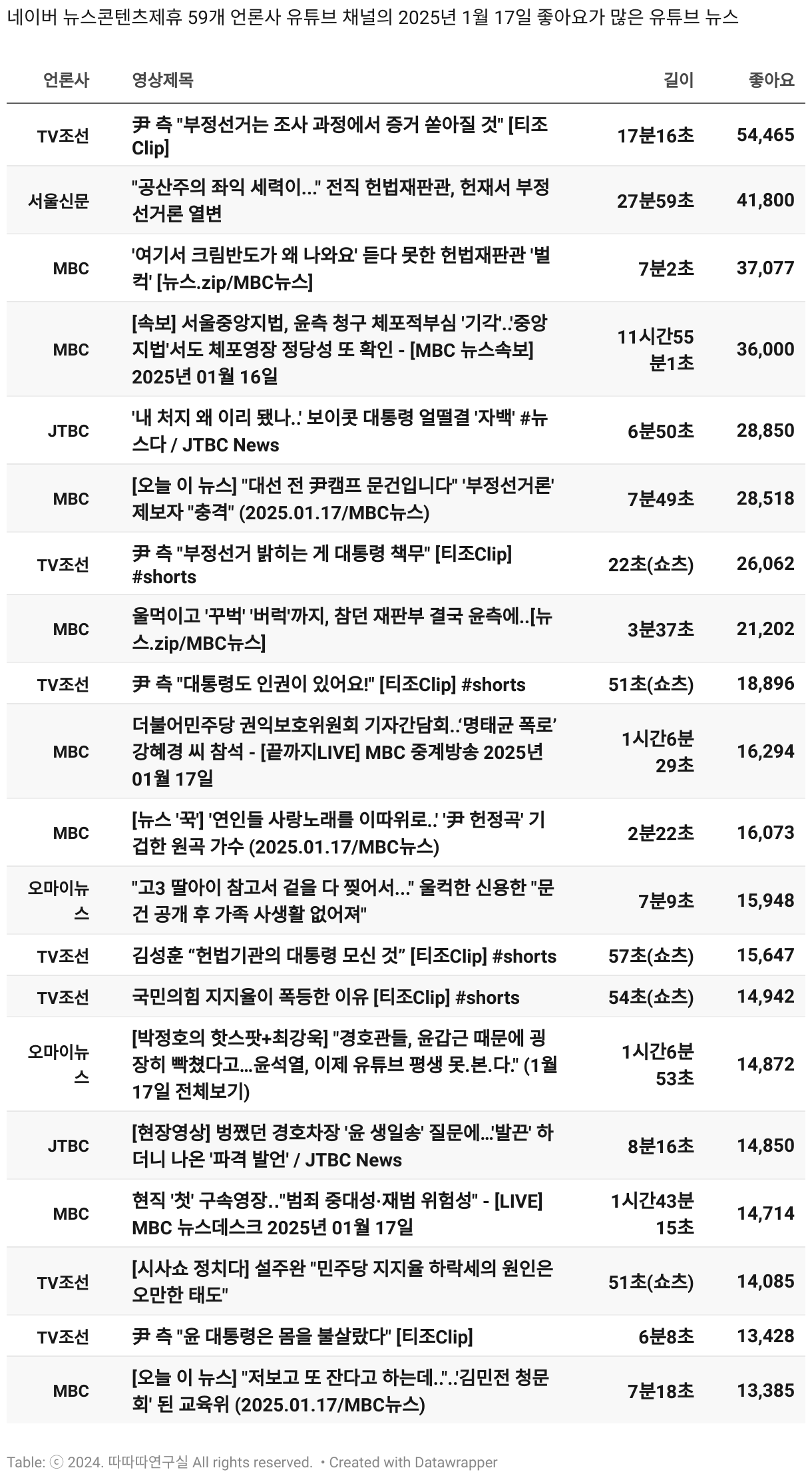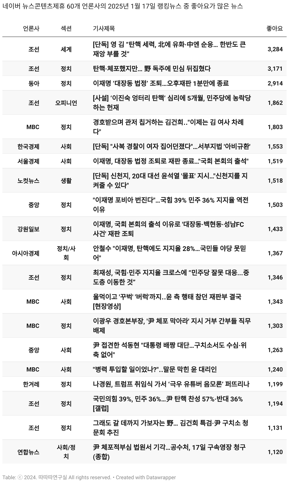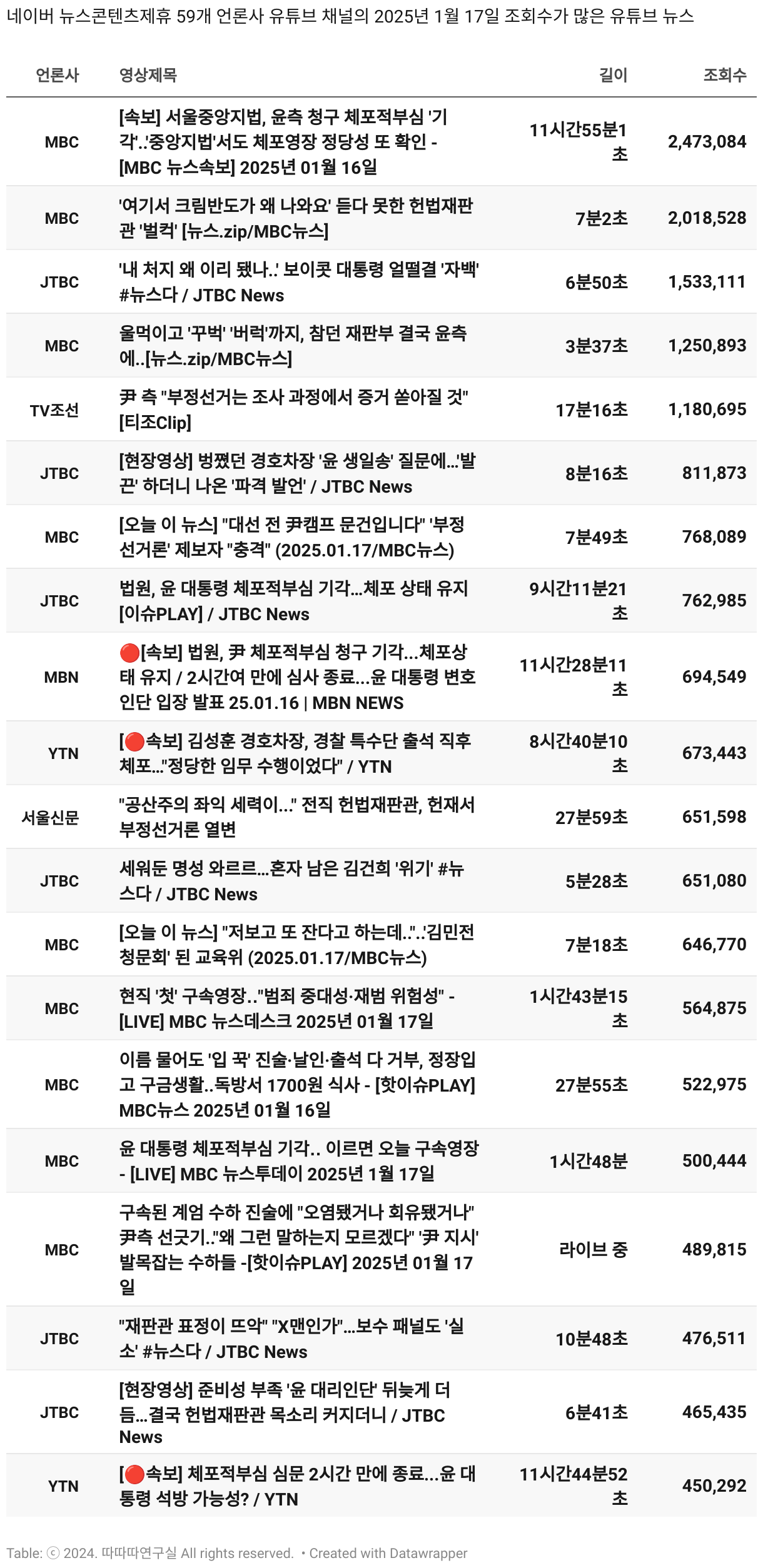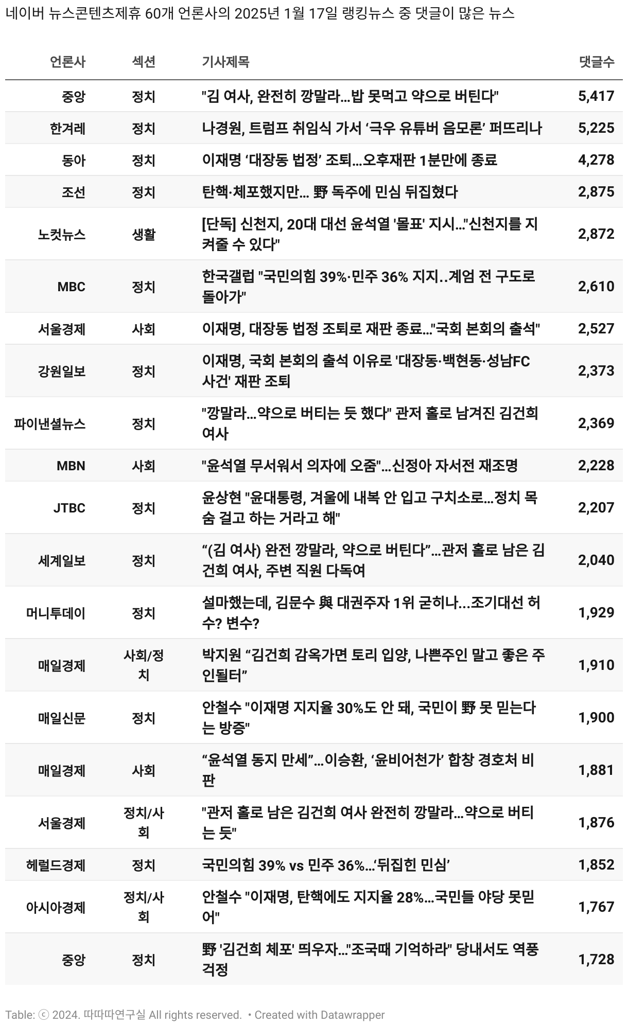 *데이터 수집 기간 : 2024년 6월 10일 *데이터 수집 대상 : 네이버 뉴스콘텐츠제휴 60개 언론사. 종합일간지 10개(경향신문, 국민일보, 동아일보, 문화일보, 서울신문, 세계일보, 조선일보, 중앙일보, 한겨레신문, 한국일보), 방송/통신사 14개(뉴스1, 뉴시스, 연합뉴스, 연합뉴스TV, 채널A, 한국경제TV, JTBC, KBS, MBC, MBN, SBS, SBS BIZ, TV조선, YTN), 경제지 11개(매일경제, 머니투데이, 비즈워치, 서울경제, 아시아경제, 이데일리, 조선비즈, 조세일보, 파이낸셜뉴스, 한국경제(유튜브제외), 헤럴드경제) 인터넷 8개(노컷뉴스, 더팩트, 데일리안, 머니S, 미디어오늘, 아이뉴스24, 오마이뉴스, 프레시안), IT 5개(디지털데일리,디지털타임스, 블로터, 전자신문, 지디넷코리아), 지역 12개(강원도민일보, 강원일보, 경기일보, 국제신문, 대구MBC, 대전일보, 매일신문, 부산일보, 전주MBC, CJB청주방송, JIBS, kbc광주방송)
