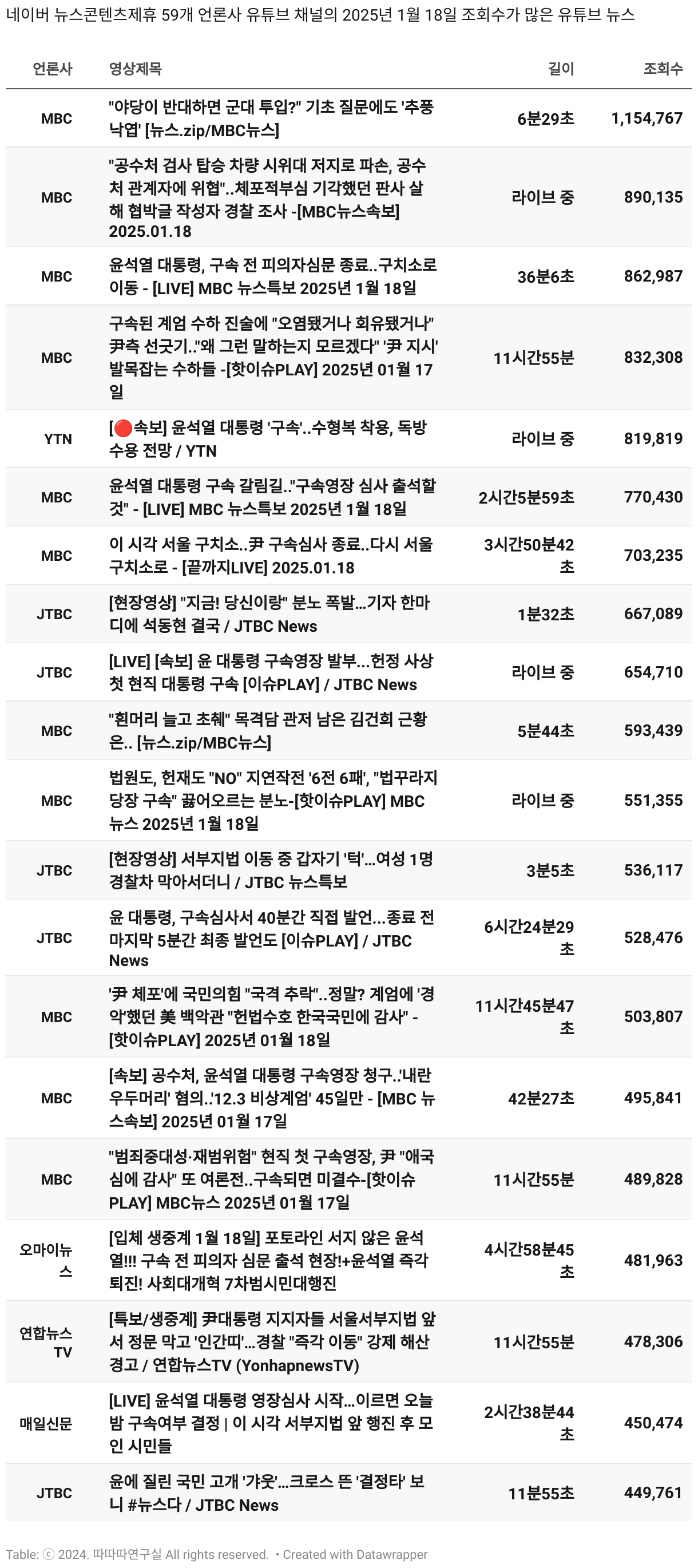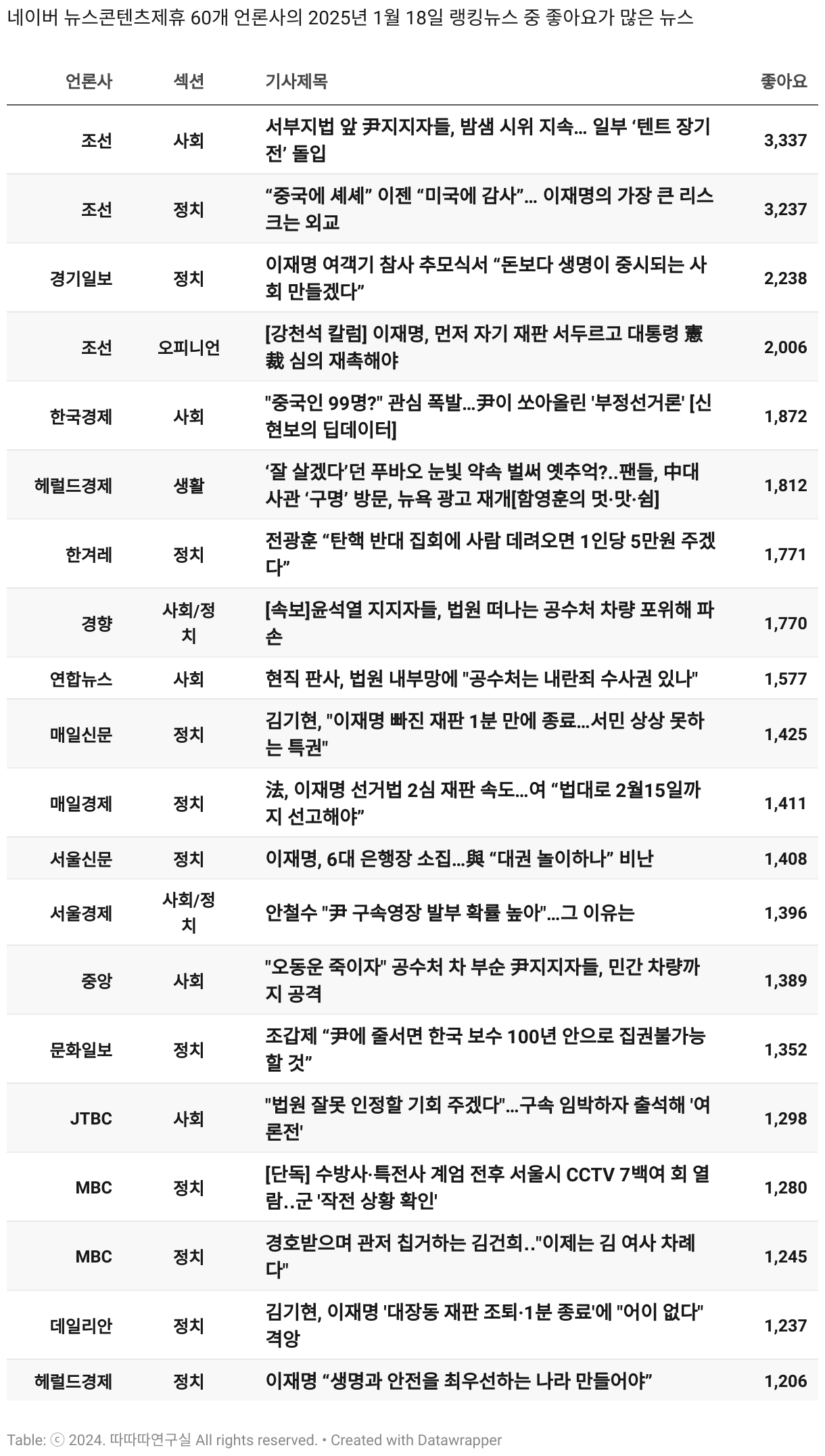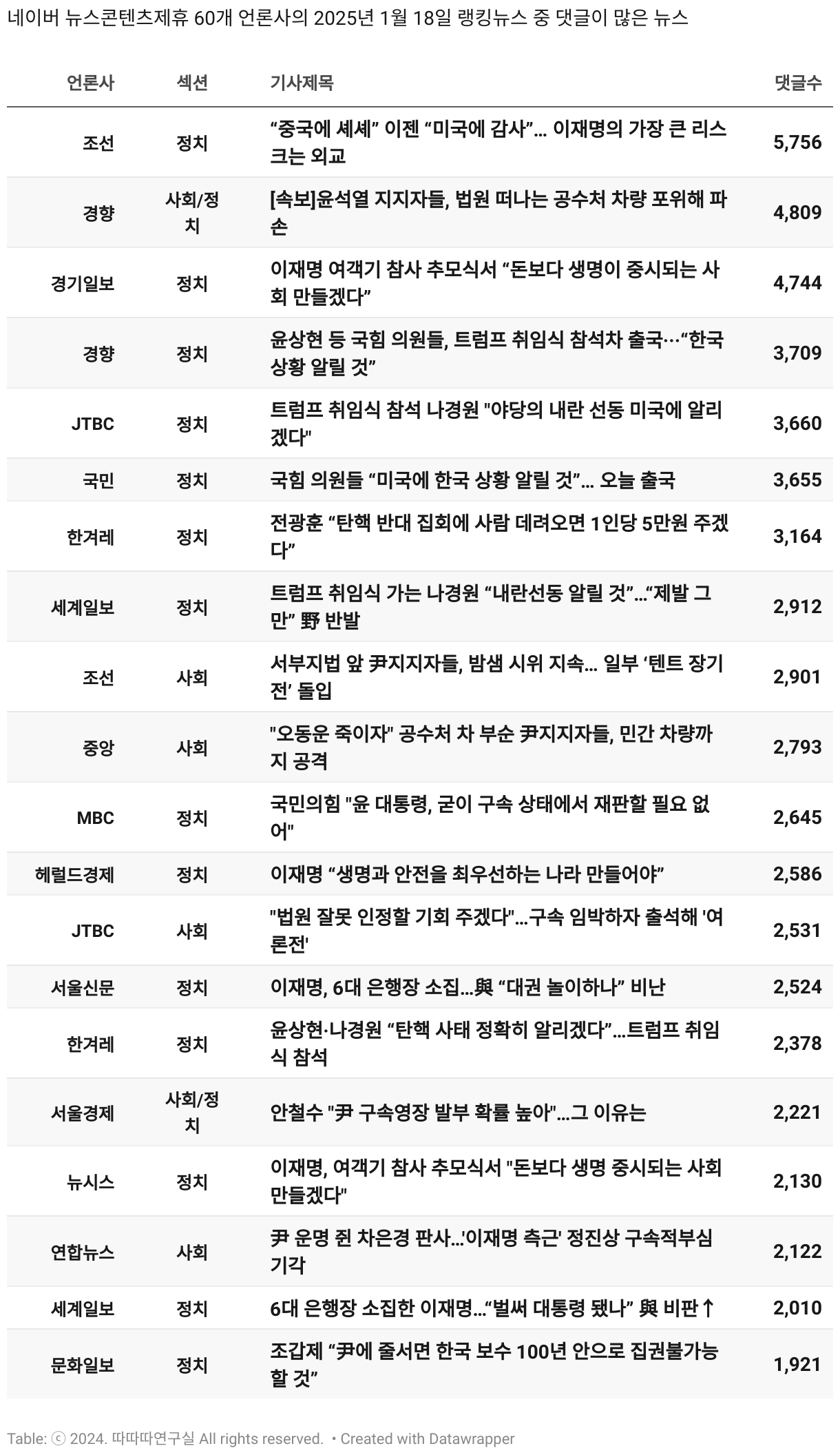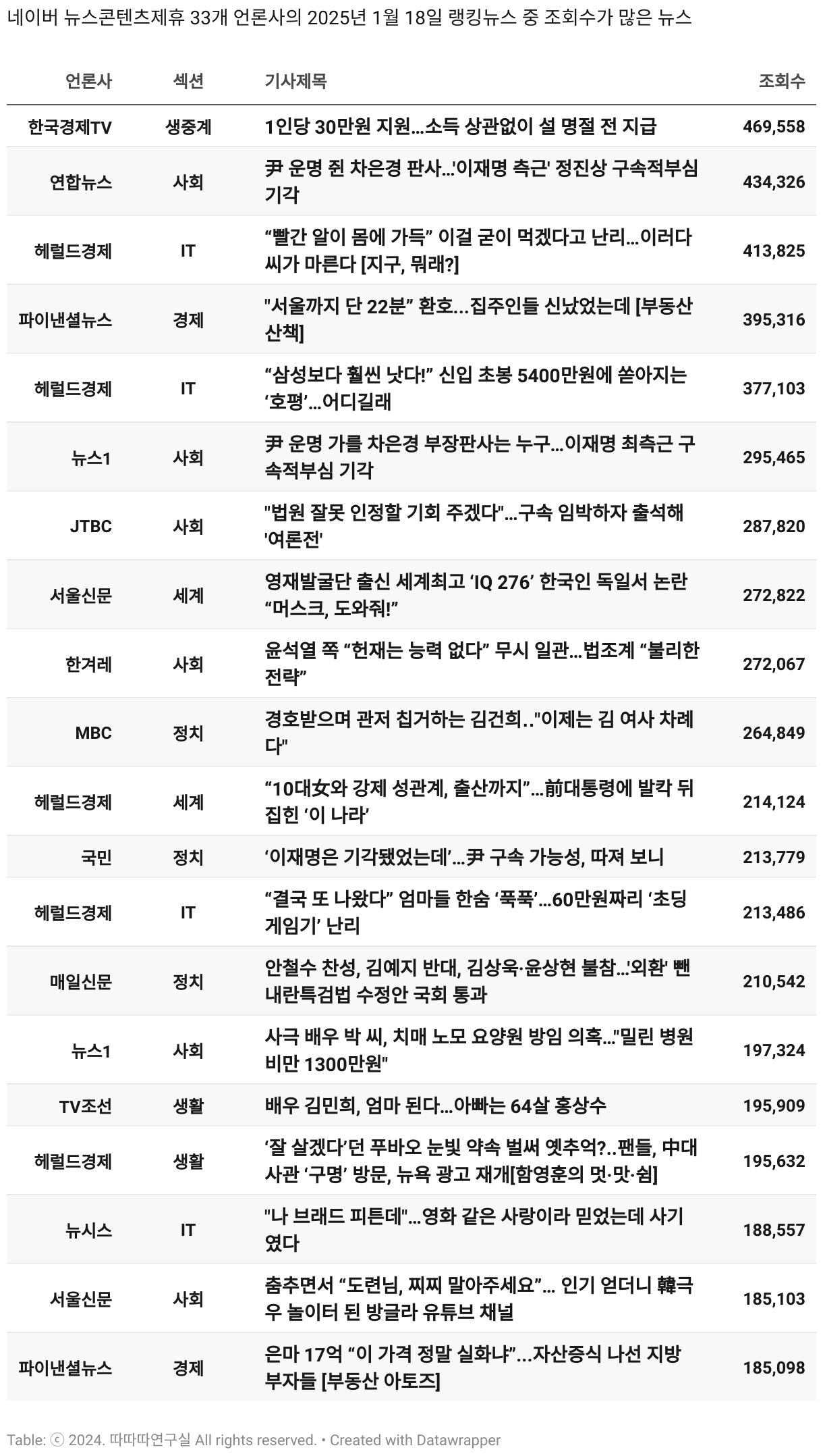 *데이터 수집 기간 : 2024년 6월 10일 *데이터 수집 대상 : 네이버 뉴스콘텐츠제휴 60개 언론사. 종합일간지 10개(경향신문, 국민일보, 동아일보, 문화일보, 서울신문, 세계일보, 조선일보, 중앙일보, 한겨레신문, 한국일보), 방송/통신사 14개(뉴스1, 뉴시스, 연합뉴스, 연합뉴스TV, 채널A, 한국경제TV, JTBC, KBS, MBC, MBN, SBS, SBS BIZ, TV조선, YTN), 경제지 11개(매일경제, 머니투데이, 비즈워치, 서울경제, 아시아경제, 이데일리, 조선비즈, 조세일보, 파이낸셜뉴스, 한국경제(유튜브제외), 헤럴드경제) 인터넷 8개(노컷뉴스, 더팩트, 데일리안, 머니S, 미디어오늘, 아이뉴스24, 오마이뉴스, 프레시안), IT 5개(디지털데일리,디지털타임스, 블로터, 전자신문, 지디넷코리아), 지역 12개(강원도민일보, 강원일보, 경기일보, 국제신문, 대구MBC, 대전일보, 매일신문, 부산일보, 전주MBC, CJB청주방송, JIBS, kbc광주방송)