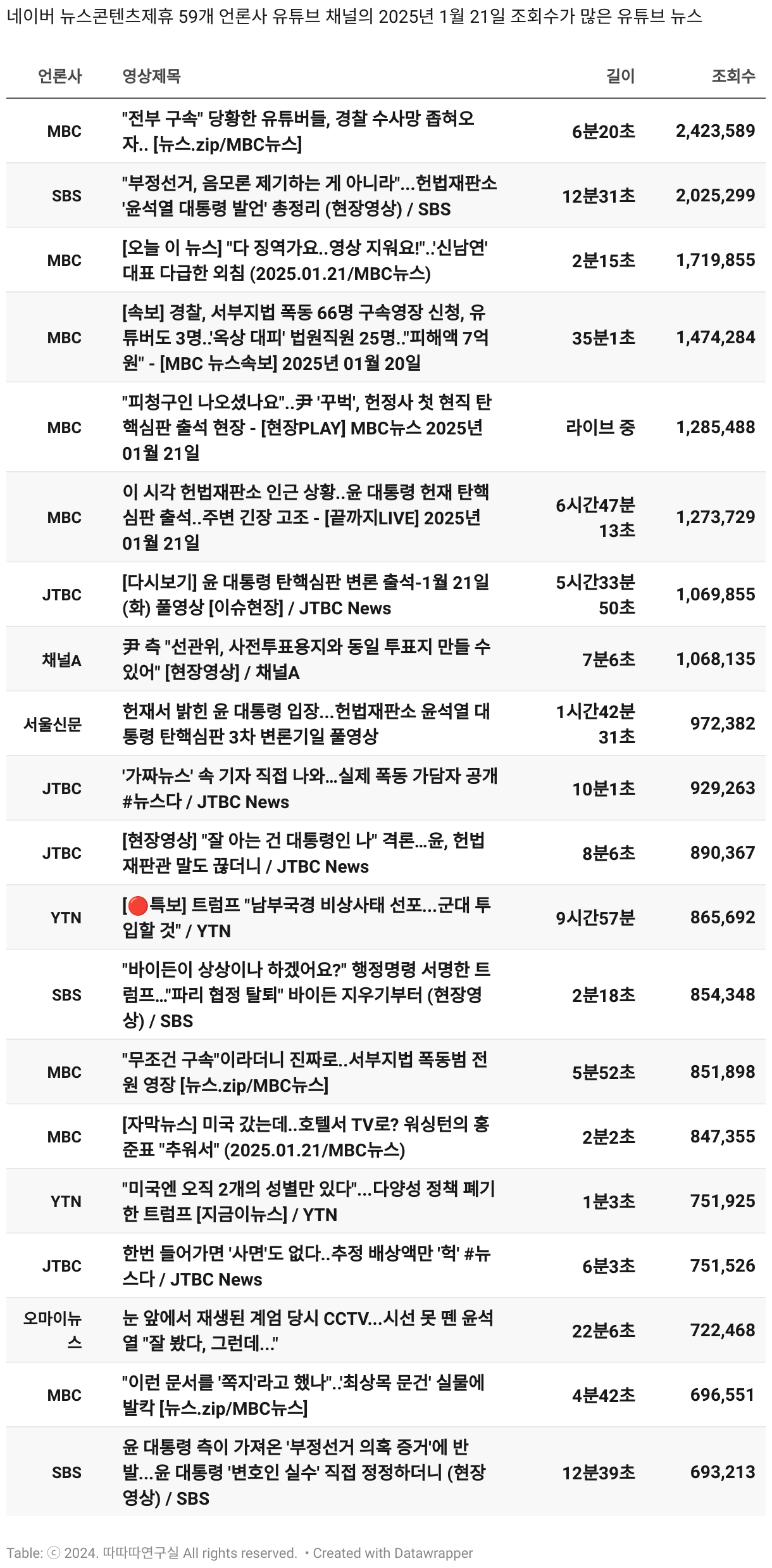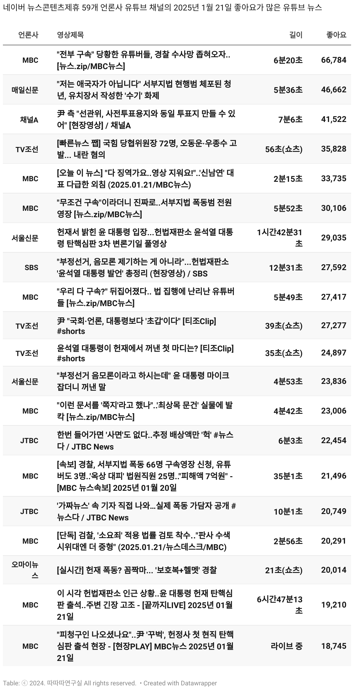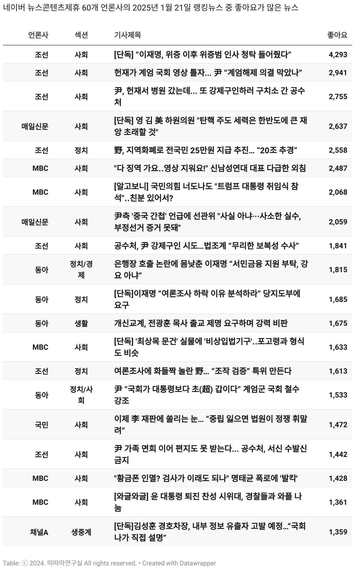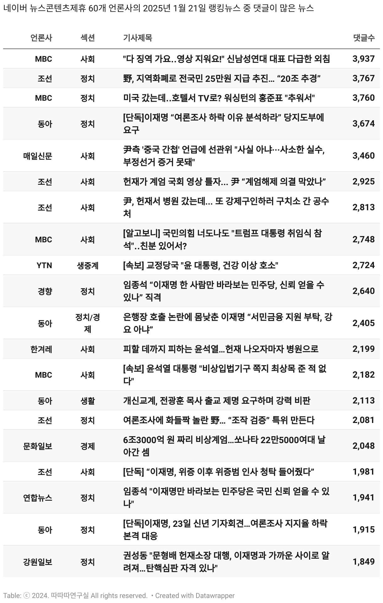 *데이터 수집 기간 : 2024년 6월 10일 *데이터 수집 대상 : 네이버 뉴스콘텐츠제휴 60개 언론사. 종합일간지 10개(경향신문, 국민일보, 동아일보, 문화일보, 서울신문, 세계일보, 조선일보, 중앙일보, 한겨레신문, 한국일보), 방송/통신사 14개(뉴스1, 뉴시스, 연합뉴스, 연합뉴스TV, 채널A, 한국경제TV, JTBC, KBS, MBC, MBN, SBS, SBS BIZ, TV조선, YTN), 경제지 11개(매일경제, 머니투데이, 비즈워치, 서울경제, 아시아경제, 이데일리, 조선비즈, 조세일보, 파이낸셜뉴스, 한국경제(유튜브제외), 헤럴드경제) 인터넷 8개(노컷뉴스, 더팩트, 데일리안, 머니S, 미디어오늘, 아이뉴스24, 오마이뉴스, 프레시안), IT 5개(디지털데일리,디지털타임스, 블로터, 전자신문, 지디넷코리아), 지역 12개(강원도민일보, 강원일보, 경기일보, 국제신문, 대구MBC, 대전일보, 매일신문, 부산일보, 전주MBC, CJB청주방송, JIBS, kbc광주방송)