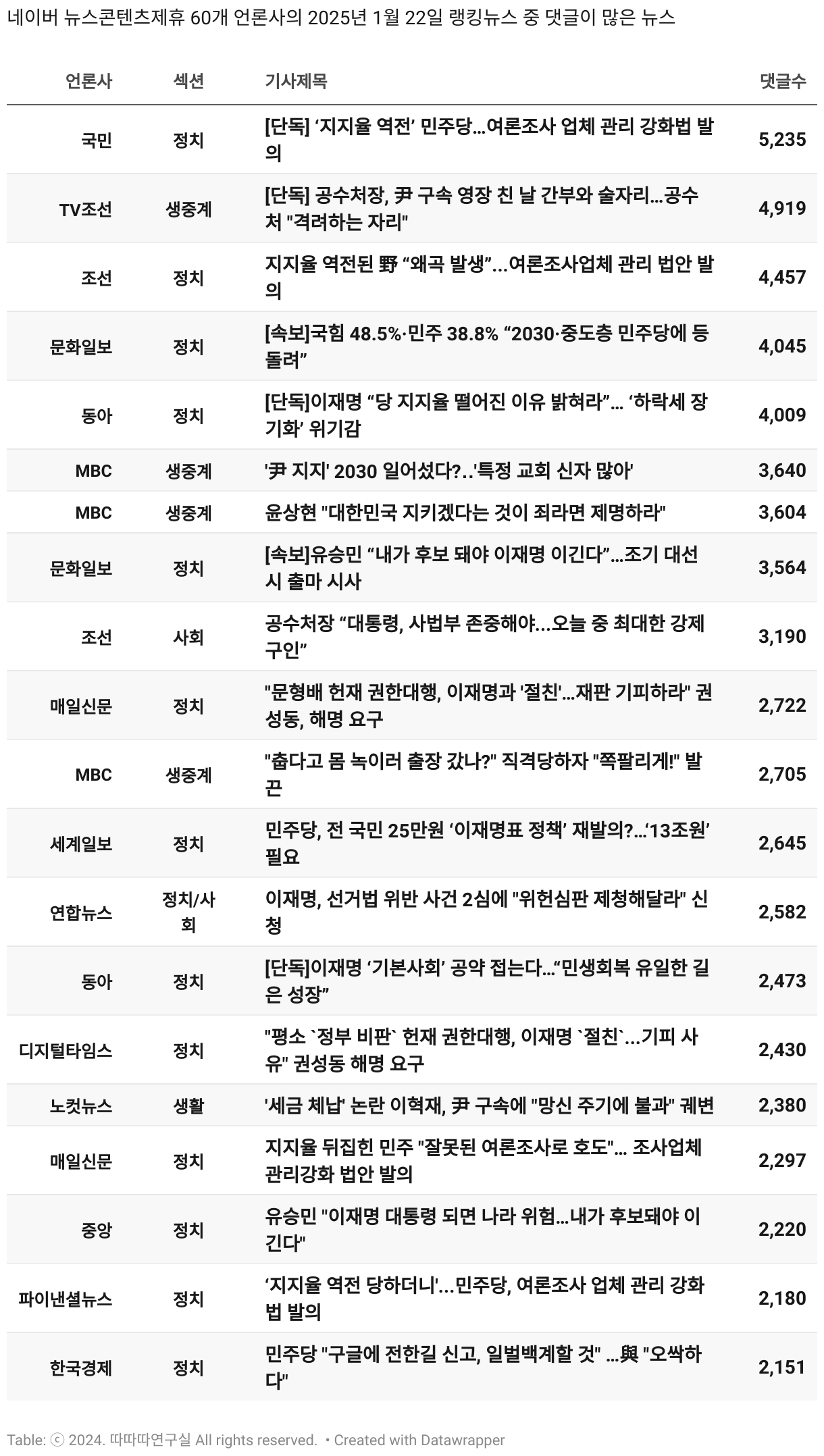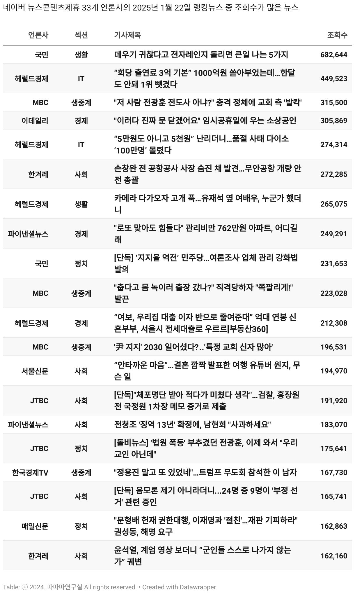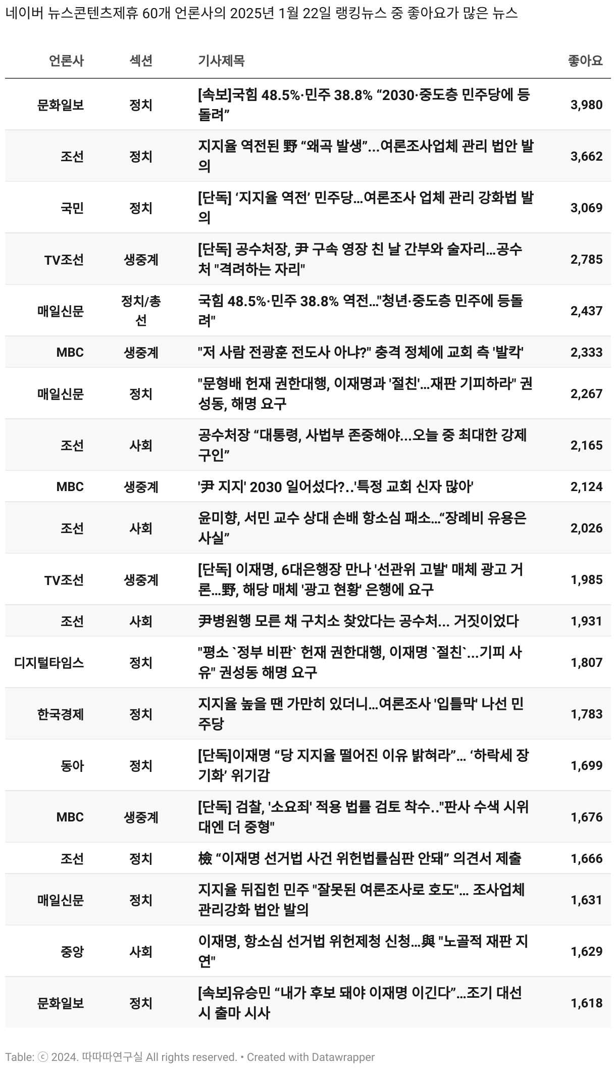 *데이터 수집 기간 : 2024년 6월 10일 *데이터 수집 대상 : 네이버 뉴스콘텐츠제휴 60개 언론사. 종합일간지 10개(경향신문, 국민일보, 동아일보, 문화일보, 서울신문, 세계일보, 조선일보, 중앙일보, 한겨레신문, 한국일보), 방송/통신사 14개(뉴스1, 뉴시스, 연합뉴스, 연합뉴스TV, 채널A, 한국경제TV, JTBC, KBS, MBC, MBN, SBS, SBS BIZ, TV조선, YTN), 경제지 11개(매일경제, 머니투데이, 비즈워치, 서울경제, 아시아경제, 이데일리, 조선비즈, 조세일보, 파이낸셜뉴스, 한국경제(유튜브제외), 헤럴드경제) 인터넷 8개(노컷뉴스, 더팩트, 데일리안, 머니S, 미디어오늘, 아이뉴스24, 오마이뉴스, 프레시안), IT 5개(디지털데일리,디지털타임스, 블로터, 전자신문, 지디넷코리아), 지역 12개(강원도민일보, 강원일보, 경기일보, 국제신문, 대구MBC, 대전일보, 매일신문, 부산일보, 전주MBC, CJB청주방송, JIBS, kbc광주방송)