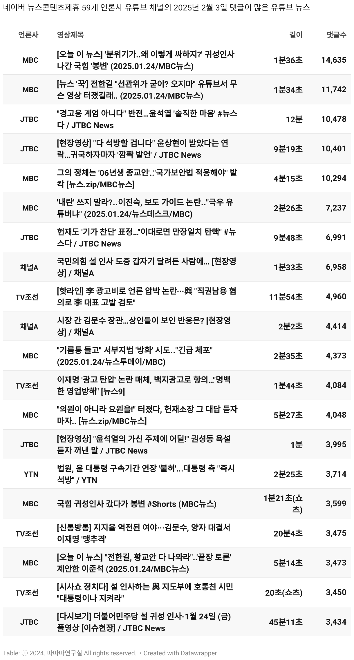 *데이터 수집 기간 : 2024년 6월 10일 *데이터 수집 대상 : 네이버 뉴스콘텐츠제휴 60개 언론사. 종합일간지 10개(경향신문, 국민일보, 동아일보, 문화일보, 서울신문, 세계일보, 조선일보, 중앙일보, 한겨레신문, 한국일보), 방송/통신사 14개(뉴스1, 뉴시스, 연합뉴스, 연합뉴스TV, 채널A, 한국경제TV, JTBC, KBS, MBC, MBN, SBS, SBS BIZ, TV조선, YTN), 경제지 11개(매일경제, 머니투데이, 비즈워치, 서울경제, 아시아경제, 이데일리, 조선비즈, 조세일보, 파이낸셜뉴스, 한국경제(유튜브제외), 헤럴드경제) 인터넷 8개(노컷뉴스, 더팩트, 데일리안, 머니S, 미디어오늘, 아이뉴스24, 오마이뉴스, 프레시안), IT 5개(디지털데일리,디지털타임스, 블로터, 전자신문, 지디넷코리아), 지역 12개(강원도민일보, 강원일보, 경기일보, 국제신문, 대구MBC, 대전일보, 매일신문, 부산일보, 전주MBC, CJB청주방송, JIBS, kbc광주방송)