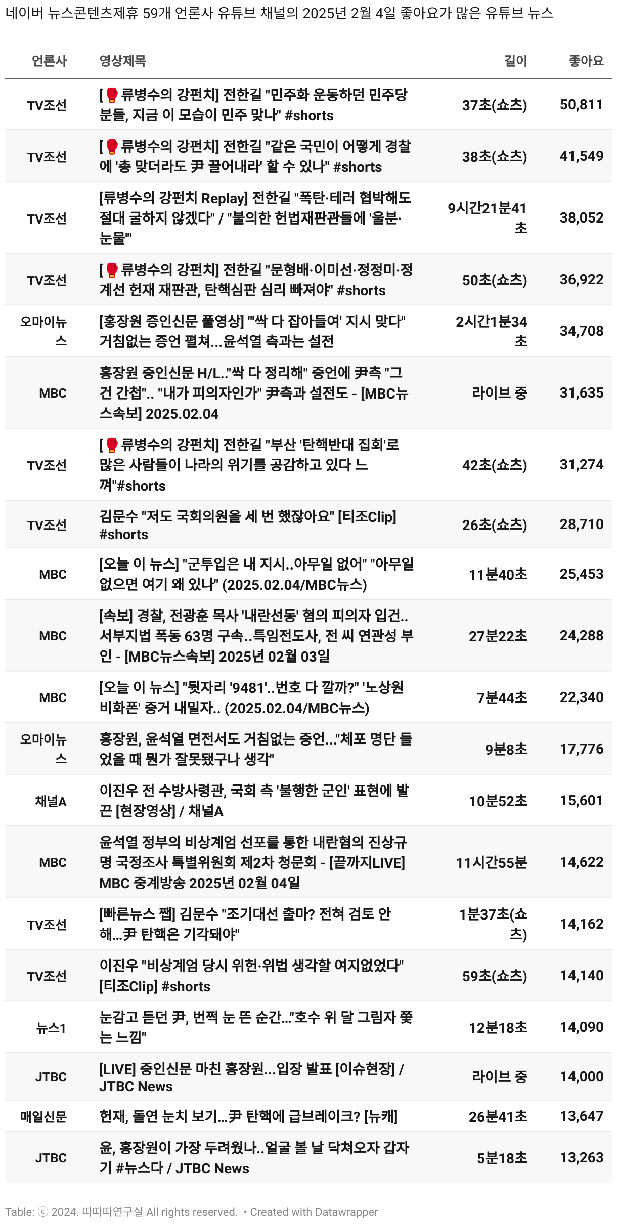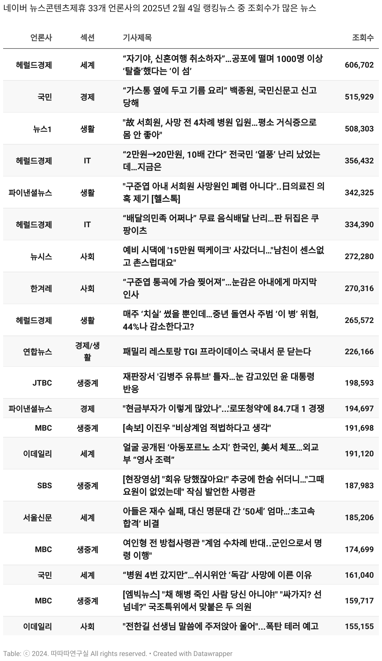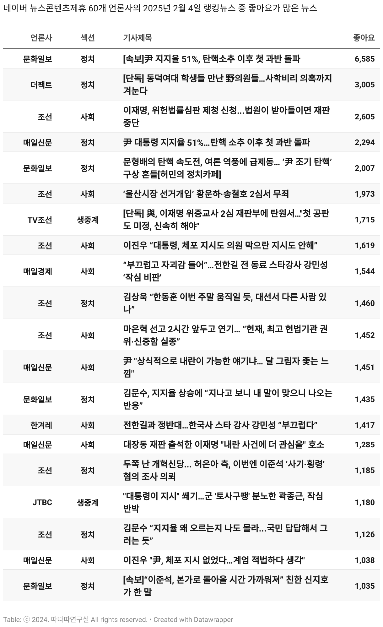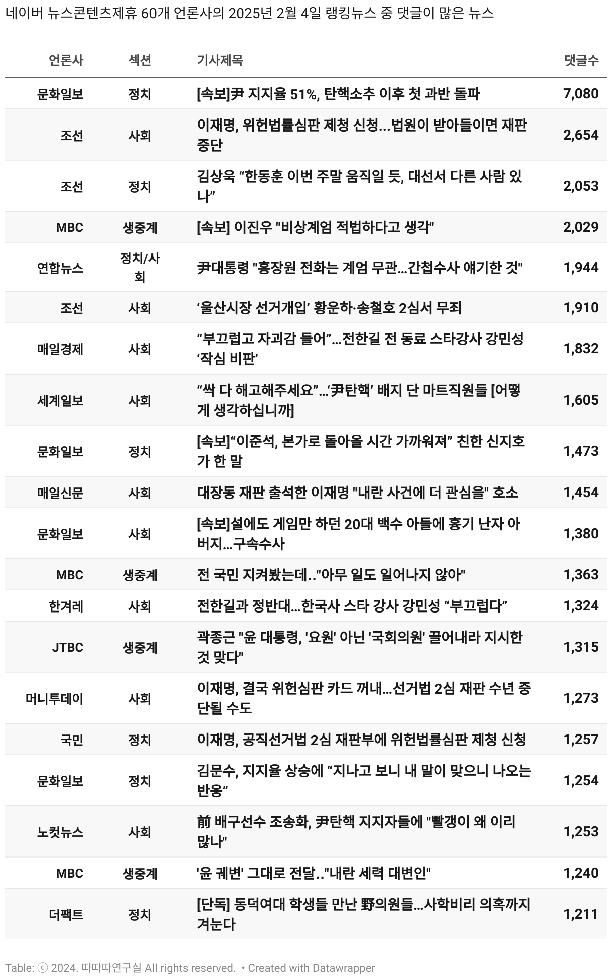 *데이터 수집 기간 : 2024년 6월 10일 *데이터 수집 대상 : 네이버 뉴스콘텐츠제휴 60개 언론사. 종합일간지 10개(경향신문, 국민일보, 동아일보, 문화일보, 서울신문, 세계일보, 조선일보, 중앙일보, 한겨레신문, 한국일보), 방송/통신사 14개(뉴스1, 뉴시스, 연합뉴스, 연합뉴스TV, 채널A, 한국경제TV, JTBC, KBS, MBC, MBN, SBS, SBS BIZ, TV조선, YTN), 경제지 11개(매일경제, 머니투데이, 비즈워치, 서울경제, 아시아경제, 이데일리, 조선비즈, 조세일보, 파이낸셜뉴스, 한국경제(유튜브제외), 헤럴드경제) 인터넷 8개(노컷뉴스, 더팩트, 데일리안, 머니S, 미디어오늘, 아이뉴스24, 오마이뉴스, 프레시안), IT 5개(디지털데일리,디지털타임스, 블로터, 전자신문, 지디넷코리아), 지역 12개(강원도민일보, 강원일보, 경기일보, 국제신문, 대구MBC, 대전일보, 매일신문, 부산일보, 전주MBC, CJB청주방송, JIBS, kbc광주방송)