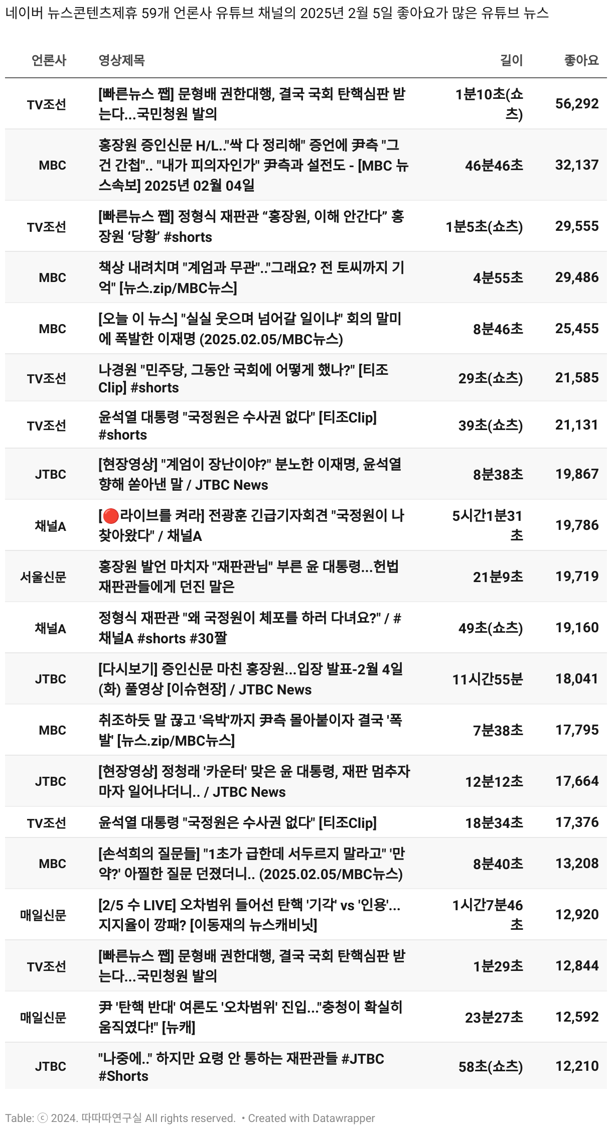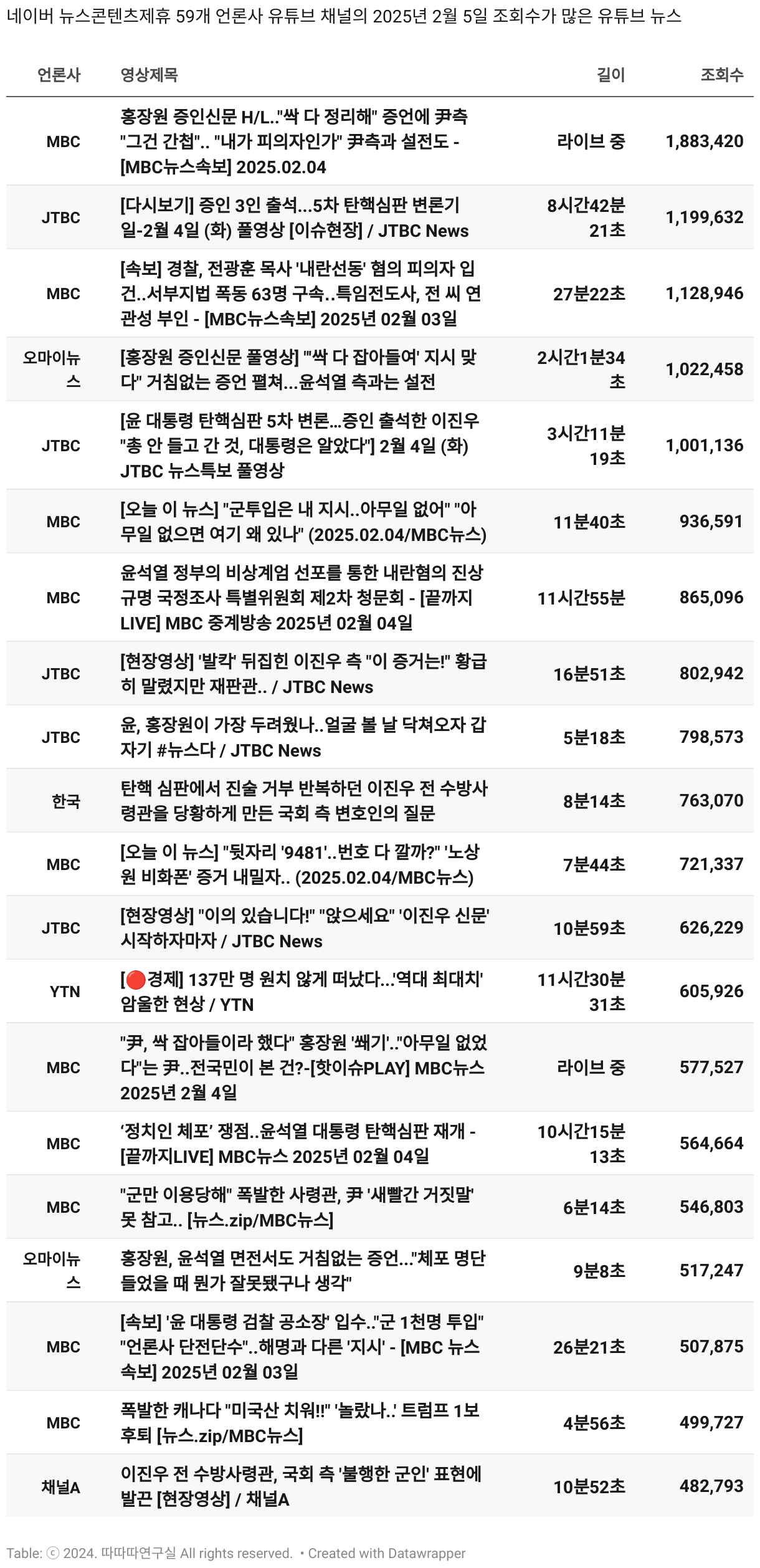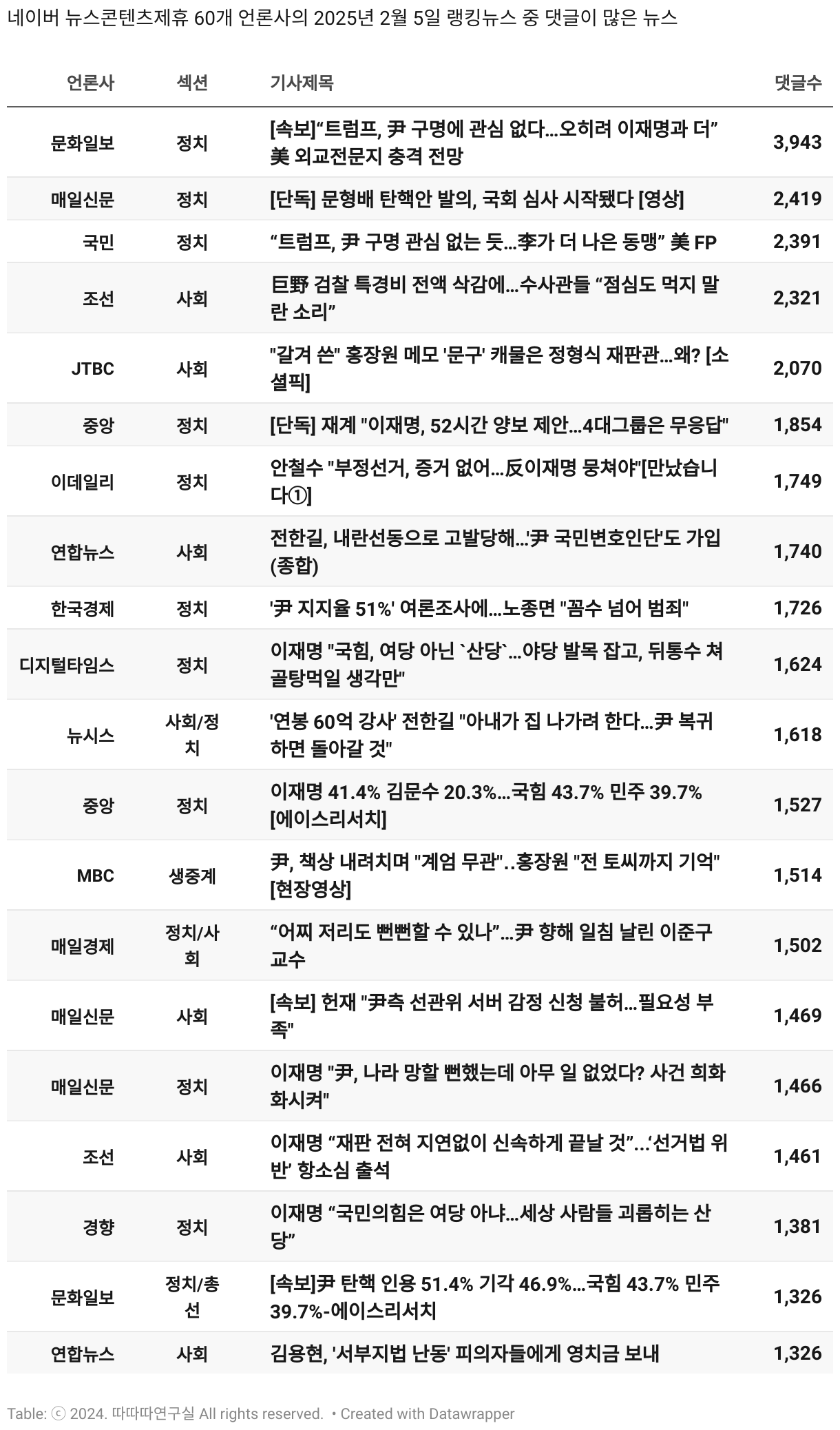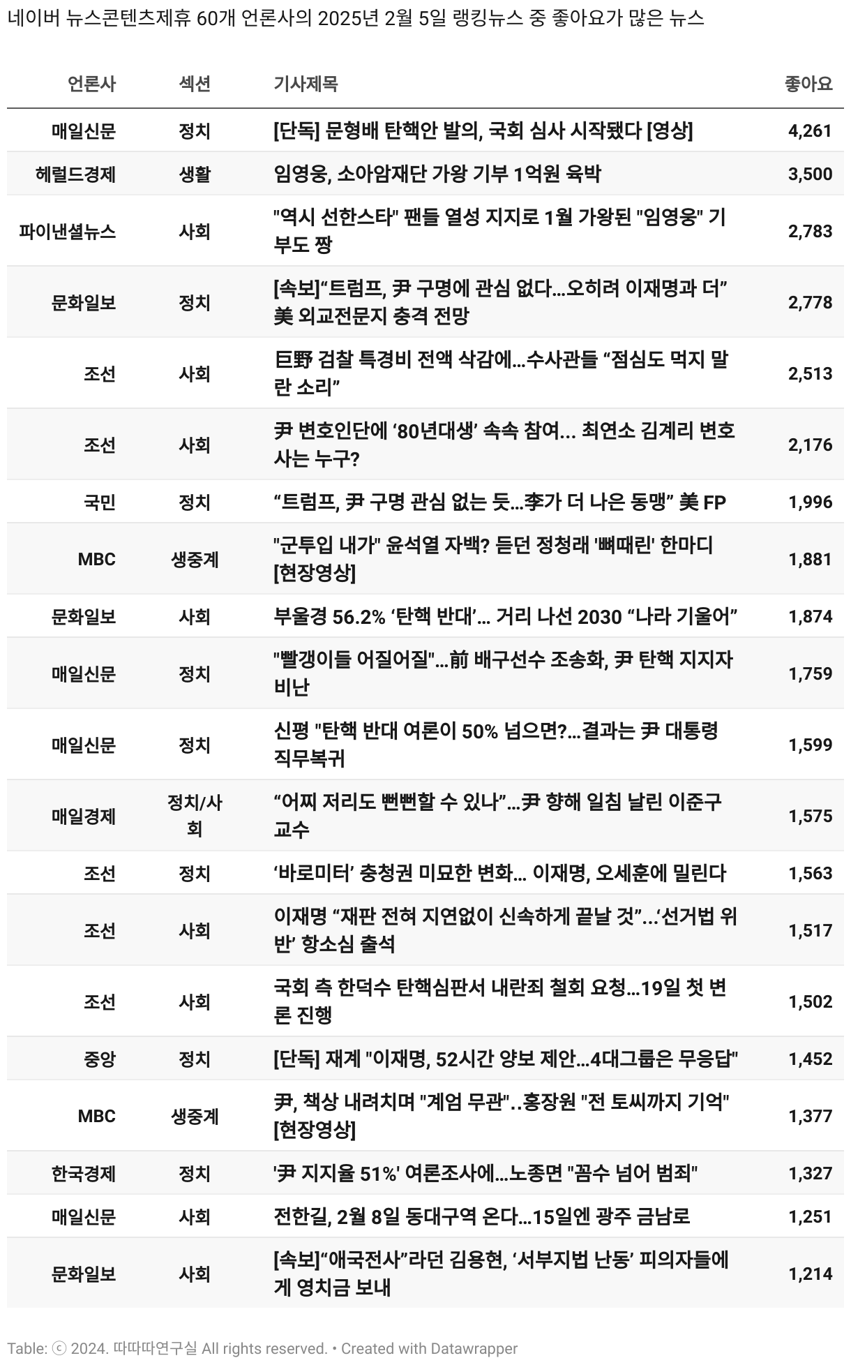 *데이터 수집 기간 : 2024년 6월 10일 *데이터 수집 대상 : 네이버 뉴스콘텐츠제휴 60개 언론사. 종합일간지 10개(경향신문, 국민일보, 동아일보, 문화일보, 서울신문, 세계일보, 조선일보, 중앙일보, 한겨레신문, 한국일보), 방송/통신사 14개(뉴스1, 뉴시스, 연합뉴스, 연합뉴스TV, 채널A, 한국경제TV, JTBC, KBS, MBC, MBN, SBS, SBS BIZ, TV조선, YTN), 경제지 11개(매일경제, 머니투데이, 비즈워치, 서울경제, 아시아경제, 이데일리, 조선비즈, 조세일보, 파이낸셜뉴스, 한국경제(유튜브제외), 헤럴드경제) 인터넷 8개(노컷뉴스, 더팩트, 데일리안, 머니S, 미디어오늘, 아이뉴스24, 오마이뉴스, 프레시안), IT 5개(디지털데일리,디지털타임스, 블로터, 전자신문, 지디넷코리아), 지역 12개(강원도민일보, 강원일보, 경기일보, 국제신문, 대구MBC, 대전일보, 매일신문, 부산일보, 전주MBC, CJB청주방송, JIBS, kbc광주방송)