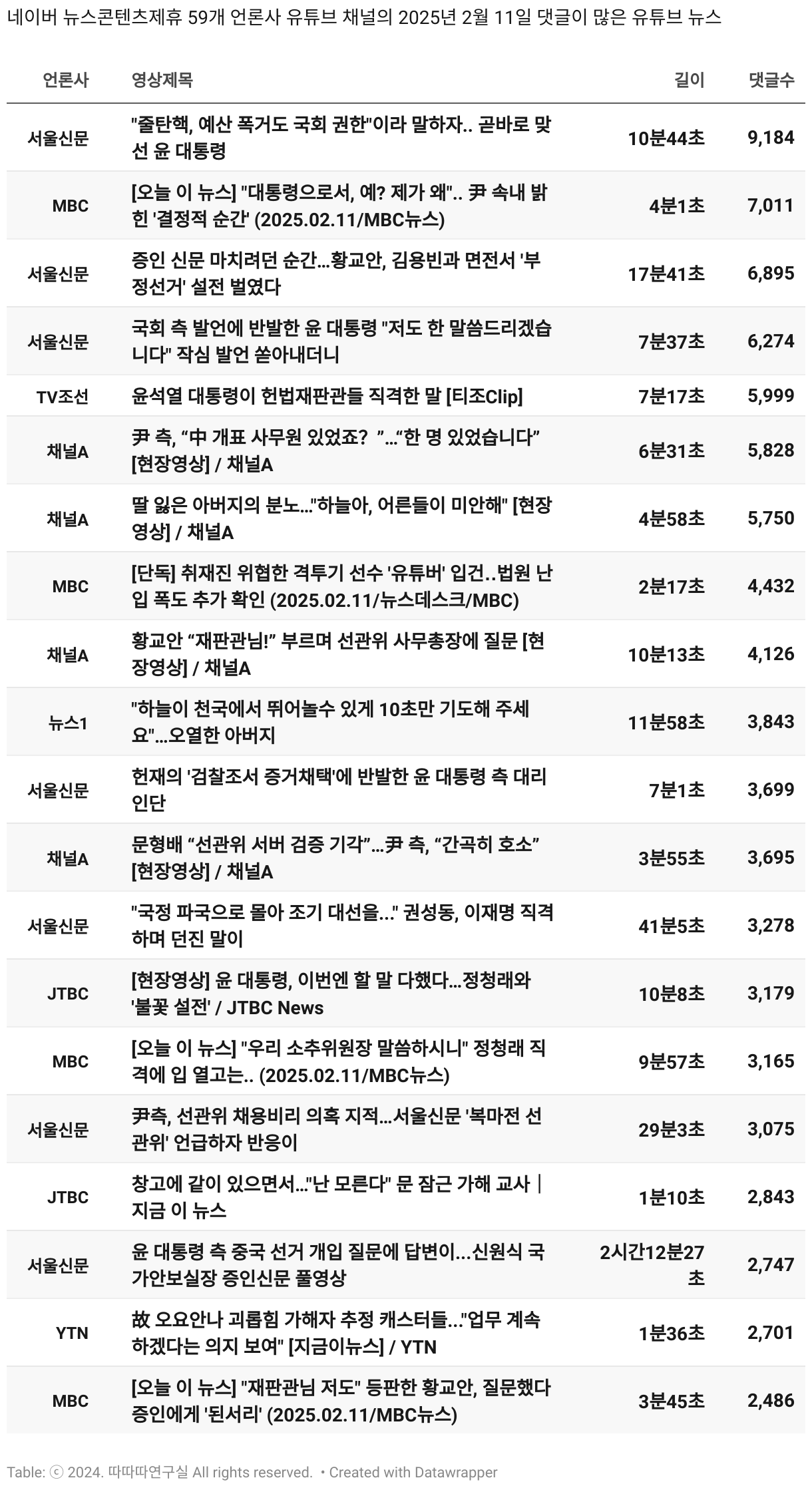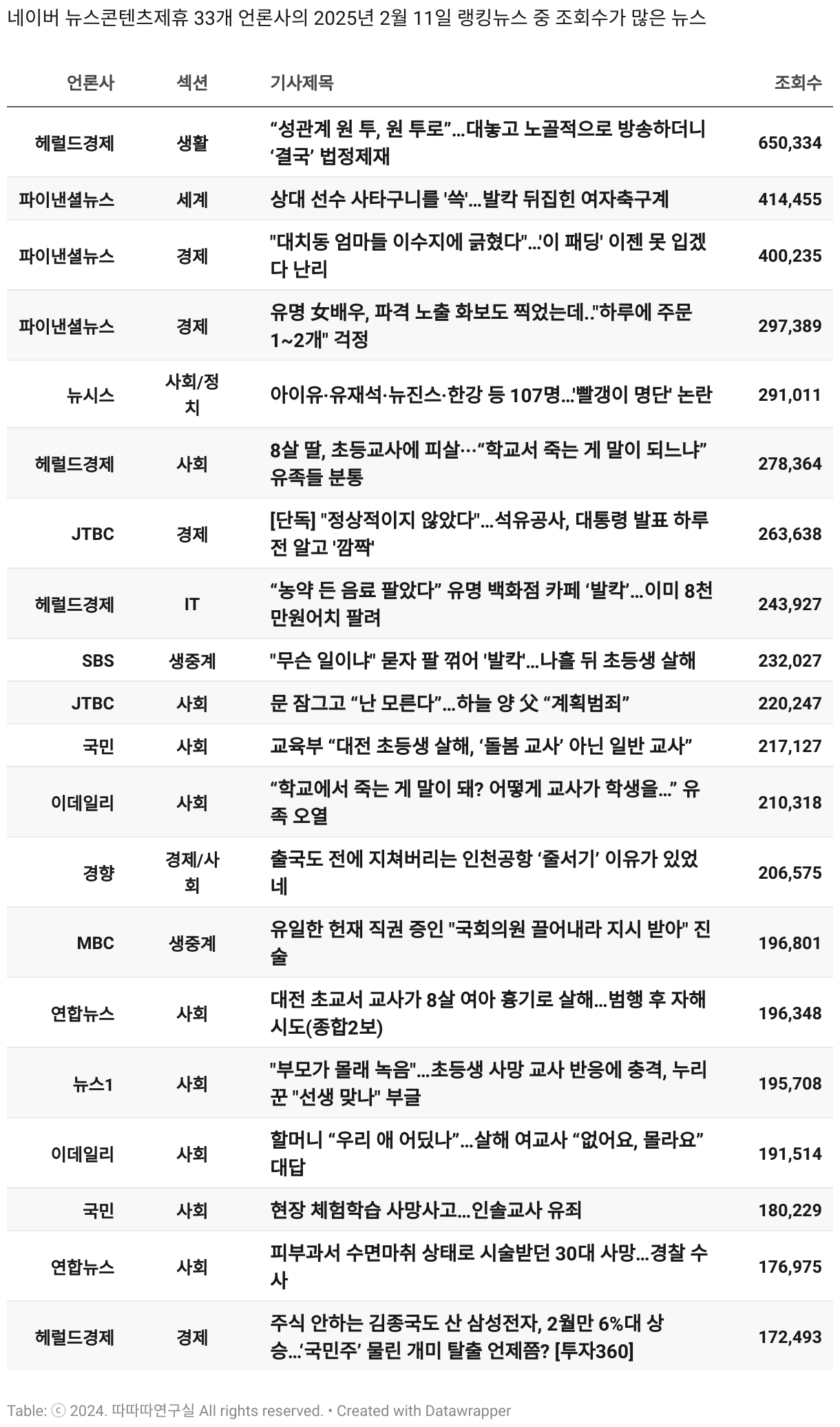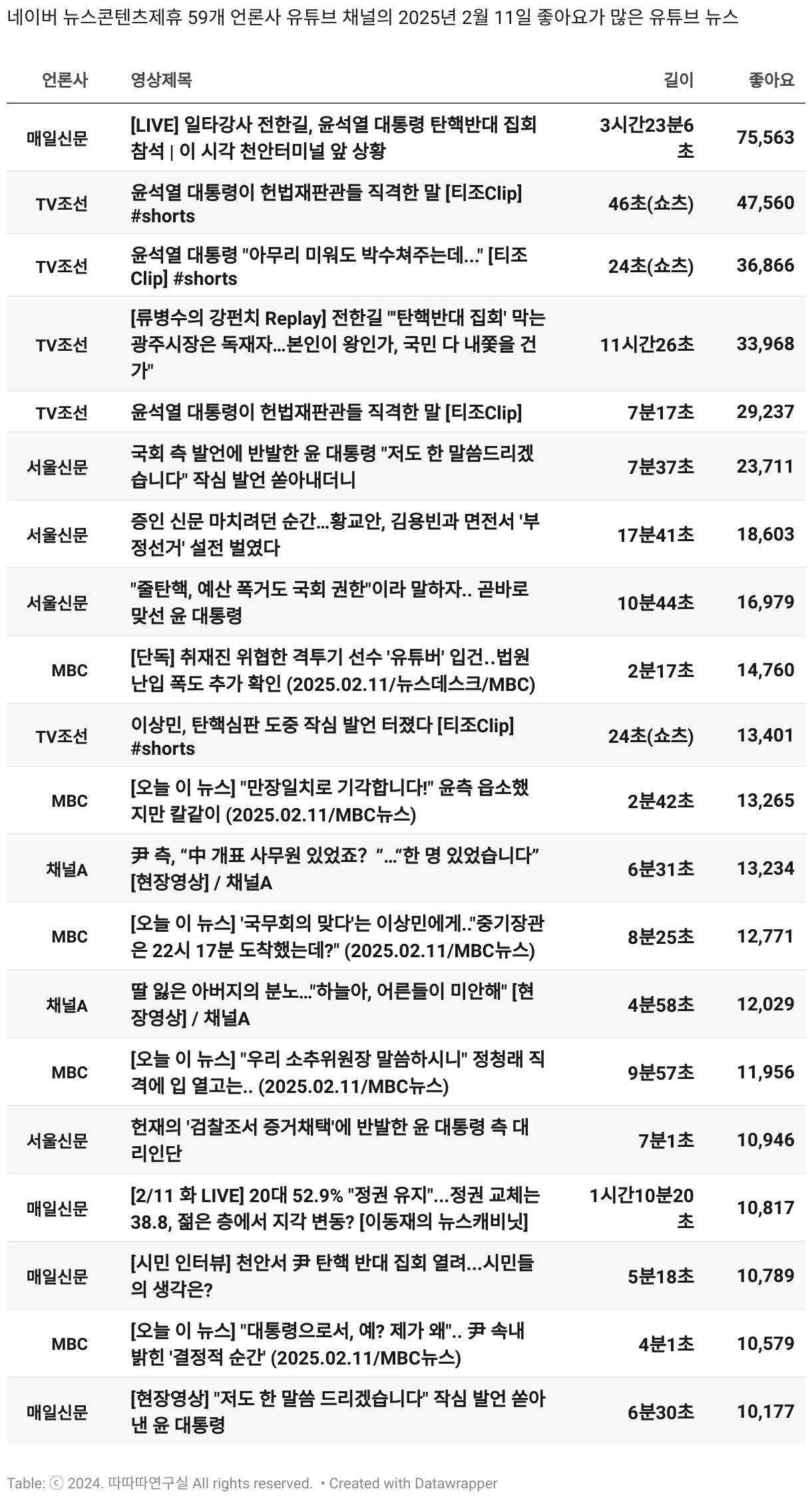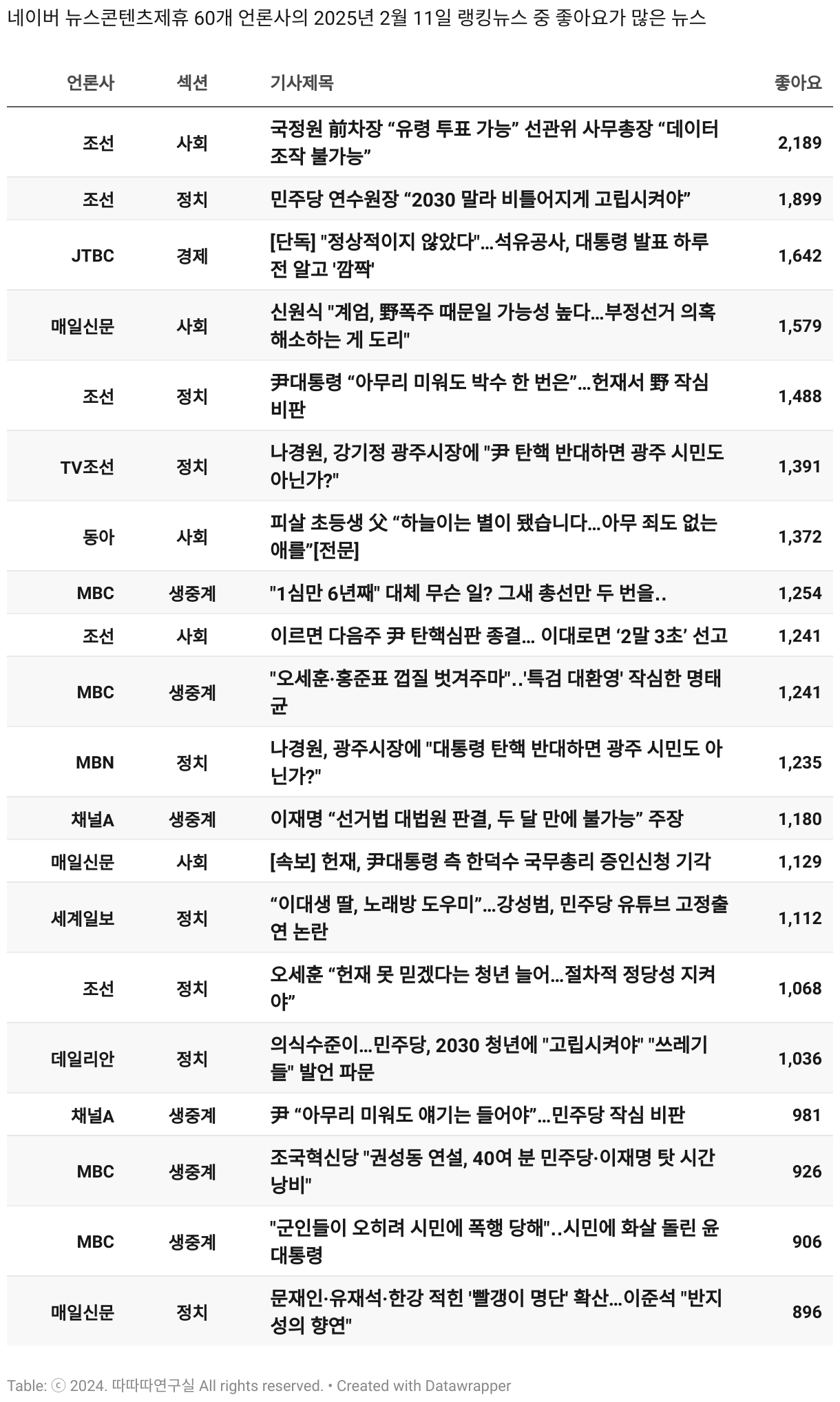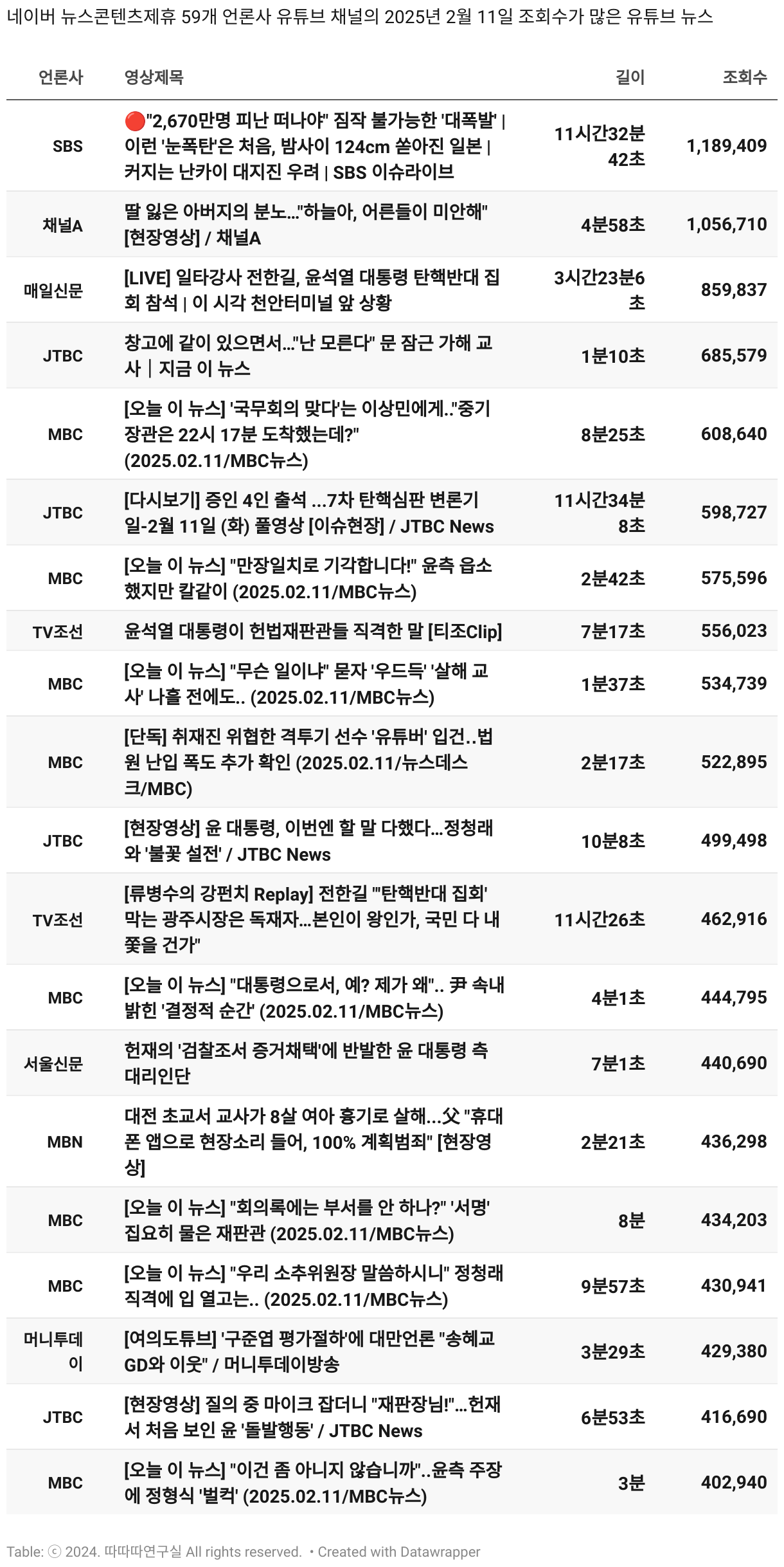 *데이터 수집 기간 : 2024년 6월 10일 *데이터 수집 대상 : 네이버 뉴스콘텐츠제휴 60개 언론사. 종합일간지 10개(경향신문, 국민일보, 동아일보, 문화일보, 서울신문, 세계일보, 조선일보, 중앙일보, 한겨레신문, 한국일보), 방송/통신사 14개(뉴스1, 뉴시스, 연합뉴스, 연합뉴스TV, 채널A, 한국경제TV, JTBC, KBS, MBC, MBN, SBS, SBS BIZ, TV조선, YTN), 경제지 11개(매일경제, 머니투데이, 비즈워치, 서울경제, 아시아경제, 이데일리, 조선비즈, 조세일보, 파이낸셜뉴스, 한국경제(유튜브제외), 헤럴드경제) 인터넷 8개(노컷뉴스, 더팩트, 데일리안, 머니S, 미디어오늘, 아이뉴스24, 오마이뉴스, 프레시안), IT 5개(디지털데일리,디지털타임스, 블로터, 전자신문, 지디넷코리아), 지역 12개(강원도민일보, 강원일보, 경기일보, 국제신문, 대구MBC, 대전일보, 매일신문, 부산일보, 전주MBC, CJB청주방송, JIBS, kbc광주방송)